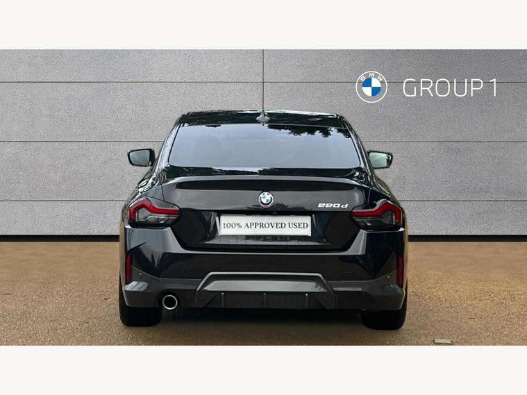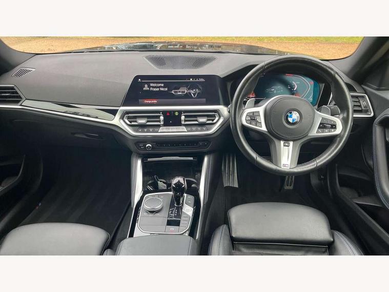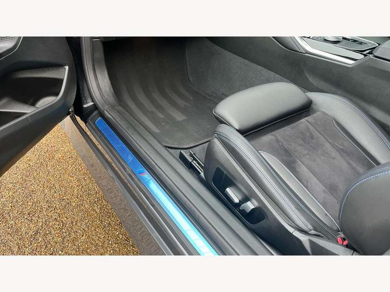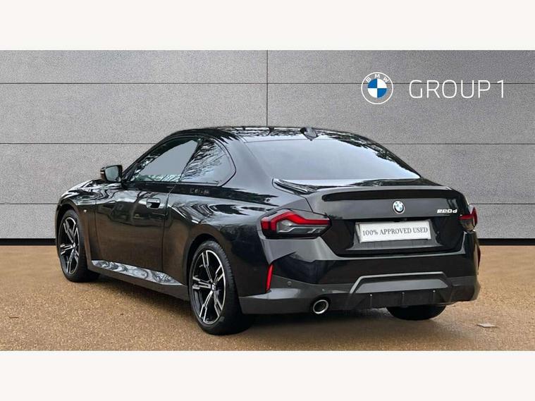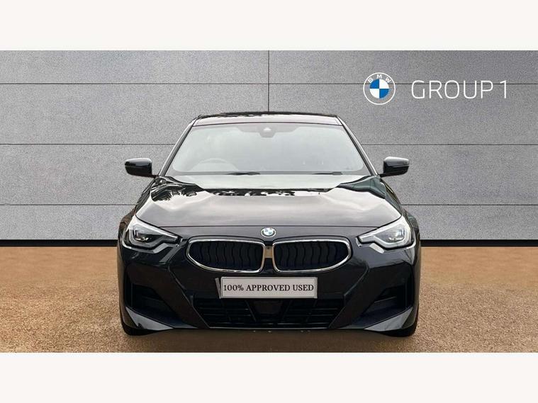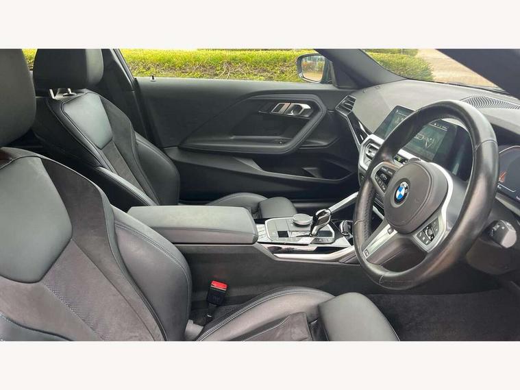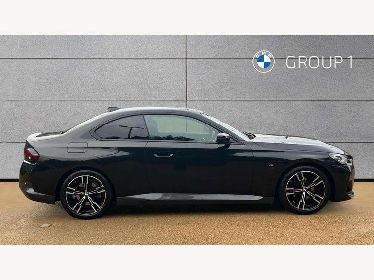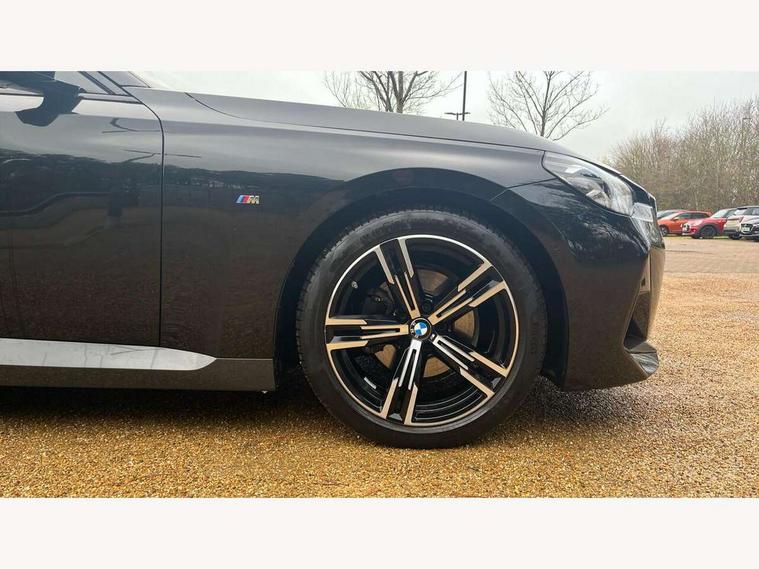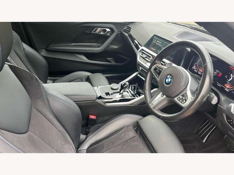 Attentiveness assist, Auto start-stop, Bluetooth, BMW ConnectedDrive online services, BMW Teleservices, Check Control warning system for monitoring of lights and door/luggage compartment open warning, Direct selection buttons, Drive off assistant, Eco pro mode, Electric power steering, Front and rear parking sensors, Front/rear Parking distance control, iDrive controller with turn and press function, Integrated owners handbook, Intelligent functions, Live cockpit plus with nav function 12.3" instrument cluster and 14.9" centre display, Oil sensor for level and grade, Optimum shift indicator, Personal Profile, Touch operation on control display, Variable sport steering, Widescreen multi-media display, 48V Mild hybrid technology, Aluminium lightweight construction, Balancer shaft, BMW TwinPower Turbo four-cylinder diesel engine, Common rail direct injection and one turbocharger, Diesel particulate filter, Drive performance control with ECO PRO comfort + sport mode, Electronic differential lock, M sport suspension, Oxidation catalytic converter, Selective catalytic reduction (SCR) with AdBlue, Sport automatic steptronic transmission with gearshift paddles, manual gearshift time display, launch control, coasting idle ECO PRO/COMFORT modes, DAB tuner, Acoustic windscreen wipers for reduced driving noise, Adaptive LED Headlights, Automatic windscreen wipers and automatic headlight, Automatically dimming rear view mirror, Body colour door handles flush with door surface, Body colour door mirrors, Body colour front and rear bumpers, Daytime running lights, Electric windows - front and rear, with open/close fingertip control and trap release, Exhaust tailpipe - 90mm in left, Fading support, Front and rear bumper system with replaceable deformation elements, Front door sill finishers in black plastic with BMW designation, Front windscreen wipers with integrated washer jets, Green tinted heat protection glazing, High beam assistant, High gloss shadowline exterior trim in mirror triangle cover, mirror cover panel, mirror bezel and window border, High level third brake light, Indicators integrated int mirror housing, LED registration plate light, LED technology rear tail lights, brake lights and turn indicators, Lightweight engineering, Model designation on right side of tailgate, One piece kidney grille with hight gloss chrome surround, Rear boot, Rear fog lights, Reversing light in rear light cluster, Shark fin antenna, Single part LED rear lights with smoked glass components, Trailer stabilisation logic, Visible VIN plate, 12V power socket in front centre console with blanking plug, 2 cupholders in front centre console, 3 zone automatic air conditioning, Ambient lighting, Compartment in front of cupholder, Conditioned based service, Driver seat backrest width adjustment, Front and rear side armrests integrated into door trim, Front armrest, Front door pockets, Front head restraints, Front sport seats, Heated front seats, Illuminated glove compartment with separate small compartment, M headliner Anthracite, M sport leather steering wheel, Manually adjustment steering wheel column, Rear seat backrest with manual 40:20:40 split folding, Rear seat centre foldable armrest with integrated cup holder, Single front passenger seat, Storage compartment between rear seats, Storage tray and compartment with cover in centre console, Sun visors with vanity mirrors and insert tab, Through loading system with 40/20/40 split folding 2 rear seat in 2nd row, Two folding rear seat headrests, Velour floor mats, Additional storage compartment pack without USB - 2 Series Coupe, Connected pack professional - 2 Series Coupe, Interior and exterior mirror pack - 2 Series Coupe, M Sport exterior styling aerodynamics pack - 2 Series Coupe, 2 tone horn, Anti lock braking system (ABS) with cornering brake control, Automatic Stability Control (ASC), BMW emergency call, Brake drying, Child seat ISOFIX attachment for the two outer rear seats, Crash sensor activating of airbags, Unlocking doors, hazard warning lights, interior light, safety battery terminal, Deactivation of fuel pump in the event of a crash, Driver and front passenger airbags, Driver and front passenger side airbags, integrated in the door side seat backrest bolsters for all seat variants, Dynamic brake control, Dynamic stability control + (DSC+), Dynamic Traction Control - DTC, Electrically operated hand brake including automatic hold function and automatic release when driving off, Front and rear disc brakes, Front passenger airbag deactivation, Head airbags for all 4 outer seats, Manual deactivation of front passenger airbag, Seat belt security check for driver and front passenger, Seatbelt warning, Side impact protection, Three point seat belts on 4 seats including front belt stopper, pyrotechnic belt tensioners and belt force limiters, Tyre pressure sensor, Warning triangle and first aid kit, Alarm system (Thatcham 1) with remote control and electronic engine immobiliser, Central locking switch for all doors, fuel filler cap and luggage compartment, Deadlocking function system to all doors, Drive away locking system on all doors and luggage compartment, Locking wheel bolts, Start/Stop button (illuminated) in centre console with keyless engine start and Auto Start-Stop deactivation button, Two remote control key with integrated key - one button for open and close doors/fuel flap/tailgate and separate button for unlock luggage compartment, BMW mobility tyre sealing system, Electrically powered 12V compressor, Reduced rolling resistance tyres,