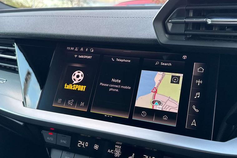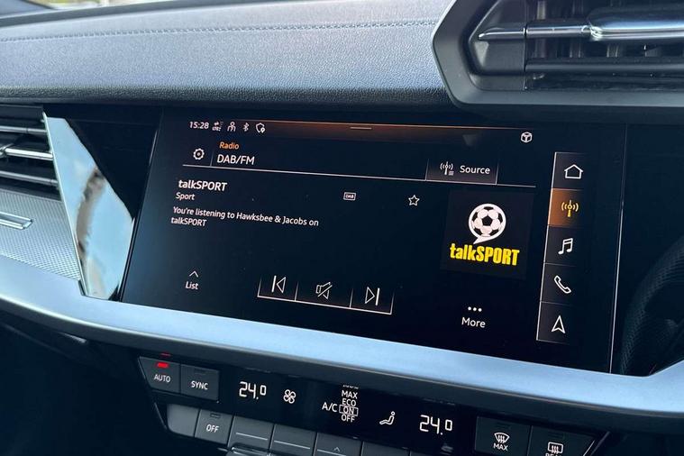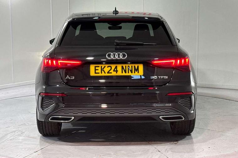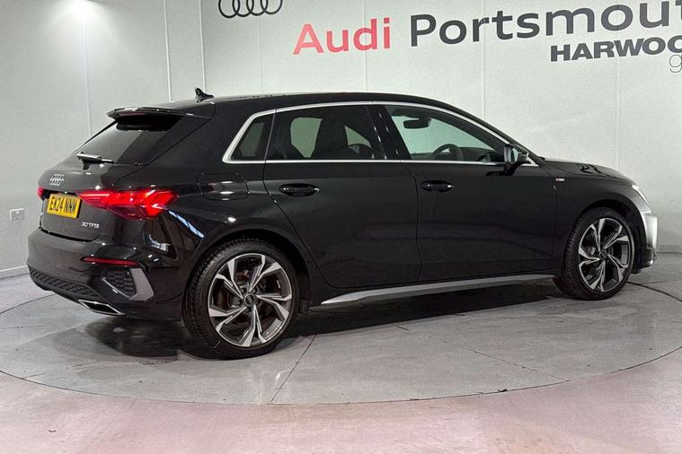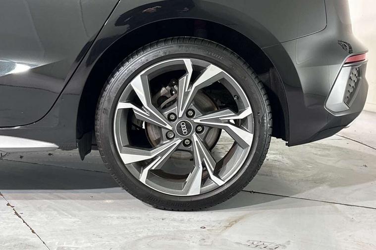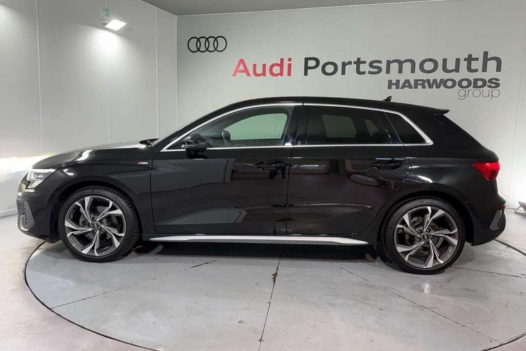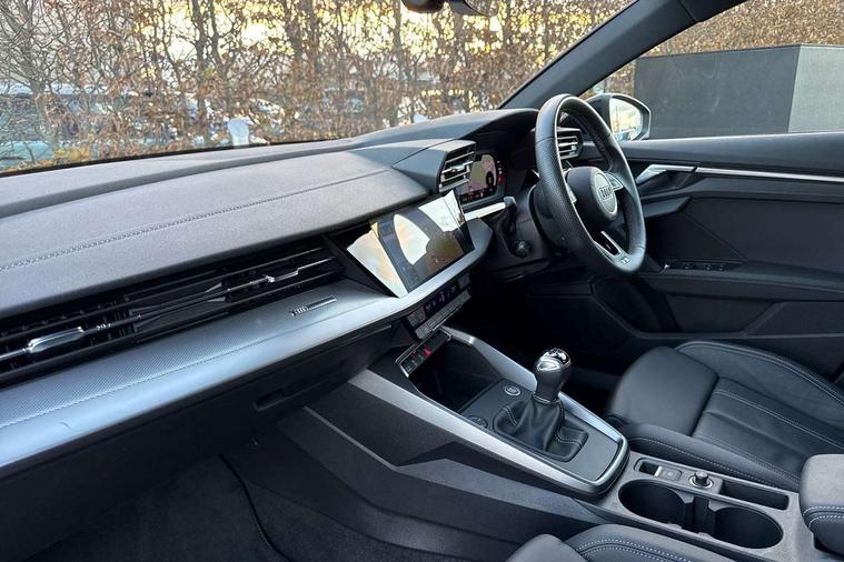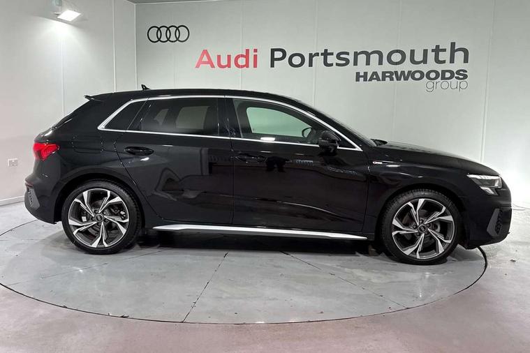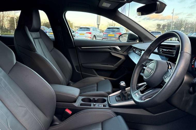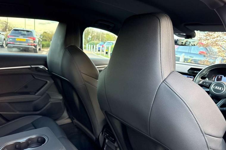 Audi drive select (Auto, Comfort, Dynamic and Individual), Audi smartphone interface, Audi Virtual Cockpit - 10.25" digital and colour instrument cluster, Automatic start/stop system with recuperation, Bluetooth interface, Camera based traffic sign recognition, Collision avoidance assistant, Cruise control, e-Call (emergency call), Electromechanical power speed sensitive steering, Lane departure warning system, MMI Navigation Plus with high resolution 10.1" colour touch screen display, Rear parking sensors, Service indicator, Trip computer, Voice control system with natural language interaction, Sports suspension, 2xUSB-C connection with data and charging functions, 6 passive loudspeakers, DAB Digital radio, 3rd brake light, Acoustic glass windscreen, Aluminium window trim, Auto dimming frameless rear view mirror, Body colour exterior mirrors, Electrically adjustable/heated/folding/auto dimming door mirrors with integrated LED indications + kerb view function for passenger side, Front electric windows, Illuminated door sills with aluminium inserts at the front with S logo, LED daytime running lights, LED headlights with LED rear lights and dynamic rear indicators, Light and rain sensors, Privacy glass - dark tinted rear window, rear door and side windows, Rear electric windows, Rear side air outlets in grained matt black, Rear side wing doors, Rear wiper, S line bumpers, S roof spoiler, 12V socket and storage compartment in front centre console, 3 seat bench in 2nd row, 3 spoke leather multifunction steering wheel, 4 way electrically adjustable lumbar support for driver and front passenger, 60/40 split folding rear seat bench, Black cloth headlining, Dual zone electronic climate control, Front and rear centre armrest in artificial leather, Front and rear headrests, Front/rear floor mats, Height and reach adjustable steering wheel, Interior lighting - glove compartment light and right hand side, Luggage compartment floor covering, Manual boot compartment lid, Manually adjustable front seats, Seat side bolsters, Single front passenger seat, Stainless steel pedals and front footrest in black, Twin leather upholstery with front sports seats S embossed logo, Aluminium interior elements pack - A3 Sportback, LED interior lighting pack - A3 Sportback, S line styling pack - A3 Sportback, 3x3 point rear seat belts, Driver and front passenger airbag with passenger airbag deactivation, Electronic Stabilisation Control (ESC) including ABS, ASR and EDL, First aid kit with warning triangle and 2 safety vests, Front side airbags with head airbags and interaction airbag, Pre-sense front with pedestrian and cyclist detection, Seatbelt monitoring, Tyre pressure loss indicator, Anti theft alarm, Anti-theft wheel bolts, Electronically operated child locks, Immobiliser, Remote control central locking, Dark spectrum aluminium inlays, accent surfaces in the dashboard and centre console in platinum grey silk effect paint finish,