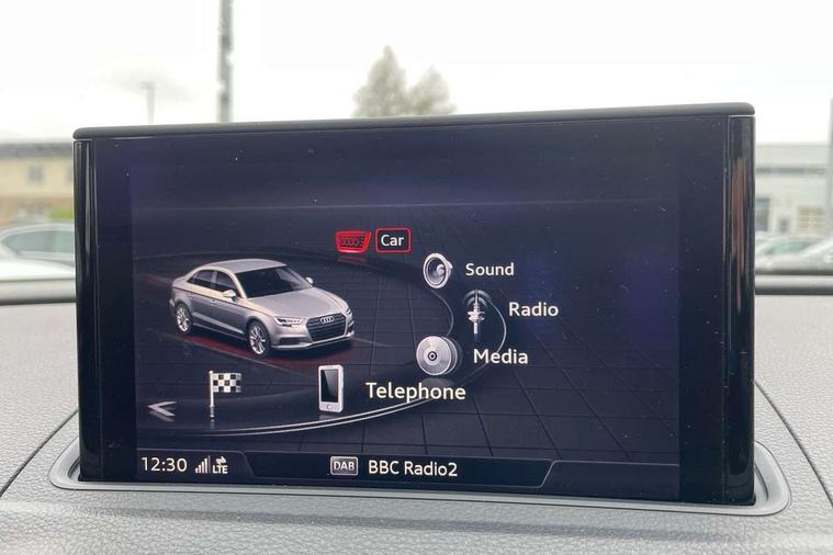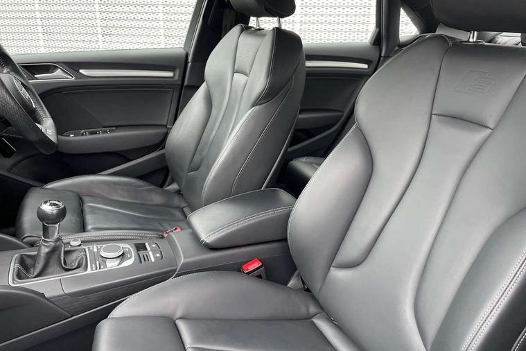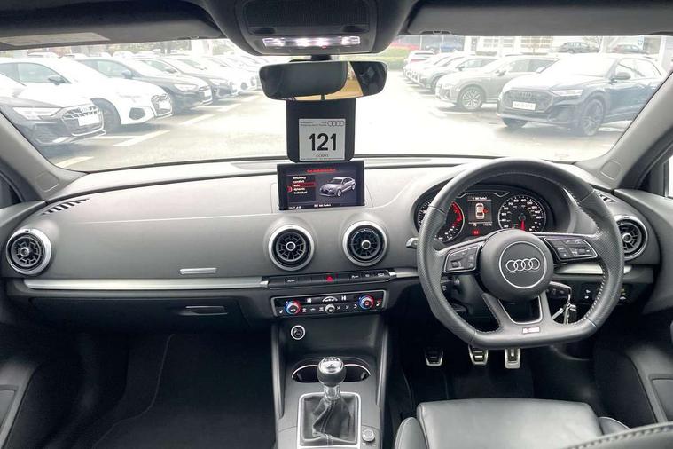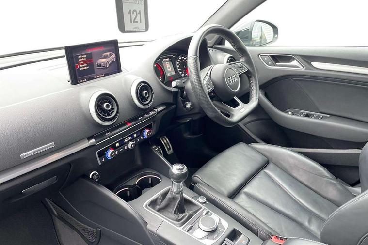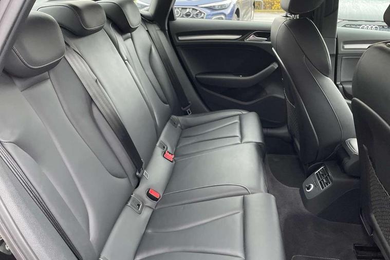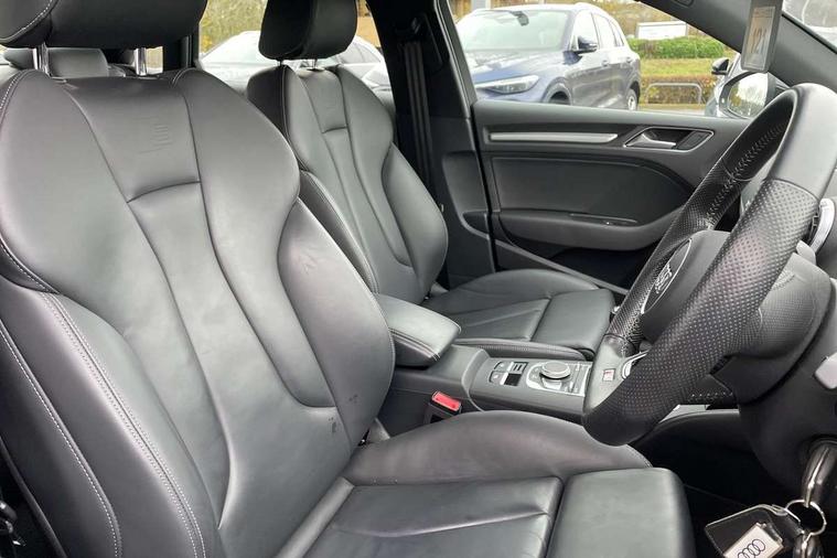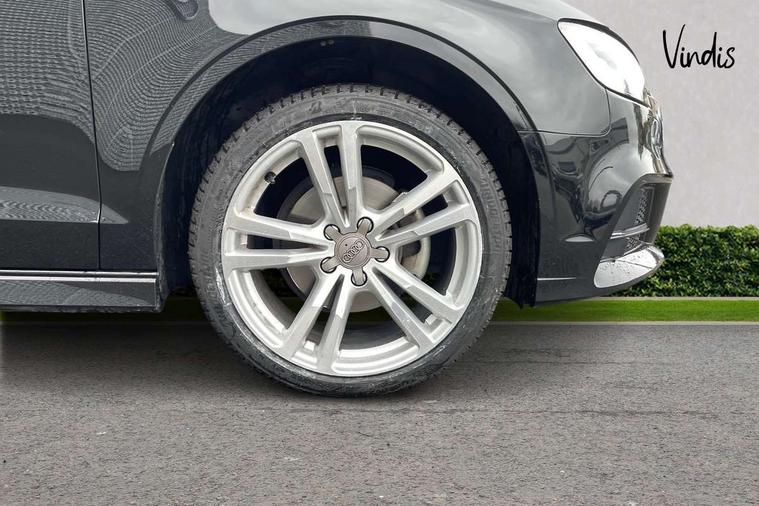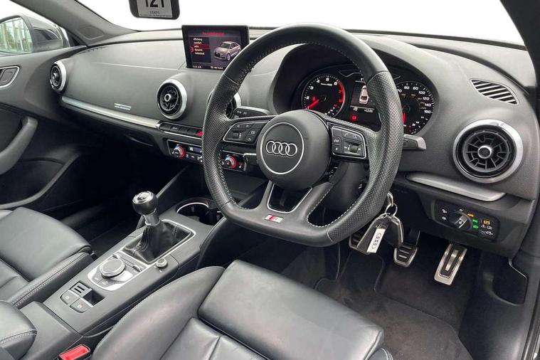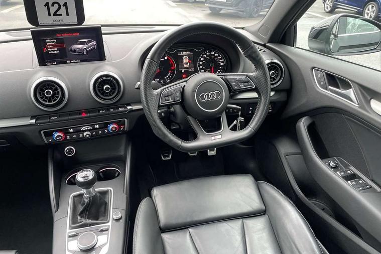 Audi connect, Audi drive select, Audi smartphone interface, Bluetooth interface, Colour driver's information system display, Electro-mechanical PAS, SD card based satellite navigation system, Service interval indicator, Voice control system, 2 USB ports, Audi music interface, Aux-in socket, CD player, DAB Digital radio, MMI radio plus with 7" colour MMI screen and MMI controller, Aluminium side window trim, Automatic lights and wipers, Body colour bumpers, Body colour door mirrors with integral indicators, Body colour roof spoiler, Chrome exhaust tailpipes, Electric operated/heated door mirrors, Front and rear electric windows, Heated rear window, Heated windscreen washer jets, High gloss dark chrome radiator grille, LED daytime running lights, S Line body styling, 3 adjustable rear headrests, 3 spoke flat bottomed multi-function leather steering wheel, 4 lashing points to secure luggage, Adjustable front armrest, Black cloth headlining, Driver/passenger sunvisors, Dual zone electronic climate control, Front and rear interior lights with delay, Front sports seats, Front/rear floor mats, Height/depth adjustable steering column, Illuminated door sills, Illuminated glovebox, ISOFIX child seat preparation+airbag deactivation, Jack and tool kit, Stainless steel pedals, Storage compartment in centre console, Storage compartments in doors, Storage under driver's seat, LED interior light pack - A3/RS3, Non smoking pack - A3, Storage and luggage pack - A3/RS3, 3 point seatbelts on all seats, ABS/EBD, ASR, Curtain airbags, Driver and passenger side airbags, Driver/Front Passenger airbags, Drivers knee airbag, EDL, Electromechanical parking brake, ESC - Electronic Stability Control + traction control, Front passenger airbag deactivation, Seatbelt warning, Tyre pressure warning, Warning triangle and first aid kit, Anti theft alarm, Anti-theft wheel bolts, Immobiliser, Remote control central locking, Aluminium air vent surrounds, Aluminium trim elements, Matt brushed aluminium inlays,