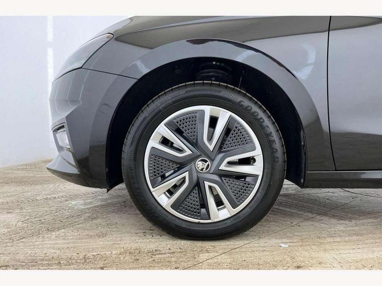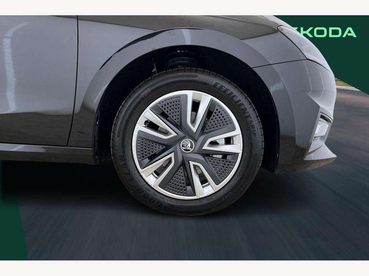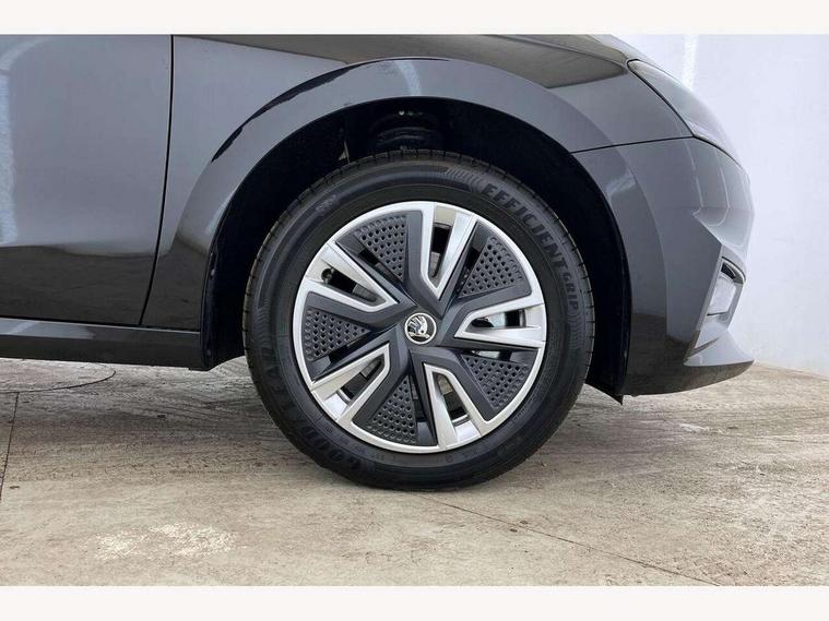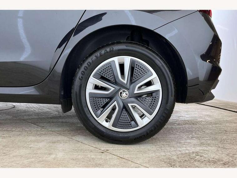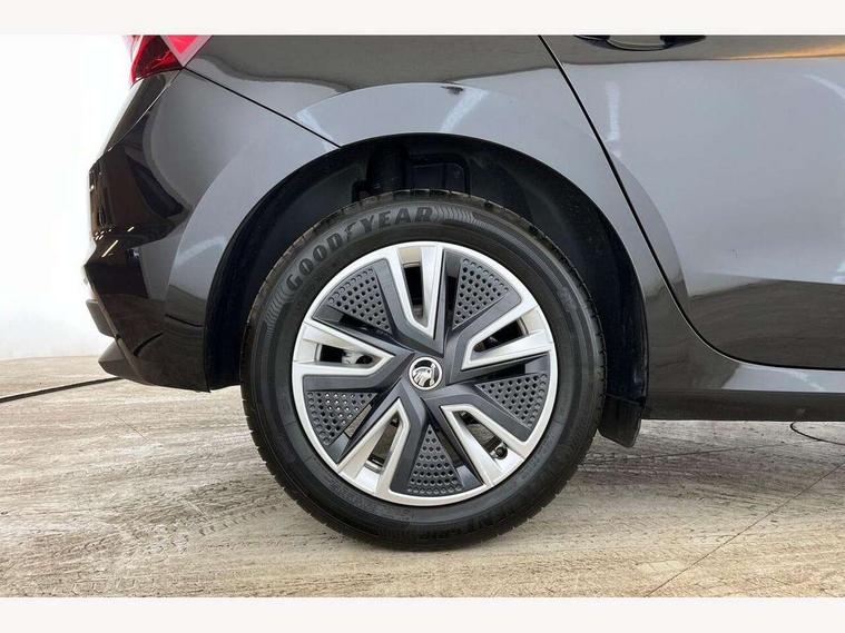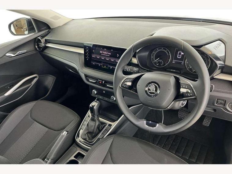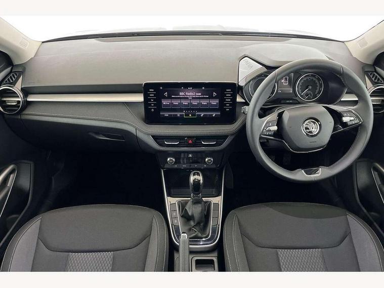 Bluetooth connection, Driver alert system - DAS, Electromechanical power steering, Exterior temperature gauge, Service interval indicator, 2x USB-C in the front (for data transmission and charging), 6 Speakers (4 in front and 2 in rear), Auxiliary socket for external MP3 player, DAB digital radio reception, Web radio, Auto dimming rear view mirror, Basic LED Headlights, Body colour door mirrors, Body coloured bumpers, Chrome window surround, Door mirror integrated indicators, Electrically adjustable and heated door mirrors, Front and rear electric windows, Front fog lights, Front window wiper intermittent control, Headlight range control - Automatic, Ice scraper in fuel cap, LED daytime running lights with coming and leaving home feature, Rain sensor, Rear LED fog light, Rear side wing doors, Rear window wiper with washing nozzles, Roof mounted spoiler, SKODA tailgate lettering in chrome, Third brake light, 3 rear headrests, Backrest split and folding, Central console with fixed cup holder and storage box, Chrome handbrake release button, Comfort seats, Fabric upholstery, Front centre armrest, Gearshift knob/handle in leather, Hand brake lever handle in leather, Height adjustable front headrests, Height adjustable front seats, Height adjustable steering wheel, ISOFIX and TopTether anchorage points to the outer rear seats, ISOFIX and TopTether on the front passenger seat, Luggage compartment lighting, Manually adjustable lumbar support in front seats, Pollen filter, Rear seat bench unsplit, Removable cup holder, Single front passenger seat, Storm grey headlining, Sun visors with mirror and airbag label on passenger side, Textile floor mats, Ticket holder, Umbrella in drivers door, 3-point height adjustable front seats belts with pretensioner and force limiter, Automatic warning lights in case of crash, Driver and passengers airbag with switch off function, e-Call+, ESC including ABS, MSR, ASR, EDS, HBA and XDS, Front and rear seat belt warning, FRONT ASSIST (AEB City and AEB Inter Urban), Front side airbags, Head airbags, Hill hold assist, One tone horn, Pedestrian protection, Three rear 3-points safety seat belts with pretensioner and force limiter including stop function for outer rear seat belts, Tyre pressure monitoring system, Anti-theft alarm system including immobiliser, interior monitoring, backup horn, and towing protection, Central locking with radio remote control, interior controls, SAFE function and 2 foldable keys, KESSY - Keyless engine start/stop, Chrome edged air vents, Satin black door and side trim panel in front, Anti-theft wheel bolts protection, Super-low rolling resistance tyres,