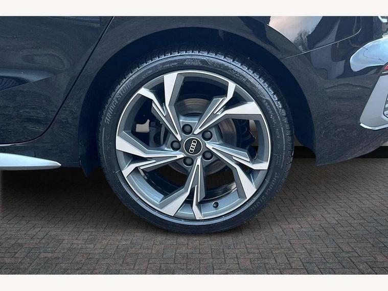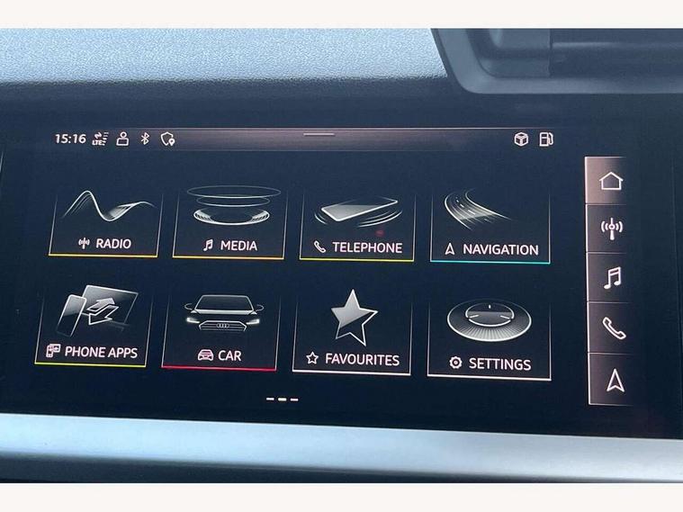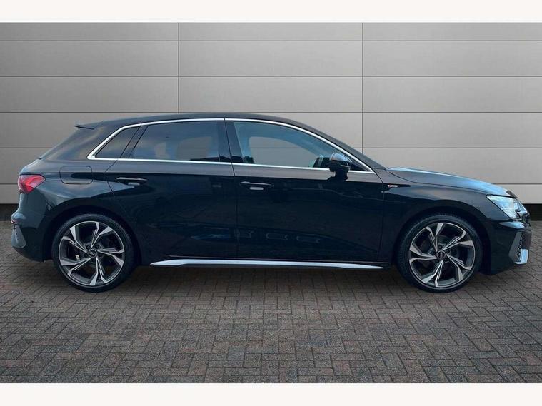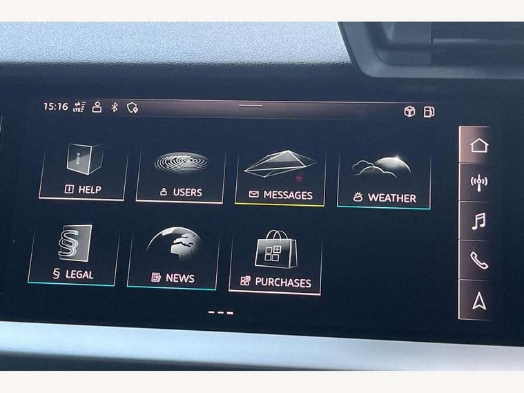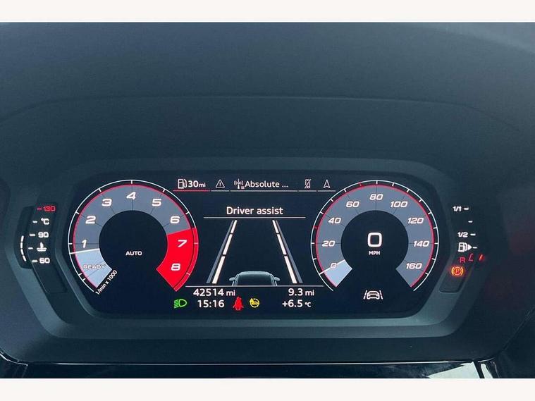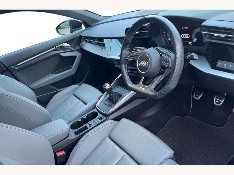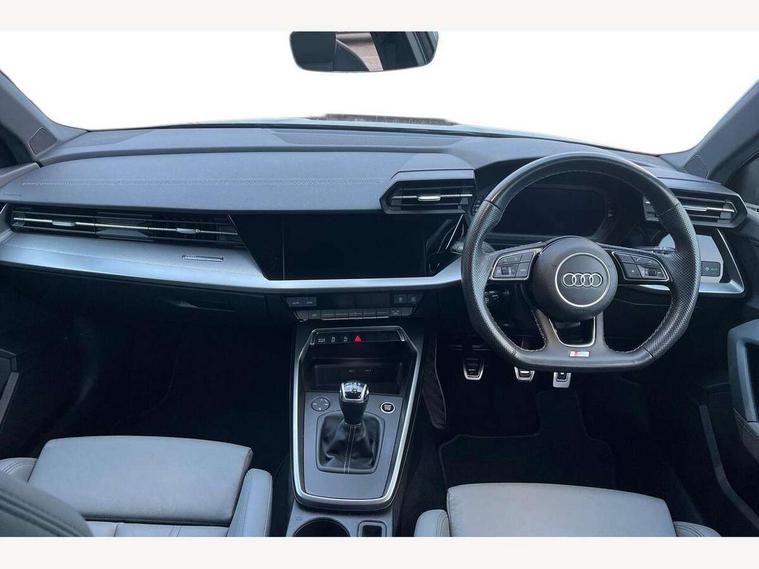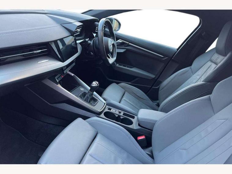 Audi connect emergency call and service, Audi drive select (Auto, Comfort, Dynamic, Efficiency and Individual), Audi smartphone interface, Audi Virtual Cockpit - 10.25" digital and colour instrument cluster, Automatic start/stop system with recuperation, Bluetooth interface, Collision avoidance assistant, Electromechanical power speed sensitive steering, Lane departure warning system, MMI Navigation Plus with high resolution 10.1" colour touch screen display, Service indicator, Trip computer, Voice control system with natural language interaction, 2xUSB-C connection with data and charging functions, 6 passive loudspeakers, DAB Digital radio, 3rd brake light, Acoustic glass windscreen, Aluminium window trim, Auto dimming frameless rear view mirror, Electrically adjustable/heated/folding/auto dimming door mirrors with integrated LED indications + kerb view function for passenger side, Front electric windows, Illuminated aluminium inserts front door sills with S logo, LED daytime running lights, LED headlights with LED rear lights and dynamic rear indicators, Light and rain sensors, Privacy glass - dark tinted rear window, rear door and side windows, Rear electric windows, Rear side air outlets in grained matt black, Rear side wing doors, Rear wiper, S line bumpers, S roof spoiler, 12V socket and storage compartment in front centre console, 3 seat bench in 2nd row, 40/20/40 split folding rear seat bench with cupholder, Black cloth headlining, Dual zone electronic climate control, Front and rear centre armrest in leather, Front and rear headrests, Front/rear floor mats, Height and reach adjustable steering wheel, Illuminated vanity mirror, Interior lighting - glove compartment light and right hand side, Luggage compartment floor covering, Manual boot compartment lid, Manually adjustable front seats, Seat side bolsters, Single front passenger seat, Stainless steel pedals and front footrest in black, Twin leather upholstery with front sports seats S embossed logo, Aluminium interior elements pack - A3 Sportback, S line styling pack - A3 Sportback, 3x3 point rear seat belts, Driver and front passenger airbag with passenger airbag deactivation, Electronic Stabilisation Control (ESC) including ABS, ASR and EDL, First aid kit with warning triangle and 2 safety vests, Front side airbags with head airbags and interaction airbag, Pre-sense front with pedestrian and cyclist detection, Seatbelt monitoring, Tyre pressure loss indicator, Anti theft alarm, Anti-theft wheel bolts, Immobiliser, Manual child locks, Remote control central locking, Accent surfaces in the dashboard and centre console in platinum grey silk effect paint finish, Dark spectrum aluminium inlays,