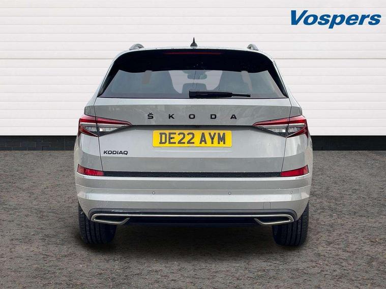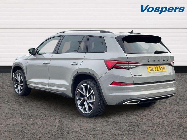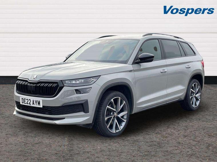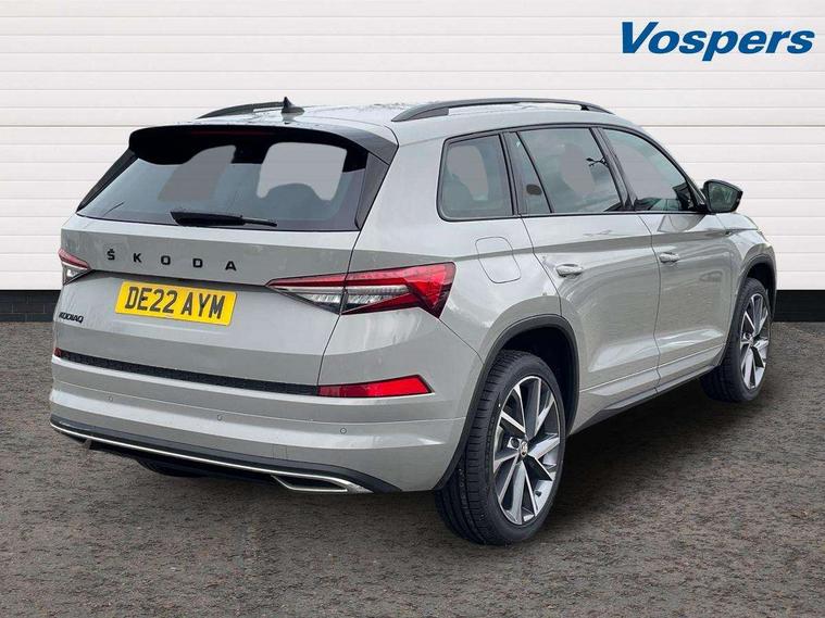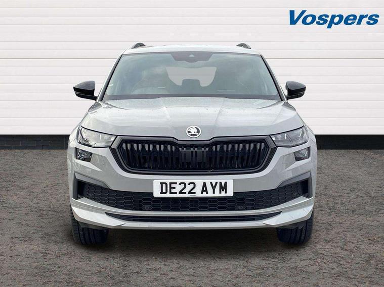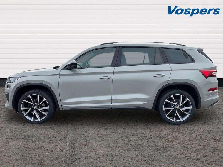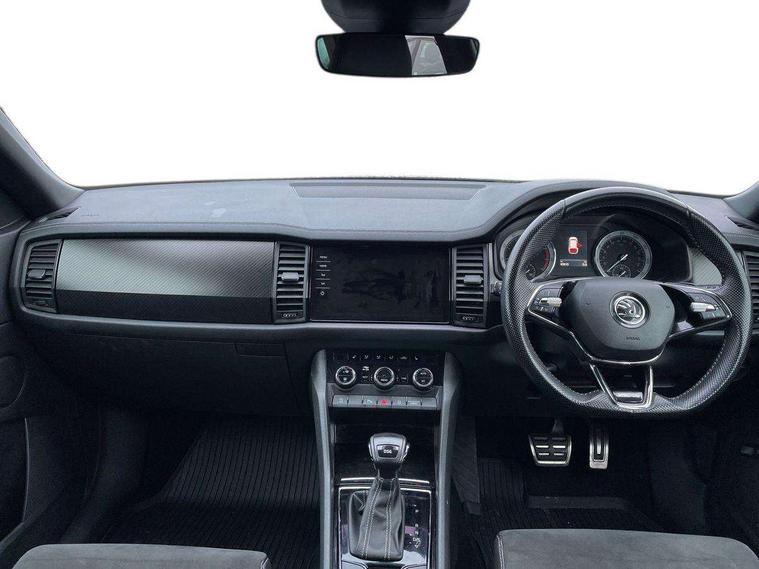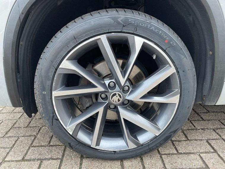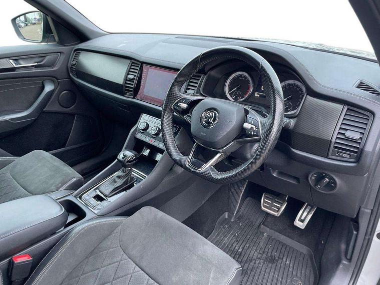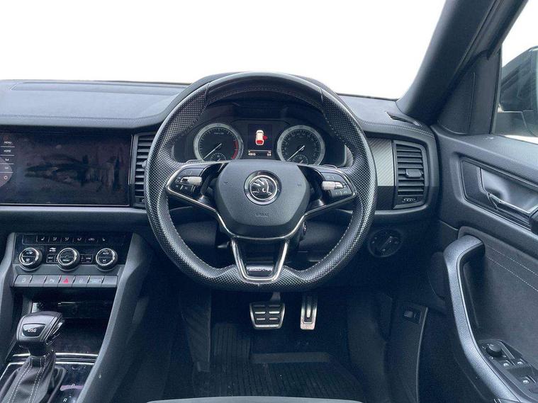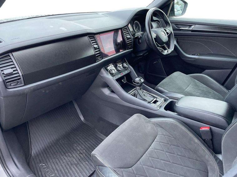 Bluetooth system, Columbus satellite navigation with 9.2" touchscreen, integrated Wi-Fi, web radio, E-call, ECO Stop/start function, Exterior temperature indicator, Progressive steering, Rear view camera, Smartlink wireless for apple carplay and wired for android auto, Speed limiter, USB C Port x 2 in front centre console, Wireless charging, 8 speakers, DAB Digital radio, Aero front windscreen wipers with intermittent function, Aero rear window wiper, Auto dimming rear view mirror, Black roof rails, Black sports styling including front grille and window surrounds, Black wheel arch surrounds, Body colour bumpers, Body colour door handles, Electric adjustable/heated/folding door mirrors, driver side auto dimming with boarding sports and memory function, Electric front and rear windows, Extended rear spoiler with finlets in gloss black, Front fog lights, Full LED matrix headlights with AFS (adaptive front light system), cornering function and AWL (all weather lighting system), Gloss black door mirrors, Headlight washers, Heated rear window, Invisible tailpipe, LED daytime running lights, LED rear fog light, LED third brake light in rear spoiler, Light assistant (coming/leaving home/tunnel light), Off-road style lower front bumper element, Privacy glass, Rain and light sensors, Rear diffuser, Rear LED lights (high functionality) with welcome effect and dynamic indicators, Rear side wing doors, Safety reflectors on front and rear doors, Sportline badge on front fender, Sports front and rear bumpers including lower rear chrome strip, Tailgate lettering in Black, Window control switches with black trim, 12V socket in boot, 2 rails with 2 hooks, 2 seat bench in 3rd row, 3 seat bench in 2nd row, 4 foldable roof handles with rear coat hooks, 60:40 foldable rear seat with sliding adjustment and backrest angle adjustment, Aluminium pedals, Black roof headlining, Bottle holders in door panel in the 1.5 litre front and 1 litre rear, Cargo storage compartments, Chrome headlight control button, Chrome interior door handles, Coat hooks on B pillar, Covered storage compartment on driver side, Decorative door sills in the front and rear, Front centre armrest with storage compartment, cup holder and 12V socket, Front courtesy lights, Gear shift lever with chrome frame and black gloss insert, Grey stitching in front and rear armrests and door armrests + door inserts, Height adjustable front headrests, Illuminated and cooled glovebox, Illuminated luggage compartment, Isofix child seat fittings in outer rear seats with top tether, Manually adjustable steering column, Microsuede door panels, Net programme in boot (1x horizontal Net, 2x vertical Nets), Overhead glasses storage compartment, Pollen filter, Rear centre armrest with cupholders, Single front passenger seat, Sliding trunk cover, Small Bags on the inner sides of the front backrests, Sports seats, Sunvisors with illuminated vanity mirrors, Three rear height adjustable headrests, Ticket holder on A Pillar, Umbrella in door panel, Variable boot floor, LED Interior light pack - Kodiaq, Auto door release and activation of warning lights, Child locks on rear doors, Driver and front passenger airbag with knee airbag and front passenger airbag deactivation, Electronic parking brake with hill start assist, Emergency rear braking signal, ESC (incl. ABS+MSR+ASR+EDS+HBA+DSR+RBS+MKB), Front assist with autonomous emergency braking, Front side airbags with curtain airbags, Fuel cut off safety device, Height adjustable front 3 point seatbelts + pretensioners, Hill hold control, Rear disc brakes, Safety vest holder in door, Seat belt reminder for all seats, Tailgate unlocking from outside, Three point rear seat belts, Two tone horn, Tyre pressure monitor, Alarm with interior monitoring and tilt sensor with safe function, Anti-theft wheel bolts, Immobiliser, Keyless entry and start system (KESSY), Remote central locking with 2 keys, Black air vent surround, Carbon finish dashboard and door inserts, Grey stitching in dashboard, 20" Vega Anthracite alloy wheels, Temporary spare wheel (space saver),