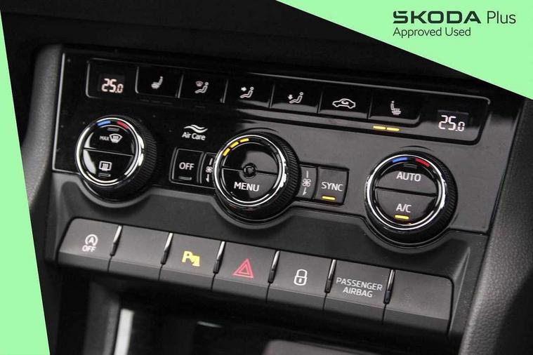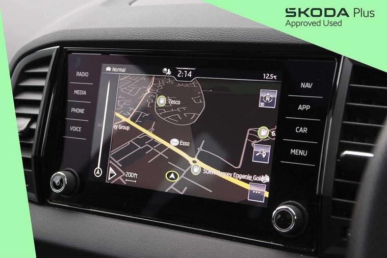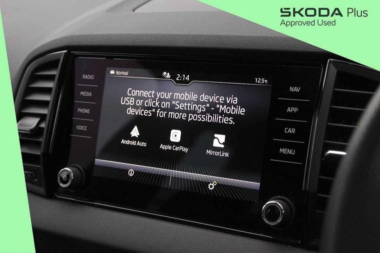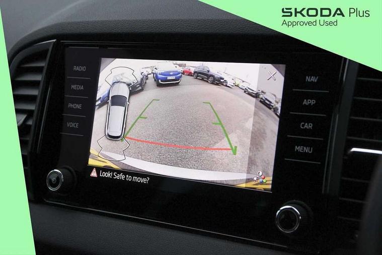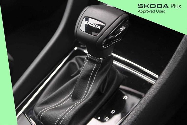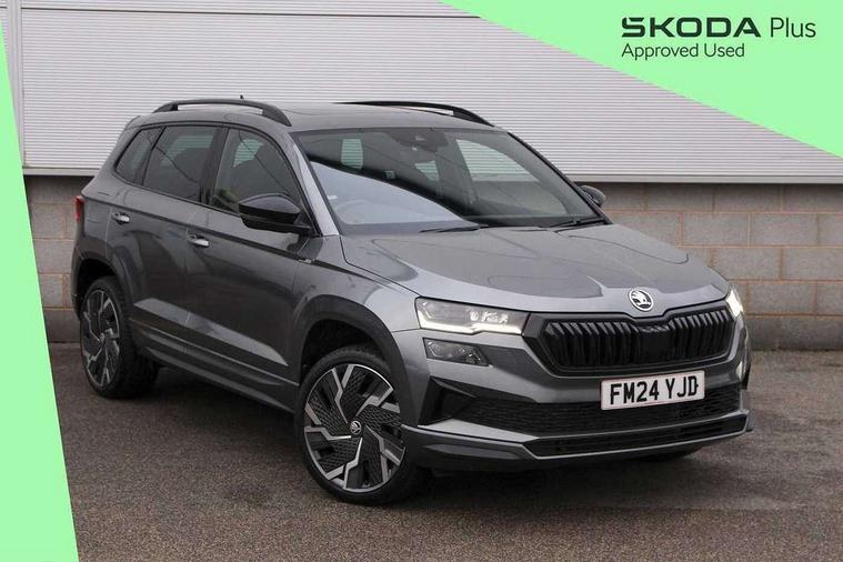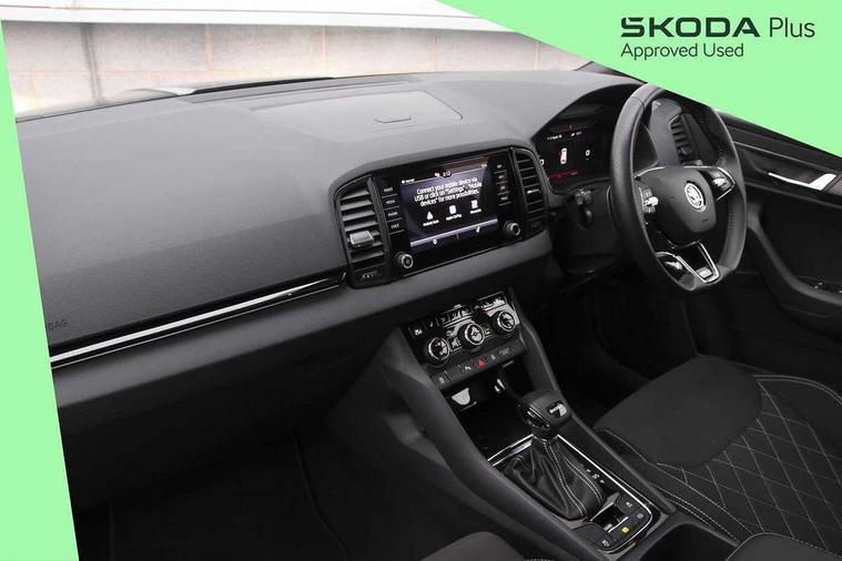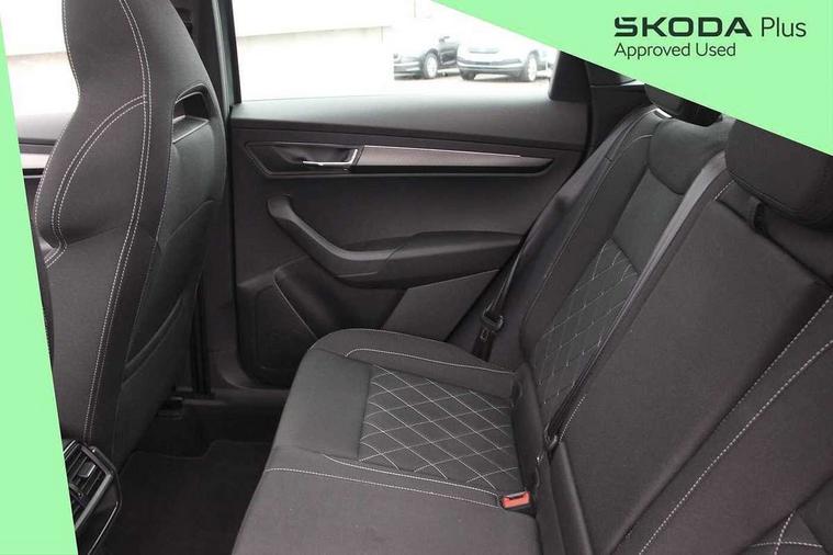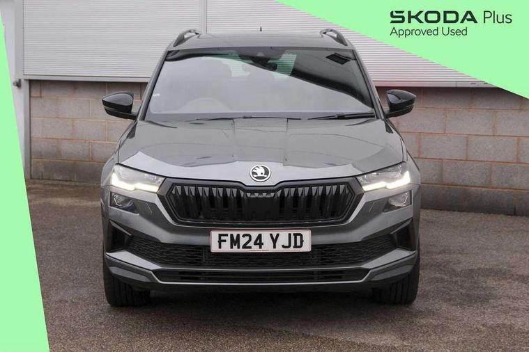 8" Digital display, Advanced driver attention and drowsiness monitor, Emergency services call system, Outside temperature gauge, Sensor for driver assistance systems, Service interval indicator, SmartLink wireless for Apple and wired for Android, Start/stop system with regenerative braking, USB C Port x 2 in front centre console, Virtual Cockpit - 10.25" digital display, Virtual pedal with electrically operated boot door, Wireless smartphone charging, Canton sound system, DAB radio with Bluetooth, USB connection, Acoustic glass, Aero front windscreen wipers with intermittent function, Auto dimming rear view mirror with light and rain sensors, Black door mirrors, Black electric window control buttons, Black radiator grille, Black roof rails, Body colour door handles, Electric front and rear windows with child proof lock, Front door steps with SportLine logo, Heated rear windscreen, LED 3rd brake light, LED daytime running lights, LED rear lights with high functionality welcome effect and dynamic indicators, Light assistant (coming/leaving home/tunnel light), Panoramic sliding sunroof, Plastic scuff plates in door apertures, Privacy glass, Protective door side sills in body colour, Rear diffuser, Rear side wing doors, Rear spoiler, Rear window wiper with washer system and intermittent control, Safety reflectors on front doors, Skoda lettering on tailgate in black, Sportline badge on front fender, Sportline decorative inserts with badging, Sports front and rear bumpers, 1.5 litre bottle holders in driver and front passenger door panels, 12V socket in boot, 12v socket in front centre armrest with storage compartment and rear air vents, 2 x Tablet holder, 3 rear height adjustable headrests, 3 seat bench in 2nd row, 3 spoke leather sports multifunction steering wheel and silver stitching with gear shift paddles, 4 foldable roof handles with rear coat hooks, Black floor carpet, Chrome inner door handles, Double sided boot floor, Foldable hooks in the boot, Front head restraints, Height adjustable front three point seats belts with tensioners, Height/reach adjust steering wheel, Ice scraper, Illuminated glovebox, Illuminated luggage compartment, Isofix child seat preparation for front passenger seat, Isofix child seat preparation outer rear, Manual lumbar support for front seats, Pen holder, Pollen filter, Rear boot cover, Rear reading lights, Rear seats fixed folding and divided 60:40, Rubbish bin door, Safety vest holder, Single front passenger seat, Storage box in upper central dashboard closed, Sunvisors with illuminated vanity mirrors, Textile floor mats, Ticket holder, Titan black interior ceiling, Umbrella under passenger seat, Under passenger seat storage compartment, Welcome animation with sportline logo, Light Pack - Karoq, Non Smokers pack, Automatic door unlocking in case of crash, Automatic fuel cut off in case of crash, Driver airbag, Electronic parking brake with auto hold function, Emergency rear braking signal, ESC including ABS, MSR, ASR, EDS, HBA, DSR, RBS, MKB and traction control, Front side airbags, Head airbags, Hill hold control, Knee airbags, Passenger airbag with switch-off function, Pedestrian monitor, Seatbelt reminder signalisation and pretensioner for all seats, Three point seatbelts rear, Two tone horn, Tyre pressure monitor, Alarm with interior monitoring, back up horn and tilt sensor with safe function, Electronic engine immobiliser, Keyless entry and start/stop, Remote central locking with 2 remote folding keys, Black air vent surround, Black centre console, carbon door decor, Satin black dashboard, Satin black door trim, 19" Sagittarius anthracite alloy wheels, Anti-theft wheel bolts protection, Breakdown and tool kit,