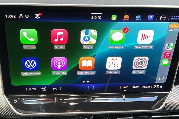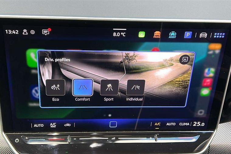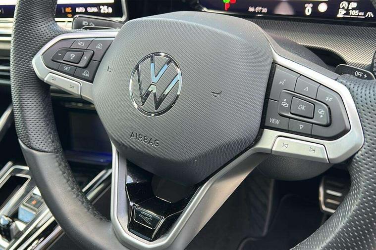 Activated carbon canister, Adaptive cruise control (ACC), Advanced driver attention and drowsiness monitor, Dynamic road sign display, Dynamic steering, E-Sim card for online connectivity, eCall emergency call system, Multi-color Digital cockpit pro, selection of different info profile possible, Multifunction front facing camera for distance control, Navigation system, Oncoming vehicle braking when turning including swerve support, Preparation for light assist system, Speed limiter, Speedo, rev counter, electronic odometer, trip, service interval display, exterior temperature and fuel gauge, Traffic jam assist, Voice enhancer and voice control, Warning signal and warning light for front and rear seatbelts not fastened, We connect plus preparation, We connect preparation, Wireless app connect, Diesel particulate filter, Hybrid propulsion system, Start-stop system with battery regeneration (recuperation - energy recovery during braking), XDS electronic differential lock for improved traction and handling, 2 USB C ports in front, 2 USB charging sockets on the centre console in the rear charging capacity upto 45W, Comfort telephony + wireless charging, without wireless aerial connection, Digital radio reception (DAB), Diversity antenna for FM reception, Gaming platform via car app, Infotainment system with 12.9" display, Mobile phone interface with inductive charging feature, 3rd brake light, Auto headlights, Automatic headlamp activation with Coming home and Leaving home feature, Body colored bumpers in R-Line style, Body colour door handles, Exterior ambient lighting with illuminated door handles, Exterior mirrors convex on the left and aspherical on the right, Front and rear electric windows, Heat insulating windshield made of laminated glass, LED daytime running lights, Rear exhaust tailpipe, Rear fog light on one side and reversing lights on both sides, Rear side wing doors, Rear windscreen washer and wiper with interval delay, Remote electrically foldable door mirrors, puddle lights and reverse activated passenger's door mirror, Welcome light with surround lighting, 12V socket in front centre console, 12V socket in luggage compartment, 3 rear head restraints, 3 seat bench in 2nd row, Ambient lighting with 30 colour including LED light unit in front footwell with selectable light colour, Brushed stainless steel pedals, Carpet mats, front and rear, Chrome plated radiator grille inserts, air vent surrounds and light switch surrounds, Front centre armrest, Integrated front head restraints, ISOFIX anchors for child seats on outer rear bench seats and on front passanger seat compatible for i-Size, Luggage compartment lighting, Plastic gear knob, Premium sports seats in front, Rear cupholder and loadthough, Single front passenger seat, Soul black instrument panel, Split folding backrest with centre armrest and unsplit rear seat bench, Storm grey roof lining, Sun visors with illuminated vanity mirrors, 3 point height adj front seatbelts + pretensioners, 3 rear three point seatbelts, ABS, Autonomous emergency braking front assist with pedestrian and cyclist monitoring, Child locks on rear doors, Driver and front passenger airbag with front passenger airbag deactivation, Electronic parking brake with auto hold, ESC (Electronic Stability Control), Extended pedestrian protection measures, Hill start assist, Rear disc brakes, Two tone horn, Tyre pressure loss indicator, Volkswagen roadside assistance, Anti theft wheel bolts, Preparation for alcohol interlock, Decorative inserts carbon grey for dashboard and front door trim panels,
