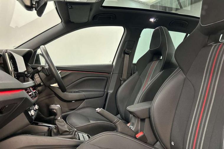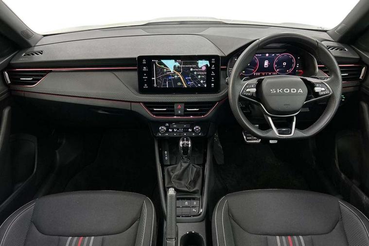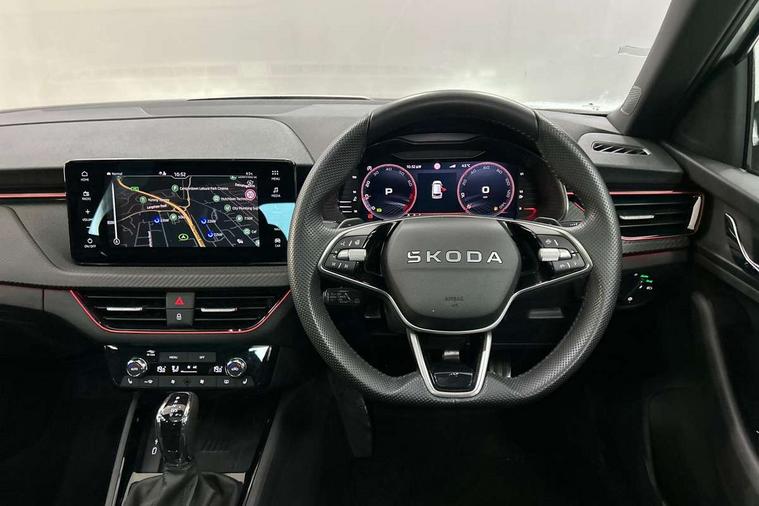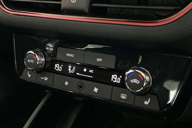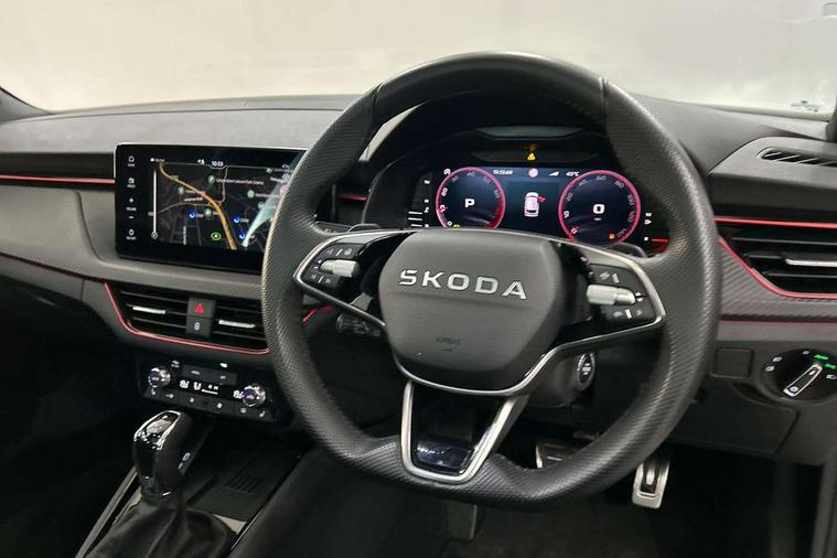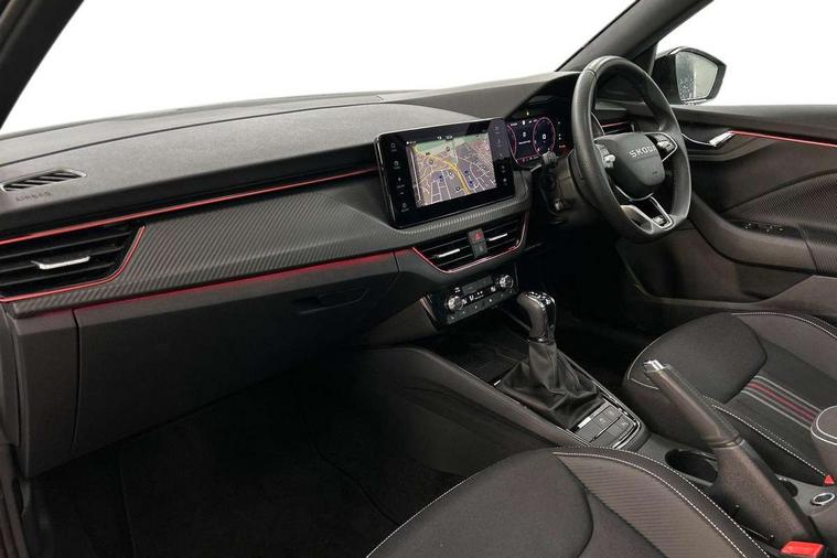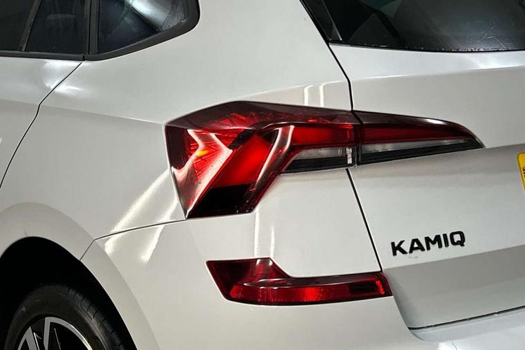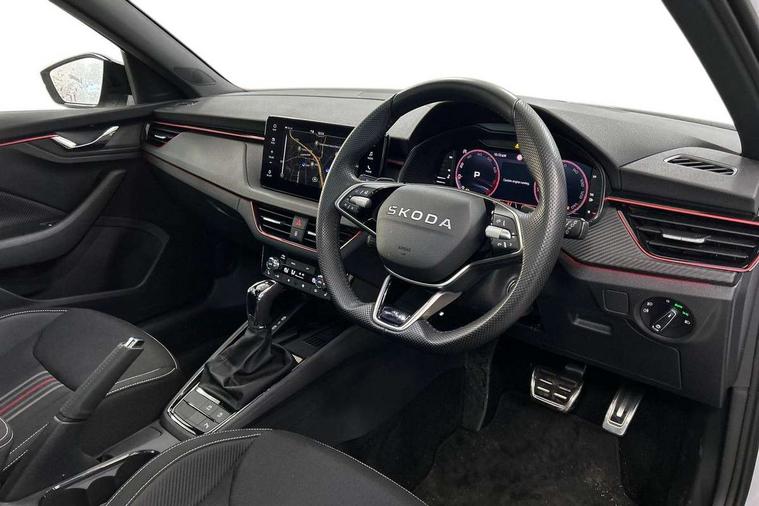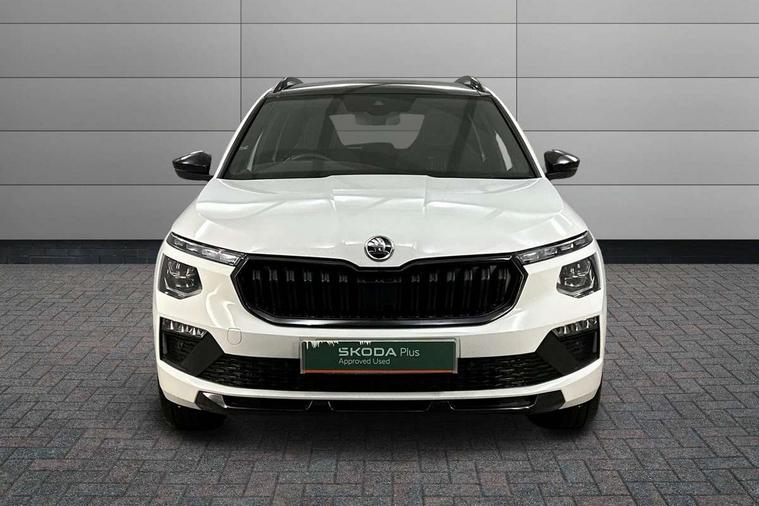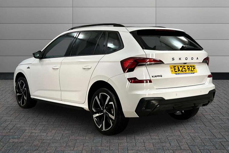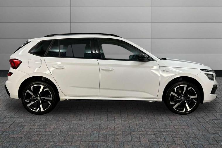 Advanced driver attention and drowsiness monitor, Bluetooth system, E-call, Front assist system, PAS, Rear parking sensors, Rear view camera, Service indicator, Speed limiter, Traffic sign recognition, Virtual cockpit with 10.25" display, Voice control system, Wireless smartlink, 4 USB C ports, 8 Speakers, 9.2" Skoda navigation display, DAB Digital radio, Auto dimming rear view mirror, Automatic headlight control with coming home and leaving home feature, Black door mirrors, Black radiator grille, Black rear diffuser, Black roof spoiler, Body colour bumpers, Body colour door handles, Boot lettering in black, Extended tailgate glass, Fixed panoramic sunroof with black roof rails, Front and rear electric windows, Heated rear window, LED daytime running lights, LED high beam, LED low beam, LED third brake light, Light sensors, Monte carlo plaque, Privacy glass, Rear side wing doors, Rear wiper, Ticket holder inside windscreen, 12V socket in luggage compartment, 3 seat bench in 2nd row, Aluminium pedals, Ambient lighting in white/red, Art leather carbon decor inserts, Art leather carbon door inserts, Black roof lining, Cargo elements, Chrome inner door handles, Driver and passenger sun visors with vanity mirror, Dual zone climate control, Front and rear roof lights, Front centre armrest, Front head restraints, Glove compartment with illumination, Height adjustable driver seat, Height adjustable front passenger seat, Ice scraper, Inner circulation control with pollen filter, ISOFIX on front passenger seat, Isofix preparation for back seats, Leather gearknob and handbrake lever, Manual lumbar support for front seats, Monte Carlo cloth upholstery, Net package and top tether hooks in boot space, Net under rear shelf, Pocket on the back of both front seats include mobile phone pockets, Rake/reach adjustable steering wheel, Reading lights, Rear centre armrests, Red hotstamping, Single front passenger seat, Sports seats, Textile floor mats, Third rear headrest, Top tether for front passenger seat, Umbrella in driver's door, Light and view plus package - Kamiq, 3x3 point rear seatbelts, Airbags - driver and front passenger, Disc brakes, ESP, Extended and predictive pedestrian/cyclist protection, Front passenger airbag deactivation switch, Front side airbags with curtain airbags, Hill hold control, Manual leather parking brake, Manual rear child locks, One tone horn, Seatbelt reminder for driver an co-driver, Traction control, Tyre pressure monitor, Anti-theft alarm system with interior monitoring, backup horn, towing protection and remote central locking with SAFE system, Anti-theft wheel bolts, Electronic engine immobilizer, 18" Ursa black diamond cut alloy wheels,