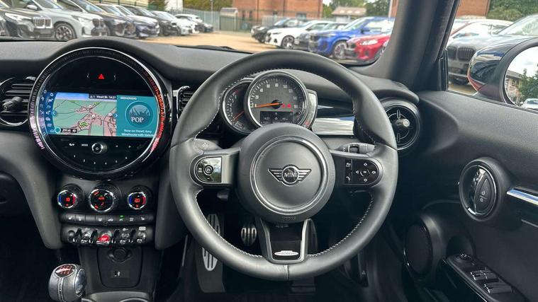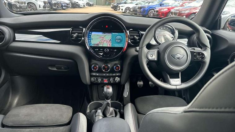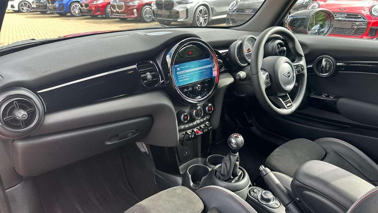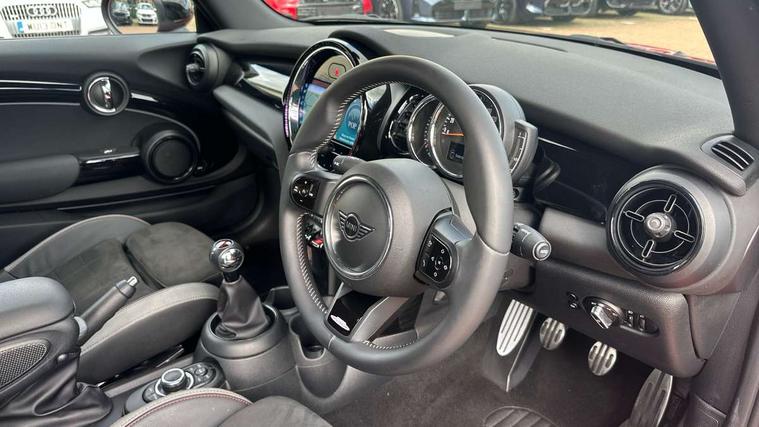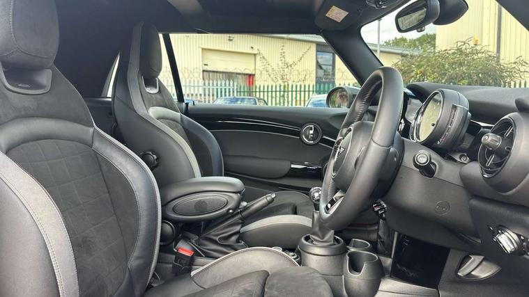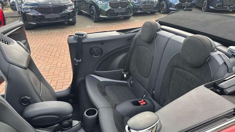 Apple CarPlay, Automatic start/stop function with brake energy recuperation, Compatible mobile phone bluetooth with audio streaming, Cruise control with brake assist, Electro-mechanical speed dependant steering assistance, Instrument cluster, MINI Driving Modes - centre toggle switch to control driving setting (sport, mid and green), Mini E-call, MINI TeleServices, On board computer, Rear park distance control, Service interval indicator, 6 Speed manual transmission including gear change indicator display, Adaptive suspension, Double Vanos system, Fully variable valve control, High precision injection, Performance Control, 8.8" touchscreen with LED ring, FM tuner and DAB digital radio, Automatic headlight activation switch, Body colour fuel filler cap, Chrome border high gloss black slats radiator grille, Dynamic brake lights, Electric windows, Fully electric black softtop with integrated sunroof functionality, Heated rear window, Heated windscreen washer jets, John Cooper Works - aerodynamic kit (front and rear apron, spoiler), front and rear sport bumpers and part-painted side sills with door sill finishers, LED headlight with closed ring and daytime driving lights, Left exhaust tailpipe with chrome finisher, Metal door sill strips with MINI imprint, Model logo Cooper on right of tailgate, Rain sensor window wipers, Rear boot, Rear fog lights, Rear LED lights with union jack design, Side scuttle panel with integrated indicator, Sun/heat protection glass, Third brake light, White indicator lenses, 12V Accessory socket in centre console, 2 seat bench in 2nd row, 4 lashing eyes in luggage compartment, 50/50 split folding rear seats, Chrome interior highlights, Colour line - Carbon black, Cupholders, Easy Load boot handles, Front and rear isofix with front passenger airbag deactivation, Glove compartment, Height and length steering column adjustment, Interior lighting with 12 different colours running across the dashboard, underneath door bezel illuminated laser engraved design on central display, John Cooper Works walk nappa leather steering wheel with grey seam and John Cooper Works badge on piano black lower steering wheel spoke, Leather gearshift lever and handbrake gaiters, Leatherette integrated headrest, adjustable thigh support with john cooper works logo, LED reading lights, vanity mirror lights, front foot well light and spotlight on front seats, Manual air conditioning, Mechanical seat adjustment, driver seat height adjust, forward/back and front seats backrest, Multifunction steering wheel, Rear head restraints, Single front passenger seat, Sports steering wheel, Storage compartments in doors, Sunvisors with vanity mirrors, Velour floor mats, Convertible pack with comfort access - Mini Convertible, Piano black exterior pack - Mini Convertible, 3 point seatbelts on all four seats, 6 Airbags - front, side and seat belt tensioners, Active rollover protection, Anti-lock braking system (ABS), DSC - Dynamic Stability Control, Front and rear disc brakes, Hill start assist, Single tone fanfare horn, Tyre pressure monitoring system, Alarm system with tilt sensor, monitoring doors, bonnet interior and tailgate, Electronic vehicle immobiliser, Keyless Go, Piano black interior trim, Tool kit,
