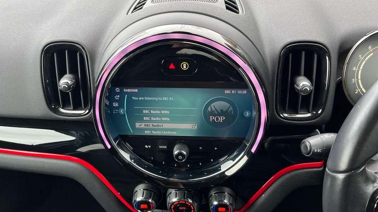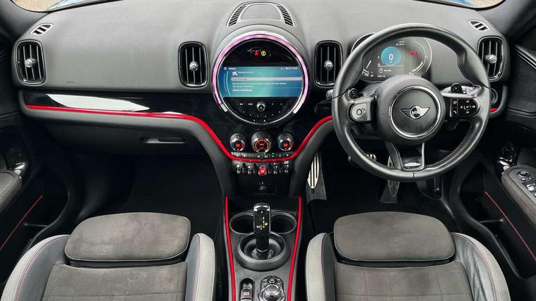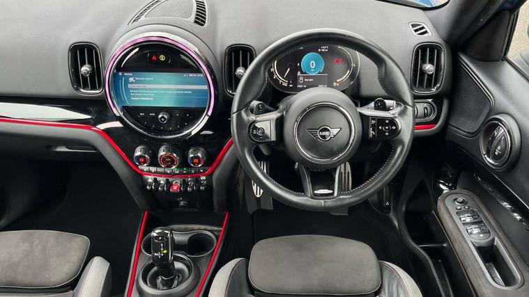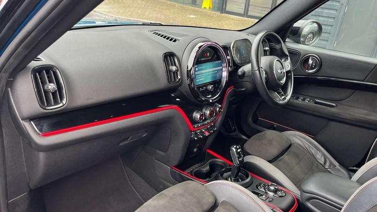Active Guard incl speed limiting and lane departure functions with auto steering, and front collision warning with brake intervention, Automatic start/stop function with brake energy recuperation, Compatible mobile phone bluetooth with audio streaming, Electro-mechanical speed dependant steering assistance, Instrument cluster, On board computer, Rear parking distance control, 51 Litre fuel tank, Double Vanos system, Fully variable valve control, High precision injection, Performance Control, Sport automatic transmission with steering wheel paddles, FM tuner and DAB digital radio, Bonnet scoop, Chrome fuel filler cap, Day time driving lights, Dynamic brake lights, Electric windows, Heated rear window, Heated windscreen washer jets, John Cooper Works - aerodynamic kit (front and rear apron, spoiler), front and rear sport bumpers and part-painted side sills with door sill finishers, John Cooper Works Logo, LED fog lights, LED Headlights, Metal door sill strips with Cooper S imprint, Model logo, Model logo on Tailgate, Rain sensor with auto headlights, Rear fog lights, Rear window wiper, Side scuttle panel with integrated indicator, Split rear doors, Sun/heat protection glass, White indicator lenses, 12V socket in centre console, 360L luggage compartment capacity, 4 lashing eyes in luggage compartment, 40:20:40 split folding rear seats, Anthracite headlining with grab handles and clothes hooks, Chrome interior highlights, Colour line - Carbon black, Cupholders, English handbook, Floor mats, Front headrests, Glove compartment, Height and length steering column adjustment, Interior lighting with 12 basic colours selectable via toggle switch in roof, Isofix rear child seat preparation, LED reading lights, vanity mirror lights, front foot well light and spotlight on front seats, Manual air conditioning, Mini John Cooper Works leather gearshift lever and handbrake gaiters, Multifunction steering wheel, Nappa leather steering wheel with MINI Yours logo, Rear headrests, Stainless steel pedals and foot rest, Storage compartments in doors, Sunvisors with vanity mirrors, Tool kit, Excitement pack - Countryman, Navigation pack - Countryman, Piano black exterior pack - Countryman Cooper S/SD/SE/Boardwalk, 2 tone horn, 3 point seatbelts on all seats, 6 Airbags - front, side, head and seat belt tensioners, Anti-lock braking system (ABS), DSC - Dynamic Stability Control, Electronic handbrake, Front and rear disc brakes, Hill start assist, Tyre pressure monitoring system, Alarm system with tilt sensor, monitoring doors, bonnet interior and tailgate, Auto drive away locking, Deadlocking function, Electronic vehicle immobiliser, Locking wheel bolts, Start/stop toggle with keyless go, Piano black JCW interior trim,