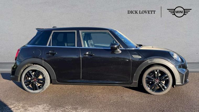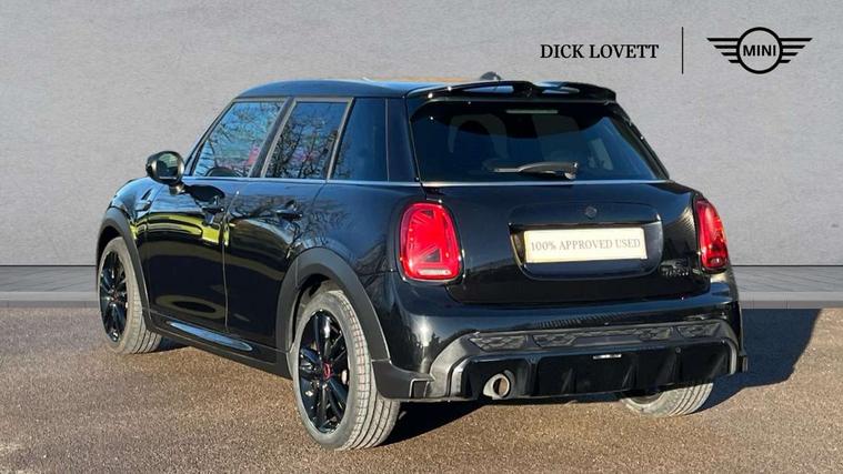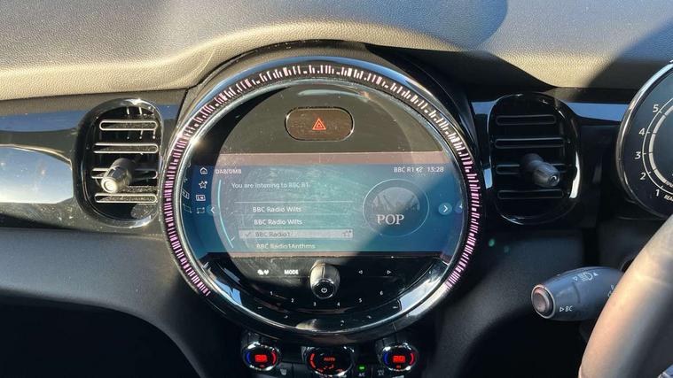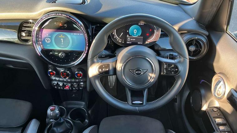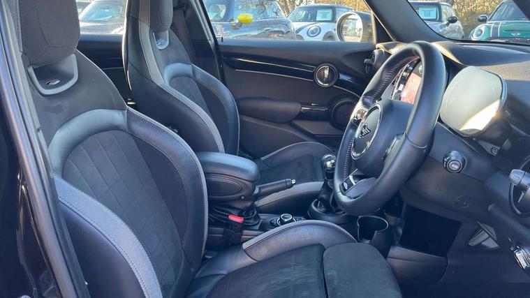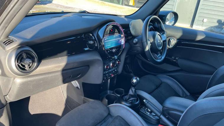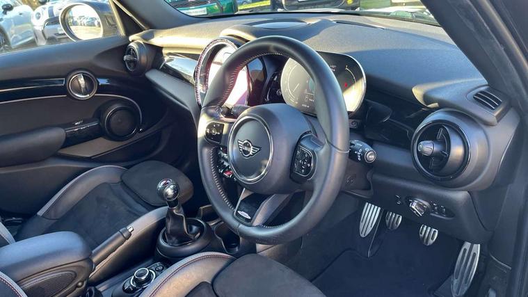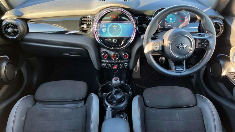 Automatic start/stop function with brake energy recuperation, Compatible mobile phone bluetooth with audio streaming, Cruise control with brake assist, Electro-mechanical speed dependant steering assistance, Flexible car sharing preparation, Instrument cluster, MINI Driving Modes - centre toggle switch to control driving setting (sport, mid and green), Mini E-call, MINI TeleServices, On board computer, Rear park distance control, Service interval indicator, 6 Speed manual transmission including gear change indicator display, Adaptive suspension, Double Vanos system, Fully variable valve control, High precision injection, Performance Control, 6 speakers in front door trims and underneath front seats, 8.8" touchscreen with LED ring, FM tuner and DAB digital radio, Automatic headlight activation switch, Body colour fuel filler cap, Chrome border high gloss black slats radiator grille, Dynamic brake lights, Electric front+rear windows, Exhaust tailpipe on left with chrome finisher, Heated rear window, Heated windscreen washer jets, JCW Aerodynamic kit - Front and rear bumpers with sporty JCW styling and part-painted side sills with MINI John Cooper Works door sill finishers, John Cooper Works rear spoiler, LED headlight with closed ring and daytime driving lights, Metal door sill strips with MINI imprint, Model logo Cooper on right of tailgate, Rain sensor window wipers, Rear fog lights, Rear LED lights with union jack design, Rear window wiper, Side scuttle panel with integrated indicator, Sun/heat protection glass, White indicator lenses, 12V Accessory socket in centre console, 4 lashing eyes in luggage compartment, 60/40 split folding rear seat, Anthracite headliner including grab handles and clothes hooks, Carbon black colour line - Knee roll and door armrest, Chrome interior highlights, Cupholders, Front and rear isofix with front passenger airbag deactivation, Glove compartment, Height and length steering column adjustment, Interior lighting with 12 different colours across the dashboard, underneath door bezel with illuminated laser-engraved design on central display, JCW Sport seats with integrated headrests, adjustable thigh support and John Cooper Works logo, Leatherette gearshift lever and handbrake gaiters, LED reading lights, vanity mirror lights, front foot well light and spotlight on front seats, Manual air conditioning, Mechanical seat adjustment - forward/back & backrest for front seats and driver seat height adjust, Multifunction steering wheel, Storage compartments in doors, Sunvisors with vanity mirrors, Velour floor mats, Walknappa leather steering wheel with grey seam and John Cooper Works badge on Piano Black lower steering wheel spoke, Piano black exterior pack - Mini Hatchback Cooper, 3 point seatbelts on all five seats, 6 Airbags - front, side, head and seat belt tensioners, Anti-lock braking system (ABS), DSC - Dynamic Stability Control, Front and rear disc brakes, Hill start assist, Single tone fanfare horn, Tyre pressure monitoring system, Alarm system with tilt sensor, monitoring doors, bonnet interior and tailgate, Electronic vehicle immobiliser, Start/stop toggle with keyless go, Piano black interior trim, Tool kit,