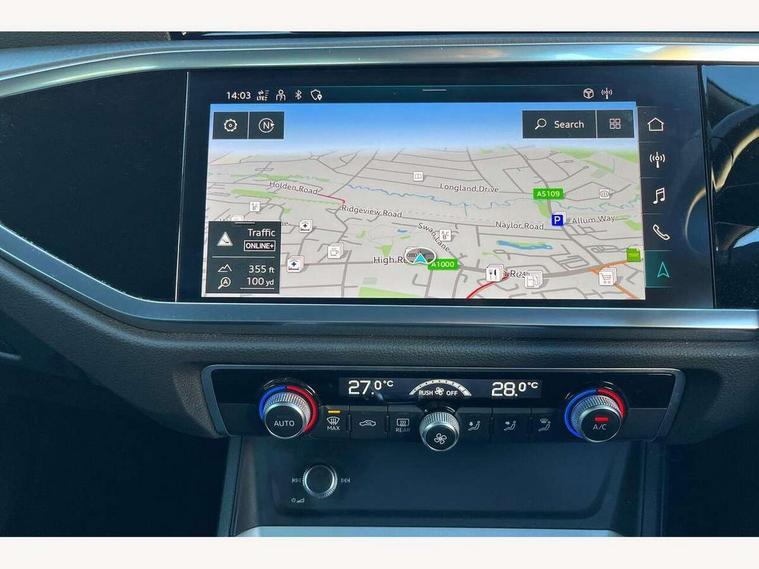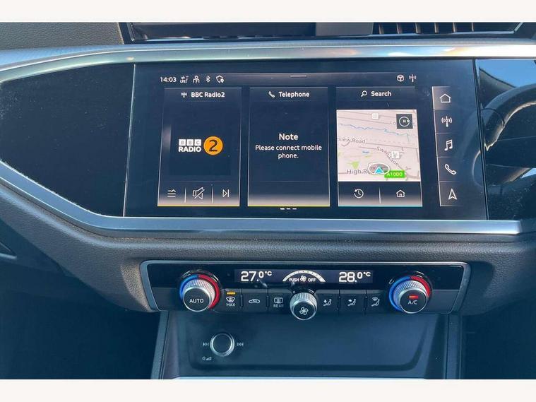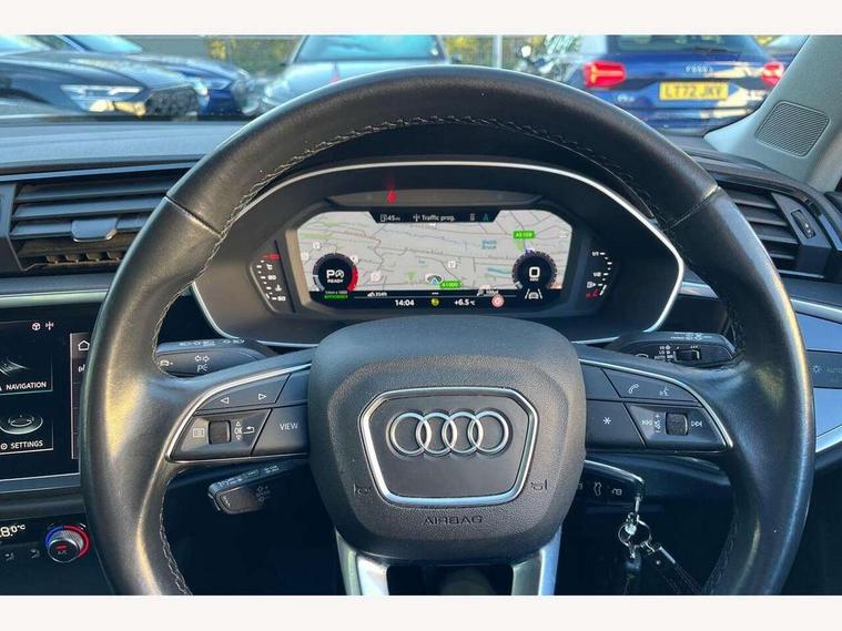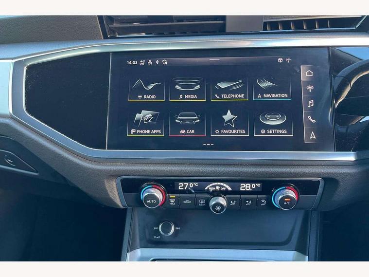 Amazon alexa Integration, Audi drive select, Audi lane departure warning, Audi Virtual Cockpit - 10.25" display, Bluetooth interface, Camera based traffic sign recognition, Legal emergency call, MMI Navigation Plus with high resolution 10.1 inch touchscreen colour display, Power operated tailgate, Progressive steering, Service interval indicator, Smartphone interface includes wireless Apple carplay/Android Auto, Start stop system with recuperation, Voice control system with natural language interaction, Standard suspension, 2 USB-C ports with charge and data functions, 6 passive loudspeakers, DAB digital radio module, Acoustic windscreen, Auto dimming frameless rear view mirror, Black roof rails, Body colour door mirrors, Diffuser in grained anthracite, Electrically folding, adjustable and heated door mirrors with integrated LED side indicators and kerb view function for passenger side, Exterior bumper with wheel arch trims and side sill trims in grained black matt, Front and rear electric windows, Grained radiator protective grille, Halogen rear lights, LED headlights with LED daytime running lights, Rain and light sensors, Rear side wing doors, Rear wiper, Third brake light, Variable front intermittent wipers, 12V socket in rear centre console, 3 seat bench in 2nd row, 3 spoke multi-function leather steering wheel, 40:20:40 folding with manual adjustment for 60:40 forwards/backwards position and backrest angle, Dual zone electronic climate control, Front and rear floor mats, Front and rear headrests, Front and rear roof module including reading lights, Front centre armrest, Glove compartment lighting, Height and reach adjustable steering wheel, ISOFIX child seat mounting for front passenger with airbag deactivation and outer rear seat including top tether attachment point for outer rear seats, Luggage compartment light, Lunar silver cloth headlining, Manual front seats with height adjustment, Single front passenger seat, Stainless steel luggage compartment sill finisher, Non smoking pack - Q3, 3x3 point rear seatbelts, 6 airbags - Driver, front passenger, curtain and side windows, Audi pre-sense front with pedestrain and cyclist recognition, Electrically operated child locks on rear doors, Electromechanical parking brake, Electronic stabilisation control including ABS, ASR and EDL, Front seatbelt reminder, Hill descent control, Hill hold assist, Pre sense basic, Seatbelt monitoring, Tyre pressure warning, Warning triangle and first aid kit, Anti theft alarm, Anti theft wheel bolts, Immobiliser, Remote central locking, Detail dashboard around MMI touch colour display in glass look, black with surround in aluminium look, Micrometallic silver inlay, 17" 5 twin spoke design alloy wheels,