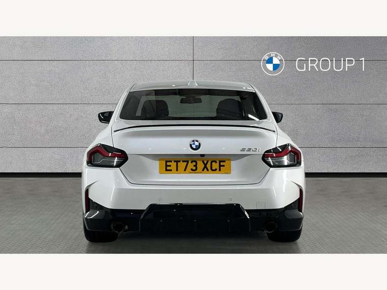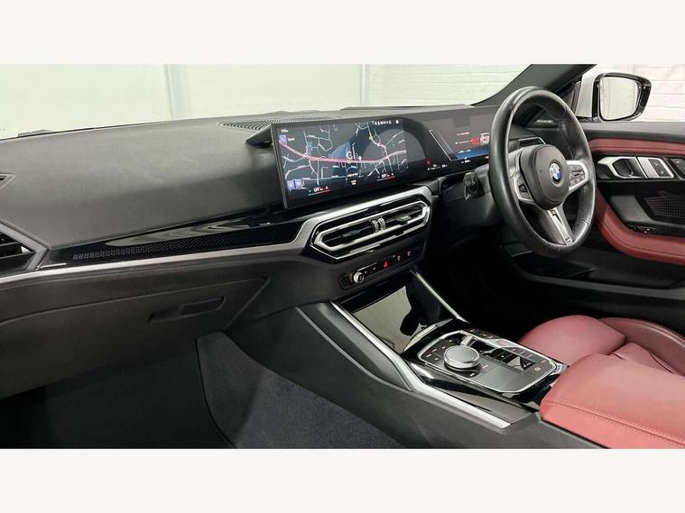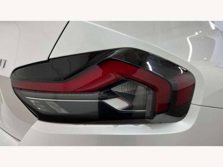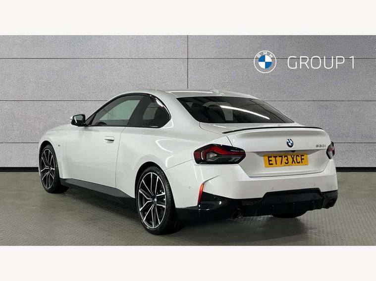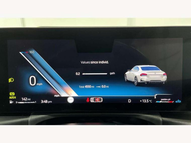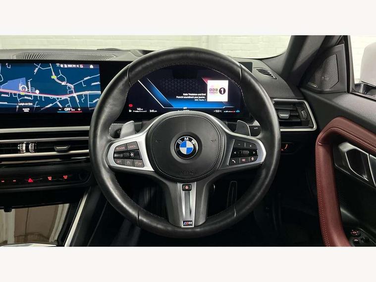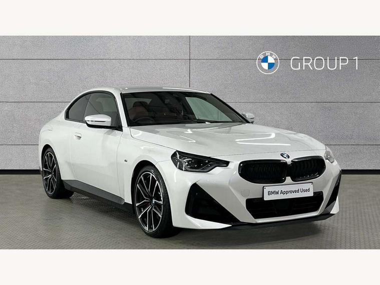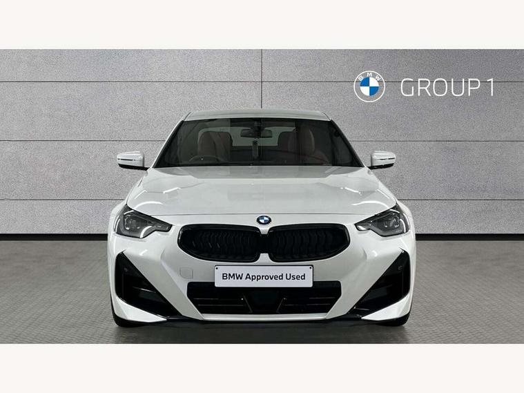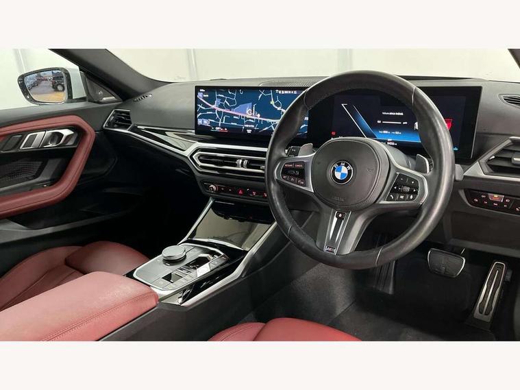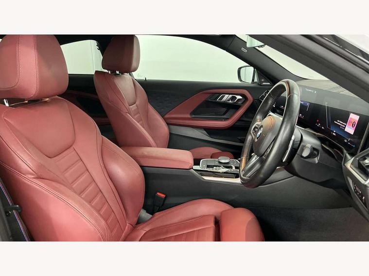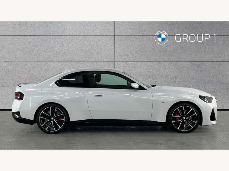 2 USB connections for charging and transferring data, 4G LTE connectivity with hard wired 4G network sim card, Attentiveness assist, Bluetooth with USB, BMW ConnectedDrive online services, BMW Intelligent Personal Assistant, BMW operating system 8 with variable, configurable widgets display information in real time, BMW Teleservices, Check Control warning system for monitoring of lights and door/luggage compartment open warning, Direct selection buttons, Drive off assistant, Eco pro mode, Electric power steering, Front and rear parking sensors, Front/rear Parking distance control, iDrive controller with turn and press function, Integrated owners handbook, Intelligent functions, Live cockpit plus with nav function 12.3" instrument cluster and 14.9" centre display, Oil sensor for level and grade, Optimum shift indicator, Personal Profile, Touch operation on control display, Variable sport steering, Widescreen multi-media display, WiFi interface for wireless connection of mobile terminal devices, Aluminium lightweight construction, Balancer shaft, BMW TwinPower Turbo four-cylinder petrol engine, Double VANOS, Drive performance control with ECO PRO comfort + sport mode, Electronic differential lock, High precision injection, M sport suspension, Petrol Particulate Filter, Sport automatic steptronic transmission with gearshift paddles, manual gearshift time display, launch control, coasting idle ECO PRO/COMFORT modes, Twin scroll turbocharger with Valvetronic, DAB tuner, Acoustic windscreen wipers for reduced driving noise, Adaptive LED Headlights, Automatic windscreen wipers and automatic headlight, Automatically dimming rear view mirror, Body colour door handles flush with door surface, Body colour door mirrors, Body colour front and rear bumpers, Daytime running lights, Electric windows - front and rear, with open/close fingertip control and trap release, Exhaust tailpipes x2 - 90mm in left and right, Fading support, Front and rear bumper system with replaceable deformation elements, Front door sill finishers in black plastic with BMW designation, Front windscreen wipers with integrated washer jets, Green tinted heat protection glazing, High beam assistant, High gloss black sill, bumper trim sides and diffuser insert, High gloss shadowline exterior trim in mirror triangle cover, mirror cover panel, mirror bezel and window border, High level third brake light, Indicators integrated int mirror housing, LED registration plate light, LED technology rear tail lights, brake lights and turn indicators, Lightweight engineering, Model designation on right side of tailgate, One piece kidney grille with hight gloss chrome surround, Rear boot, Rear fog lights, Reversing light in rear light cluster, Shark fin antenna, Single part LED rear lights with smoked glass components, Trailer stabilisation logic, Visible VIN plate, 12V power socket in front centre console with blanking plug, 2 cupholders in front centre console, 2 zone automatic air conditioning, Ambient lighting, Compartment in front of cupholder, Conditioned based service, Driver seat backrest width adjustment, Front and rear side armrests integrated into door trim, Front armrest, Front door pockets, Front head restraints, Front sport seats, Heated front seats, Illuminated glove compartment with separate small compartment, M headliner Anthracite, M sport leather steering wheel, Manually adjustment steering wheel column, Rear seat backrest with manual 40:20:40 split folding, Rear seat centre foldable armrest with integrated cup holder, Single front passenger seat, Storage compartment between rear seats, Storage tray and compartment with cover in centre console, Sun visors with vanity mirrors and insert tab, Through loading system with 40/20/40 split folding 2 rear seat in 2nd row, Two folding rear seat headrests, Velour floor mats, Additional storage compartment pack without USB - 2 Series Coupe, Connected pack professional - 2 Series Coupe, Interior and exterior mirror pack - 2 Series Coupe, M Sport exterior styling aerodynamics pack - 2 Series Coupe, 2 tone horn, Anti lock braking system (ABS) with cornering brake control, Automatic Stability Control (ASC), BMW emergency call, Brake drying, Child seat ISOFIX attachment for the two outer rear seats, Crash sensor activating of airbags, Unlocking doors, hazard warning lights, interior light, safety battery terminal, Deactivation of fuel pump in the event of a crash, Driver and front passenger airbags, Driver and front passenger side airbags, integrated in the door side seat backrest bolsters for all seat variants, Dynamic brake control, Dynamic stability control + (DSC+), Dynamic Traction Control - DTC, Electrically operated hand brake including automatic hold function and automatic release when driving off, Front and rear disc brakes, Head airbags for all 4 outer seats, Manual deactivation of front passenger airbag, Seat belt security check for driver and front passenger, Seatbelt warning, Side impact protection, Three point seat belts on 4 seats including front belt stopper, pyrotechnic belt tensioners and belt force limiters, Tyre pressure sensor, Warning triangle and first aid kit, Alarm system (Thatcham 1) with remote control and electronic engine immobiliser, Central locking switch for all doors, fuel filler cap and luggage compartment, Deadlocking function system to all doors, Drive away locking system on all doors and luggage compartment, Locking wheel bolts, Start/Stop button (illuminated) in centre console with keyless engine start and Auto Start-Stop deactivation button, Two remote control key with integrated key - one button for open and close doors/fuel flap/tailgate and separate button for unlock luggage compartment, BMW mobility tyre sealing system, Electrically powered 12V compressor, Reduced rolling resistance tyres,