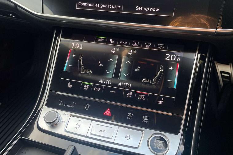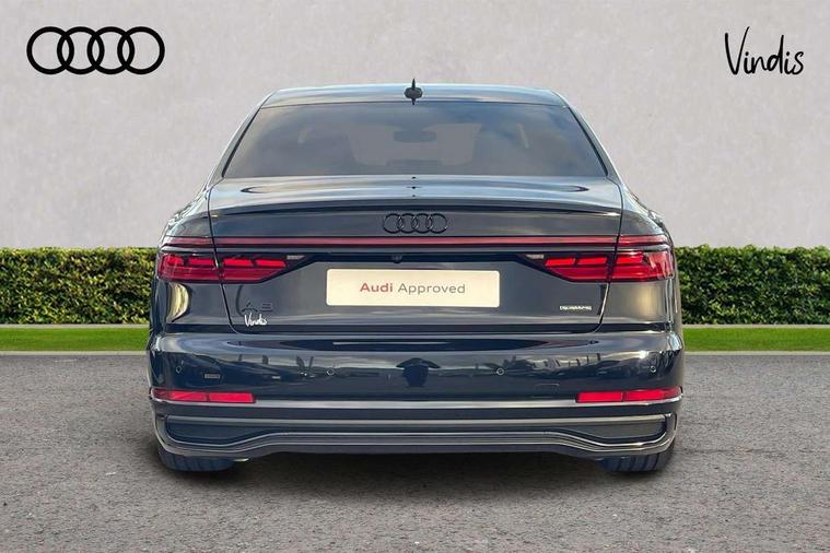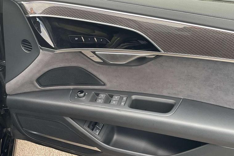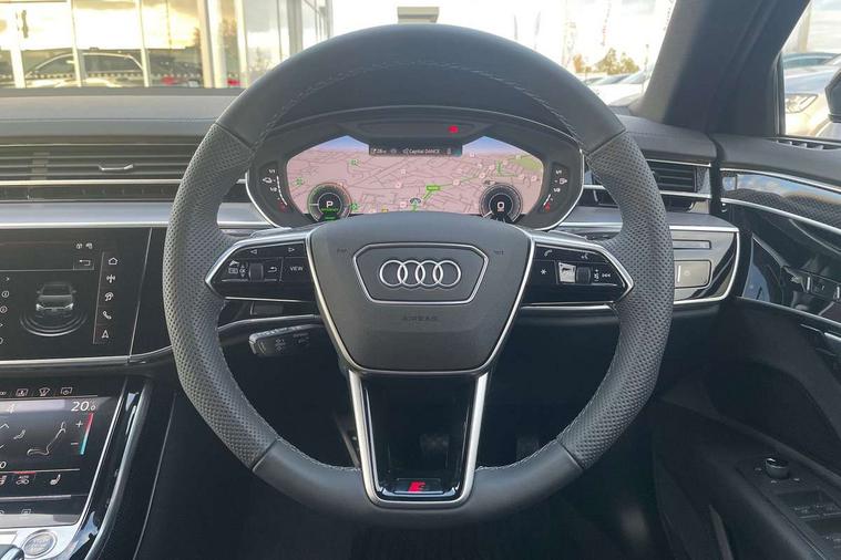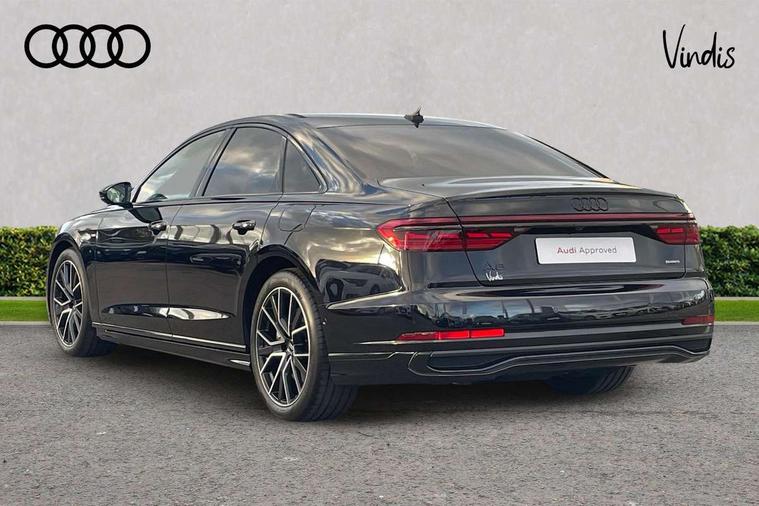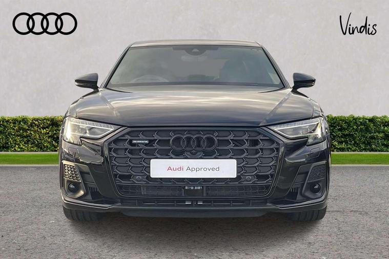 'Lights On' Reminder warning buzzer, Adaptive cruise control with cruise assist, emergency assist, efficiency assist, swerve assist, turn assist and speed limiter, Audi connect safety and service (e-call), Audi drive select, Audi parking system plus with front and rear sensors, Audi virtual cockpit, Bluetooth interface, Camera based traffic sign recognition, Convenience key, Electro - mechanical power assisted steering, Head up Display, MMI navigation plus with MMI touch + Twin touch screens with haptic feedback, Operating buttons in black, glass look with haptic feedback including extended aluminium look, Power door closure, Power operated tailgate, Rear view camera, Remote fuel filler release, Service interval indicator, Smartphone interface with app store includes wireless Apple carplay, Android auto and Amazon alexa integration, 3 pin 10 amp domestic charging cable, 65 litre fuel tank, 7.4 kW onboard charger, 8 speed transmission with hill hold assist, Adaptive air suspension, Hybrid drive system PHEV, Industrial connector CEE 32A, 230V, long and straight for the e-tron charging system, Mode 3 charging cable for public charging (AC), Quattro all wheel drive with self locking centre differential, Type 2 socket for AC charging, Audi music interface, Audi sound system, DAB digital radio module, MMI radio plus, USB connection, Acoustic double glazing, All-weather, manoeuvring, position, static cornering, turning and motorway lights with automatic dynamic headlight range control, Audi space frame, Auto dimming rear view mirror, Body colour bumpers, Dipped beam, Electric front windows, Electric rear windows with isolation switch, Electric sunblinds for rear window and rear door windows, Electrically adjustable heated folding + automatically dimming exterior mirrors with memory function and integrated LED indicators, Front wash/wipe with interval delay, HD matrix LED headlights with dynamic light presentation and dynamic indicators, Headlight cleaning system, Heat insulating darkened glass in side and rear windows, Heat insulating glass windscreen, Heated rear windscreen, Heated windscreen washer jets, High beam assist, LED brake lights, LED daytime running lights, LED third brake light, OLED rear lights with changeable rear light signature, Privacy glass, Rear boot, Rear side wing doors, Welcome/leaving lighting, 12V socket, 3 seat rear bench with centre armrest in 2nd row, 4 way electric lumbar support for driver and front passenger, 4 zone control automatic air conditioning, Audi phone box light, Auxiliary climate control with remote precondition, Black cloth headlining, Centre console with cupholders, Comfort centre armrest, Door pockets with bottle holder, Driver and front passenger side sunvisors with illuminated vanity mirrors, Dust/pollen filters, Electric front seats with memory function, Front floor mats, Glove compartment cooling, Heated front seats, Height/reach electric steering column with easy exit function, Illuminated door sill trims with aluminium inlays and S diamond emblem, Isofix child seat mounting points on outer rear seats, Leather gearknob, Passenger footwell storage net, Reading lights, Rear floor mats, Rear headrests, Roof mounted sunglasses holder, Single front passenger seat, Stainless steel pedals and footrest, Upper and lower dashboard, carpet in black, Valcona leather upholstery with front sports seats in diamond quilted with S embossed logo, Black exterior styling pack - A8, Chrome exterior pack - A8, Extended LED Interior multi coloured light pack - A8, 3 point seatbelts on all rear seats, ABS/EBD, Acoustic vehicle alerting system, Active front headrest system, ASR traction control, Audi pre sense basic, Audi pre sense front, Black brake calipers, Driver/Front Passenger airbags, EDL traction control, Electromechanical parking brake, ESP, Extended pedestrian protection measures, Front and rear disc brakes, Front and rear side airbags with head airbag system, Front passenger airbag deactivation, Rear child proof door locks, Seatbelt reminder + electric contact in buckle + advanced safety equipment, Tyre pressure loss indicator, Warning triangle and first aid kit, Anti theft alarm tow away protection, Anti-theft wheel bolts and wheel loosening detection, Remote central locking, Carbon vector upper inlays, Dark matt brushed aluminium lower inlays, Tyre repair kit,