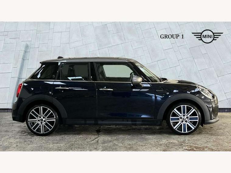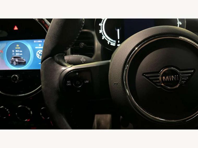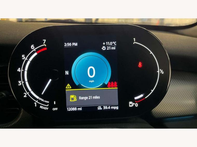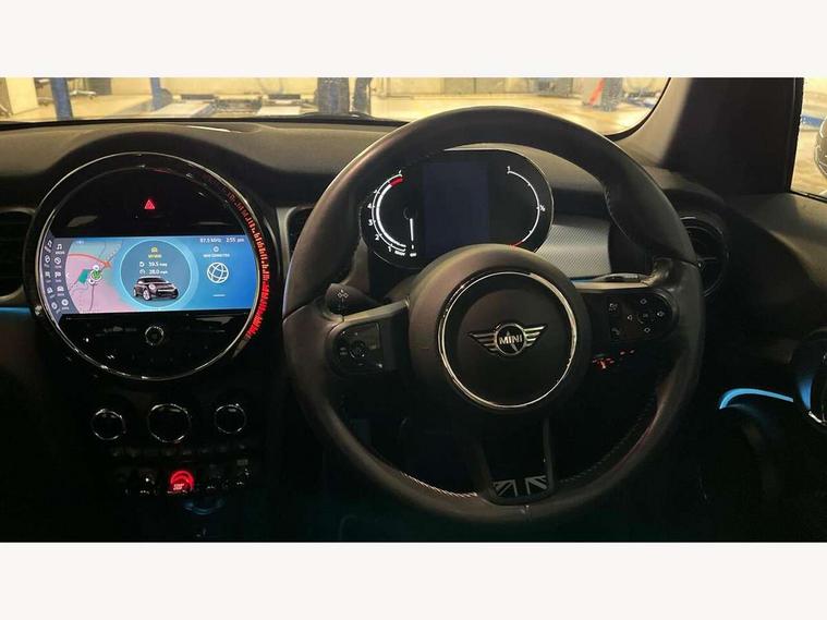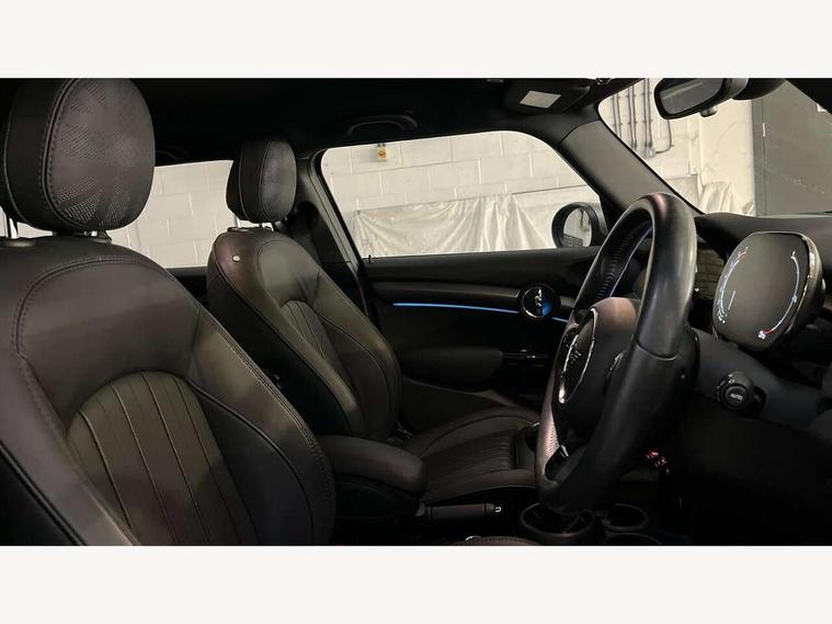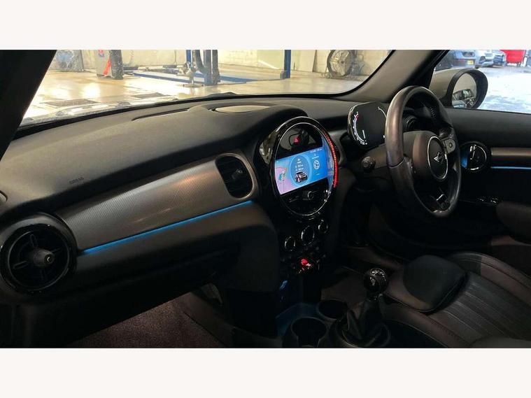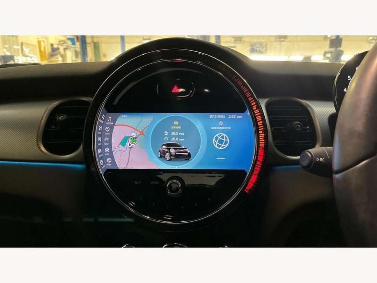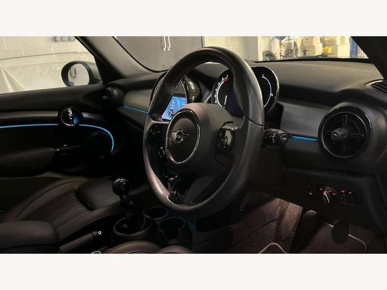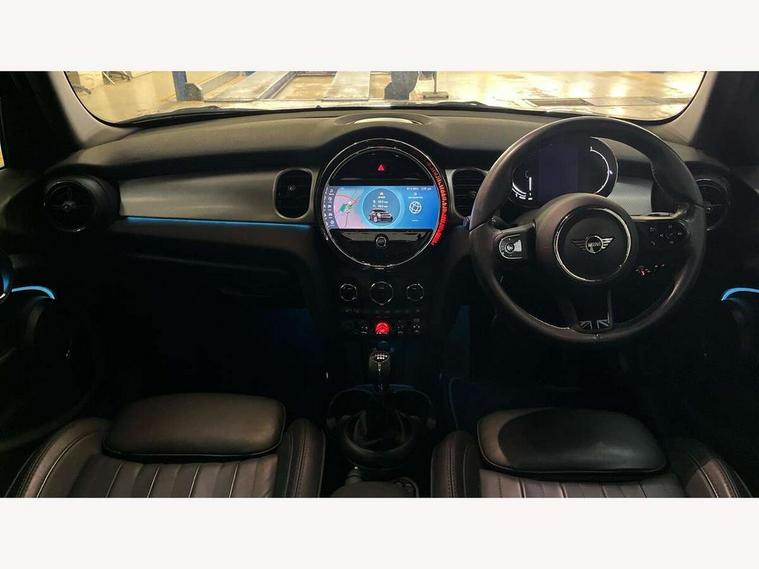 Automatic start/stop function with brake energy recuperation, Compatible mobile phone bluetooth with audio streaming, Cruise control with brake assist, Electro-mechanical speed dependant steering assistance, Flexible car sharing preparation, Instrument cluster, MINI Driving Modes - centre toggle switch to control driving setting (sport, mid and green), Mini E-call, MINI TeleServices, On board computer, Rear park distance control, Service interval indicator, 6 Speed manual transmission including gear change indicator display, Double Vanos system, Fully variable valve control, High precision injection, Performance Control, 6 speakers in front door trims and underneath front seats, 8.8" touchscreen with LED ring, FM tuner and DAB digital radio, Automatic headlight activation switch, Body colour fuel filler cap, Chrome line exterior - radiator grille bars, tailgate handle, lower front grille grating and rear central fog-light, Dynamic brake lights, Electric front+rear windows, Heated rear window, Heated windscreen washer jets, LED headlight with closed ring and daytime driving lights, Metal door sill strips with MINI imprint, Model logo Cooper on right of tailgate, Rain sensor window wipers, Rear fog lights, Rear LED lights with union jack design, Rear window wiper, Side scuttle panel with integrated indicator, Sun/heat protection glass, White indicator lenses, 12V Accessory socket in centre console, 4 lashing eyes in luggage compartment, 60/40 split folding rear seat, Anthracite headliner including grab handles and clothes hooks, Carbon black colour line - Knee roll and door armrest, Chrome interior highlights, Chrome line interior - air vents, gear lever base, door handles and speakers in doors, Cupholders, Front and rear head restraints, Front and rear isofix with front passenger airbag deactivation, Glove compartment, Height and length steering column adjustment, Interior lighting with 12 different colours across the dashboard, underneath door bezel with illuminated laser-engraved design on central display, Leatherette gearshift lever and handbrake gaiters, LED reading lights, vanity mirror lights, front foot well light and spotlight on front seats, Manual air conditioning, Mechanical seat adjustment - forward/back & backrest for front seats and driver seat height adjust, MINI yours badge on exterior pillar, Multifunction steering wheel, Storage compartments in doors, Sunvisors with vanity mirrors, Velour floor mats, Walknappa leather steering wheel with grey seam and MINI Yours badge on Piano Black lower steering wheel spoke, 3 point seatbelts on all five seats, 6 Airbags - front, side, head and seat belt tensioners, Anti-lock braking system (ABS), DSC - Dynamic Stability Control, Front and rear disc brakes, Hill start assist, Single tone fanfare horn, Tyre pressure monitoring system, Alarm system with tilt sensor, monitoring doors, bonnet interior and tailgate, Electronic vehicle immobiliser, Start/stop toggle with keyless go, Tool kit,
