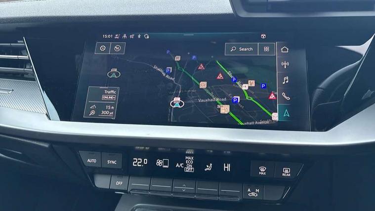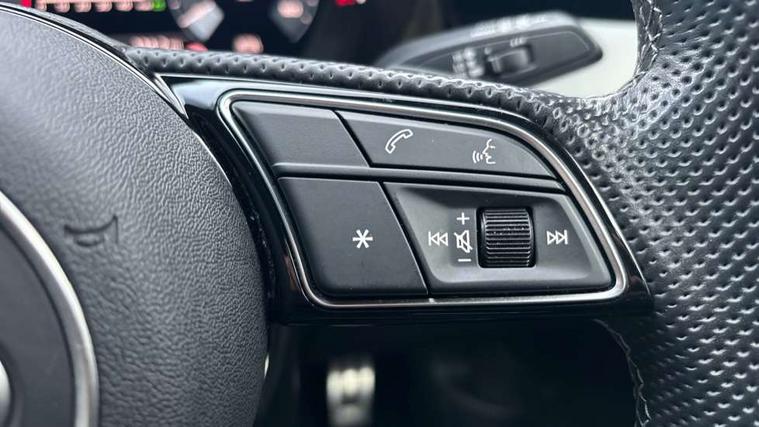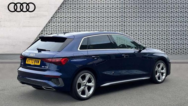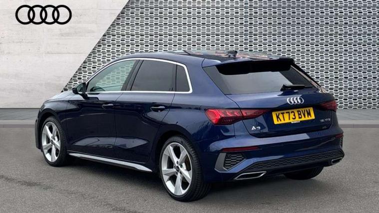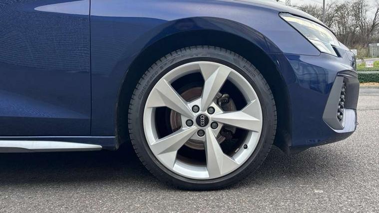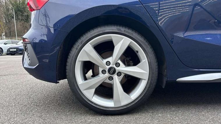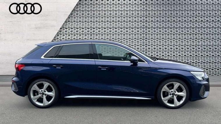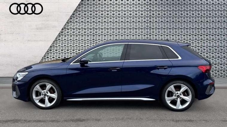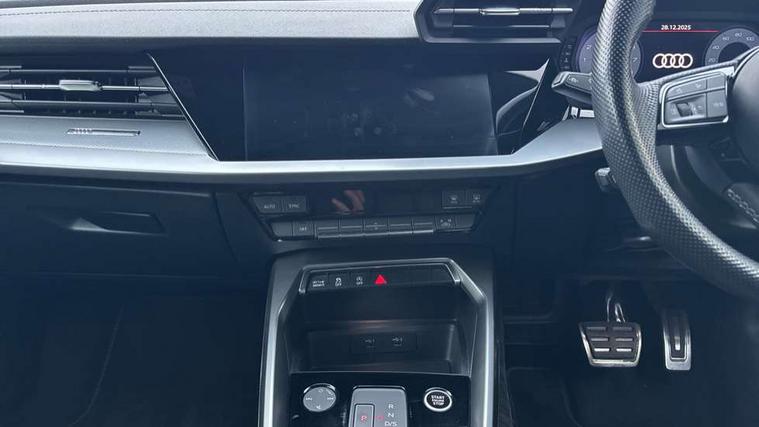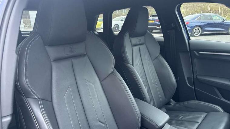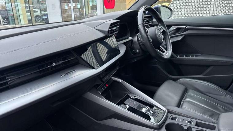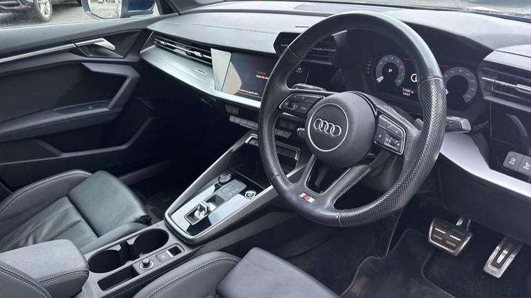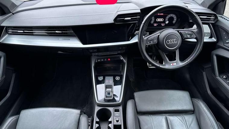 Audi drive select (Auto, Comfort, Dynamic, Efficiency and Individual), Audi smartphone interface, Audi Virtual Cockpit - 10.25" digital and colour instrument cluster, Automatic start/stop system with recuperation, Bluetooth interface, Camera based traffic sign recognition, Collision avoidance assistant, e-Call (emergency call), Electromechanical power speed sensitive steering, Lane departure warning system, MMI Navigation Plus with high resolution 10.1" colour touch screen display, Service indicator, Trip computer, Voice control system with natural language interaction, Sports suspension, 2xUSB-C connection with data and charging functions, 6 passive loudspeakers, DAB Digital radio, 3rd brake light, Acoustic glass windscreen, Aluminium window trim, Auto dimming frameless rear view mirror, Body colour exterior mirrors, Electrically adjustable/heated/folding/dimming door mirrors with kerb view includes integrated LED indications + kerb view function for passenger side, Front electric windows, Illuminated door sills with aluminium inserts at the front with S logo, LED daytime running lights, LED headlights with LED rear lights and dynamic rear indicators, Light and rain sensors, Privacy glass - dark tinted rear window, rear door and side windows, Rear electric windows, Rear side air outlets in grained matt black, Rear side wing doors, Rear wiper, S line bumpers, S roof spoiler, 12V socket and storage compartment in front centre console, 3 seat bench in 2nd row, 3 spoke leather multifunction steering wheel with paddle shift, 4 way electrically adjustable lumbar support for driver and front passenger, 60/40 split folding rear seat bench, Black cloth headlining, Dual zone electronic climate control, Front and rear centre armrest in artificial leather, Front and rear headrests, Front/rear floor mats, Height and reach adjustable steering wheel, Interior lighting - glove compartment light and right hand side, Luggage compartment floor covering, Manual boot compartment lid, Manually adjustable front seats, Seat side bolsters, Single front passenger seat, Stainless steel pedals and front footrest in black, Twin leather upholstery with front sports seats S embossed logo, Aluminium interior elements pack - A3 Sportback, LED interior lighting pack - A3 Sportback, S line styling pack - A3 Sportback, 3x3 point rear seat belts, Driver and front passenger airbag with passenger airbag deactivation, Electronic Stabilisation Control (ESC) including ABS, ASR and EDL, First aid kit with warning triangle and 2 safety vests, Front side airbags with head airbags and interaction airbag, Pre-sense front with pedestrian and cyclist detection, Seatbelt monitoring, Tyre pressure loss indicator, Anti theft alarm, Anti-theft wheel bolts, Electronically operated child locks, Immobiliser, Remote control central locking, Dark spectrum aluminium inlays, accent surfaces in the dashboard and centre console in platinum grey silk effect paint finish,