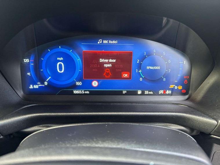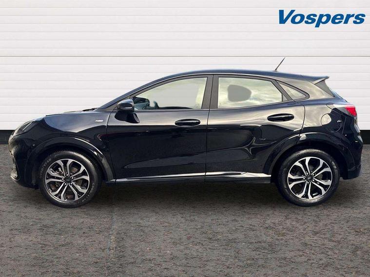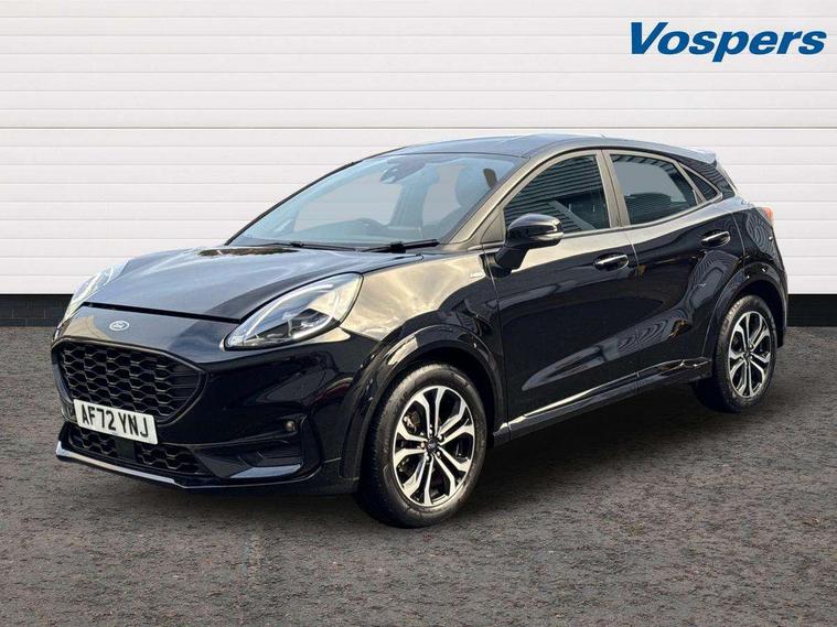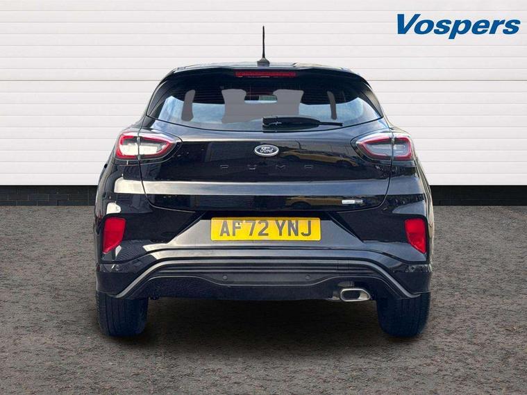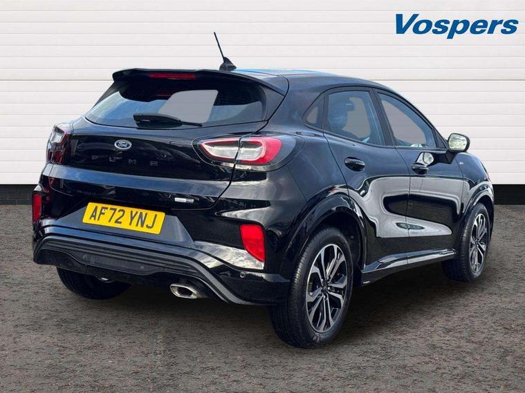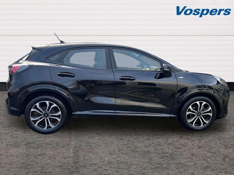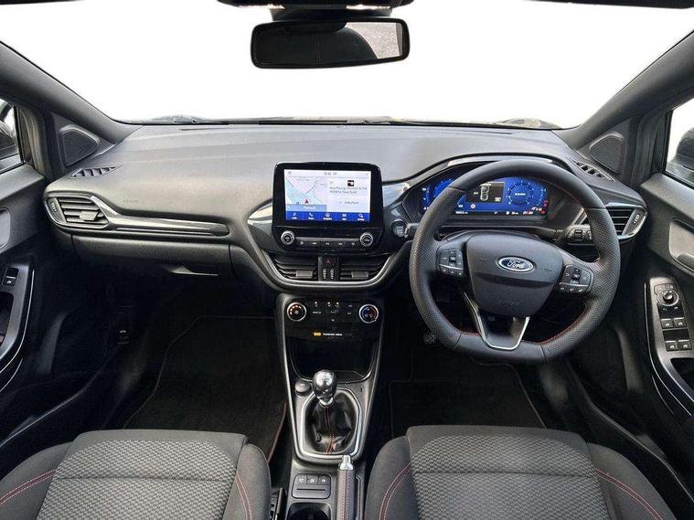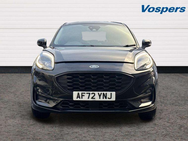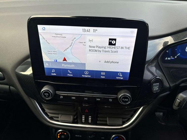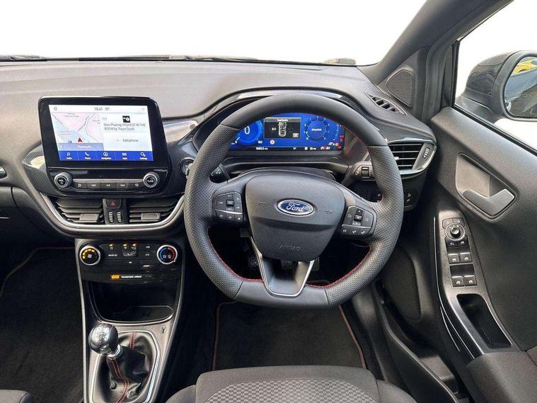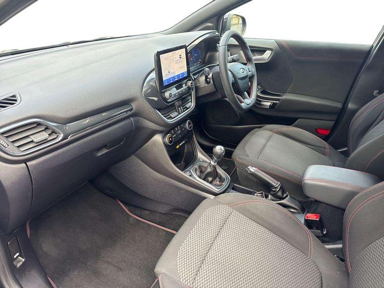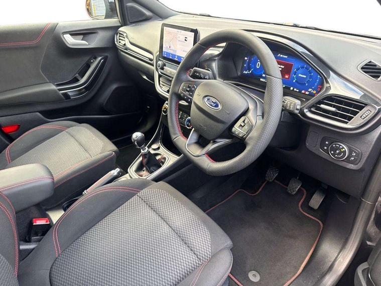 Driver impairment monitor, Emergency call service, Ford easy fuel, Full digital 12.3" instrument cluster, Lane keeping aid with lane departure warning, Power assist steering, Power start button, Rear parking sensor, Selectable drive modes(Normal, Eco, Sport, Slippery and Trail), Speed sign recognition, Sport suspension, Automatic headlights with auto high beam, Automatic rain sensing wipers, LED rear lamps, Power foldable heated door mirrors with puddle lamps, Projector headlamps with LED day time running lights and front fog lamps, Quickclear heated windscreen, Rear side wing doors, Rear wiper, ST-Line body styling kit with unique grille and large body colour rear spoiler, Third brake light, 3 seat bench in 2nd row, Centre console with armrest and stowage, Ford megabox extended bootspace, Front and rear head restraints, Front floor mats, Manual 2 way passenger seat adjustment, Manual 4 way driver seat adjust with lumbar adjustment, Single front passenger seat, ST- Line cloth trim with red stitching, ST-Line flat bottomed sensico leather steering wheel with leather handbrake and aluminium gear knob, Ford SYNC 3 navigation pack - Puma, 3 rear seatbelts, Child safety lock, Electronic stability control (ESC) and hill start assist, Pedestrian/cyclist detection & post-collision braking, Pre collision assist system, Tyre pressure monitoring system (TPMS), Thatcham alarm,