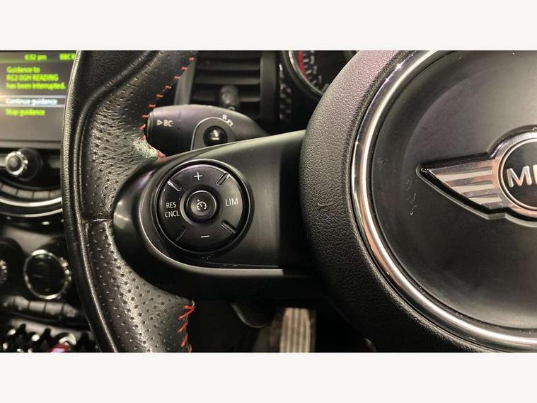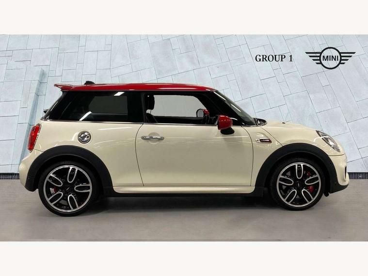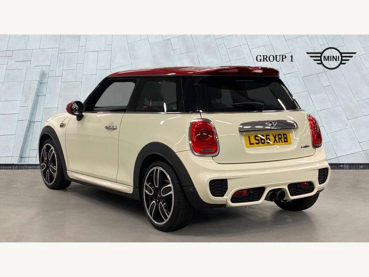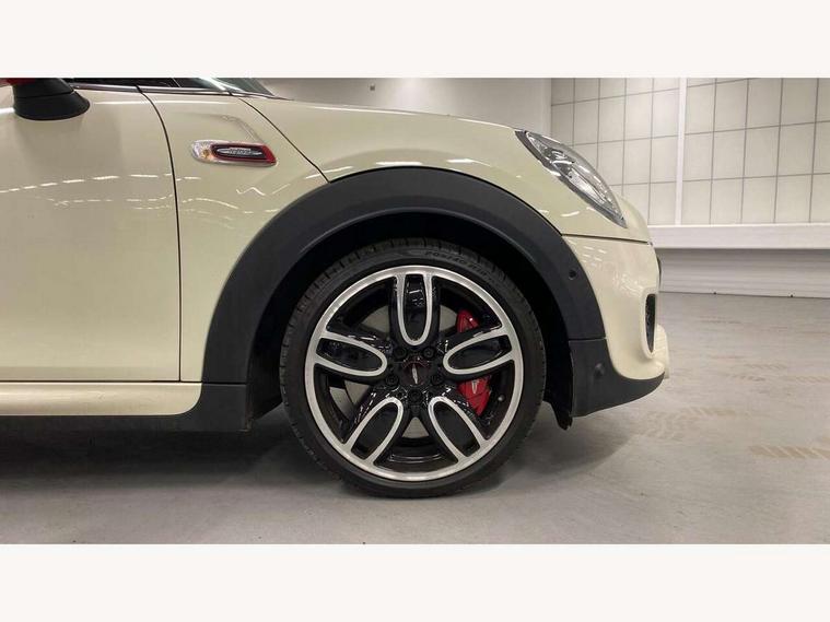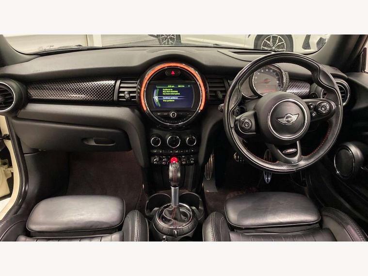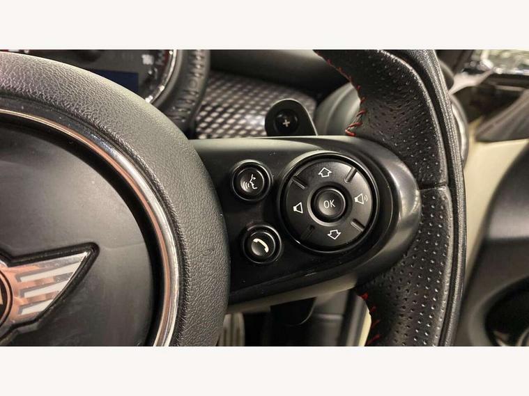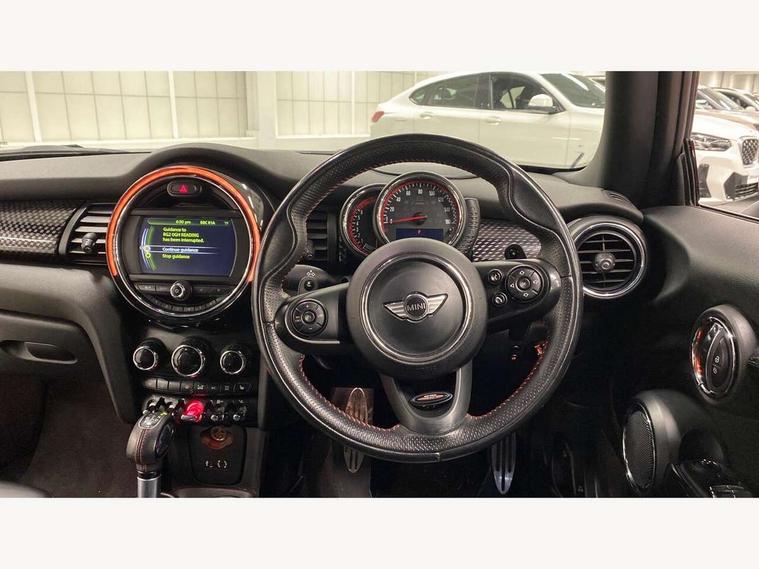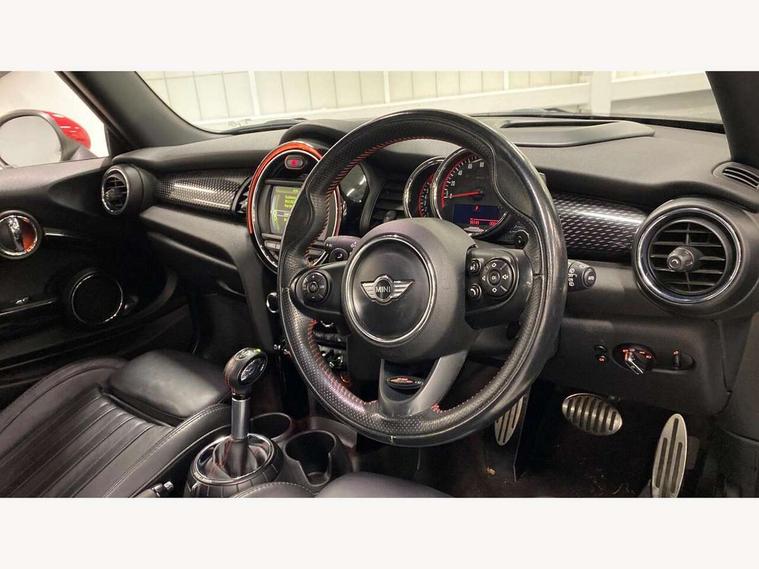 Acoustic seat-belt warning, Brake fluid level warning light, Brake pad wear indicator warning light, DTC - Dynamic traction control, Exterior temperature gauge, MINI Driving Modes - centre toggle switch to control driving setting (sport, mid and green), Oil level indicator, On board computer, Push button starter, Service interval indicator, Servotronic PAS, Electronic differential lock, Performance Control, Auxiliary input socket, DAB digital radio module, 2 speed wipers+intermittent wipe, Anti dazzle mirror, Anti trapping/one touch open close front windows, Body colour scoop integrated into engine- compartment lid, Body coloured bumpers, Chili red grille bar, Chrome bezels around rear lights and headlights, Chrome door handles, Chrome plated fuel cap, Chrome plated trim on bottom edge of window, Chrome strip on lower grille, Electric front windows, Electrically adjustable door mirrors, Extended wheel arches, Follow me home headlights, Green tinted heat insulating glass, Heated door mirrors/heated windscreen washers, Heated rear window with auto timer, High gloss black tailgate, Honeycomb radiator grille, John Cooper Works roof spoiler, Metal look door sill finishers, Rear wiper, Side scuttles, Twin chromed exhaust pipes, White indicator lights, 2 rear head restraints, 4 boot load lashing points, 6 way manually adjustable passenger seat, 6-way manually adjustable driver's seat, Active carbon filter, Air recirculation system, Anthracite headlining, Auxiliary socket in centre console storage compartment, Centre console storage, Driver's seat height adjuster, Driver/passenger sunvisors, Easy entry seats, Front and rear cupholders, Front head restraints, Front interior light, Front passenger grab handle, Front seat backrest storage nets, Front sports seats, Gear/selector and handbrake in artificial leather, Internal chrome door handles, Isofix child seat preparation, Luggage compartment lighting, Multifunction steering wheel, Passenger seat height adjuster, Reach + rake adjustable steering column, Rear grab handles, Rear storage trays, Split folding rear seats, Storage compartments in doors, Toolkit in luggage compartment, Vanity mirrors, 3 point seatbelts, ABS/EBD, ASC+T, Brake calipers in red, Cornering brake control (CBC), Crash Sensor - activates hazard/interior lighting + unlocks doors, Driver and passenger airbags, Driver/front passenger side airbags, DSC - Dynamic Stability Control, Fuel cut off safety device, Head airbags, Hill start assist, Passenger airbag deactivation system, Seatbelt pretensioners, Tyre pressure warning, Ventilated front disc brakes, Drive away door locking, Locking wheel bolts, Remote central locking/doors+fuel cap+tailgate, Second remote key, Thatcham category 1 alarm + immobiliser,