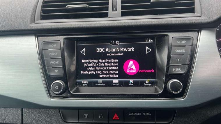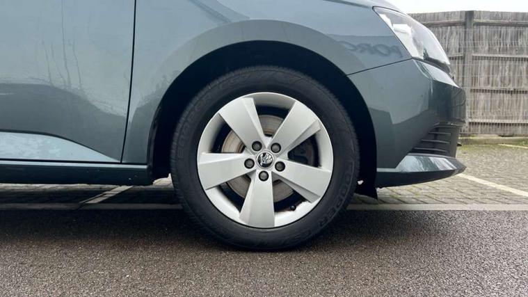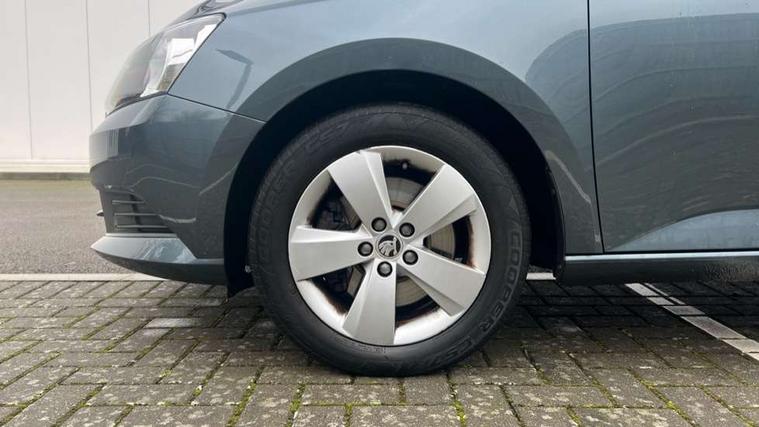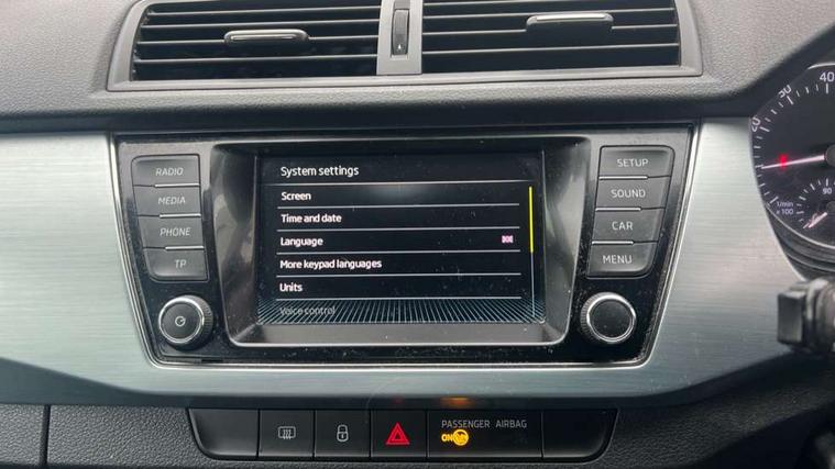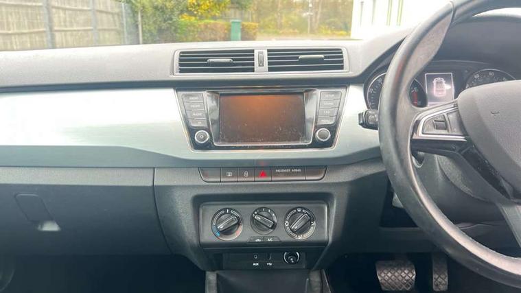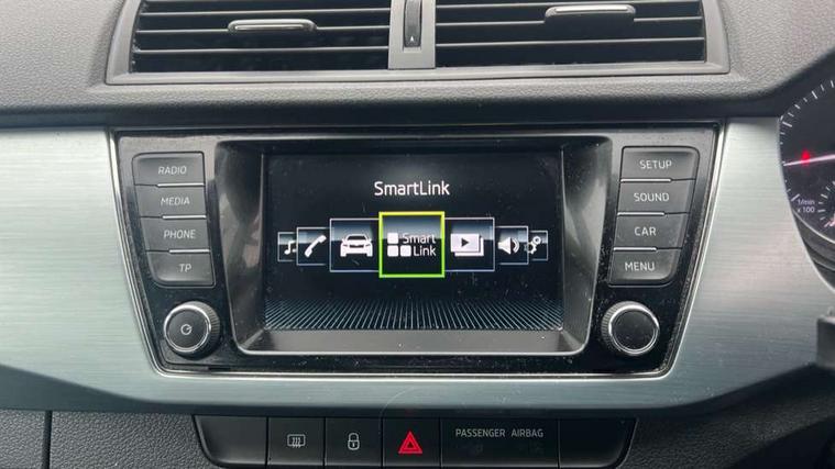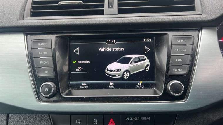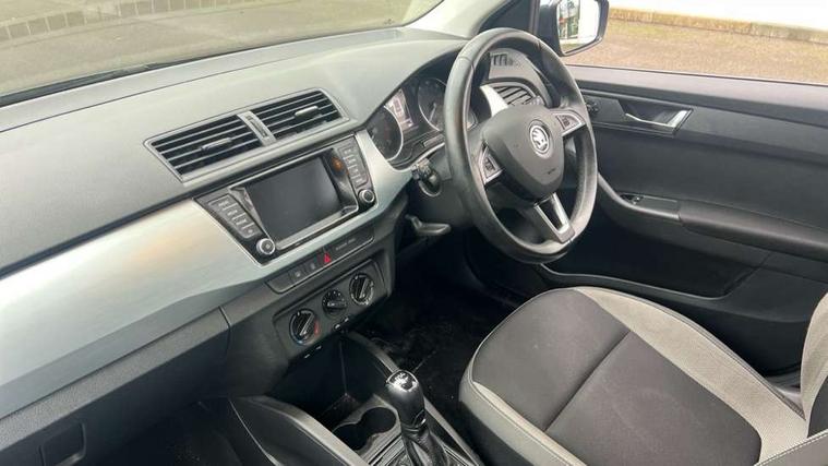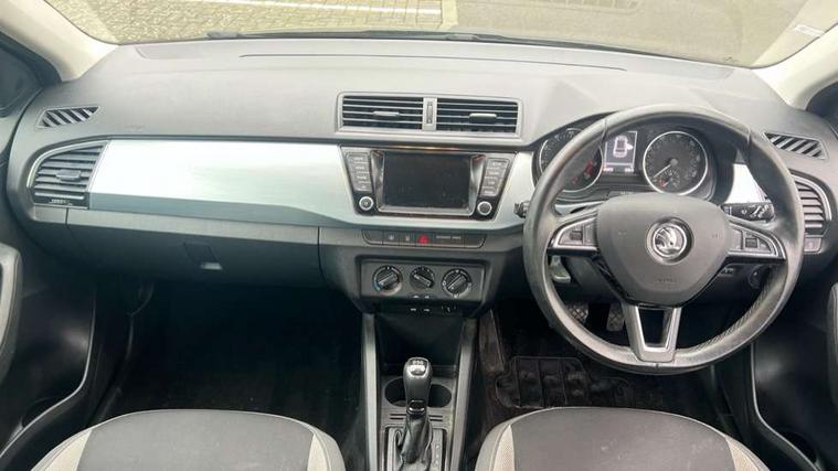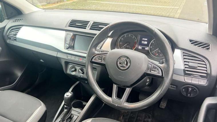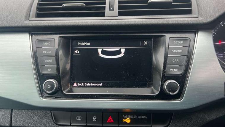 Bluetooth system, Exterior temperature gauge, Front assistant collision mitigation, Multi function trip computer, PAS, Service interval indicator, SmartLink, 6.5" touchscreen, Auxiliary socket for external MP3 player, Bolero Radio, DAB Digital radio, SD card slot, USB interface, Body colour bumpers, Body colour door handles, Chrome grille surround, Electric front windows, Electrically adjustable and heated door mirrors, Heated rear window, Height adjustable headlamps, Intermittent rear wash/wipe, Tinted rear windows, Tinted windscreen, 1.5L bottle holder in front door panels, 2 height adjustable rear headrests, 60/40 split folding rear seat, Boot stowage box, Cargo area storage tray, Driver + passenger vanity mirrors, Folding grab handles, Front reading lights, Height adjustable driver's seat, Height adjustable front headrests, Height adjustable passenger seat, Height/reach adjust steering wheel, Interior light with delay, Leather gearshift, Leather handbrake, Lower glovebox cover, Luggage load hooks, Parcel shelf, Pollen filter, Rear courtesy light, Rear storage trays, Ticket holder, Two rear outer seat isofix location points, Umbrella under front passenger seat, Arkamys surround sound pack - Fabia, Chrome Pack - Fabia, 3x3 point rear seatbelts, ABS, Curtain airbags, Driver and passenger airbags, Driver and passenger side airbags, EDS, ESC with ASR, Front seatbelt pretensioners, Hill hold control, Hydraulic Brake Assist (HBA), Motor Slip Regulation (MSR) - Engine Drag Torque Control, Passenger airbag deactivate switch, Seatbelt warning, Tyre pressure monitor, Alarm with interior monitoring, Immobiliser, Locking wheel bolts, Remote central locking,