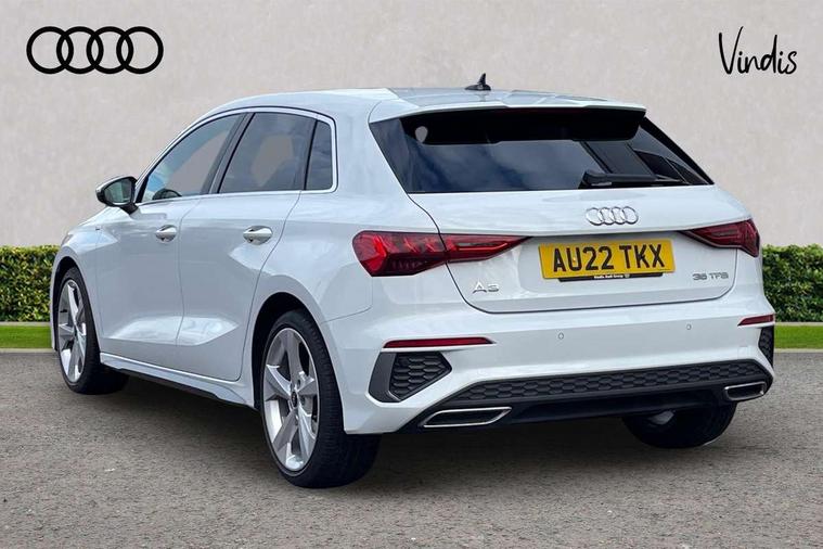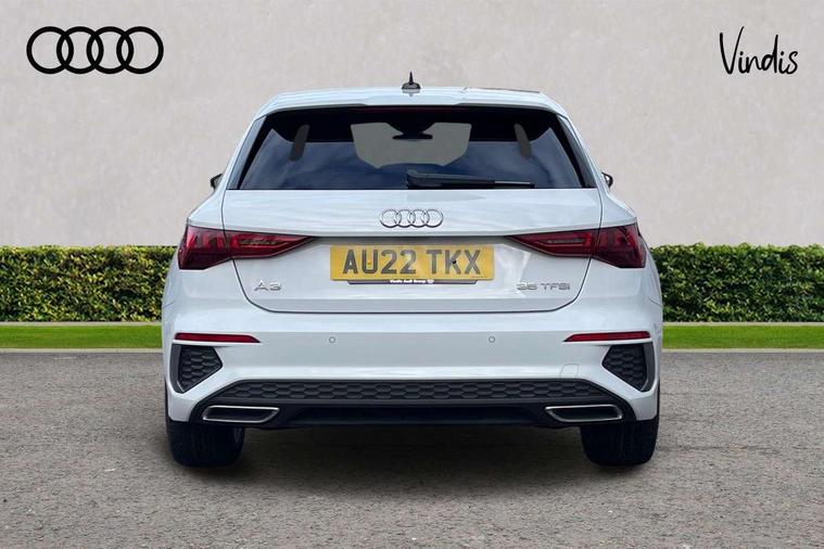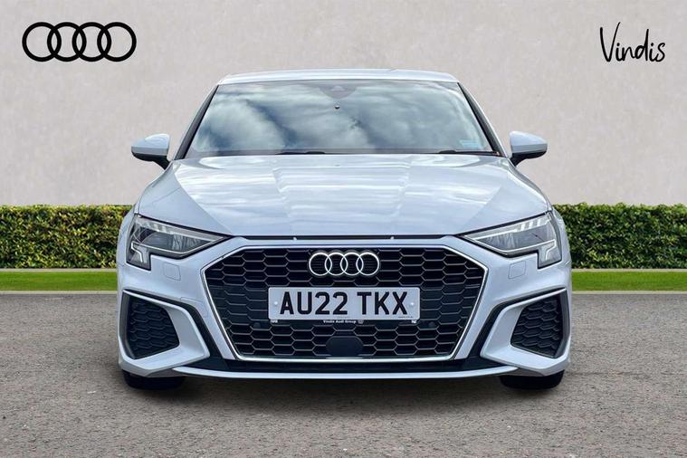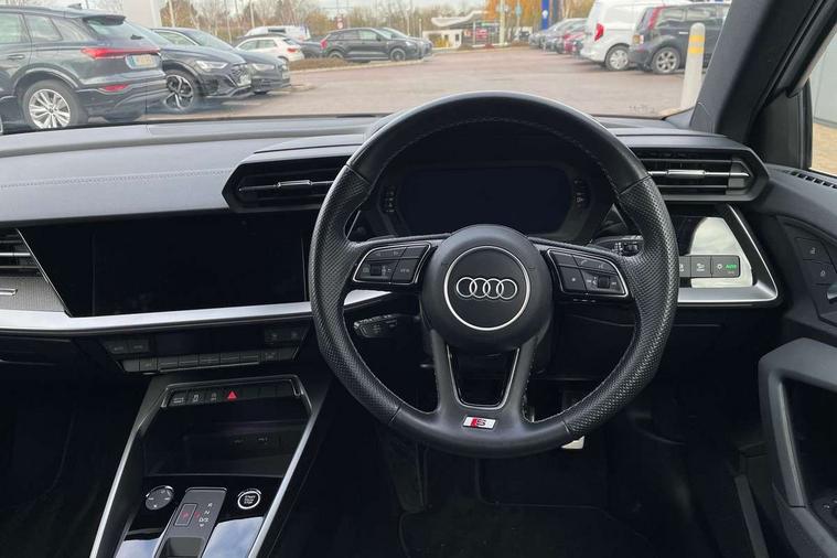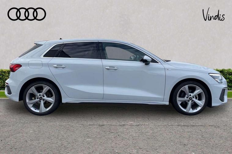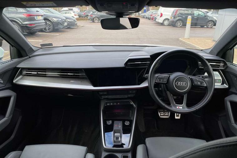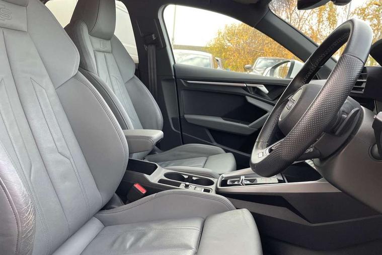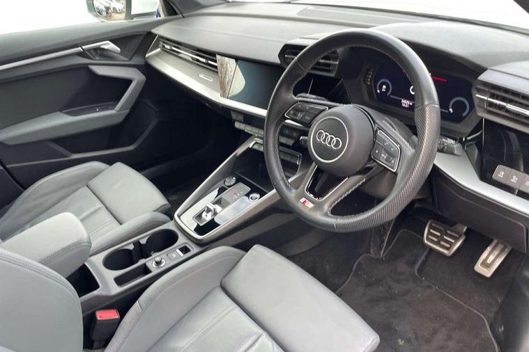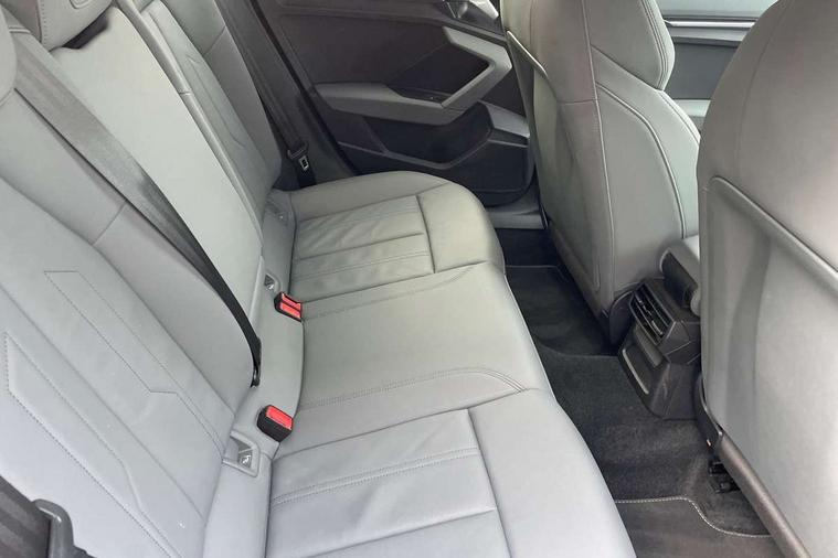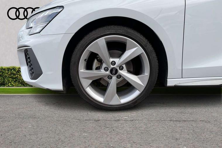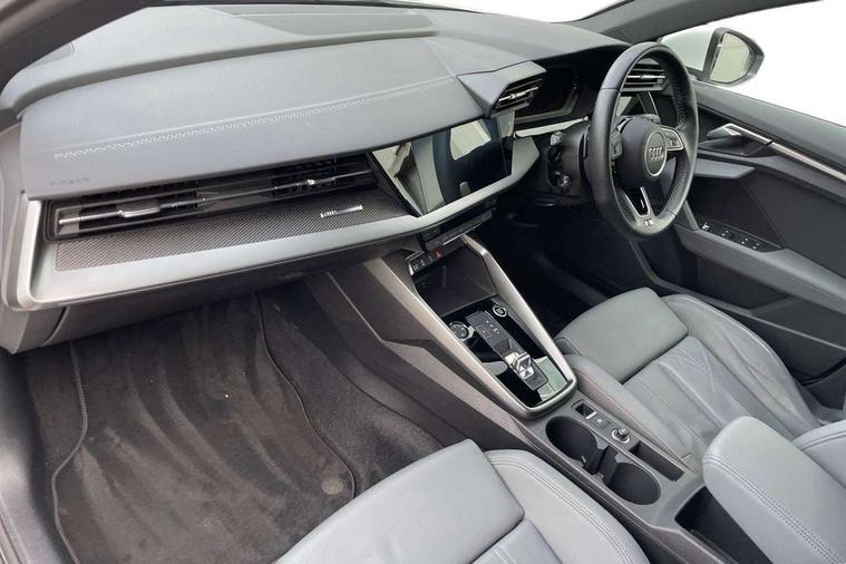 Audi connect emergency call and service, Audi drive select (Auto, Comfort, Dynamic, Efficiency and Individual), Audi smartphone interface, Audi Virtual Cockpit - 10.25" digital and colour instrument cluster, Automatic start/stop system with recuperation, Bluetooth interface, Collision avoidance assistant, Electromechanical power speed sensitive steering, Lane departure warning system, MMI Navigation Plus with high resolution 10.1" colour touch screen display, Service indicator, Trip computer, Voice control system with natural language interaction, 2xUSB-C connection with data and charging functions, 6 passive loudspeakers, DAB Digital radio, 3rd brake light, Acoustic glass windscreen, Aluminium window trim, Auto dimming frameless rear view mirror, Electrically adjustable/heated/folding/auto dimming door mirrors with integrated LED indications + kerb view function for passenger side, Front electric windows, Illuminated aluminium inserts front door sills with S logo, LED daytime running lights, LED headlights with LED rear lights and dynamic rear indicators, Light and rain sensors, Privacy glass - dark tinted rear window, rear door and side windows, Rear electric windows, Rear side air outlets in grained matt black, Rear side wing doors, Rear wiper, S line bumpers, S roof spoiler, 12V socket and storage compartment in front centre console, 3 seat bench in 2nd row, 40/20/40 split folding rear seat bench with cupholder, Black cloth headlining, Dual zone electronic climate control, Front and rear centre armrest in leather, Front and rear headrests, Front/rear floor mats, Height and reach adjustable steering wheel, Illuminated vanity mirror, Interior lighting - glove compartment light and right hand side, Luggage compartment floor covering, Manual boot compartment lid, Manually adjustable front seats, Seat side bolsters, Single front passenger seat, Stainless steel pedals and front footrest in black, Twin leather upholstery with front sports seats S embossed logo, Aluminium interior elements pack - A3 Sportback, S line styling pack - A3 Sportback, 3x3 point rear seat belts, Driver and front passenger airbag with passenger airbag deactivation, Electronic Stabilisation Control (ESC) including ABS, ASR and EDL, First aid kit with warning triangle and 2 safety vests, Front side airbags with head airbags and interaction airbag, Pre-sense front with pedestrian and cyclist detection, Seatbelt monitoring, Tyre pressure loss indicator, Anti theft alarm, Anti-theft wheel bolts, Immobiliser, Manual child locks, Remote control central locking, Accent surfaces in the dashboard and centre console in platinum grey silk effect paint finish, Dark spectrum aluminium inlays,