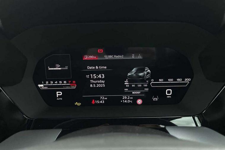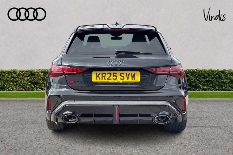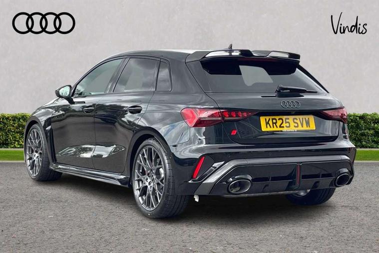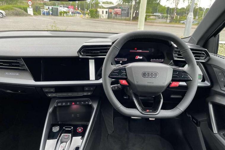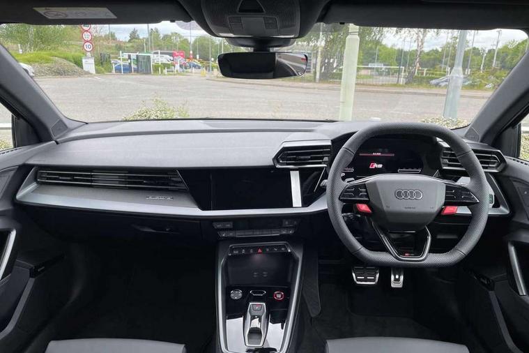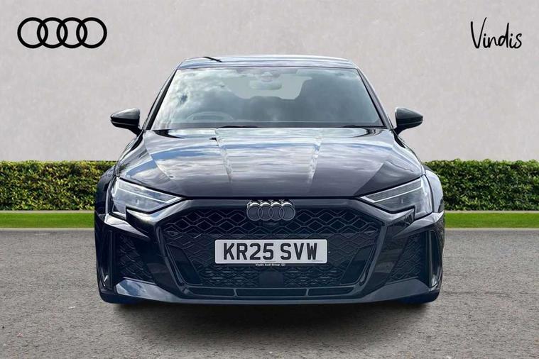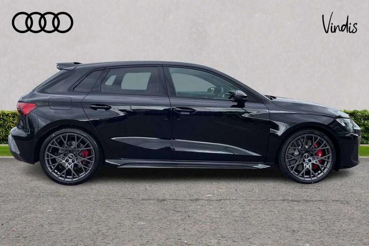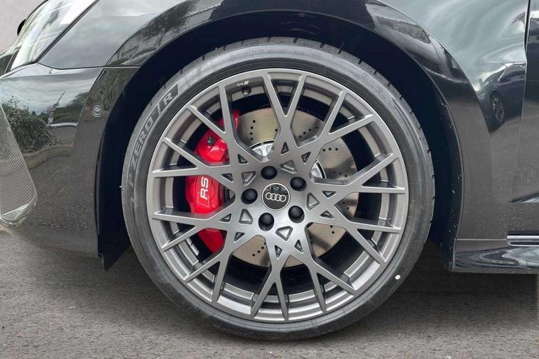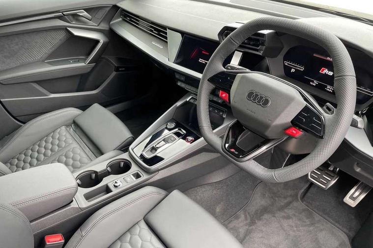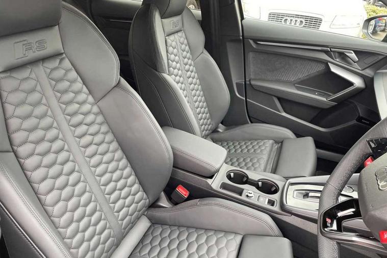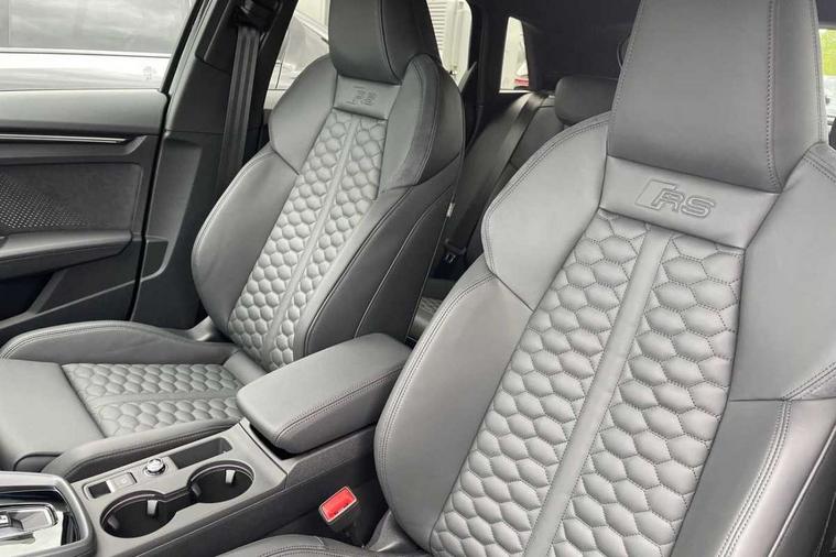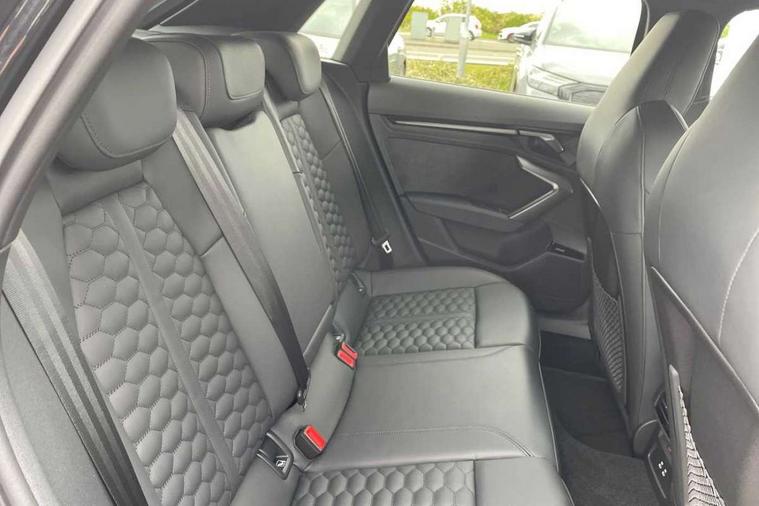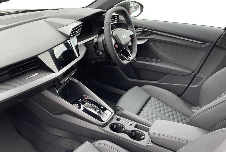 Adjustable speed limiter, Audi drive select comfort, auto, dynamic and efficiency, Audi smartphone interface with app store includes wireless Apple carplay, Android auto and Amazon alexa integration, Audi virtual cockpit plus with RS specific design and 12.3" display with additional graphic display options, Automatic start/stop system with recuperation, Bluetooth interface, Camera based traffic sign recognition, Collision avoidance assistant, Distraction and Fatigue warning, e-Call (emergency call), Lane departure warning system, MMI Navigation Plus with high resolution 10.1" colour touch screen display, Park Assist with parking system Plus, Progressive steering, RS specific driving modes - RS Individual, RS Performance and RS Torque rear, Voice control system with natural language interaction, Quattro permanent four wheel drive, Audi Phonebox light with wireless charging, DAB Digital radio, USB ports with charging function in the rear, All weather light, Audi beam LED projection of RS logo on ground as you exit, Audi darkened matrix LED headlights with dynamic light sequencing and dynamic indicator, Auto dimming frameless rear view mirror, Automatic dynamic range control, Carbon door mirror housings, Carbon fibre engine cover, Dipped beam, main beam, position light and turning light, Dynamic RS specific light sequencing of the coming home and leaving home function, Electrically adjustable/heated/folding/dimming door mirrors with kerb view includes integrated LED indications + kerb view function for passenger side, Exterior model badging, Front electric windows, Headlight cleaning system, Heat insulating glass windscreen, Intersection light, LED 3rd brake light, LED brake lights, LED daytime running x3, LED rear lights with dynamic light sequencing and dynamic indicator, LED rear number plate lights, LED reverse light, LED tail lights, Light and rain sensors, Manoeuvring light, Motorway light, Privacy glass - dark tinted rear window, rear door and side windows, Rear electric windows, Rear side wing doors, Rear wiper, Roof edge spoiler in carbon, RS dual branch exhaust system with two chrome plated oval tailpipe trims, Static Cornering lights, Visually upgraded RS specific daytime running light choice of 4 digital signature in chequered flag design within the headlight, 12V socket and storage compartment in front centre console, 3 seat bench in 2nd row, 3 Spoke flat top and bottomed black leather multi function steering and gear shift paddles, 3-zone deluxe automatic air conditioning, 40/20/40 split folding rear seat bench, Black cloth headlining, Black front and rear floor mats, Front and rear headrests, Front centre armrest, Front door sill trims with RS 3 logo, Front sports seats RS embossed logo, Heated front seats, Height and reach adjustable steering wheel, Manual boot compartment lid, Manually adjustable front seats, Rear centre armrest with cupholder, Seat side bolsters, Single front passenger seat, Stainless steel pedals and front footrest in black, Vanadium look - Interior door handles, Door trim, power latching, Air vents, window controls, mirror adjust, rear door lock, Selector lever in centre console, Black Styling plus package - RS3, Extended ambient lighting package Pro with Multi-coloured contour lighting of instrument panel - RS3, RS exterior features pack in carbon and gloss black - RS3, RS sport suspension pack - RS3, Storage package - RS3 Sportback, Technology package without speed limiter - RS3, 3x3 point rear seat belts, Driver and front passenger airbag with passenger airbag deactivation, Electronic Stabilisation Control (ESC) including ABS, ASR and EDL, First aid kit with warning triangle and 2 safety vests, Hill hold assist, Pre-sense front with pedestrian and cyclist detection, RS steel brakes, Seatbelt monitoring, Tyre pressure loss indicator, Anti theft alarm, Anti-theft wheel bolts, Electronically operated child locks, Immobiliser, Remote central locking with safelock, Black dashboard, Inlays in carbon atlas structure, 19" 10 cross spoke silk matt grey alloy wheels, Tyre repair kit,