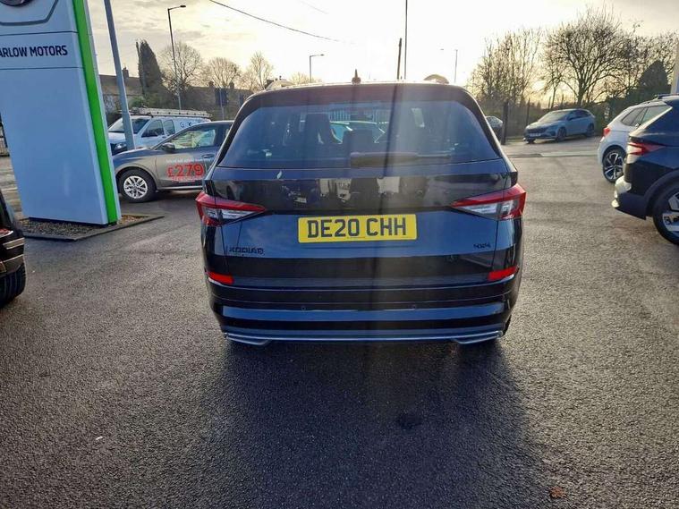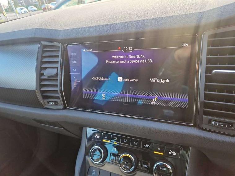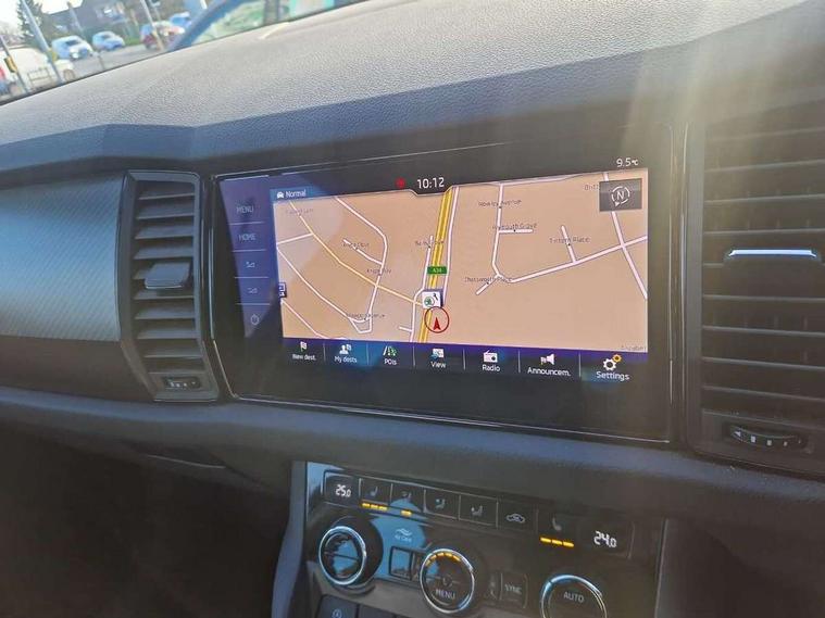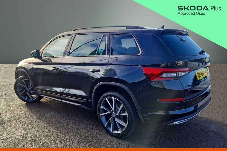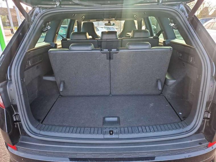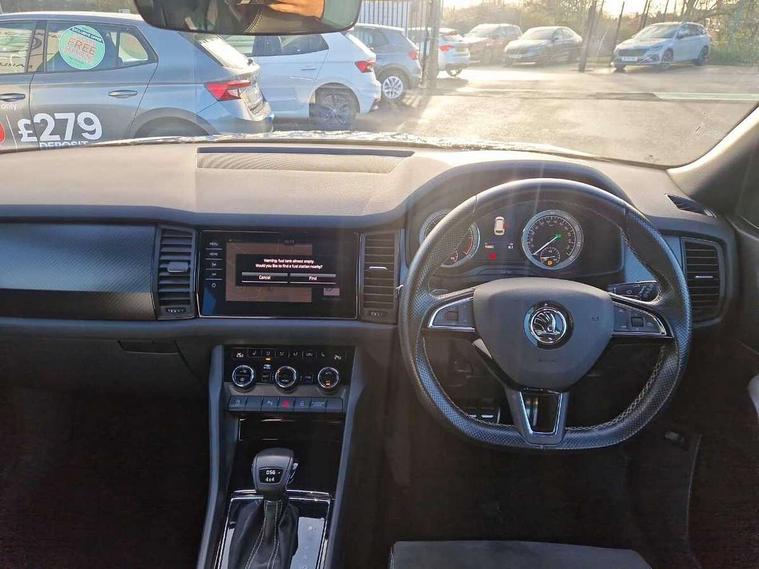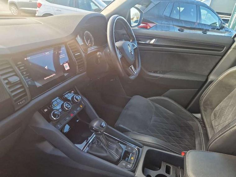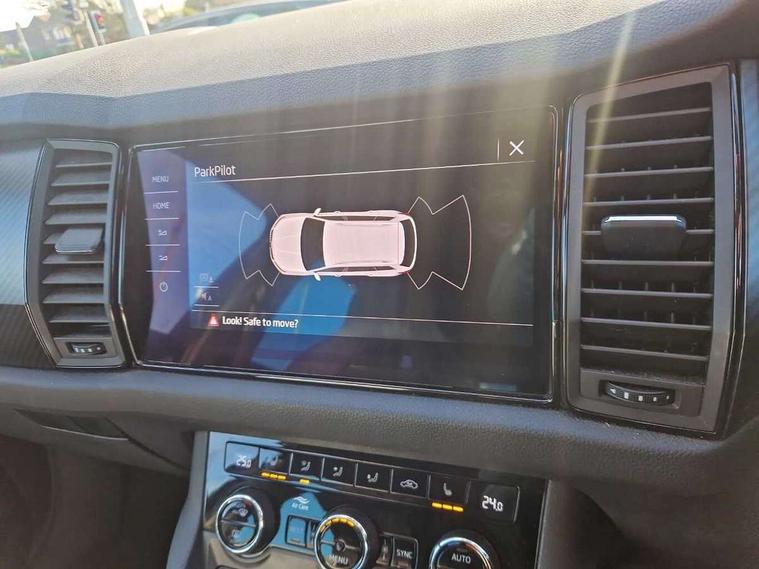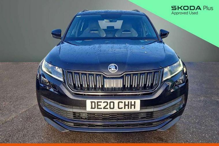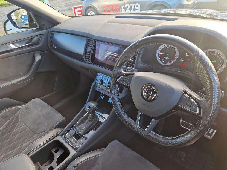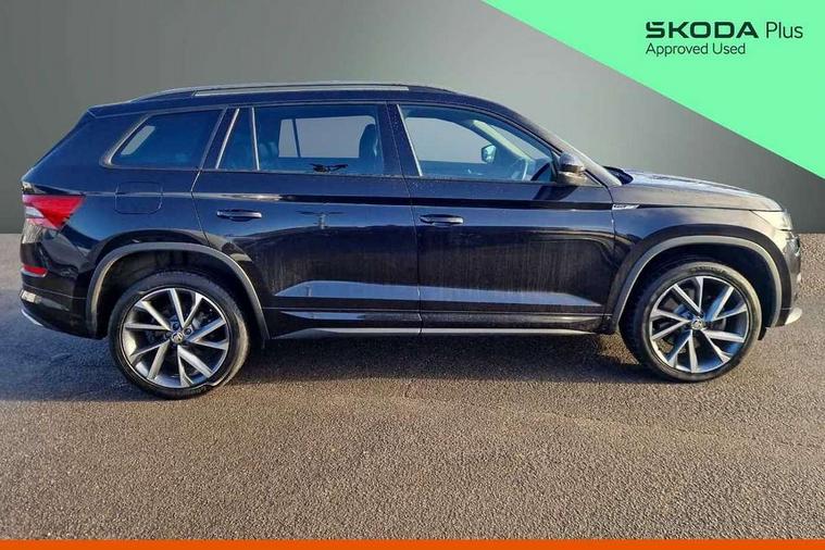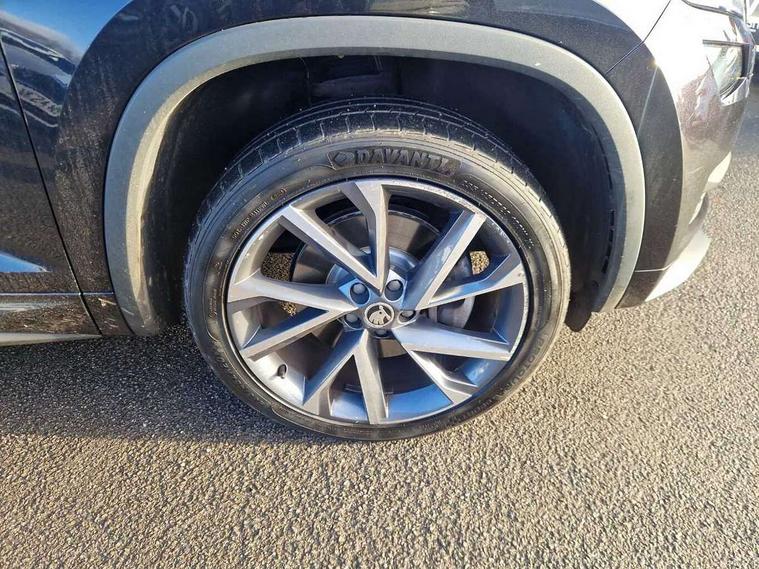 Bluetooth system, Colour multifunction trip computer, Columbus satellite navigation with 9.2" touch screen and integrated Wi-Fi + WLAN, Digital voice enhancement, ECO Stop/start function, Exterior temperature indicator, Map care, Progressive power assisted steering, SmartLink plus, Speed limiter, Sports dials, Tailgate unlocking from outside, Bolero Radio, DAB Digital radio, DVD System, USB and SD card connectivity, Aero front windscreen wipers with intermittent function, Aero rear window wiper, Auto dimming rear view mirror, Automatic activation of hazard warning lights, Black electric window control buttons, Black roof rails and door mirrors with radiator grille and window surrounds, Black wheel arch surrounds, Body colour bumpers, Body colour door handles, Chrome exhaust tailpipe, Electric front and rear windows, Electrically adjustable/heated/foldable and auto dimming door mirrors with memory function, Front door steps with SportLine logo, Full LED Headlights with adaptive front light system and LED daytime running lights, Headlight washers, Heated rear window, LED front fog lights with static cornering light function, LED rear fog light, LED third brake light in rear spoiler, Light assistant (coming home/tunnel light), Rain and light sensors, Rear diffuser, Rear spoiler, Safety reflectors on front and rear doors, Sportline badge on front fender, Sports front and rear bumpers, Sunset privacy glass, Tailgate lettering in Black, Without engine designation, 12V socket in boot, 2 rails with 2 hooks including 4 hooks for net programme, 4 foldable roof handles with rear coat hooks, 4 lashing points on luggage floor, 60:40 foldable rear seat with sliding adjustment and backrest angle adjustment, Alcantara door panels, Alcantara upholstery with Sports seats with silver stitching, Aluminium pedals, Black roof headlining, Bottle holders in door panel in the 1.5 litre front and 1 litre rear, Cargo storage compartments, Centre console with open storage box, cup holder and 12V socket, Chrome headlight control button, Chrome interior door handles, Coat hooks on B pillar, Covered storage compartment on driver side, Front and rear door armrest with black adductor trim, Front centre armrest with storage compartment, Front courtesy lights, Gear shift lever with chrome frame and black gloss insert, Height adjustable front headrests, Height adjustable rear headrests, Illuminated and cooled glovebox, Illuminated luggage compartment, Isofix system on outer rear seats, Manually adjustable steering column, Net programme in boot (1x horizontal Net, 2x vertical Nets), Overhead glasses storage compartment, Pollen filter, Rear centre armrest with cupholders, Roll up luggage compartment cover with intermediate position, Small Bags on the inner sides of the front backrests, Small pockets on the inner side of the front backrests, Storage compartment in lower middle Instrument panel, illuminated with closing, Three rear height adjustable headrests, Ticket holder on A Pillar, Umbrella in door panel, LED Interior Light pack - Kodiaq Scout/Sport Line/VRS/Laurin + Klement, Auto door release and activation of warning lights in the event of an accident, Driver and passenger airbags, Electronic parking brake with hill hold control, Emergency rear braking signal, ESC (incl. ABS+MSR+ASR+EDS+HBA+DSR+RBS+MKB), Front and rear three point safety belt on all seats, Front assist includes AEB city/urban, Front side airbags, Fuel cut off safety device, Head and knee airbags, Passenger airbag deactivate switch, Rear disc brakes, Safety vest holder in door, Seat belt reminder for all seats, Two tone horn, Tyre pressure monitor, Warning lights in front doors, Alarm with interior monitoring and tilt sensor with safe function, Immobiliser, Keyless entry and start system (KESSY), Remote central locking, Carbon finish dashboard and door inserts, Chrome air vent surrounds, Sportline plaque on the dashboard, 20" Vega Anthracite alloy wheels with anti-theft wheel bolts,