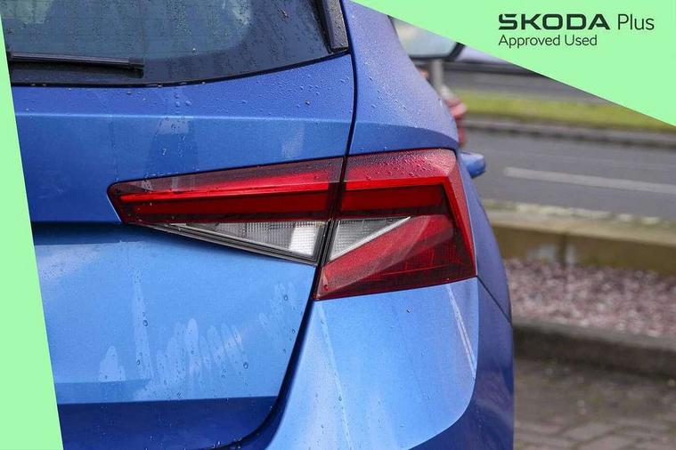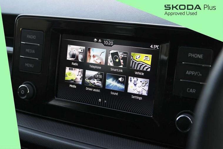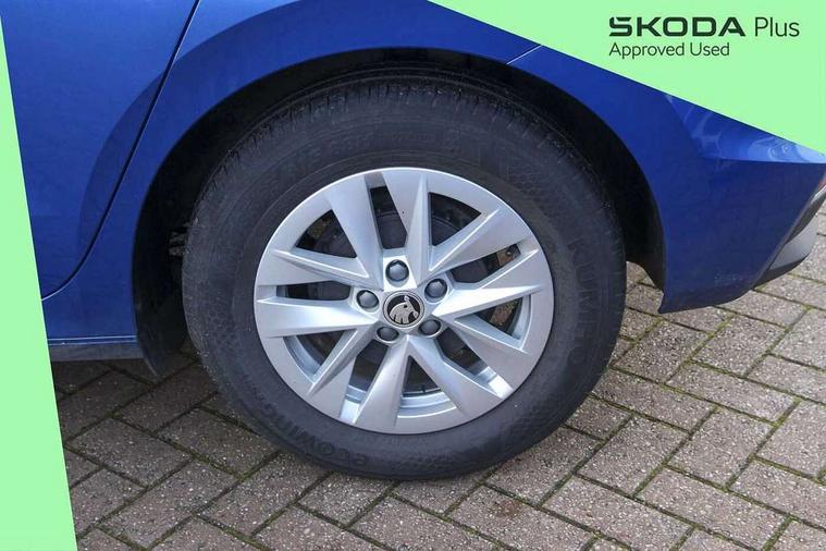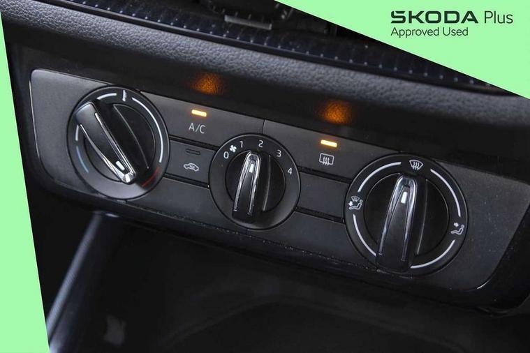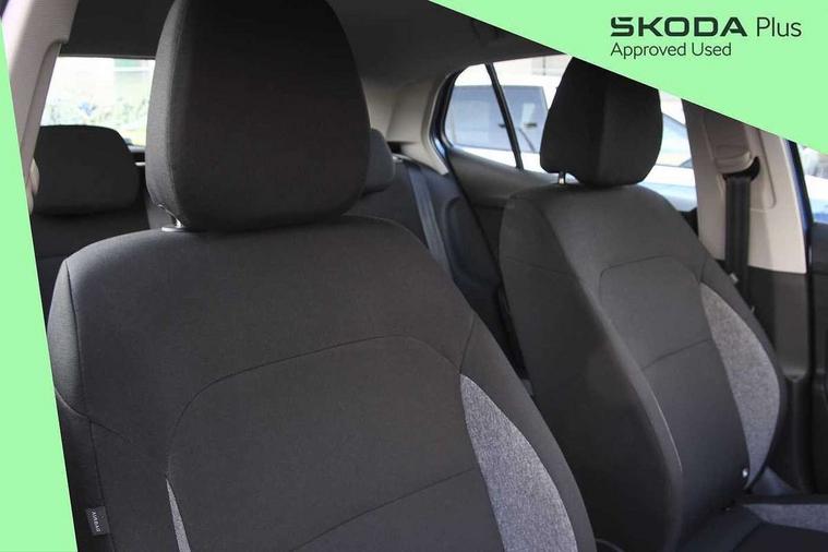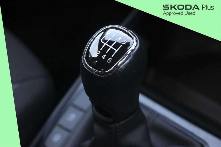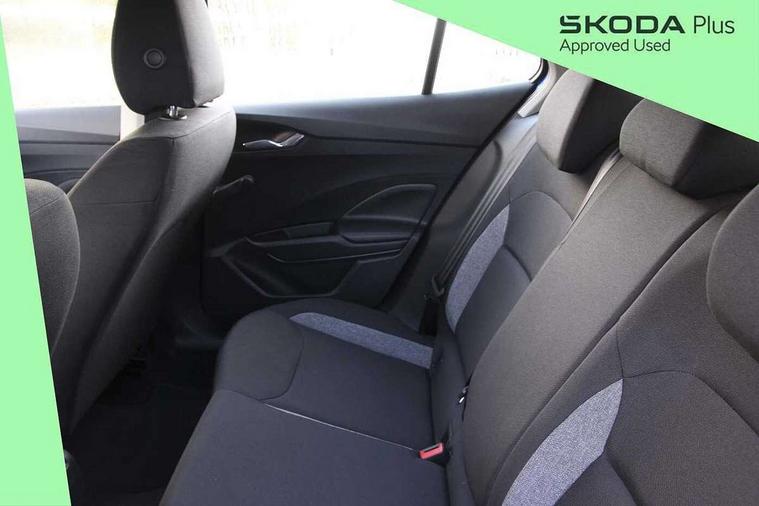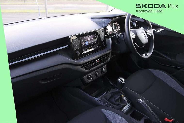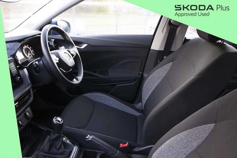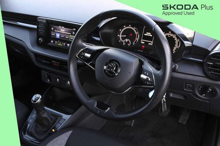 Bluetooth connection, Driver alert system - DAS, Electromechanical power steering, Exterior temperature gauge, Lane assist including road edge detection, Multifunction trip computer in black and white, Service interval indicator, Speed limiter, 2x USB-C in the front (for data transmission and charging), 4 speakers in front, Auxiliary socket for external MP3 player, DAB digital radio reception, Radio Swing with 6.5" colour display, Basic LED Headlights, Basic rear lights, Body colour door mirrors, Body coloured bumpers, Dimming rear view mirror with black frame, Door mirror integrated indicators, Electrically adjustable and heated door mirrors, Electrically adjustable front windows with function auto up/down, Front fog lights, Front window wiper intermittent control, Headlight range control - Automatic, Ice scraper in fuel cap, LED daytime running lights with coming and leaving home feature, Mechanical adjustable rear windows, Rain sensor, Rear LED fog light, Rear side wing doors, Rear window wiper with washing nozzles, Roof mounted spoiler, SKODA tailgate lettering in chrome, Third brake light, 2 reading lights in front and 2 reading lights in rear, 2 spoke leather multifunction steering wheel, 3 rear headrests, Backrest split and folding, Central console with fixed cup holder and storage box, Chrome handbrake release button, Fabric upholstery, Gearshift knob/handle in leather, Grain satin black interior door handles, Hand brake lever handle in leather, Height adjustable front headrests, Height adjustable front seats, Height adjustable steering wheel, ISOFIX and TopTether anchorage points to the outer rear seats, ISOFIX and TopTether on the front passenger seat, Luggage compartment lighting, Manual air conditioning, Manually adjustable lumbar support in front seats, Pollen filter, Rear seat bench unsplit, Single front passenger seat, Storm grey headlining, Sun visors with mirror and airbag label on passenger side, Ticket holder, 3-point height adjustable front seats belts with pretensioner and force limiter, Automatic warning lights in case of crash, Driver and passengers airbag with switch off function, e-Call+, ESC including ABS, MSR, ASR, EDS, HBA and XDS, Front and rear seat belt warning, FRONT ASSIST (AEB City and AEB Inter Urban), Front side airbags, Head airbags, One tone horn, Pedestrian protection, Three rear 3-points safety seat belts with pretensioner and force limiter including stop function for outer rear seat belts, Tyre pressure monitoring system, Anti-theft alarm system including immobiliser, interior monitoring, backup horn, and towing protection, Central locking with radio remote control, interior controls, SAFE function and 2 foldable keys, Black painted air vents, Glossy black decorative trim, Grain satin black central console cover, Grain satin black lower decorative trim, Satin black door and side trim panel in front, Anti-theft wheel bolts protection, Super-low rolling resistance tyres,