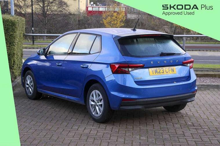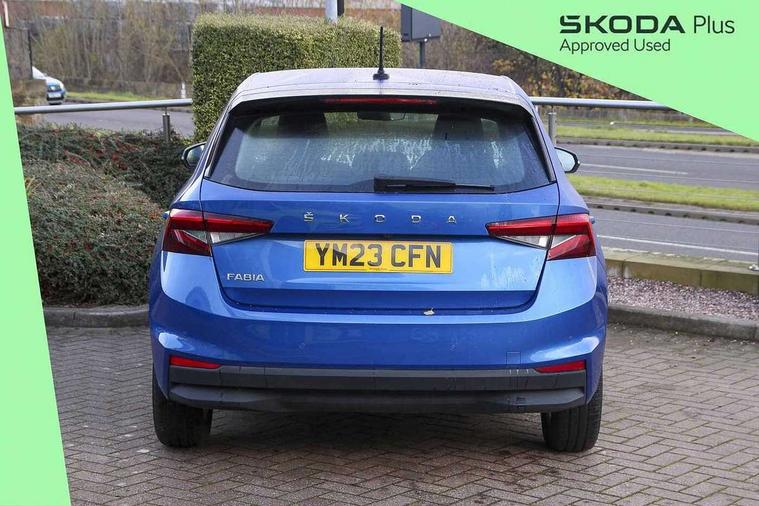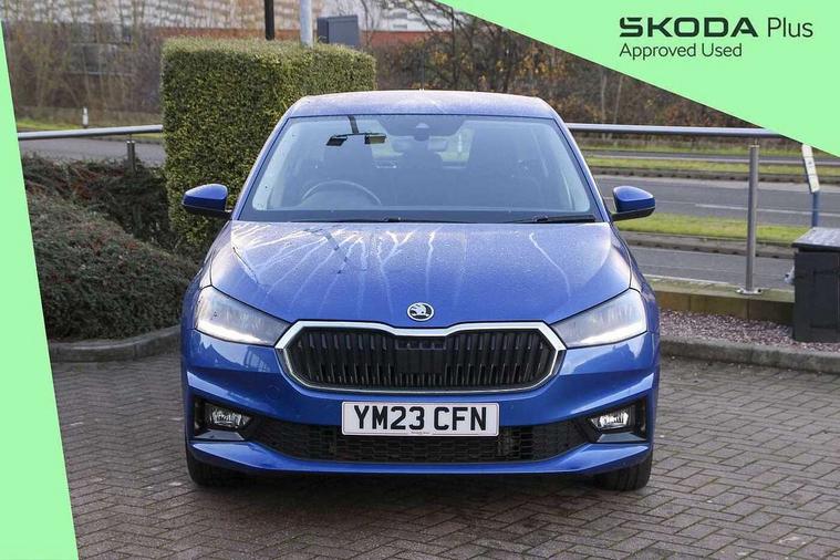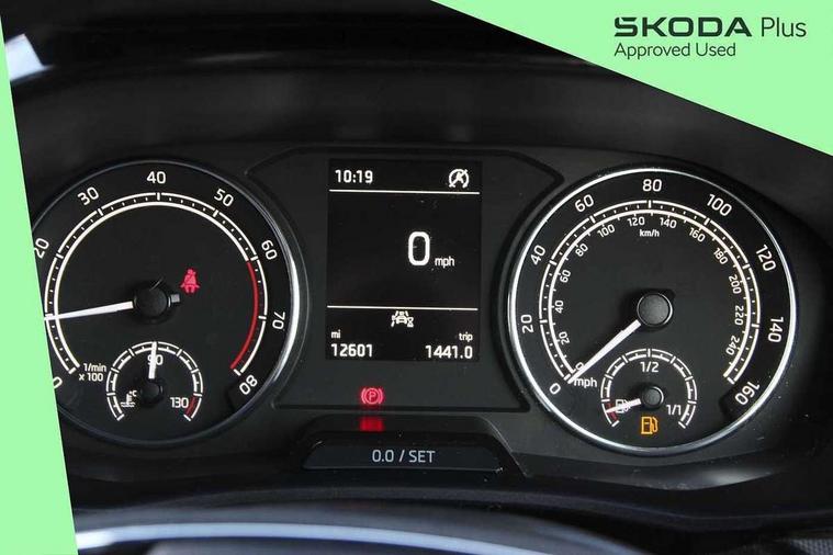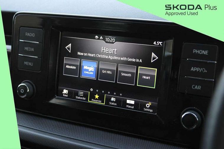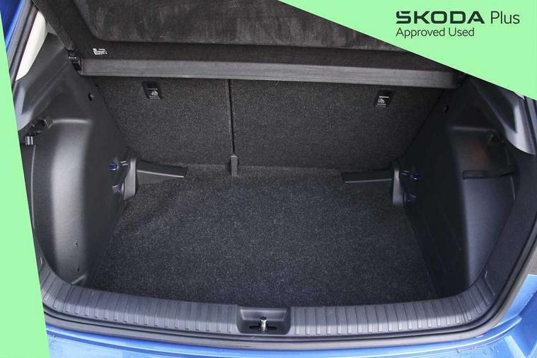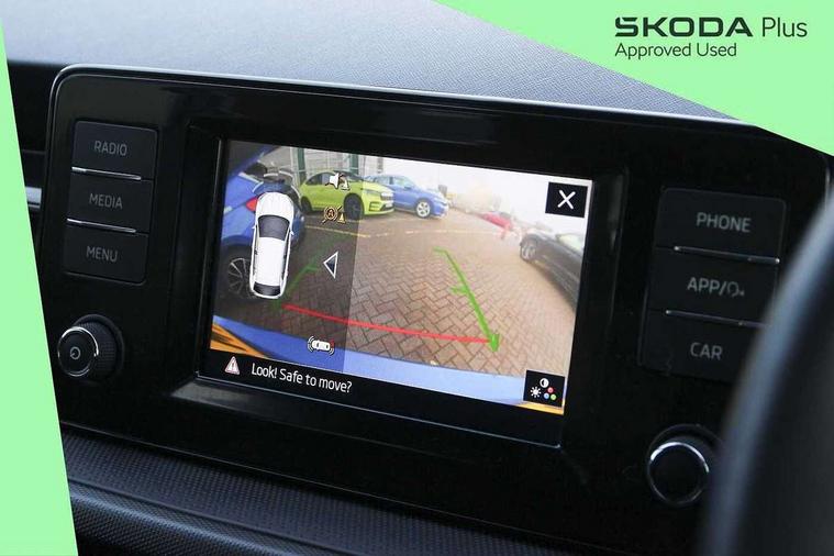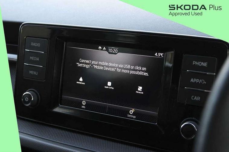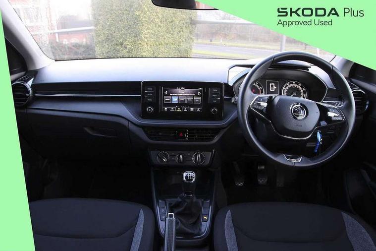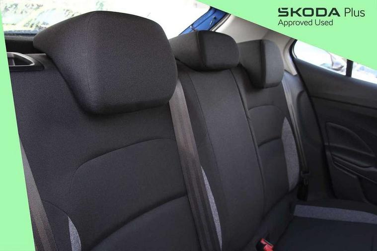 Bluetooth connection, Driver alert system - DAS, Electromechanical power steering, Exterior temperature gauge, Lane assist including road edge detection, Multifunction trip computer in black and white, Service interval indicator, Speed limiter, 2x USB-C in the front (for data transmission and charging), 4 speakers in front, Auxiliary socket for external MP3 player, DAB digital radio reception, Radio Swing with 6.5" colour display, Basic LED Headlights, Basic rear lights, Body colour door mirrors, Body coloured bumpers, Dimming rear view mirror with black frame, Door mirror integrated indicators, Electrically adjustable and heated door mirrors, Electrically adjustable front windows with function auto up/down, Front fog lights, Front window wiper intermittent control, Headlight range control - Automatic, Ice scraper in fuel cap, LED daytime running lights with coming and leaving home feature, Mechanical adjustable rear windows, Rain sensor, Rear LED fog light, Rear side wing doors, Rear window wiper with washing nozzles, Roof mounted spoiler, SKODA tailgate lettering in chrome, Third brake light, 2 reading lights in front and 2 reading lights in rear, 2 spoke leather multifunction steering wheel, 3 rear headrests, Backrest split and folding, Central console with fixed cup holder and storage box, Chrome handbrake release button, Fabric upholstery, Gearshift knob/handle in leather, Grain satin black interior door handles, Hand brake lever handle in leather, Height adjustable front headrests, Height adjustable front seats, Height adjustable steering wheel, ISOFIX and TopTether anchorage points to the outer rear seats, ISOFIX and TopTether on the front passenger seat, Luggage compartment lighting, Manual air conditioning, Manually adjustable lumbar support in front seats, Pollen filter, Rear seat bench unsplit, Single front passenger seat, Storm grey headlining, Sun visors with mirror and airbag label on passenger side, Ticket holder, 3-point height adjustable front seats belts with pretensioner and force limiter, Automatic warning lights in case of crash, Driver and passengers airbag with switch off function, e-Call+, ESC including ABS, MSR, ASR, EDS, HBA and XDS, Front and rear seat belt warning, FRONT ASSIST (AEB City and AEB Inter Urban), Front side airbags, Head airbags, One tone horn, Pedestrian protection, Three rear 3-points safety seat belts with pretensioner and force limiter including stop function for outer rear seat belts, Tyre pressure monitoring system, Anti-theft alarm system including immobiliser, interior monitoring, backup horn, and towing protection, Central locking with radio remote control, interior controls, SAFE function and 2 foldable keys, Black painted air vents, Glossy black decorative trim, Grain satin black central console cover, Grain satin black lower decorative trim, Satin black door and side trim panel in front, Anti-theft wheel bolts protection, Super-low rolling resistance tyres,