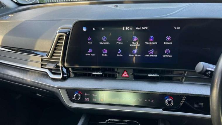 12.3" Display with navigation, 4.2" supervision colour cluster display, Apple car play/Android Auto with voice control, Drive mode selector, E-call, Forward collision avoidance assist (FCA) - city/pedestrian/cyclist/junction covering, Front and rear parking sensors, Highway Driving Assist (HDA), Intelligent speed limit assist, Kia Connect (UVO), Lane Following Assist (LFA), Lane keep assist, Low washer fluid warning, Rear view monitor, Reversing camera system integrated into centre fascia screen, Smart cruise control with stop and go functionality, Speed sensitive power steering, Trip computer, Windscreen washer level indicator, Intelligent Stop and Go, 6 speaker audio system, Bluetooth audio streaming, DAB Radio with MP3, Rear USB port, Steering wheel mounted audio controls, USB C type charging ports on centre console, USB C type charging ports on side of front seats, USB port for connection of a media device, All round electric windows with drivers and front passenger auto up/down function, Automatic headlight control system, Automatic window defogger, Backlite glass heated with timer, Body colour and black bumper with silver accents, Body colour exterior door handles, Body colour radiator upper garnish and door garnish, Electrically adjustable/heated/folding door mirrors with LED indicators, Front and rear skid plate - chrome, Gloss black door mirrors, Gloss black radiator grille, Gloss black side sill and wheel arch body mouldings, Glossy black roof rack, High beam assist, Interior electrochromic mirror, LED daytime running lights, LED front fog lamps, LED headlamps (low and high beam - MFR type), LED High mounted stop light, LED rear combination lamp, Rain sensing wipers with aero blades, Rear fog lamp, Rear privacy glass, Rear side wing doors, Rear spoiler, Rear wiper, Satin finished beltline, Silver coloured inserts to bumpers, Tinted rear glass, Trailer stability assist, 12V power socket in front centre fascia and luggage compartment, 2nd row personal lamps, 3 seat bench in 2nd row, 3 x passenger assist grips, 40/20/40 split folding rear seat, All-round height adjustable headrests, Black headlining, Centre console storage box, Cupholders in rear armrest, D-Shaped sports leather steering wheel and perforated inserts with GT-Line logo, Door courtesy lamps, Drink holder at centre armrest, Driver and front passenger side sunvisors with illuminated vanity mirrors, Driver's seat manual height adjust, Drivers seat power lumbar support, Front and rear door storage, Front seat and rear pockets, Front/rear centre armrests, Gear shift indicator, Glovebox illumination, Heated front seats, Heated steering wheel, Interior door lock/unlock function, ISOFIX Child seat top tethers and anchor fixings outer rear seats, Luggage area light, Luggage area load cover, Luggage net hooks, Metal paint interior door handles, Overhead console lamp, Paddle shift controls, Rear cabin light, Rear coat hooks, Single front passenger seat, Sports pedals, Suede leather upholstery, Three zone climate control, Tilt/telescopic adjustable steering wheel, Ventilation ducts to rear compartment, Active front headrests, All round 3-point seatbelts, Anti-lock braking system (ABS), Dual front side airbags, Dual horn, Electronic parking brake, Electronic stability control with downhill brake control, Front passenger airbag cut-off switch, Front seatbelt pretensioners + load limiters, Height adjustable front seatbelts, Hill start assist control (HAC), Impact sensing auto door unlocking, Multi collision brake assist, Rear door child safety locks, Rear seat alert system, Traction control, Twin curtain airbags, Twin front airbags, Tyre pressure monitoring system, Advanced anti-theft system including immobiliser and alarm, Door deadlocks, Engine Start/Stop Button with Smart Entry System, Locking wheel nuts, Speed sensitive auto door locking, Visible vehicle identification number, Aluminium pattern finish centre fascia and door garnish, 19" GT-Line alloy wheels, Tyre mobility kit,