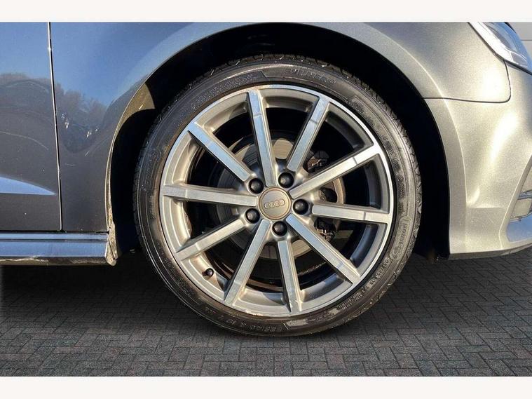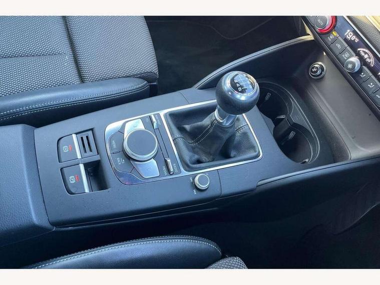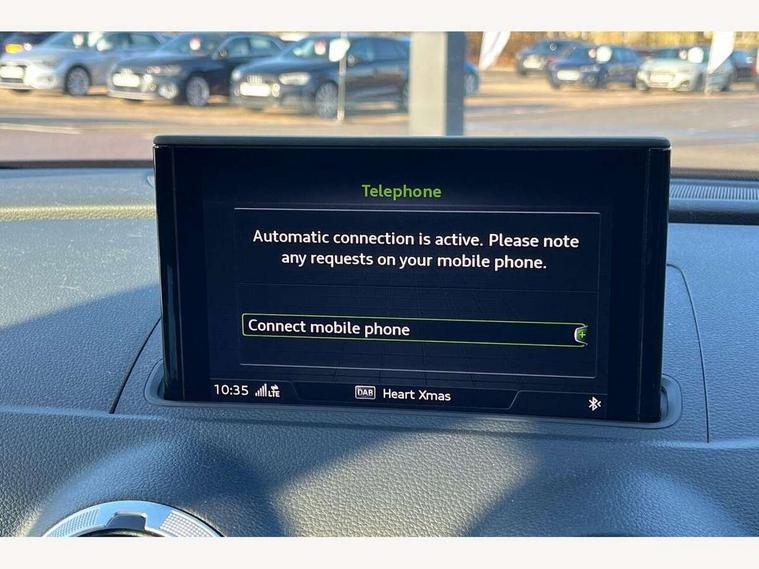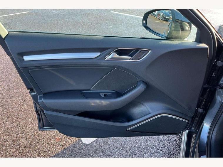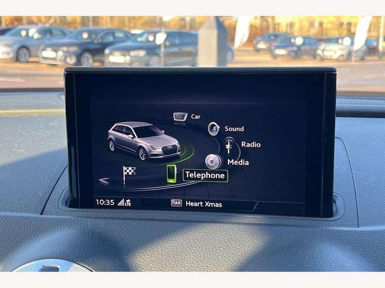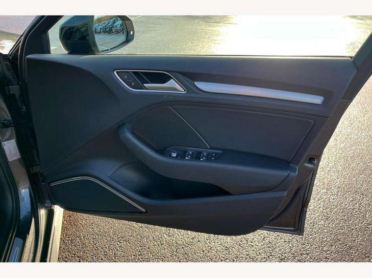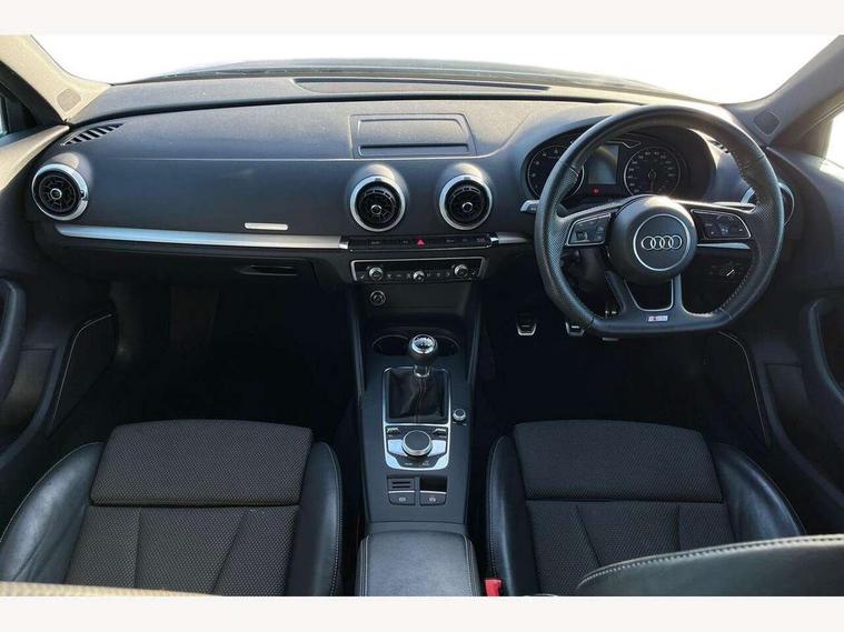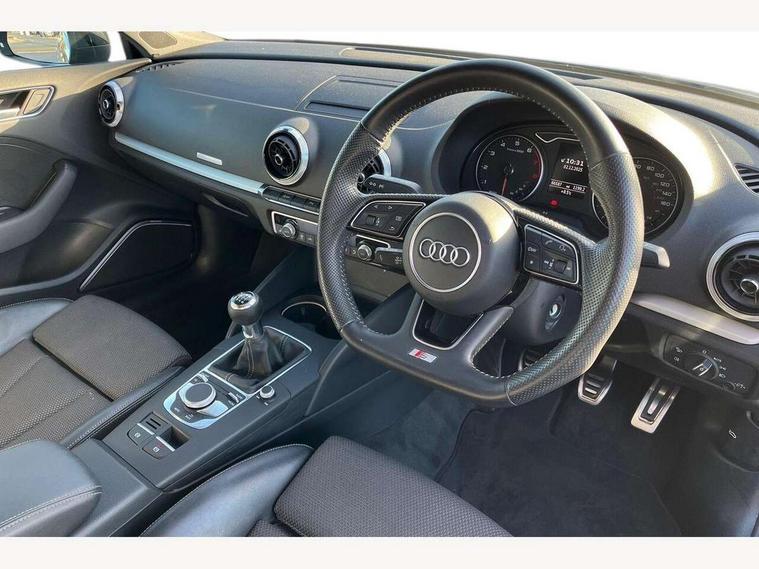 Audi connect, Audi drive select, Audi smartphone interface, Automatic start/stop system, Colour driver's information system display, Cruise control, Electro - mechanical power assisted steering, Mobile telephone preparation - bluetooth interface, SD card based MMI navigation, Service interval indicator, Speed limit display, Voice control system, Voice recognition for navigation system, Sports suspension, 2 USB interfaces and Aux-In jack, Audi music interface, CD player, DAB Digital radio, MMI radio plus with 7" colour MMI screen and MMI controller, Online entertainment, Auto dimming rear view mirror with light and rain sensors, Body colour roof spoiler with aerodynamic inserts in high gloss black, Chrome exhaust tailpipes, Electric front windows, Electric rear windows, Electrically adjustable and heated door mirrors with integrated LED side indicators, Heated windscreen washer jets, LED daytime running lights, Privacy glass - dark tinted rear and rear side windows from B-pillar backwards, Rear wiper, Sport specific side air inlet grille and diffuser insert, 3 adjustable rear headrests, 3 spoke flat bottomed multi-function leather sport steering wheel, 4 lashing points to secure luggage, 60/40 split folding rear seat, Adjustable front centre armrest, Black cloth headlining, Dual zone electronic climate control, Front and rear interior lights with delay, Front/rear floor mats, Glovebox light, Height and reach adjustable steering wheel, Illuminated door sill trims with S logo, Isofix child seat preparation for front passenger/outer rear seats inc passenger airbag deactivation, Manual height adjustable front seats, Stainless steel pedals, Storage compartments in doors side trims, centre console and under front drivers seat, Tool kit, Black styling pack - A3/S3, LED interior light pack - A3/RS3, Non smoking pack - A3, Storage and luggage pack - A3/RS3, 3 point seatbelts on all seats, ABS/EBD, Active bonnet, Active front headrests, Airbags - front driver/passenger, front & rear side, curtain, drivers knee, ASR, EDL, Electromechanical parking brake, ESC - Electronic Stability Control + traction control, Front passenger airbag deactivation, Hill hold assist, Manual rear child locks, Multi-Collision braking, Seatbelt warning, Tyre pressure warning, Warning triangle and first aid kit, Anti theft alarm, Anti-theft wheel bolts, Remote control central locking, Thatcham category 1 alarm + immobiliser, Aluminium air vent surrounds, Aluminium trim elements, Matt brushed aluminium inlays, 18" 10 spoke design alloy wheels in matt titanium look with diamond cut finish, Tyre repair kit,