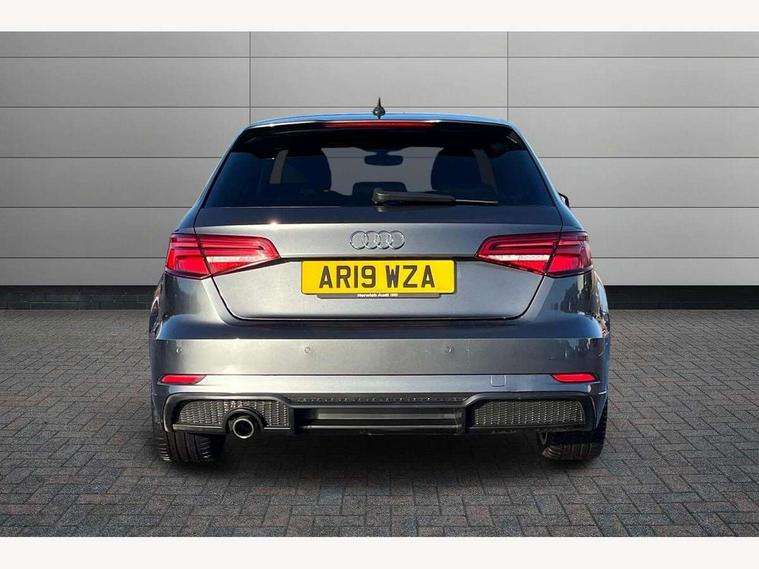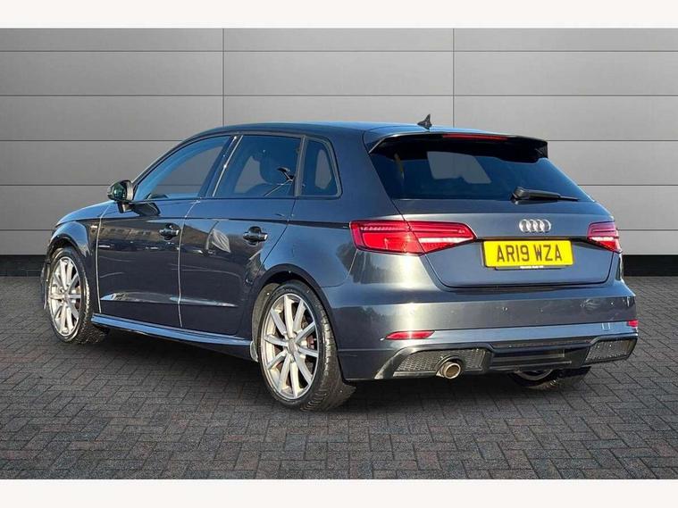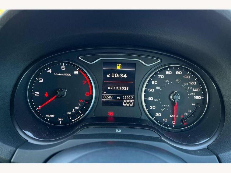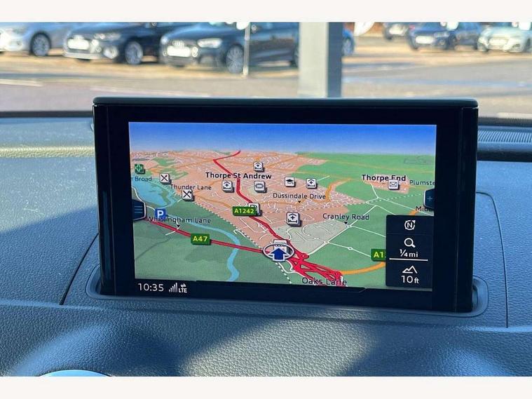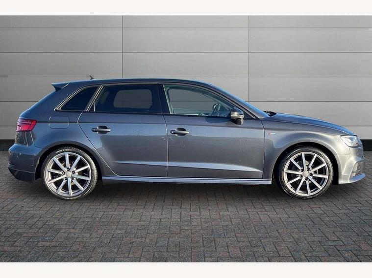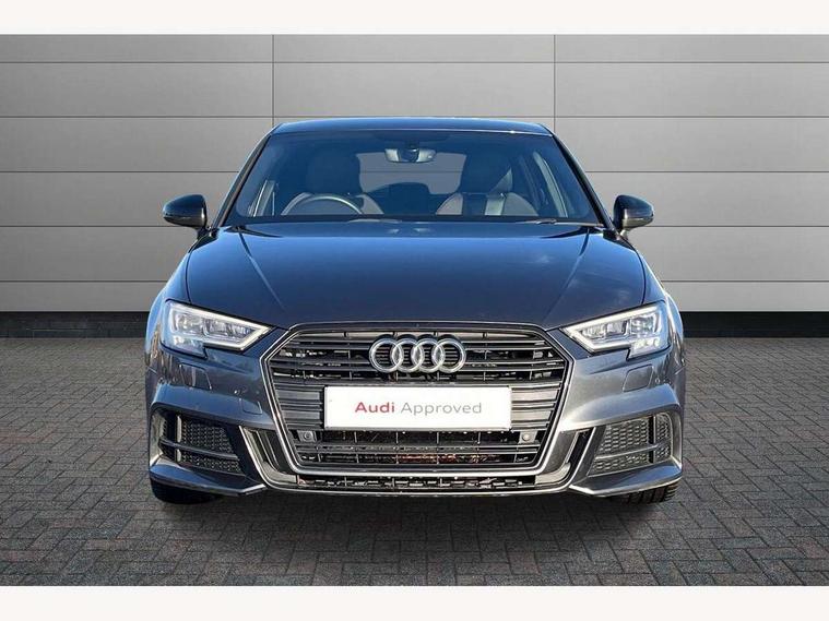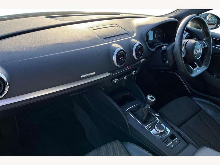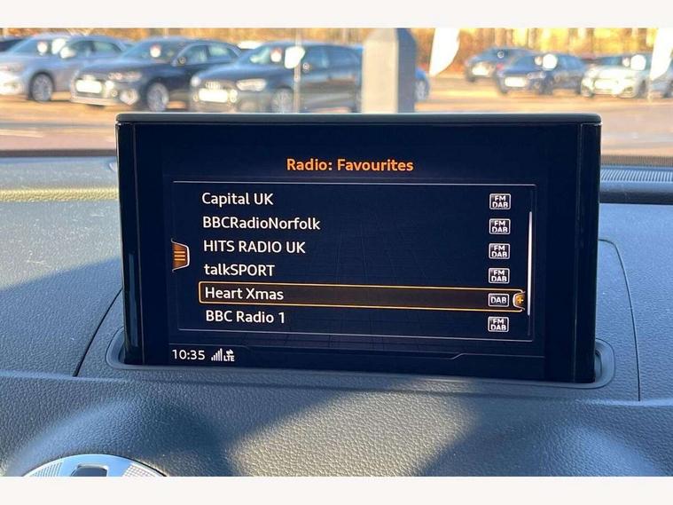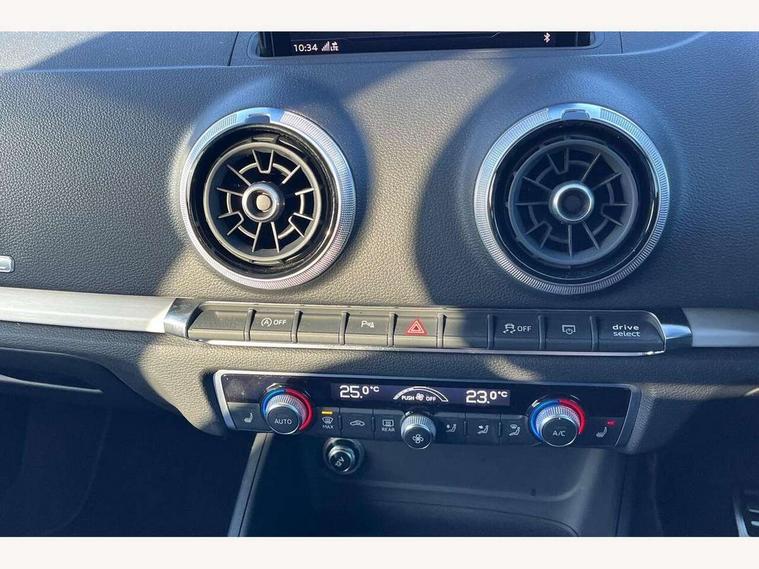 Audi connect, Audi drive select, Audi smartphone interface, Automatic start/stop system, Colour driver's information system display, Cruise control, Electro - mechanical power assisted steering, Mobile telephone preparation - bluetooth interface, SD card based MMI navigation, Service interval indicator, Speed limit display, Voice control system, Voice recognition for navigation system, Sports suspension, 2 USB interfaces and Aux-In jack, Audi music interface, CD player, DAB Digital radio, MMI radio plus with 7" colour MMI screen and MMI controller, Online entertainment, Auto dimming rear view mirror with light and rain sensors, Body colour roof spoiler with aerodynamic inserts in high gloss black, Chrome exhaust tailpipes, Electric front windows, Electric rear windows, Electrically adjustable and heated door mirrors with integrated LED side indicators, Heated windscreen washer jets, LED daytime running lights, Privacy glass - dark tinted rear and rear side windows from B-pillar backwards, Rear wiper, Sport specific side air inlet grille and diffuser insert, 3 adjustable rear headrests, 3 spoke flat bottomed multi-function leather sport steering wheel, 4 lashing points to secure luggage, 60/40 split folding rear seat, Adjustable front centre armrest, Black cloth headlining, Dual zone electronic climate control, Front and rear interior lights with delay, Front/rear floor mats, Glovebox light, Height and reach adjustable steering wheel, Illuminated door sill trims with S logo, Isofix child seat preparation for front passenger/outer rear seats inc passenger airbag deactivation, Manual height adjustable front seats, Stainless steel pedals, Storage compartments in doors side trims, centre console and under front drivers seat, Tool kit, Black styling pack - A3/S3, LED interior light pack - A3/RS3, Non smoking pack - A3, Storage and luggage pack - A3/RS3, 3 point seatbelts on all seats, ABS/EBD, Active bonnet, Active front headrests, Airbags - front driver/passenger, front & rear side, curtain, drivers knee, ASR, EDL, Electromechanical parking brake, ESC - Electronic Stability Control + traction control, Front passenger airbag deactivation, Hill hold assist, Manual rear child locks, Multi-Collision braking, Seatbelt warning, Tyre pressure warning, Warning triangle and first aid kit, Anti theft alarm, Anti-theft wheel bolts, Remote control central locking, Thatcham category 1 alarm + immobiliser, Aluminium air vent surrounds, Aluminium trim elements, Matt brushed aluminium inlays, 18" 10 spoke design alloy wheels in matt titanium look with diamond cut finish, Tyre repair kit,