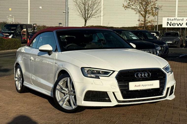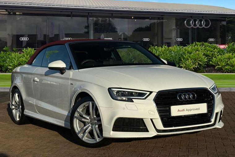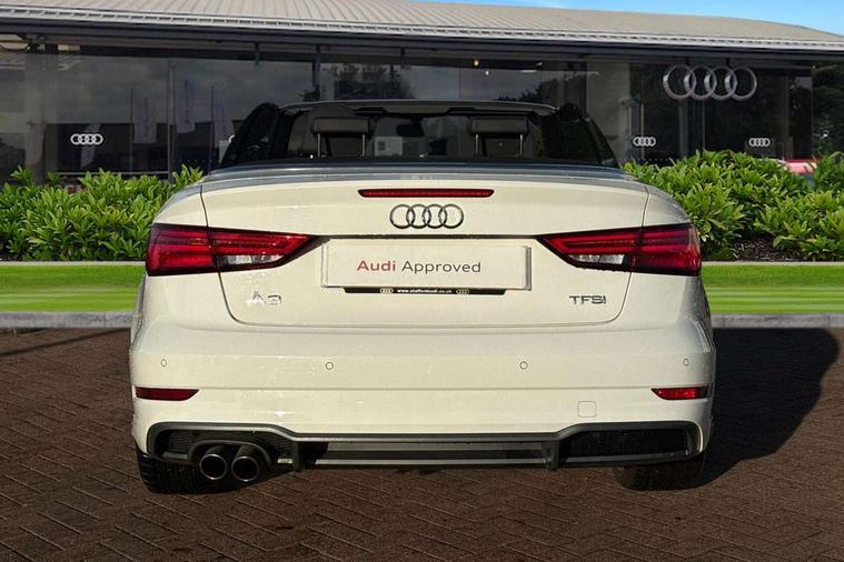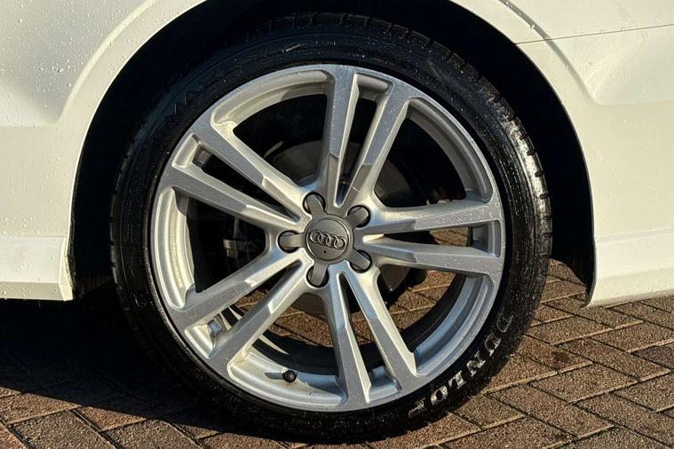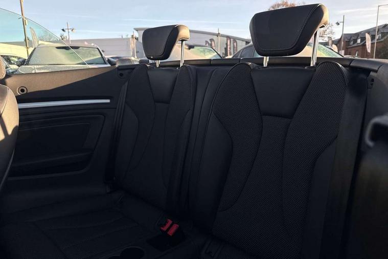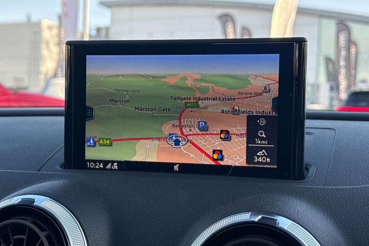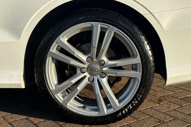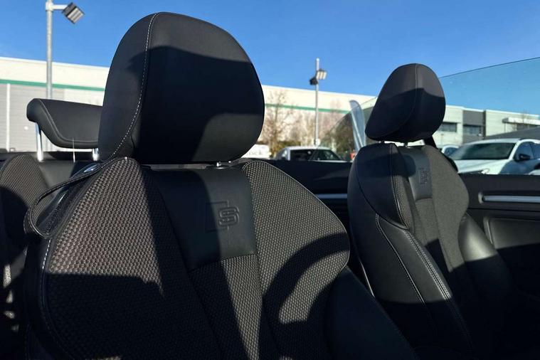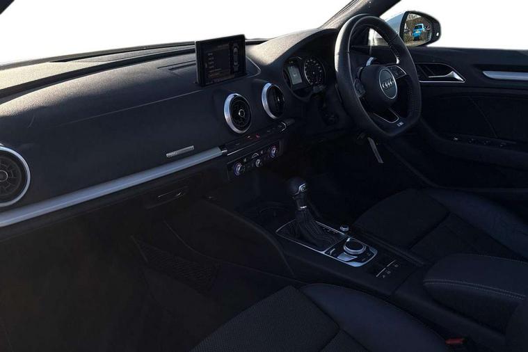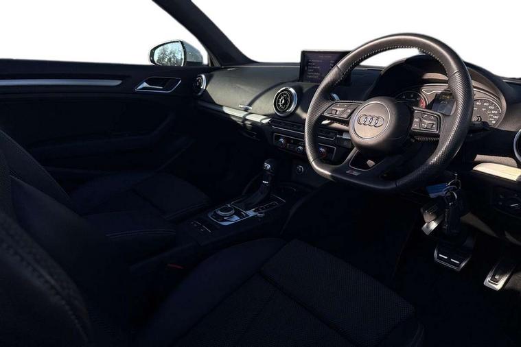 Audi drive select, Audi smartphone interface, Automatic start/stop system, Bluetooth interface, Colour driver's information system display, Electro-mechanical PAS, SD card based MMI navigation, Service interval indicator, 2 USB ports, Audi music interface, CD player, DAB Digital radio, MMI radio plus with 7" colour MMI screen and MMI controller, Aluminium side window trim, Auto dimming rear view mirror with light and rain sensors, Automatic lights and wipers, Body colour bumpers, Body colour door mirrors with integral indicators, Chrome exhaust tailpipes, Dark chrome grille, Electric operated/heated door mirrors, Front and rear electric windows, Fully automatic acoustic hood, Heated front windscreen, Heated rear window, Heated windscreen washer jets, LED daytime running lights, Roof spoiler, S Line body styling, 2 height adjustable rear headrests, 3 spoke flat bottom multi-function leather steering wheel including paddle shift, 4 lashing points to secure luggage, 50/50 split folding rear seat, Adjustable front armrest, Driver/passenger sunvisors, Dual zone electronic climate control, Front/rear floor mats, Height adjustable front seats, Height/reach adjustable steering column, Illuminated glovebox, ISOFIX child seat preparation+airbag deactivation, Jack and tool kit, Perforated leather gearknob, Stainless steel pedals, Storage compartment in centre console, Storage compartments in doors, LED interior light pack - A3/RS3, Light and rain sensor pack - A3 Cabriolet, Non smoking pack - A3, Storage pack - A3 Cabriolet/Saloon, 3 point seatbelts on all seats, ABS/EBD, Active bonnet, Active front headrests, ASR, Automatic roll over protection, Driver and passenger side airbags, Driver/Front Passenger airbags, Drivers knee airbag, EDL, Electromechanical parking brake, ESC - Electronic Stability Control + traction control, Front passenger airbag deactivation, Seatbelt warning, Tyre pressure monitor, Warning triangle and first aid kit, Anti theft alarm, Anti-theft wheel bolts, Immobiliser, Remote control central locking, Aluminium air vent surrounds, Aluminium trim elements, Matt brushed aluminium inlays, Space saver spare wheel,