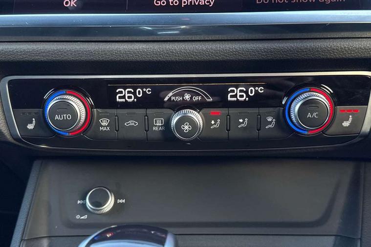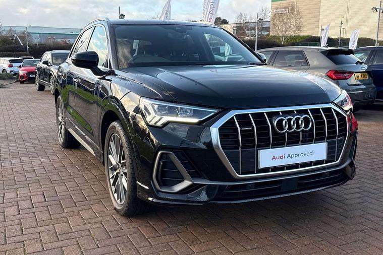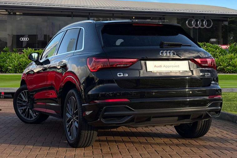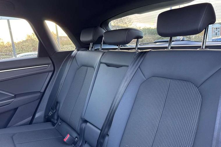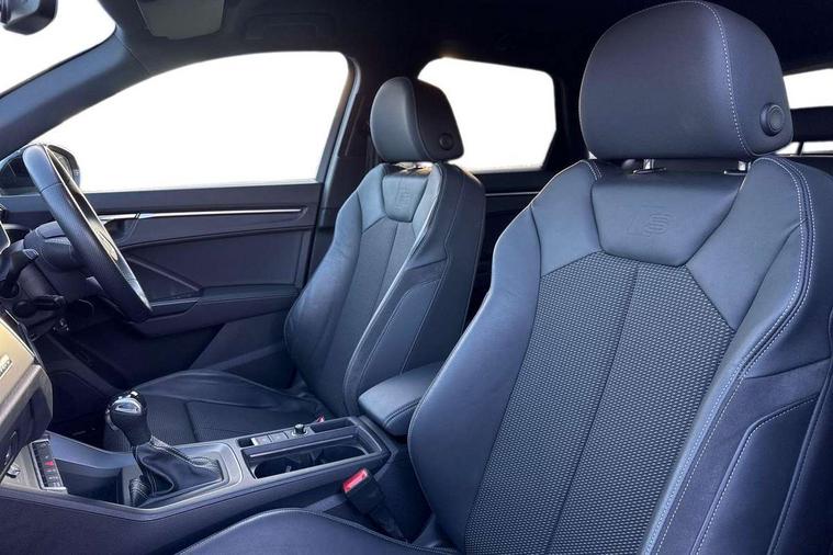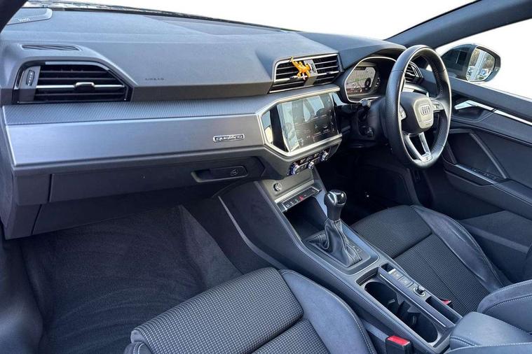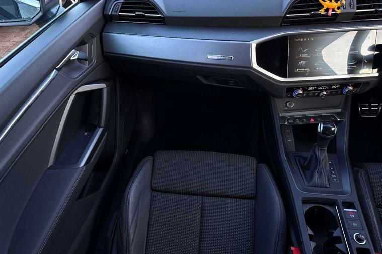 Amazon alexa Integration, Audi connect safety and service (e-call), Audi drive select, Audi lane departure warning, Audi Virtual Cockpit - 10.25" display, Bluetooth interface, Camera based traffic sign recognition, MMI Navigation Plus with high resolution 10.1 inch touchscreen colour display, Power operated tailgate, Progressive steering, Service interval indicator, Smartphone interface includes wireless Apple carplay/Android Auto, Start stop system with recuperation, Voice control system with natural language interaction, Sports suspension, 2 USB-C ports with charge and data functions, 6 passive loudspeakers, DAB digital radio module, Acoustic windscreen, Aluminium roof rails, Aluminium window trim, Auto dimming frameless rear view mirror, Body coloured bumpers, Electrically folding, adjustable and heated door mirrors with integrated LED side indicators and kerb view function for passenger side, Front and rear electric windows, Front fog lights, Front side air inlets in matt platinum grey, Front spoiler blade in matt platinum grey, Grille vertical bars in aluminium silver/Matt, High gloss black finish B and C pillars, LED headlights with LED daytime running lights, LED rear lights, LED third brake light, Privacy glass dark tinted rear and rear-side windows (from B-pillar backwards), Rain and light sensors, Rear diffuser strip in matt titanium black, Rear side wing doors, Rear wiper, S line badges on front wings, S Line front and rear bumpers, Side skirt insert in matt Platinium grey, Silver chrome grille surround, Tinted rear windows, Titanium black radiator grille, Variable front intermittent wipers, 12V socket in rear centre console, 3 seat bench in 2nd row, 40:20:40 folding with manual adjustment for 60:40 forwards/backwards position and backrest angle, Adjustable rear seat bench/backrest with centre armrest and cupholder, Black cloth headlining, Dual zone electronic climate control, Front and rear black floor mats with contrast stitching in rock grey, Front and rear headrests, Front and rear roof module including reading lights, Front centre armrest, Glove compartment lighting, Height and reach adjustable steering wheel, Illuminated door sill trims with S logo, ISOFIX child seat mounting for front passenger with airbag deactivation and outer rear seat including top tether attachment point for outer rear seats, Luggage compartment light, Manual front seats with height adjustment, Perforated leather gearknob, Single front passenger seat, Stainless steel luggage compartment sill finisher, Stainless steel pedals, Non smoking pack - Q3, 3x3 point rear seatbelts, 6 airbags - Driver, front passenger, curtain and side windows, Audi pre-sense front with pedestrain and cyclist recognition, Electrically operated child locks on rear doors, Electromechanical parking brake, Electronic stabilisation control including ABS, ASR and EDL, Front seatbelt reminder, Hill descent control, Hill hold assist, Pre sense basic, Seatbelt monitoring, Tyre pressure warning, Warning triangle and first aid kit, Anti theft alarm, Anti theft wheel bolts, Immobiliser, Remote central locking, Dark matt brushed aluminium inlay, Detail dashboard around MMI touch colour display in glass look, black with surround in aluminium look, Leatherette door armrest,