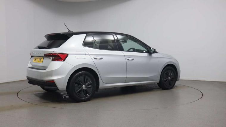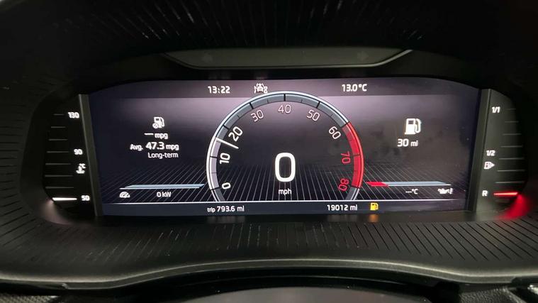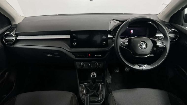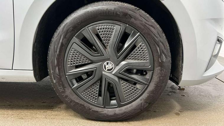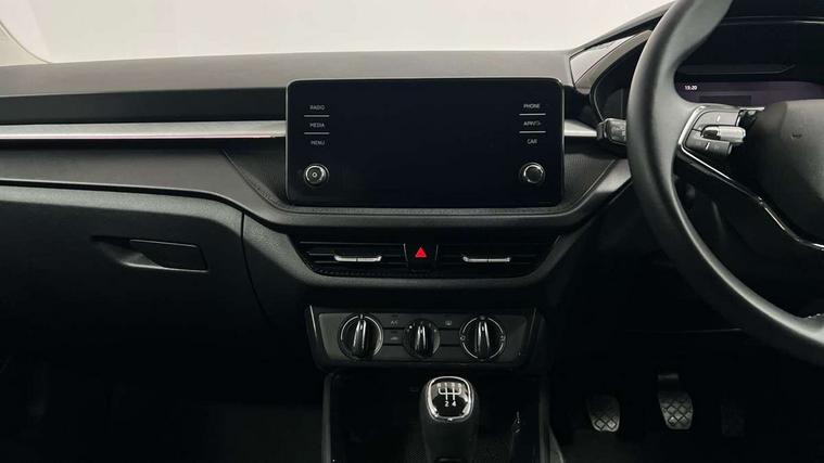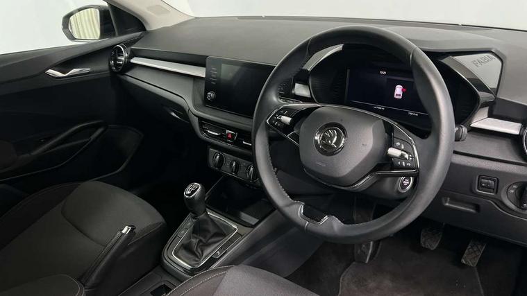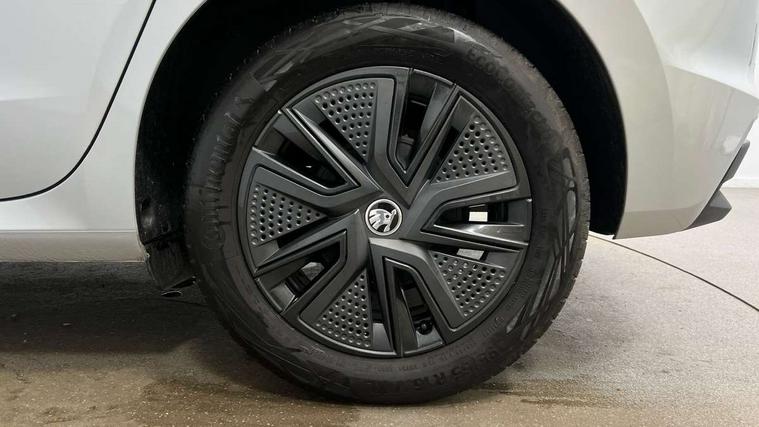 Bluetooth connection, Driver alert system - DAS, Electromechanical power steering, Exterior temperature gauge, Lane assist including road edge detection, Service interval indicator, Virtual cockpit with 10.25" colour display, 2x USB-C in the front (for data transmission and charging), 6 Speakers (4 in front and 2 in rear), Auxiliary socket for external MP3 player, Bolero radio with 8" colour display, DAB digital radio reception, Basic rear light, Body coloured bumpers, Dimming rear view mirror with black frame, Door mirror integrated indicators, Electrically adjustable and heated door mirrors, Electrically adjustable front windows with function auto up/down, Front window wiper intermittent control, Headlight range control - Automatic, Ice scraper in fuel cap, LED daytime running lights with coming and leaving home feature, Mechanical adjustable rear windows, Privacy glass, Rear LED fog light, Rear side wing doors, Rear window wiper with washing nozzles, Roof mounted spoiler, SKODA tailgate lettering in chrome, Third brake light, 3 rear headrests, Backrest split and folding, Central console with fixed cup holder and storage box, Chrome handbrake release button, Fabric upholstery, Gearshift knob/handle in leather, Grain satin black interior door handles, Hand brake lever handle in leather, Height adjustable front headrests, Height adjustable steering wheel, ISOFIX and TopTether anchorage points to the outer rear seats, ISOFIX and TopTether on the front passenger seat, Luggage compartment lighting, Pollen filter, Rear seat bench unsplit, Single front passenger seat, Storm grey headlining, Sun visors with mirror and airbag label on passenger side, Ticket holder, Umbrella in drivers door, 3-point height adjustable front seats belts with pretensioner and force limiter, Automatic warning lights in case of crash, Driver and passengers airbag with switch off function, e-Call+, ESC including ABS, MSR, ASR, EDS, HBA and XDS, Front and rear seat belt warning, FRONT ASSIST (AEB City and AEB Inter Urban), Front side airbags, Head airbags, One tone horn, Pedestrian protection, Three rear 3-points safety seat belts with pretensioner and force limiter including stop function for outer rear seat belts, Tyre pressure monitoring system, Anti-theft alarm system including immobiliser, interior monitoring, backup horn, and towing protection, Anodized cross line upper decorative trim, Colour Edition air vents, Grain satin black central console cover, Grain satin black lower decorative trim, Satin black door and side trim panel in front, Anti-theft wheel bolts protection, Super-low rolling resistance tyres,