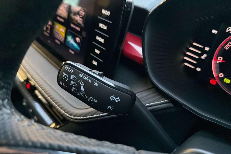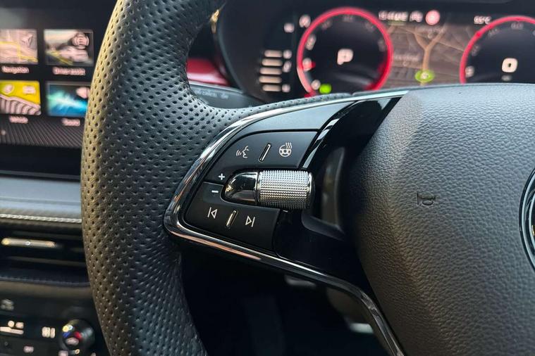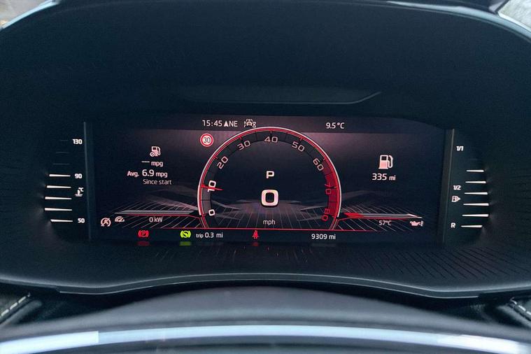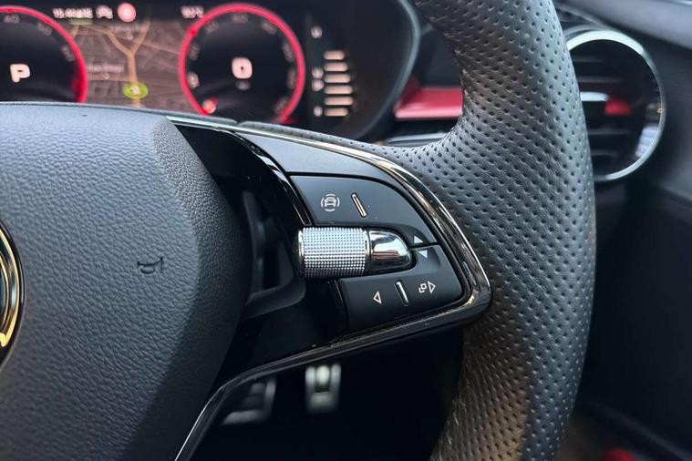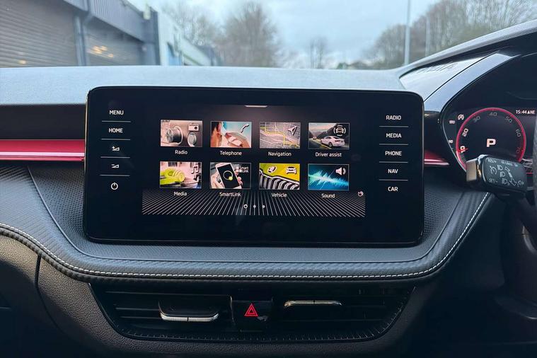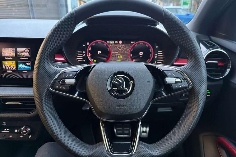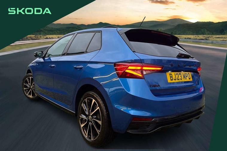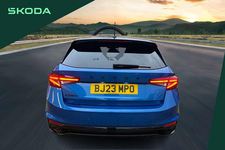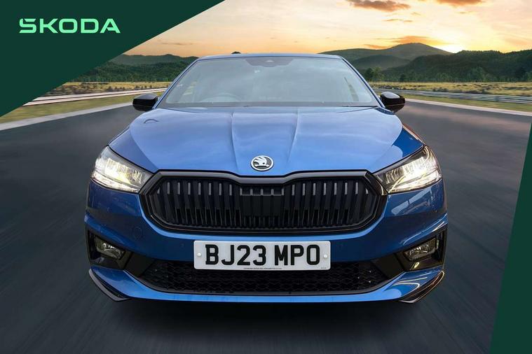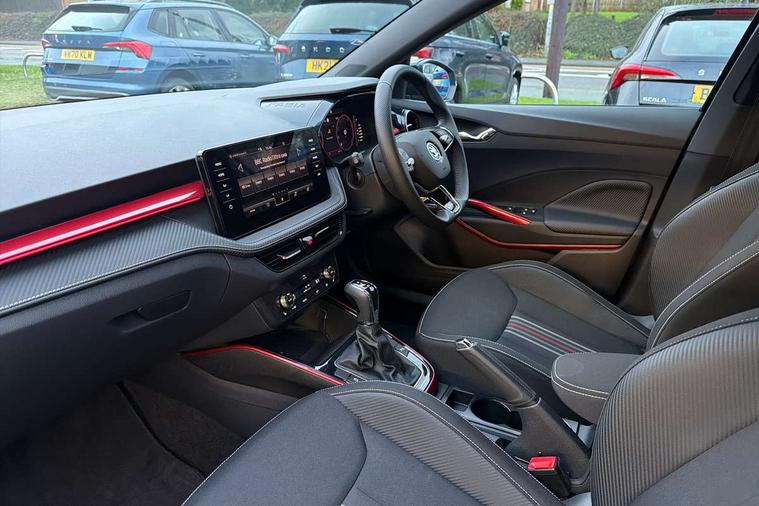 Bluetooth connection, Driver alert system - DAS, Electromechanical power steering, Exterior temperature gauge, Service interval indicator, 2x USB-C in the front (for data transmission and charging), 6 Speakers (4 in front and 2 in rear), Auxiliary socket for external MP3 player, Bolero radio with 8" colour display, DAB digital radio reception, Auto dimming rear view mirror, Basic rear lights, Black radiator grille, Body coloured bumpers, Door mirror integrated indicators, Electrically adjustable and heated door mirrors, Front and rear electric windows, Front window wiper intermittent control, Headlight range control - Automatic, Ice scraper in fuel cap, LED daytime running lights with coming and leaving home feature, Monte Carlo badging, Privacy glass, Rear LED fog light, Rear side wing doors, Rear window wiper with washing nozzles, Roof mounted spoiler, SKODA tailgate lettering in black, Sports bumpers, Third brake light, 3 rear headrests, Aluminium pedals, Backrest split and folding, Black headlining, Central console with removable cup holder and storage box, Chrome handbrake release button, Fabric/artificial leather upholstery, Front sports seats, Gearshift knob/handle in leather, Hand brake lever handle in leather, Height adjustable front headrests, Height adjustable steering wheel, ISOFIX and TopTether anchorage points to the outer rear seats, ISOFIX and TopTether on the front passenger seat, Luggage compartment lighting, Metallic painted red central console cover, Metallic red interior door handles, Monte Carlo door sills, Pollen filter, Rear seat bench unsplit, Single front passenger seat, Sun visors with mirror and airbag label on passenger side, Textile floor mats, Ticket holder, Umbrella in drivers door, Ambient lighting pack 2 - Fabia Hatchback, 3-point height adjustable front seats belts with pretensioner and force limiter, Automatic warning lights in case of crash, Driver and passengers airbag with switch off function, e-Call+, ESC including ABS, MSR, ASR, EDS, HBA and XDS, Front and rear seat belt warning, FRONT ASSIST (AEB City and AEB Inter Urban), Front side airbags, Head airbags, Hill hold assist, One tone horn, Pedestrian protection, Three rear 3-points safety seat belts with pretensioner and force limiter including stop function for outer rear seat belts, Tyre pressure monitoring system, Anti-theft alarm system including immobiliser, interior monitoring, backup horn, and towing protection, Carbon effect door and side trim panels, Carbon effect lower decorative trim with white stitching, Red metallic upper decorative trim, Anti-theft wheel bolts protection, Super-low rolling resistance tyres,