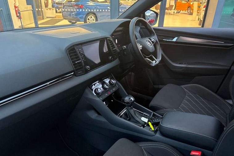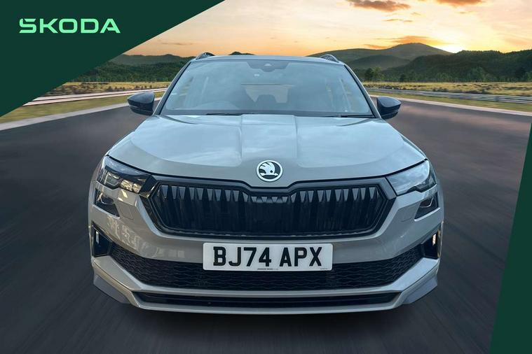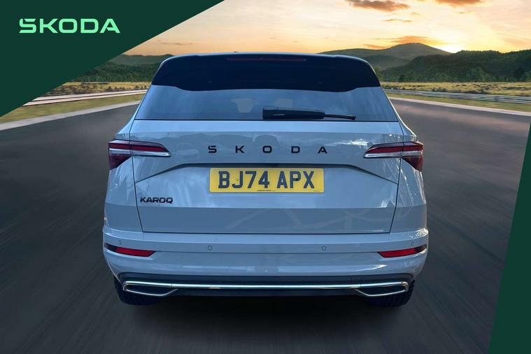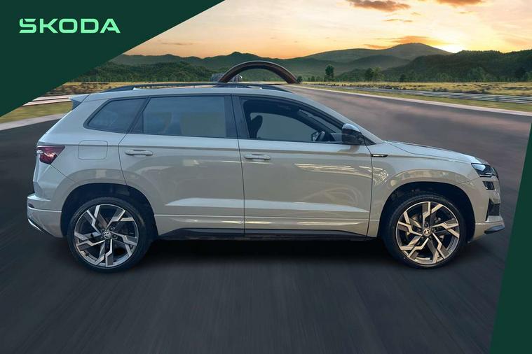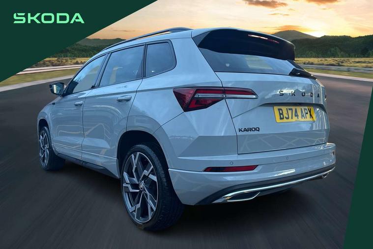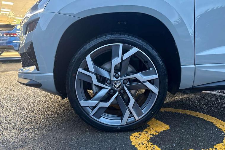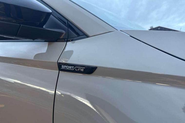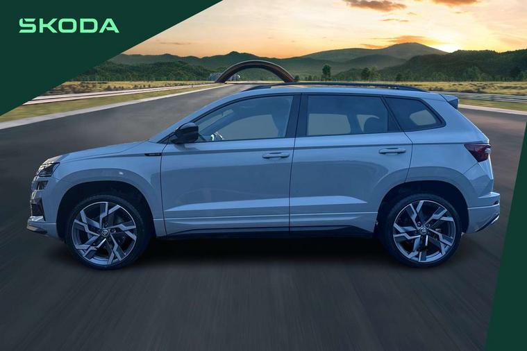 8" Digital display, Advanced driver attention and drowsiness monitor, Emergency services call system, Outside temperature gauge, Sensor for driver assistance systems, Service interval indicator, SmartLink wireless for Apple and wired for Android, Start/stop system with regenerative braking, USB C Port x 2 in front centre console, Virtual Cockpit - 10.25" digital display, Virtual pedal with electrically operated boot door, Wireless smartphone charging, DAB radio with Bluetooth, USB connection, Acoustic glass, Aero front windscreen wipers with intermittent function, Auto dimming rear view mirror with light and rain sensors, Black door mirrors, Black electric window control buttons, Black radiator grille, Black roof rails, Body colour door handles, Electric front and rear windows with child proof lock, Front door steps with SportLine logo, Heated rear windscreen, LED daytime running lights, LED rear lights with high functionality welcome effect and dynamic indicators, Light assistant (coming/leaving home/tunnel light), Panoramic sliding sunroof, Plastic scuff plates in door apertures, Privacy glass, Protective door side sills in body colour, Rear diffuser, Rear side wing doors, Rear spoiler, Rear window wiper with washer system and intermittent control, Safety reflectors on front doors, Skoda lettering on tailgate in black, Sportline badge on front fender, Sportline decorative inserts with badging, Sports front and rear bumpers, Third brake light, 1.5 litre bottle holders in driver and front passenger door panels, 12V socket in boot, 12v socket in front centre armrest with storage compartment and rear air vents, 2 x Tablet holder, 3 rear height adjustable headrests, 3 seat bench in 2nd row, 3 spoke sports leather heated multifunction steering wheel with DSG paddles, 4 foldable roof handles with rear coat hooks, Black floor carpet, Black roof headlining, Chrome inner door handles, Foldable hooks in the boot, Front head restraints, Height adjustable front three point seats belts with tensioners, Height/reach adjust steering wheel, Ice scraper, Illuminated glovebox, Illuminated luggage compartment, Isofix child seat preparation for front passenger seat, Isofix child seat preparation outer rear, Manual lumbar support for front seats, Pen holder, Pollen filter, Rear boot cover, Rear reading lights, Rear seats fixed folding and divided 60:40, Rubbish bin door, Safety vest holder, Single front passenger seat, Storage box in upper central dashboard closed, Sunvisors with illuminated vanity mirrors, Textile floor mats, Ticket holder, Titan black interior ceiling, Umbrella under passenger seat, Under passenger seat storage compartment, LED Interior lighting pack with Skoda welcome logo - Karoq, Light Pack - Karoq, Non Smokers pack, Automatic door unlocking in case of crash, Automatic fuel cut off in case of crash, Driver airbag, Electronic parking brake with auto hold function, Emergency rear braking signal, ESC (incl. ABS+MSR+ASR+EDS+HBA+DSR+RBS+MKB), Front side airbags, Head airbags, Hill hold control, Knee airbags, Passenger airbag with switch-off function, Pedestrian monitor, Seatbelt reminder signalisation and pretensioner for all seats, Three point seatbelts rear, Two tone horn, Tyre pressure monitor, Alarm with interior monitoring, back up horn and tilt sensor with safe function, Electronic engine immobiliser, Keyless entry and start/stop, Remote central locking with 2 remote folding keys, Black air vent surround, Black centre console, carbon door decor, Satin black dashboard, Satin black door trim, 19" Sagittarius anthracite alloy wheels, Anti-theft wheel bolts protection, Breakdown and tool kit,