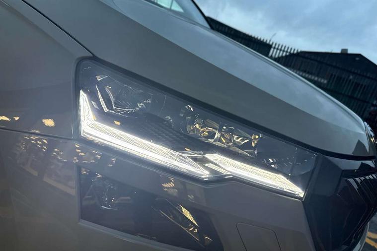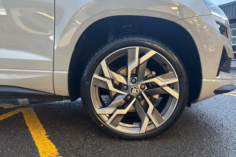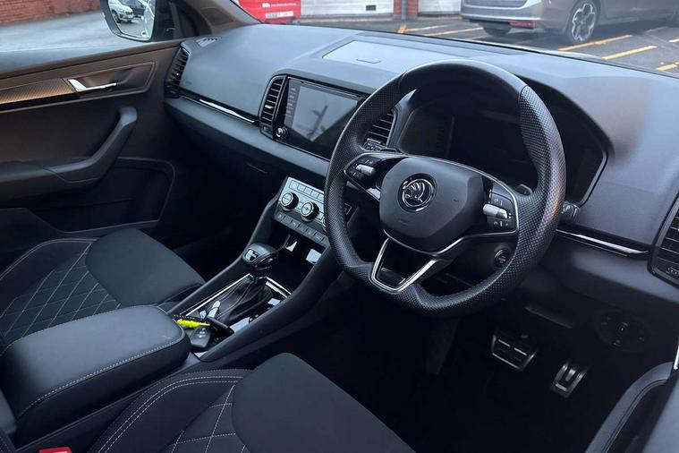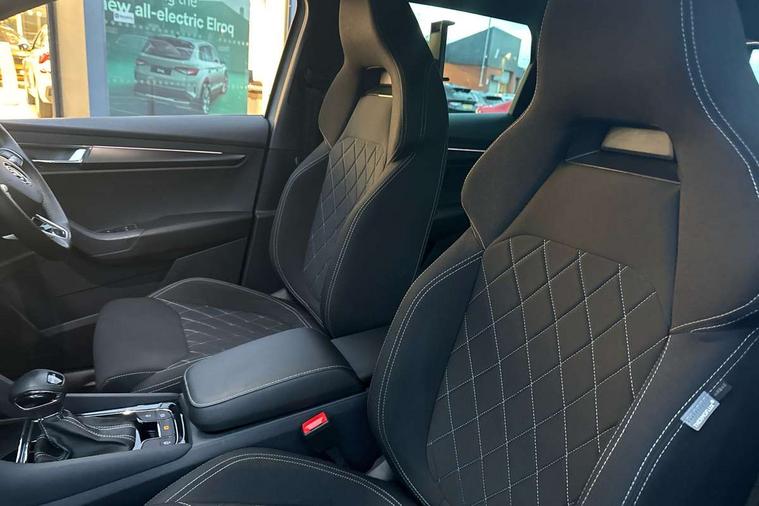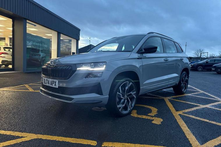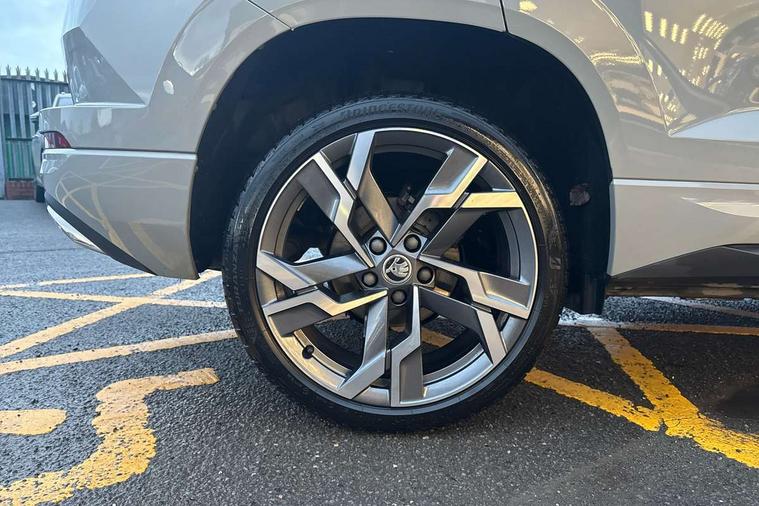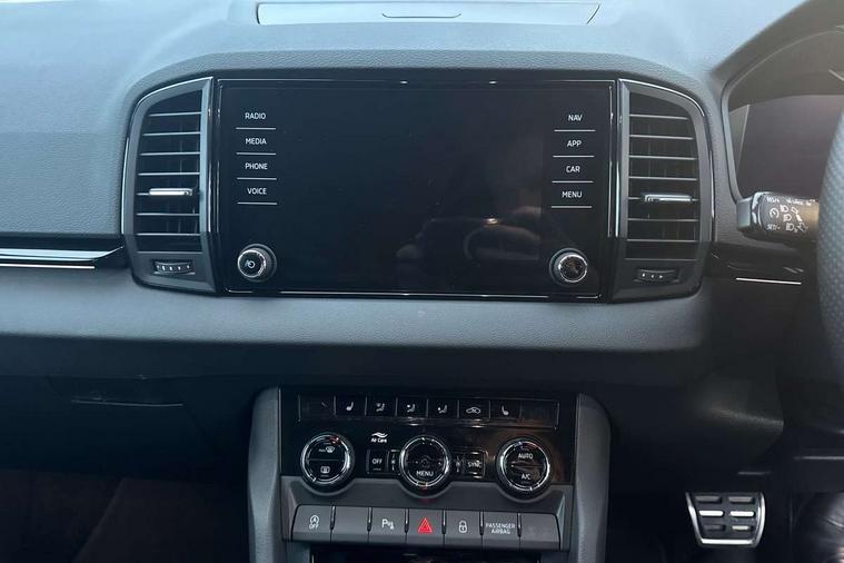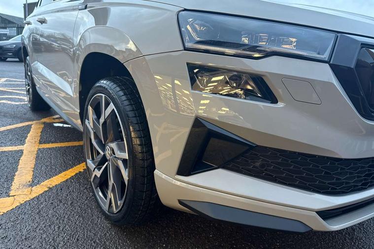 8" Digital display, Advanced driver attention and drowsiness monitor, Emergency services call system, Outside temperature gauge, Sensor for driver assistance systems, Service interval indicator, SmartLink wireless for Apple and wired for Android, Start/stop system with regenerative braking, USB C Port x 2 in front centre console, Virtual Cockpit - 10.25" digital display, Virtual pedal with electrically operated boot door, Wireless smartphone charging, DAB radio with Bluetooth, USB connection, Acoustic glass, Aero front windscreen wipers with intermittent function, Auto dimming rear view mirror with light and rain sensors, Black door mirrors, Black electric window control buttons, Black radiator grille, Black roof rails, Body colour door handles, Electric front and rear windows with child proof lock, Front door steps with SportLine logo, Heated rear windscreen, LED daytime running lights, LED rear lights with high functionality welcome effect and dynamic indicators, Light assistant (coming/leaving home/tunnel light), Panoramic sliding sunroof, Plastic scuff plates in door apertures, Privacy glass, Protective door side sills in body colour, Rear diffuser, Rear side wing doors, Rear spoiler, Rear window wiper with washer system and intermittent control, Safety reflectors on front doors, Skoda lettering on tailgate in black, Sportline badge on front fender, Sportline decorative inserts with badging, Sports front and rear bumpers, Third brake light, 1.5 litre bottle holders in driver and front passenger door panels, 12V socket in boot, 12v socket in front centre armrest with storage compartment and rear air vents, 2 x Tablet holder, 3 rear height adjustable headrests, 3 seat bench in 2nd row, 3 spoke sports leather heated multifunction steering wheel with DSG paddles, 4 foldable roof handles with rear coat hooks, Black floor carpet, Black roof headlining, Chrome inner door handles, Foldable hooks in the boot, Front head restraints, Height adjustable front three point seats belts with tensioners, Height/reach adjust steering wheel, Ice scraper, Illuminated glovebox, Illuminated luggage compartment, Isofix child seat preparation for front passenger seat, Isofix child seat preparation outer rear, Manual lumbar support for front seats, Pen holder, Pollen filter, Rear boot cover, Rear reading lights, Rear seats fixed folding and divided 60:40, Rubbish bin door, Safety vest holder, Single front passenger seat, Storage box in upper central dashboard closed, Sunvisors with illuminated vanity mirrors, Textile floor mats, Ticket holder, Titan black interior ceiling, Umbrella under passenger seat, Under passenger seat storage compartment, LED Interior lighting pack with Skoda welcome logo - Karoq, Light Pack - Karoq, Non Smokers pack, Automatic door unlocking in case of crash, Automatic fuel cut off in case of crash, Driver airbag, Electronic parking brake with auto hold function, Emergency rear braking signal, ESC (incl. ABS+MSR+ASR+EDS+HBA+DSR+RBS+MKB), Front side airbags, Head airbags, Hill hold control, Knee airbags, Passenger airbag with switch-off function, Pedestrian monitor, Seatbelt reminder signalisation and pretensioner for all seats, Three point seatbelts rear, Two tone horn, Tyre pressure monitor, Alarm with interior monitoring, back up horn and tilt sensor with safe function, Electronic engine immobiliser, Keyless entry and start/stop, Remote central locking with 2 remote folding keys, Black air vent surround, Black centre console, carbon door decor, Satin black dashboard, Satin black door trim, 19" Sagittarius anthracite alloy wheels, Anti-theft wheel bolts protection, Breakdown and tool kit,