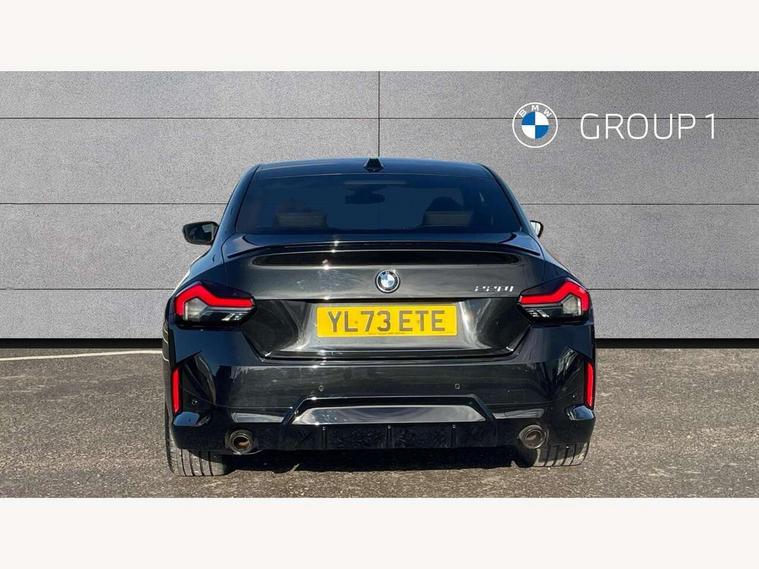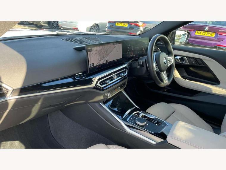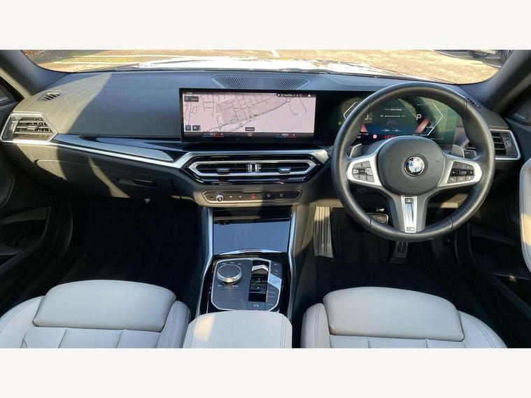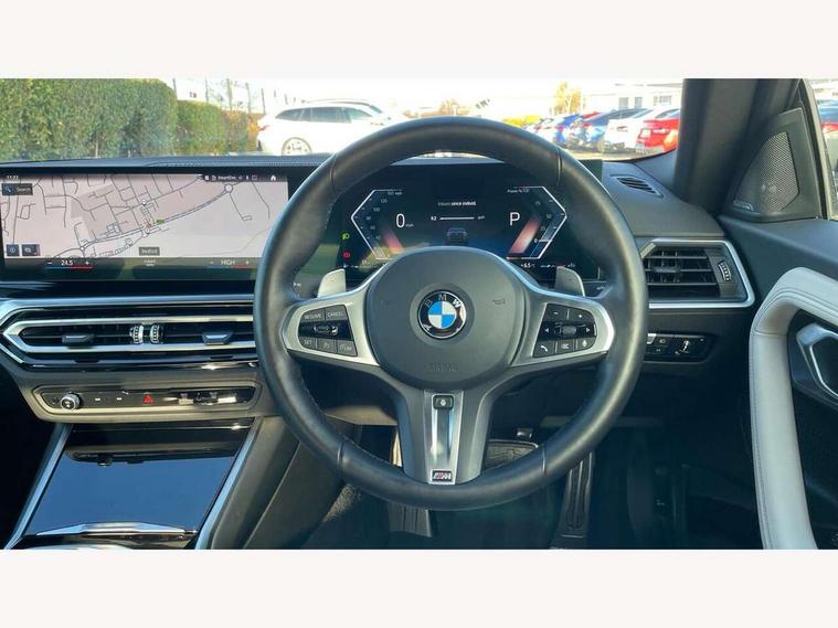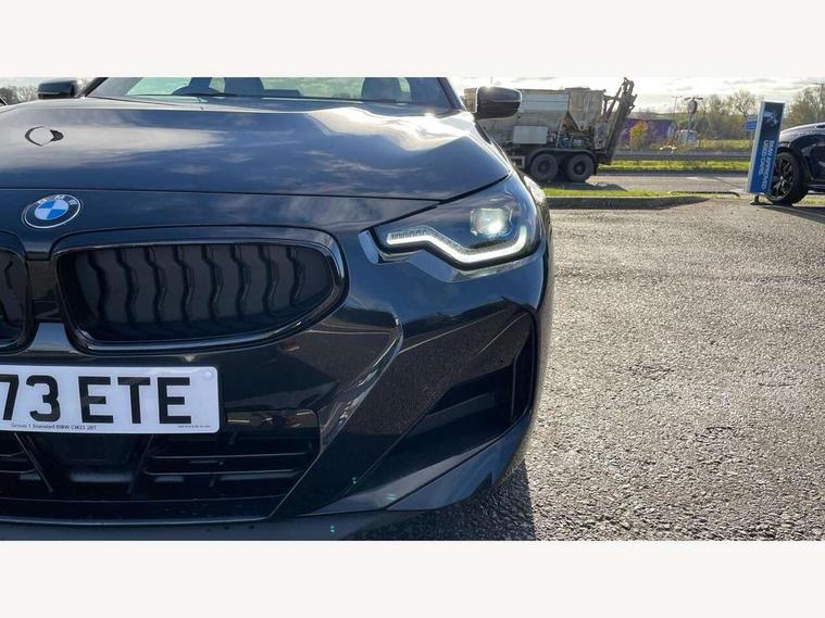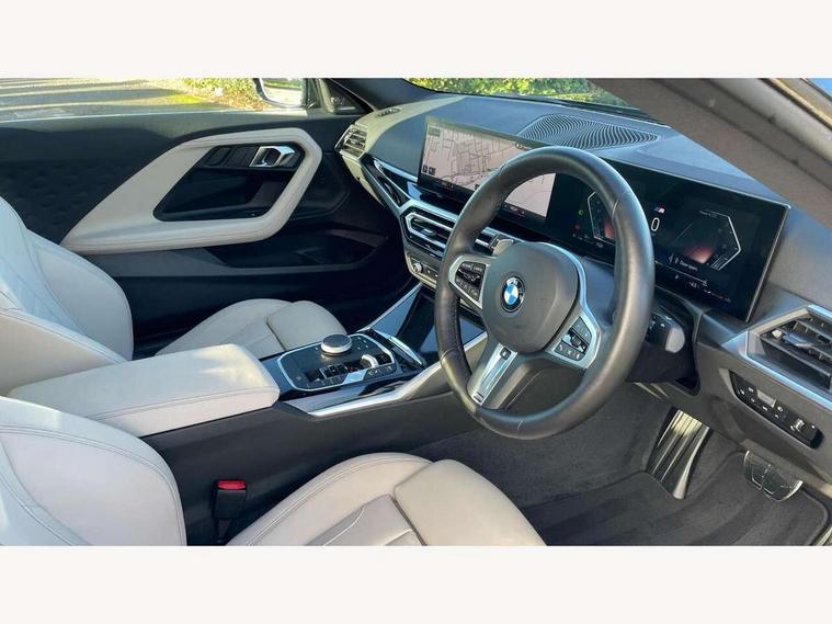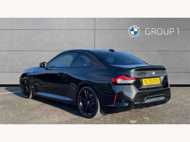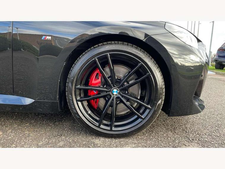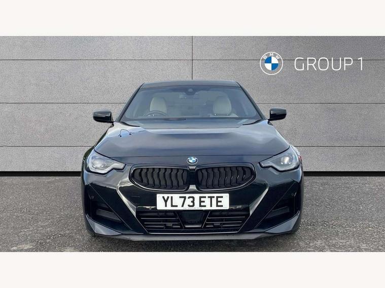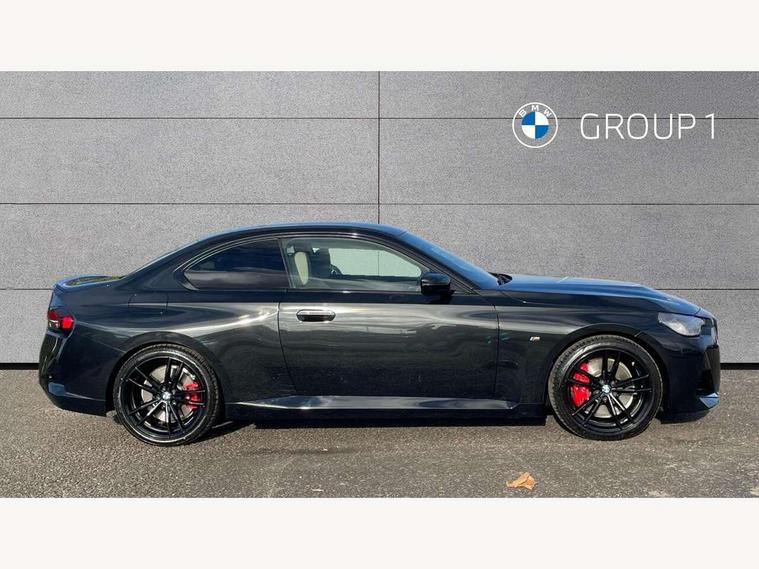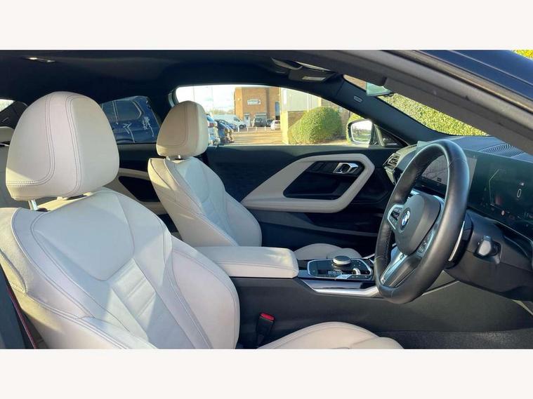 2 USB connections for charging and transferring data, 4G LTE connectivity with hard wired 4G network sim card, Attentiveness assist, Bluetooth with USB, BMW ConnectedDrive online services, BMW Intelligent Personal Assistant, BMW operating system 8 with variable, configurable widgets display information in real time, BMW Teleservices, Check Control warning system for monitoring of lights and door/luggage compartment open warning, Direct selection buttons, Drive off assistant, Eco pro mode, Electric power steering, Front and rear parking sensors, Front/rear Parking distance control, iDrive controller with turn and press function, Integrated owners handbook, Intelligent functions, Live cockpit plus with nav function 12.3" instrument cluster and 14.9" centre display, Oil sensor for level and grade, Optimum shift indicator, Personal Profile, Touch operation on control display, Variable sport steering, Widescreen multi-media display, WiFi interface for wireless connection of mobile terminal devices, Aluminium lightweight construction, Balancer shaft, BMW TwinPower Turbo four-cylinder petrol engine, Double VANOS, Drive performance control with ECO PRO comfort + sport mode, Electronic differential lock, High precision injection, M sport suspension, Petrol Particulate Filter, Sport automatic steptronic transmission with gearshift paddles, manual gearshift time display, launch control, coasting idle ECO PRO/COMFORT modes, Twin scroll turbocharger with Valvetronic, DAB tuner, Acoustic windscreen wipers for reduced driving noise, Adaptive LED Headlights, Automatic windscreen wipers and automatic headlight, Automatically dimming rear view mirror, Body colour door handles flush with door surface, Body colour door mirrors, Body colour front and rear bumpers, Daytime running lights, Electric windows - front and rear, with open/close fingertip control and trap release, Exhaust tailpipes x2 - 90mm in left and right, Fading support, Front and rear bumper system with replaceable deformation elements, Front door sill finishers in black plastic with BMW designation, Front windscreen wipers with integrated washer jets, Green tinted heat protection glazing, High beam assistant, High gloss black sill, bumper trim sides and diffuser insert, High gloss shadowline exterior trim in mirror triangle cover, mirror cover panel, mirror bezel and window border, High level third brake light, Indicators integrated int mirror housing, LED registration plate light, LED technology rear tail lights, brake lights and turn indicators, Lightweight engineering, Model designation on right side of tailgate, One piece kidney grille with hight gloss chrome surround, Rear boot, Rear fog lights, Reversing light in rear light cluster, Shark fin antenna, Single part LED rear lights with smoked glass components, Trailer stabilisation logic, Visible VIN plate, 12V power socket in front centre console with blanking plug, 2 cupholders in front centre console, 2 zone automatic air conditioning, Ambient lighting, Compartment in front of cupholder, Conditioned based service, Driver seat backrest width adjustment, Front and rear side armrests integrated into door trim, Front armrest, Front door pockets, Front head restraints, Front sport seats, Heated front seats, Illuminated glove compartment with separate small compartment, M headliner Anthracite, M sport leather steering wheel, Manually adjustment steering wheel column, Rear seat backrest with manual 40:20:40 split folding, Rear seat centre foldable armrest with integrated cup holder, Single front passenger seat, Storage compartment between rear seats, Storage tray and compartment with cover in centre console, Sun visors with vanity mirrors and insert tab, Through loading system with 40/20/40 split folding 2 rear seat in 2nd row, Two folding rear seat headrests, Velour floor mats, Additional storage compartment pack without USB - 2 Series Coupe, Connected pack professional - 2 Series Coupe, Interior and exterior mirror pack - 2 Series Coupe, M Sport exterior styling aerodynamics pack - 2 Series Coupe, 2 tone horn, Anti lock braking system (ABS) with cornering brake control, Automatic Stability Control (ASC), BMW emergency call, Brake drying, Child seat ISOFIX attachment for the two outer rear seats, Crash sensor activating of airbags, Unlocking doors, hazard warning lights, interior light, safety battery terminal, Deactivation of fuel pump in the event of a crash, Driver and front passenger airbags, Driver and front passenger side airbags, integrated in the door side seat backrest bolsters for all seat variants, Dynamic brake control, Dynamic stability control + (DSC+), Dynamic Traction Control - DTC, Electrically operated hand brake including automatic hold function and automatic release when driving off, Front and rear disc brakes, Head airbags for all 4 outer seats, Manual deactivation of front passenger airbag, Seat belt security check for driver and front passenger, Seatbelt warning, Side impact protection, Three point seat belts on 4 seats including front belt stopper, pyrotechnic belt tensioners and belt force limiters, Tyre pressure sensor, Warning triangle and first aid kit, Alarm system (Thatcham 1) with remote control and electronic engine immobiliser, Central locking switch for all doors, fuel filler cap and luggage compartment, Deadlocking function system to all doors, Drive away locking system on all doors and luggage compartment, Locking wheel bolts, Start/Stop button (illuminated) in centre console with keyless engine start and Auto Start-Stop deactivation button, Two remote control key with integrated key - one button for open and close doors/fuel flap/tailgate and separate button for unlock luggage compartment, BMW mobility tyre sealing system, Electrically powered 12V compressor, Reduced rolling resistance tyres,