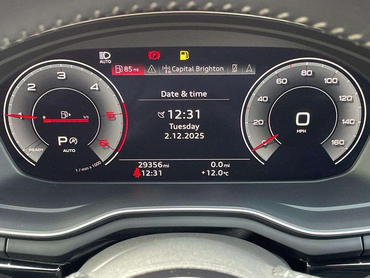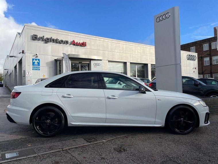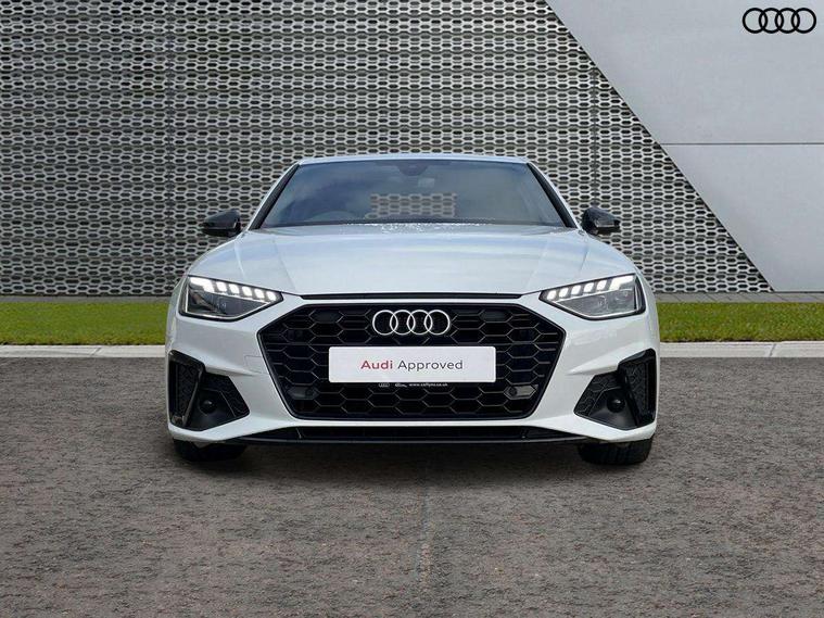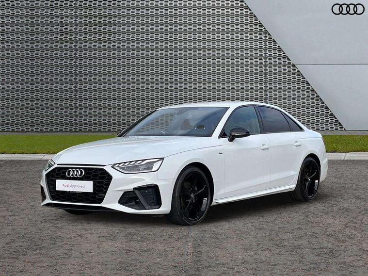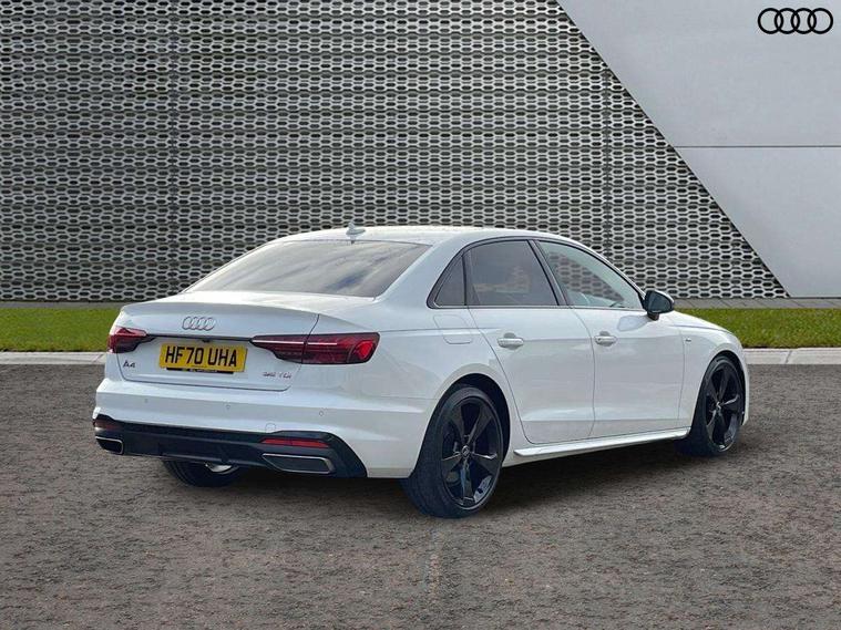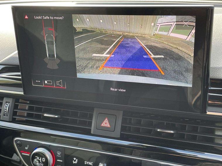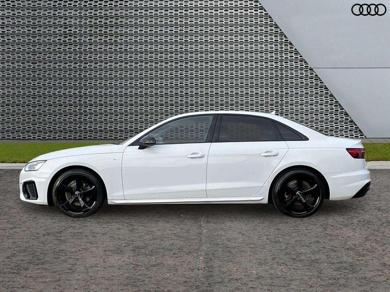 Piano black finish inlay, LED Interior light pack - A4/S4, Titanium black styling pack - A4 Saloon, 19" 5 arm rotor design alloy wheels titanium matt look, Tyre repair kit, Anti theft alarm, Anti theft wheel bolts, Keyless Go, 2 USB charging ports, 8 passive loudspeakers, DAB digital radio reception, 3 rear seatbelts, 6 airbags - Driver, front passenger, curtain and side windows, Electronic Stabilisation Control (ESC) including ABS, ASR and EDL, Hill hold assist, Multi collision brake assist, Pop-up bonnet for pedestrian protection, Pre sense city, Seatbelt monitoring, Warning triangle and first aid kit, Auto dimming rear view mirror, Body colour door handles, Body colour front spoiler lip, Body colour side sill trim, Electrically folding auto dimming/adjustable/heated door mirrors with LED side indicators and kerb view function for passenger side, Grained matt black side air inlets with matt aluminium silver inlay, High beam assistant, LED headlights with LED rear lights + dynamic rear indicators + headlight adjustment and high beam, turning light + LED daytime running lights, Matt aluminium silver tailpipe trim, Privacy glass, Rain and light sensors, S Line badges on the front wings, S line front and rear bumpers with side skirts, S Line rear diffuser in matt titanium black with trim strip in matt aluminium silver, Windscreen with acoustic glazing, 4 way electric lumbar support for driver and front passenger, 40/20/40 split folding 3 rear seat bench in 3 parts with rear centre armrest, Black cloth headlining, Black perforated leather gearknob, Contrast stitching on seats, steering wheel and gear lever gaiter, Deluxe 3 zone electronic climate control, Door sill trims with aluminium inlay, Front and rear head restraints, Front centre armrest, Heated front seats, Illuminated door sill trims with S logo, ISOFIX child seat mounting and top tether, Manual seat adjustment, Stainless steel pedals and foot rest, Tool kit, Audi connect safety and service (e-call), Audi drive select, Audi parking system plus with front and rear sensors, Audi smartphone interface, Audi virtual cockpit, Automatic start-stop system with coasting functionality and efficiency programme, Bluetooth interface, Electric boot lid release, Electromechanical power steering, MMI Navigation plus with MMI touch includes 10.1" high resolution colour MMI display, 3D map, Rear view camera, Voice control system, Sports suspension lowered by 23mm,