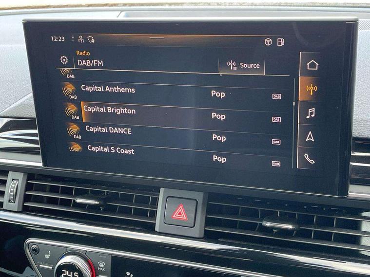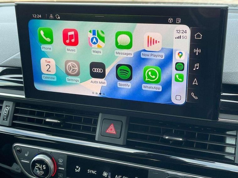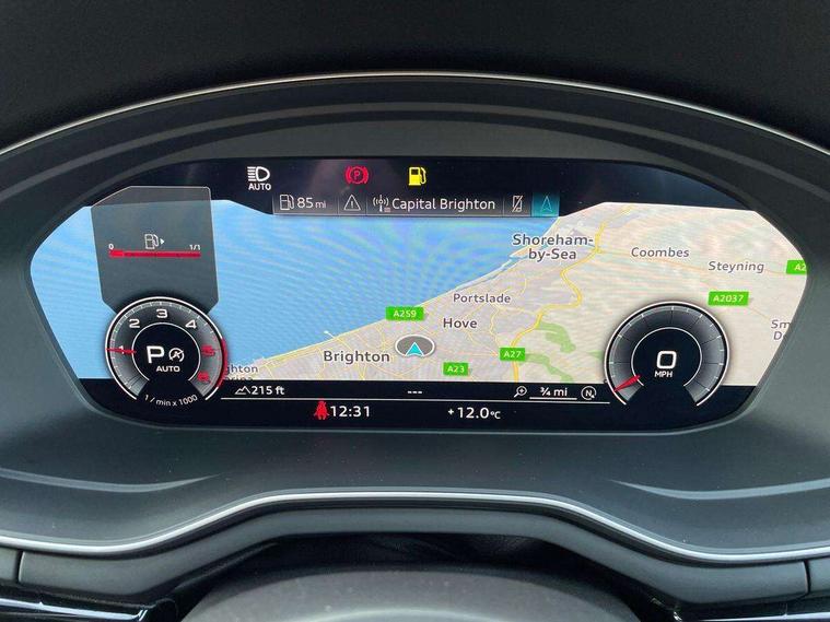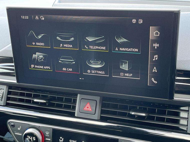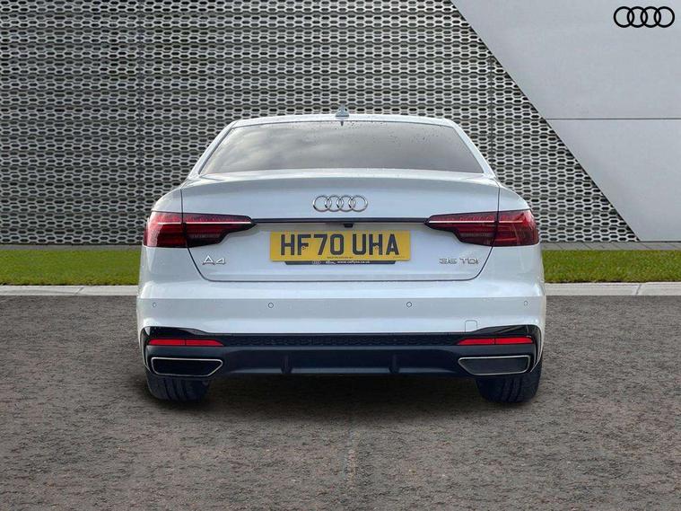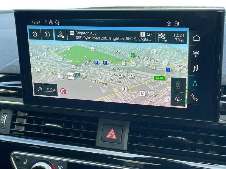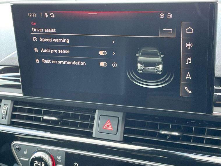Piano black finish inlay, LED Interior light pack - A4/S4, Titanium black styling pack - A4 Saloon, 19" 5 arm rotor design alloy wheels titanium matt look, Tyre repair kit, Anti theft alarm, Anti theft wheel bolts, Keyless Go, 2 USB charging ports, 8 passive loudspeakers, DAB digital radio reception, 3 rear seatbelts, 6 airbags - Driver, front passenger, curtain and side windows, Electronic Stabilisation Control (ESC) including ABS, ASR and EDL, Hill hold assist, Multi collision brake assist, Pop-up bonnet for pedestrian protection, Pre sense city, Seatbelt monitoring, Warning triangle and first aid kit, Auto dimming rear view mirror, Body colour door handles, Body colour front spoiler lip, Body colour side sill trim, Electrically folding auto dimming/adjustable/heated door mirrors with LED side indicators and kerb view function for passenger side, Grained matt black side air inlets with matt aluminium silver inlay, High beam assistant, LED headlights with LED rear lights + dynamic rear indicators + headlight adjustment and high beam, turning light + LED daytime running lights, Matt aluminium silver tailpipe trim, Privacy glass, Rain and light sensors, S Line badges on the front wings, S line front and rear bumpers with side skirts, S Line rear diffuser in matt titanium black with trim strip in matt aluminium silver, Windscreen with acoustic glazing, 4 way electric lumbar support for driver and front passenger, 40/20/40 split folding 3 rear seat bench in 3 parts with rear centre armrest, Black cloth headlining, Black perforated leather gearknob, Contrast stitching on seats, steering wheel and gear lever gaiter, Deluxe 3 zone electronic climate control, Door sill trims with aluminium inlay, Front and rear head restraints, Front centre armrest, Heated front seats, Illuminated door sill trims with S logo, ISOFIX child seat mounting and top tether, Manual seat adjustment, Stainless steel pedals and foot rest, Tool kit, Audi connect safety and service (e-call), Audi drive select, Audi parking system plus with front and rear sensors, Audi smartphone interface, Audi virtual cockpit, Automatic start-stop system with coasting functionality and efficiency programme, Bluetooth interface, Electric boot lid release, Electromechanical power steering, MMI Navigation plus with MMI touch includes 10.1" high resolution colour MMI display, 3D map, Rear view camera, Voice control system, Sports suspension lowered by 23mm,