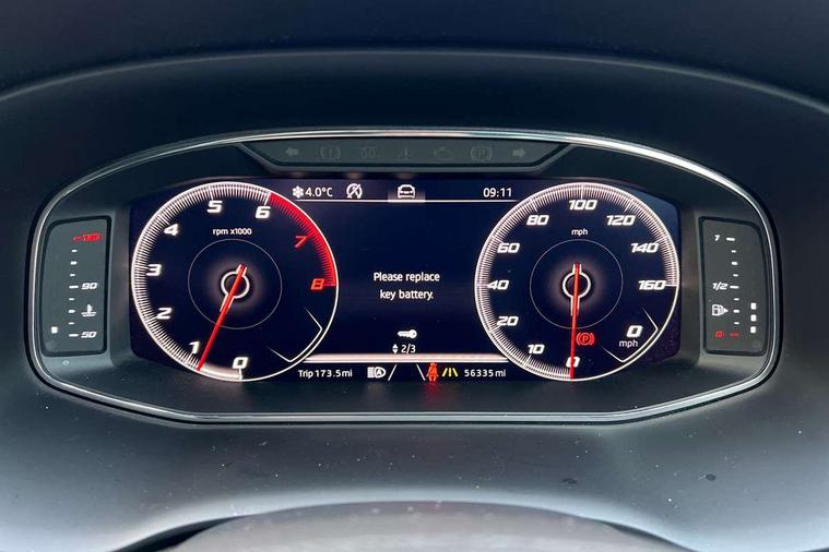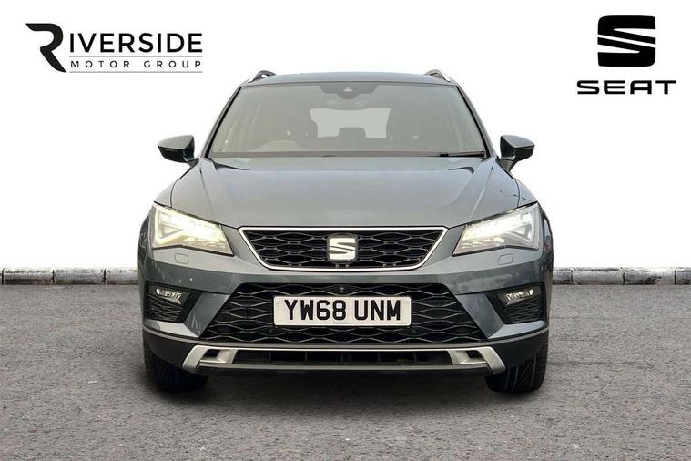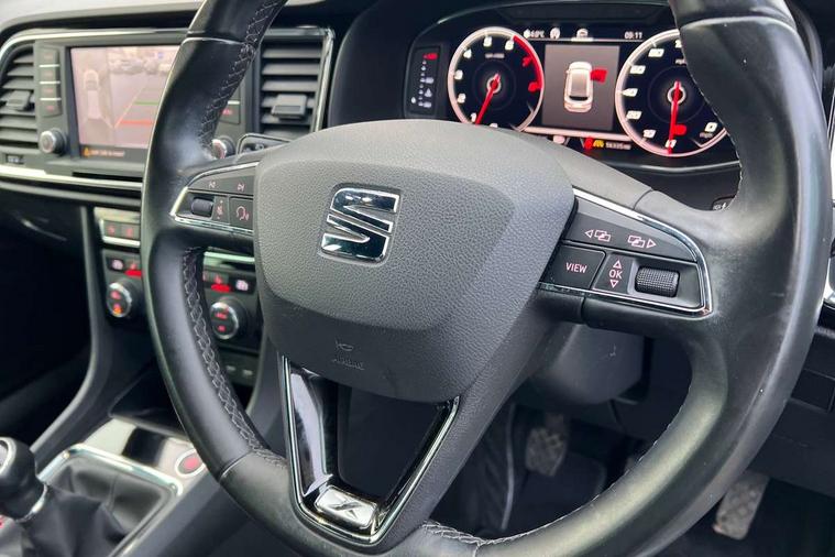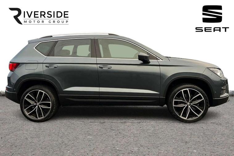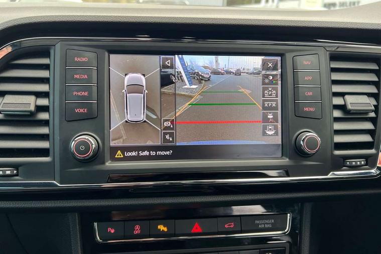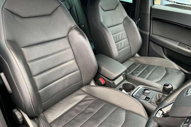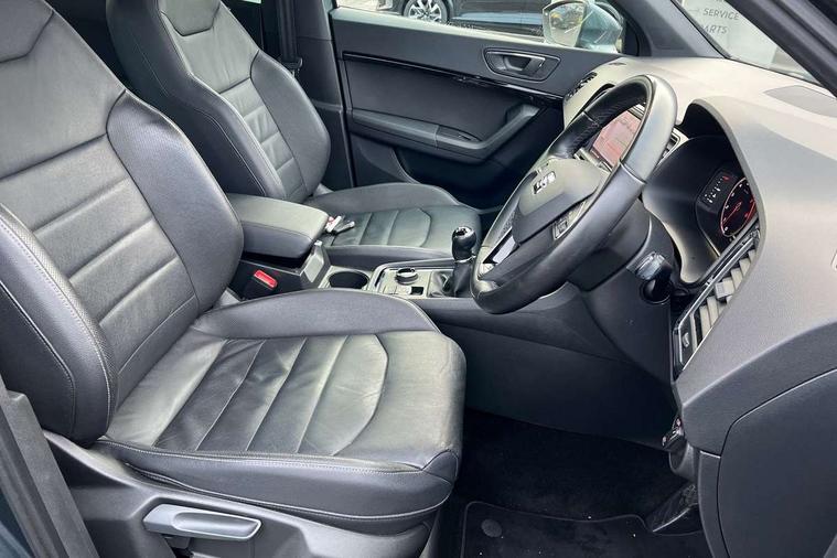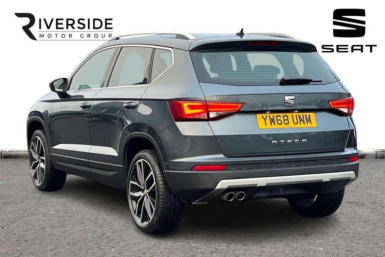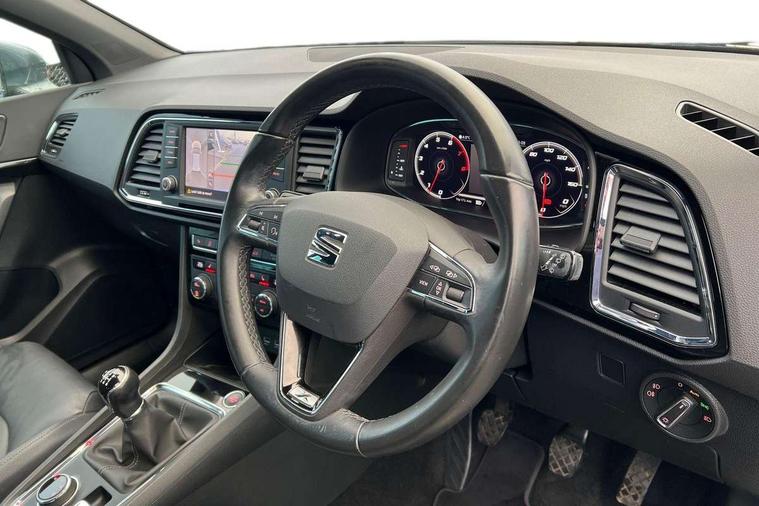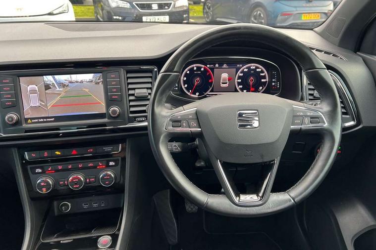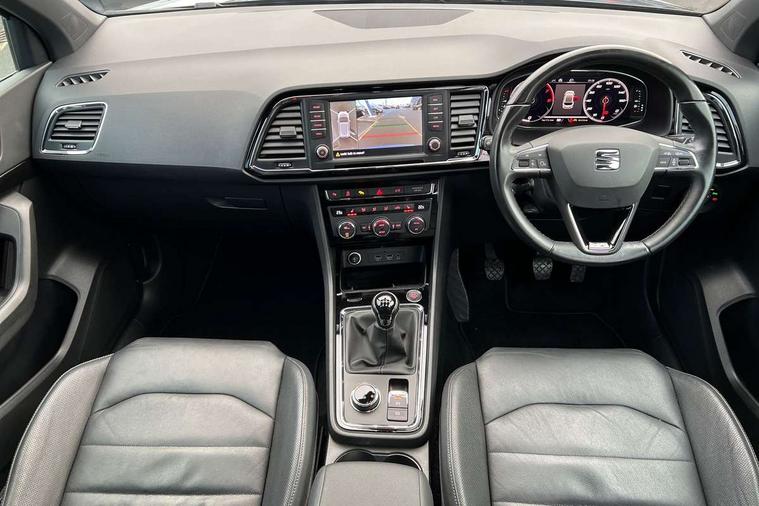 'Lights On' Reminder warning buzzer, 8.0" colour touchscreen with proximity sensor, Adaptive cruise control, Digital clock, Digital cockpit, Driver alert system, Electric tailgate with virtual pedal, Full Link Smartphone Integration with Mirror Link, Apple Car Play, Google Android Auto, Low fuel warning light, Multi function display, Outside temperature gauge, Park assist system with steering assist, Progressive power assisted steering, Rear view camera, Remote fuel flap release, RPM counter, Satellite navigation system, SEAT Drive profile, SEAT logo boot release, Self parking functionality (includes front and rear parking sensors), Top view camera, Trip computer, Wireless Smartphone charger, Comfort suspension, XDS electronic differential lock, SEAT USB media cable, Steering wheel mounted audio/phone controls, Aluminium front door sills, Auto dimming rear view mirror, Automatic headlights, Black wheel arch extensions, Body colour bumpers, Body colour door handles, Body colour door mirrors, Chrome roof rails, Chrome side window trim, Chromed centre radiator grille surround, Dark tinted rear windows, Door mirrors with welcome CUPRA light silhouette, Electric folding door mirrors, Electrically adjustable and heated door mirrors, Front and rear electric windows, Full LED headlights, Heated windscreen, Hidden exhaust pipe, High gloss black grille, LED daytime running lights, LED front fog lights with static cornering light function, LED Headlights, LED tail lights, Rear fog lights, Rear wash/wipe, Twin chromed exhaust pipes, Welcome lighting, 12V power point front, 3 height adjustable rear headrests, 4 Lashing eyes in boot, 60/40 split folding rear seat, Active head restraints, Adjustable front armrest with storage compartment, Advanced multicolour ambient light with LED interior light and LED illuminated glovebox, Black roof lining, Driver sunvisor with covered mirror + card holder, Driver/passenger lumbar adjustment, Driver/passenger sunvisors with illuminated vanity mirrors, Dual zone climate control, Footwell illumination, Front courtesy lights, Front cupholders, Front reading lights, Front seat back storage pockets, Gear shift indicator, Height adjustable driver's seat, Height adjustable front headrests, Height adjustable passenger seat, Illuminated boot, Illuminated door sills, Instrument lighting with brightness control, Isofix child seat preparation, Leather steering wheel and gear knob, Leather upholstery, Rear armrest, Rear central air outlet, Rear reading lights, Sports seats, Storage box under drivers seat, Advanced Driving Assistance Pack - Ateca Xcellence, Convenience pack - Ateca, Navigation system pack - Ateca, Winter Pack - Ateca, 3x3 point rear seatbelts, ABS, Auto hold function, Automatic post collision braking, Driver/Front Passenger airbags, Drivers knee airbag, Electronic parking brake, Electronic stability control, ESP+EBA, Front and rear seatbelt reminder, Front assist including city emergency braking, Front passenger airbag deactivation, Front side airbags, Hill hold control, Predictive pedestrian protection, Tiredness recognition system, Traction control, Twin curtain airbags, Tyre pressure monitoring system, 2 folding remote keys with window open/close function, Immobiliser, Keyless entry and start, Locking wheel bolts, Remote central locking, Volumetric alarm with back up horn, Chrome effect dashboard facia, 19" Exclusive machined bi-colour alloy wheels,