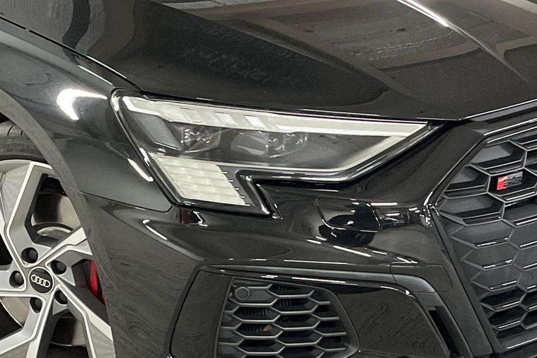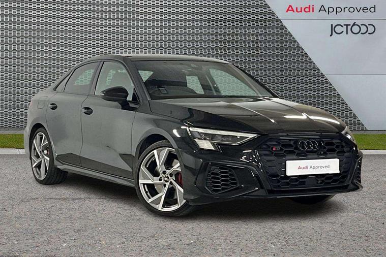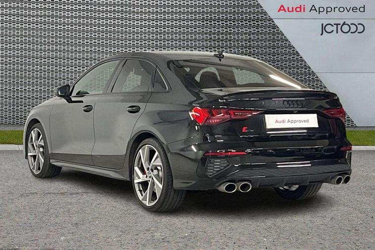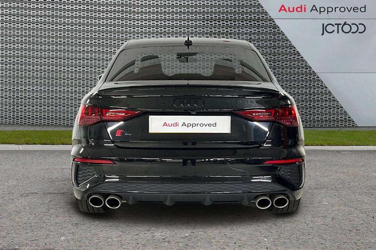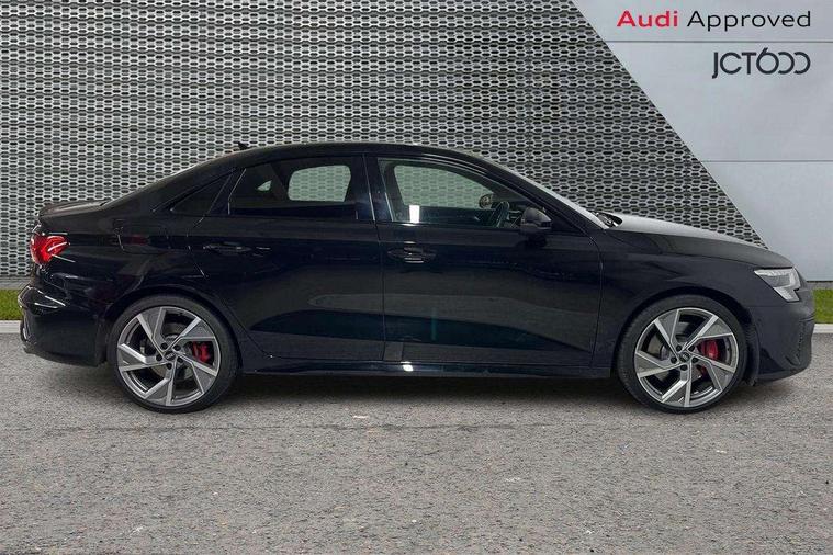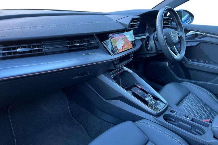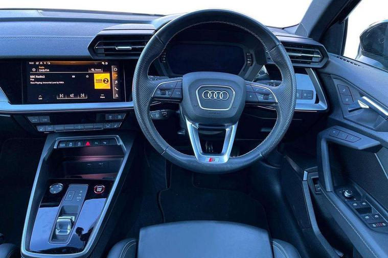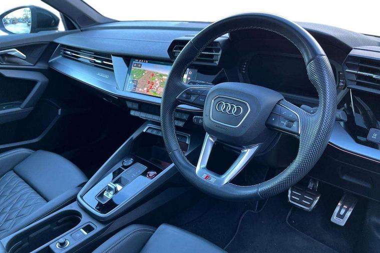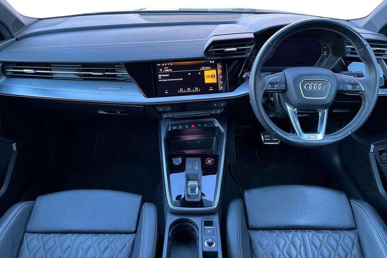 Audi drive select (Auto, Comfort, Dynamic, Efficiency and Individual), Audi smartphone interface, Audi Virtual Cockpit - 10.25" digital and colour instrument cluster, Automatic start/stop system with recuperation, Bluetooth interface, Camera based traffic sign recognition, Collision avoidance assistant, e-Call (emergency call), Lane departure warning system, MMI Navigation Plus with high resolution 10.1" colour touch screen display, Progressive steering, Service indicator, Trip computer, Voice control system with natural language interaction, Quattro permanent all wheel drive, S sport suspension with spring damper adjustment and lowering by 15mm, 2xUSB-C connection with data and charging functions, CD player, DAB Digital radio, 3rd brake light, Acoustic glass windscreen, Audi Beam uses LEDs to project the Audi logo onto the ground as you exit your S3, Auto dimming frameless rear view mirror, Dual branch oval twin tailpipes in chrome plated finish, Electrically adjustable/heated/folding/auto dimming door mirrors with integrated LED indications + kerb view function for passenger side, Front electric windows, Headlight washers, Illuminated door sills with aluminium inserts at the front with S logo, LED daytime running lights, LED headlights with LED rear lights and dynamic rear indicators, Light and rain sensors, Model and engine designation badges at rear, Privacy glass - dark tinted rear window, rear door and side windows, Rear boot, Rear electric windows, Rear side wing doors, 12V socket and storage compartment in front centre console, 3 seat bench in 2nd row, 3 spoke flat bottomed leather multifunction sport steering wheel with gear shift paddles, 4 way electrically adjustable lumbar support for driver and front passenger, 60/40 split folding rear seat bench, Black cloth headlining, Dual zone electronic climate control, Fine Nappa leather upholstery with front sports seats S embossed logo, Front and rear centre armrest in artificial leather, Front and rear headrests, Front/rear floor mats, Height and reach adjustable steering wheel, Interior lighting - glove compartment light and right hand side, Luggage compartment floor covering, Manual boot compartment lid, Manually adjustable front seats, Single front passenger seat, Stainless steel pedals and front footrest in black, Aluminium interior elements pack - A3, Black styling pack - A3 Saloon/S3, Body styling design pack - S3, Extended ambient lighting pack - A3/S3 Saloon, Storage pack - A3/S3 Saloon, Technology pack with parking assist - A3 Saloon, 3x3 point rear seat belts, Driver and front passenger airbag with passenger airbag deactivation, Electronic Stabilisation Control (ESC) including ABS, ASR and EDL, First aid kit with warning triangle and 2 safety vests, Front side airbags with head airbags and interaction airbag, Pre-sense front with pedestrian and cyclist detection, Seatbelt monitoring, Tyre pressure loss indicator, Anti theft alarm, Anti-theft wheel bolts, Electronically operated child locks, Immobiliser, Remote control central locking, Aluminium air vent surrounds, Dark spectrum aluminium inlays, accent surfaces in the dashboard and centre console in platinum grey silk effect paint finish,