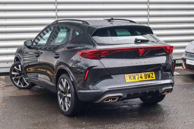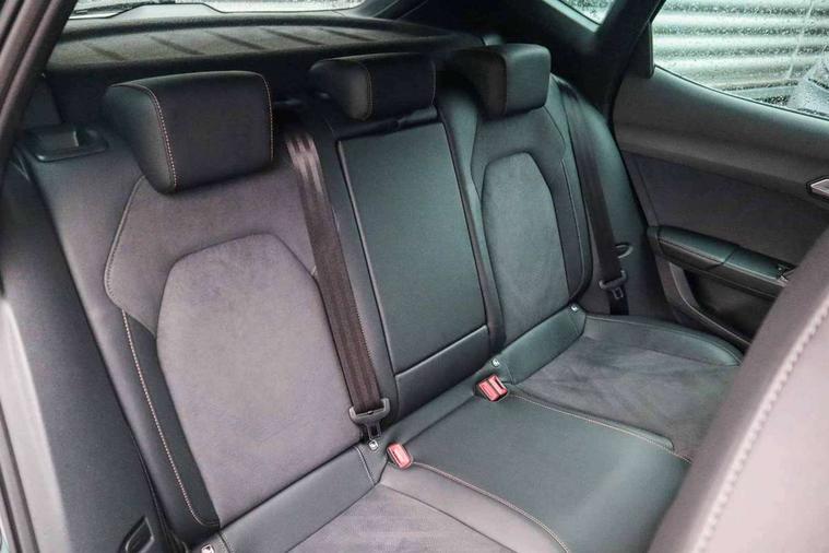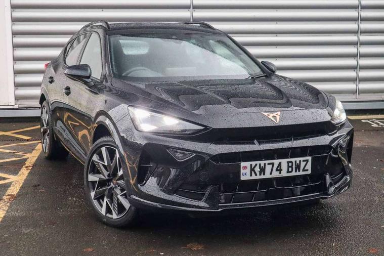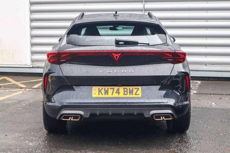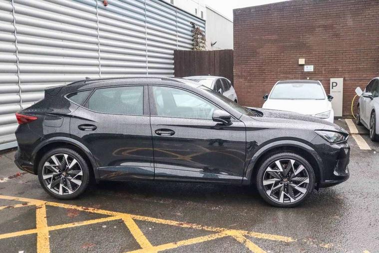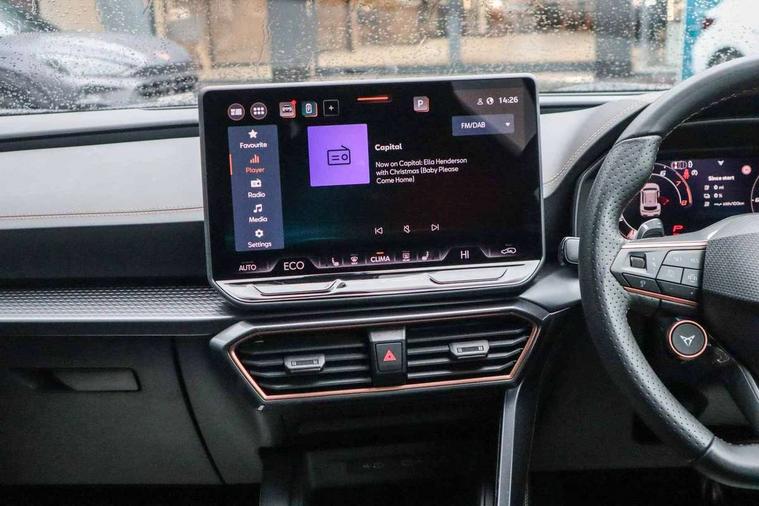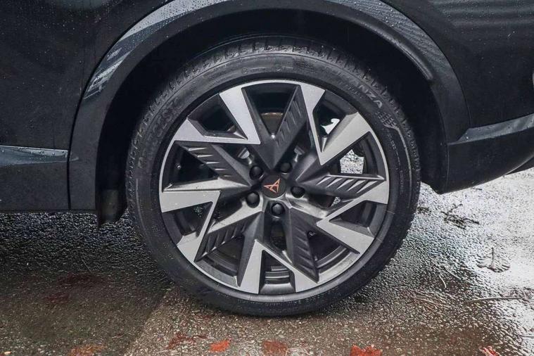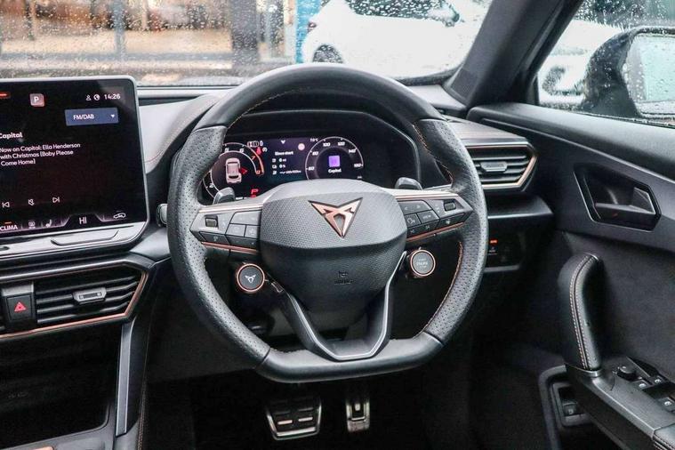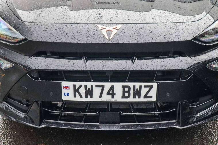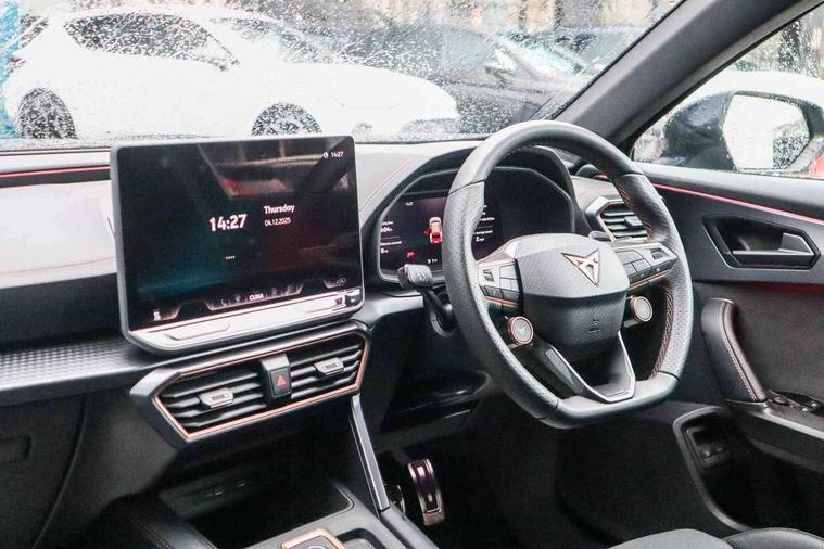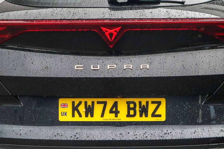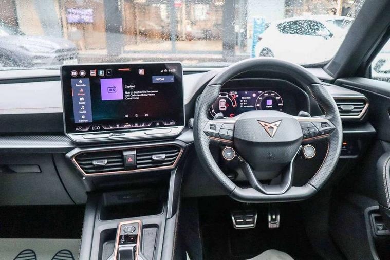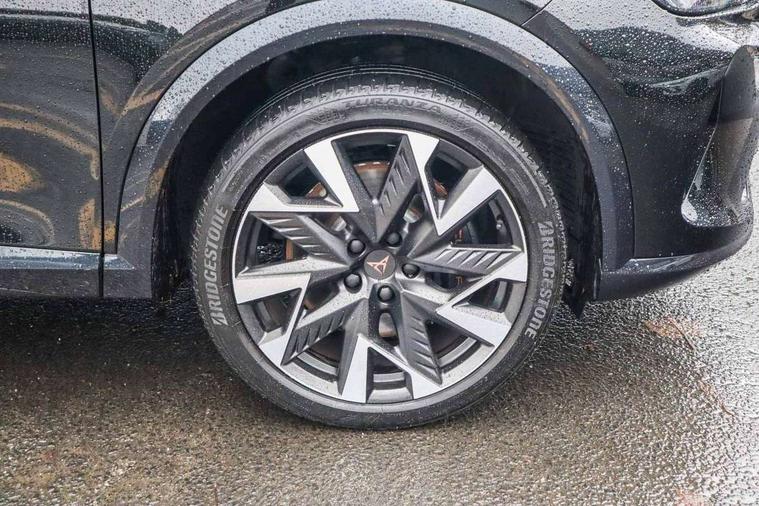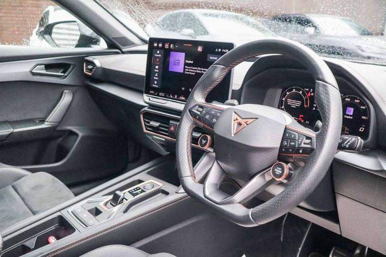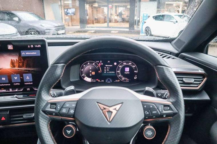10.25" digital cockpit and configurable dashboard, Adaptive cruise control with follow-to-stop and speed limiter, Advanced driver alert system, Dynamic chassis control with driving profile selection (Comfort, Sport, CUPRA, Individual), Dynamic road sign display, Emergency steering support with turn assist, Forward collision warning with automatic braking, Front and rear parking sensors, Full link phone integration, Lane assist, Rear view camera, RPM, trip computer, outside temp gauge, instrument light brightness, low fuel warning light, lights on reminder, gearshift indicator, Service interval indicator, Speed sensitive power steering, Start/stop system with regenerative braking, Virtual pedal and electric tailgate, Voice control system, Wired Android Auto, Wireless apple carplay, Wireless phone charger, 10 amp mode 2 charging cable, 32 amp mode 3 charging cable, Adaptive chassis control with continuous operation, CUPRA sport suspension, Electronic locking differential and dynamic traction support, 2 front and 2 rear USB type C sockets, Media system with navigation, 12.9" touchscreen display, voice control, DAB, steering wheel mounted controls, Auto dimming rear view mirror, Body colour door handles, Body coloured bumpers, Dark grey wing mirror, Daytime running light with automatic headlight control and coming home feature, Door panel ambient lighting, Dynamic headlight range control, Electric front/rear windows, Electrically adjustable heated and folding door mirrors with memory function, Gloss black roof rails and window surrounds, High beam assist, LED 3rd brake light, LED front fog lamps with cornering function, LED Taillights with dynamic indicator, Matrix LED headlights with multifunction camera, Rain sensing wipers, Rear diffuser with copper simulated exhaust pipes, Rear fog lights, Rear side wing doors, Rear wash/wipe, Tinted rear windows, Welcome lights (within exterior mirror housing), 12V socket, 2 front and 2 rear reading lights, 3 seat bench in 2nd row, 60/40 split rear bench seat with armrest and mechanical seat release, Black headlining, Black interior roof lining, Cupra sports pedals, Dust/pollen filter, Electrically adjustable front seats with lumbar support and memory function, Front and rear head restraints, Front centre armrest, Heated front seats, Heated supersports multifunction leather steering wheel with satellite buttons and gear shift paddles, Height/reach adjust steering wheel, Illuminated aluminium doorsteps, Illuminated interior front door sills, Illuminated sunvisor with mirror, Isofix, Leather dashboard, door insert and side trim panel, LED smart wraparound lighting, PVC/Dinamica microfiber upholstery + bucket seats, Satellite steering wheel, Single front passenger seat, Storage pockets on rear of front seats, Three zone climate control with control panel in rear, 3 point seatbelts on all rear seats, ABS, Brake control system - ESC and brake booster, Child proof door locks, Driver and front passenger airbags with front passenger airbag de-activation, Electronic parking brake, Front and rear disc brakes, Front side curtain airbags, Hill hold control, Public e-call, Seat belt reminder for front and rear seats, Tyre pressure monitoring system, Anti theft alarm system, KESSY Advanced - Keyless start, keyless entry with SAFELOCK, Locking wheel bolts, Copper and aluminium interior detailing, 19" Sandstorm machined sport black and silver alloy wheels, Breakdown and tool kit,