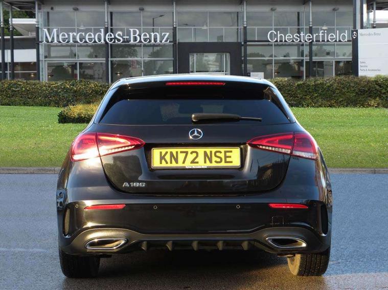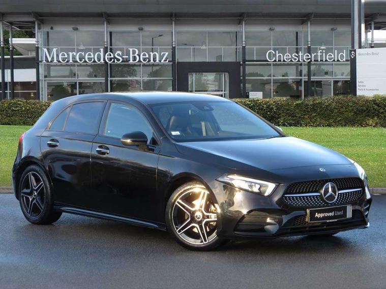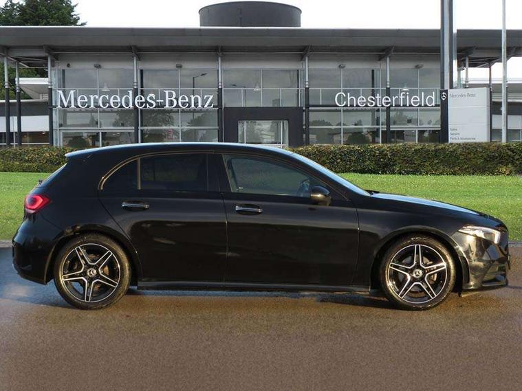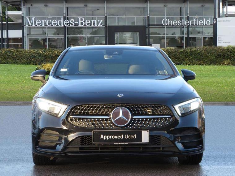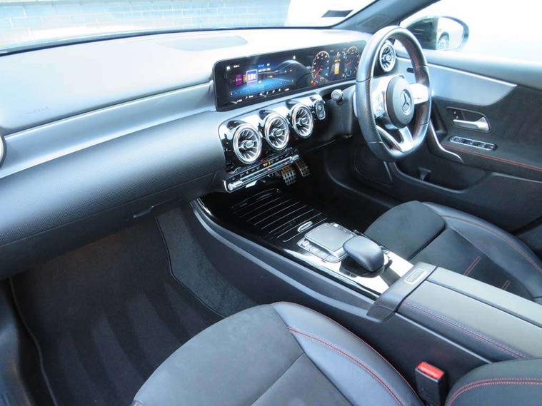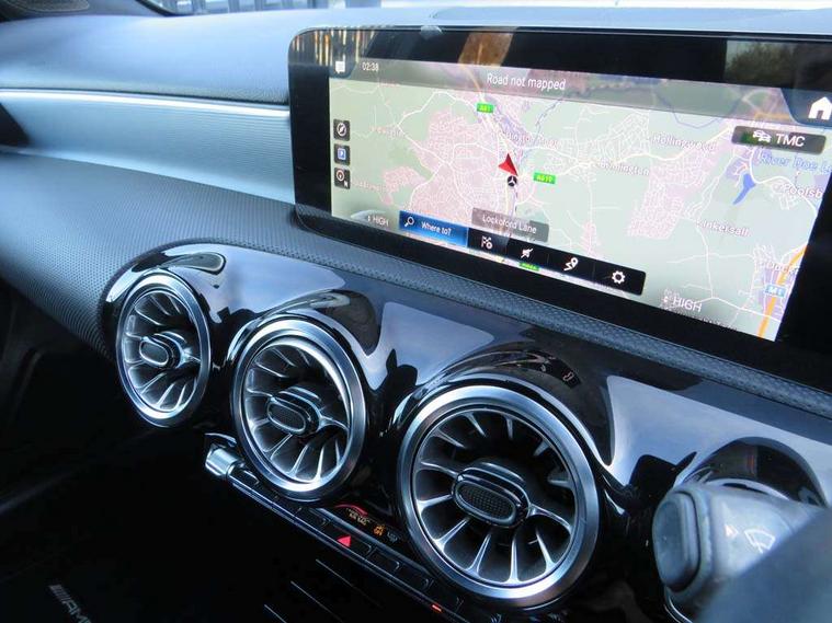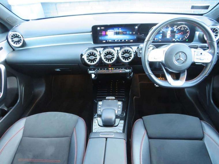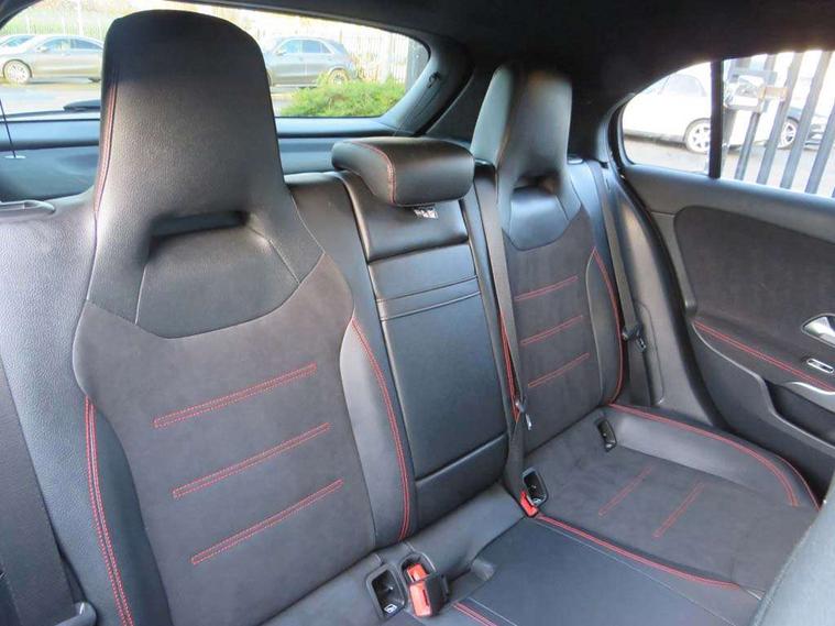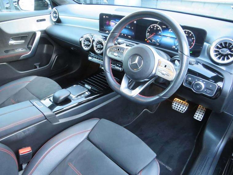 10.25" Digital instrument cluster display screen, 10.25" media display, 180 degree rear view camera with parking guidelines, Active parking assist with visual and audible warning of detected obstacles, Attention assist, Brake pad wear indicator warning light, Car wash mode, Cruise control + speed limiter, Direct steering, Dual bluetooth interfaces, DYNAMIC SELECT with a choice of driving modes (ECO, Comfort, Sport and Individual), ECO start/stop function, Fluid level warning indicator for fuel, oil, coolant and washer fluid, Hard-disk navigation, Hey Mercedes Voice activation, Lamp failure indicator, Lane keeping system, Mercedes me connect including emergency call system, accident recovery, breakdown and maintenance management, Mercedes me remote services, Outside temperature gauge, Owners manual in English, Pre-installation for private car sharing, Preinstallation for Mercedes Benz link, Service indicator (ASSYST), Smartphone integration with Apple CarPlay and Android auto, Speed limit assist, Speed sensitive power steering, Trip computer, Ultrasonic sensors positioned in the front and rear bumpers, Lowered comfort suspension, Rear axle torsion beam, 2 USB ports (type C) in rear stowage compartment and one in front of center console, 6 speakers, DAB Digital radio, MBUX multimedia system with DAB digital radio and touchpad including satellite navigation, Mercedes-Benz sound system - 100W, 4 Electric Front and Rear windows, Adaptive brake lights, AMG bodystyling - Front apron with splitter in chrome, rear apron with chrome trim and chrome visible trim elements in tailpipe, Automatic headlights, Black weather strip, Body colour bumpers, Body colour door handles with chrome inserts, Body colour side skirt, Electric adjustable and heated door mirrors with integrated LED side indicators, Exclusive diamond radiator grille, Exhaust system - Twin visible tailpipes in polished stainless steel, Headlamp assist automatic headlamp activation, Heated glass rear windscreen + timer control, LED High level third brake light, LED high performance headlamps with integrated LED daytime running lights, LED tail lamp, Privacy glass, Radio aerial, Rain sensing windscreen wipers with two sensitivity settings, Rear fog lights, Rear side wing doors, Rear wiper, 3 seat bench in 2nd row, 3 Spoke flat bottom leather multi function steering wheel with perforated leather in grip area, 40:20:40 split folding rear seats, Artico man-made leather/Microfibre Dinamica upholstery with red contrast stitching, Auto Mercedes-Benz child seat recognition sensor, Black air vents with surround in silver chrome, Black roof lining, Brushed stainless steel sports pedals with rubber studs, Controller on centre console with chrome surround, Floor mats with AMG lettering, Front centre armrest with storage compartment, Front seat backs luggage nets, Galvanished gear shift paddles on steering wheel, Heated front seats, Height/reach adjustable steering column, Illuminated Mercedes Benz lettering front door sills with changeable cover, Interior lighting - 64 colour Ambient lighting, Interior mirror with reading lamps in black and frameless, Manual height adjustable front seats, Rear armrest with 2 cupholders, Rear head restraints, Seat occupancy sensor for front passenger seat, Single front passenger seat, Sports seats with integrated headrests, Stowage compartment in centre console with retractable cover, Sunvisors with illuminated vanity mirrors, Touchpad on center console, Twin front cupholders, Two zone thermotronic luxury automatic climate control, Light and sight pack - A Class, Mirror package - A Class, Night pack - A Class Saloon/Hatchback, Seat comfort pack - A Class, 3 rear 3 point seatbelts, ABS with Brake Assist, Active bonnet, Active brake assist includes forward collision warning system with autonomous braking, Adaptive brake assist with hold function and hill start assist, Black seatbelts, Childproof locks manually operated for rear doors and electrically operated for rear power windows, Crash responsive emergency lighting, Driver and passenger head and side airbags, Drivers knee airbag, Dual stage driver/passenger airbags, Electronic parking brake, ESP curve dynamic assist, ESP with ASR, Front and rear seatbelt reminder, Front brake callipers with Mercedes Benz lettering, ISOFIX and top tether child seat fixing points in two outer rear seats, Tyre pressure monitoring system, Warning triangle and first aid kit, Window airbags, Alarm system/interior protection/immobiliser, Keyless entry lock/unlock, Keyless Go, Remote central locking and crash sensor with emergency opening function, Urban guard vehicle protection system with immobiliser and interior protection, Matrix look light longitudinal grain aluminium trim element, 18" AMG 5 twin spoke light alloy wheels aerodynamically optimised painted in black with highsheen finish, Summer tyres, Tirefit sealant kit,