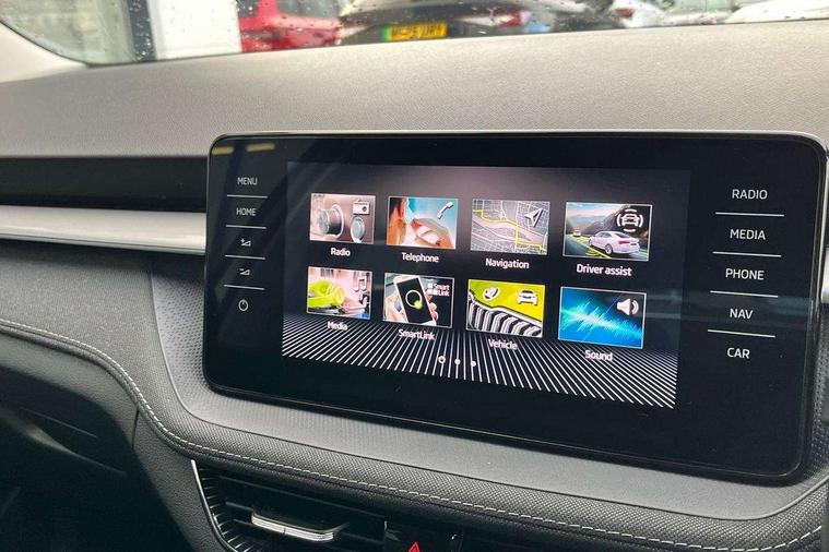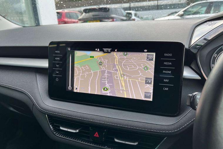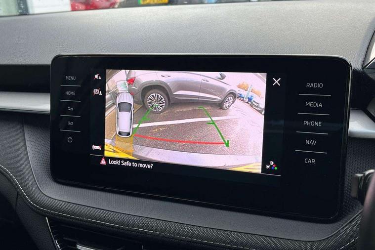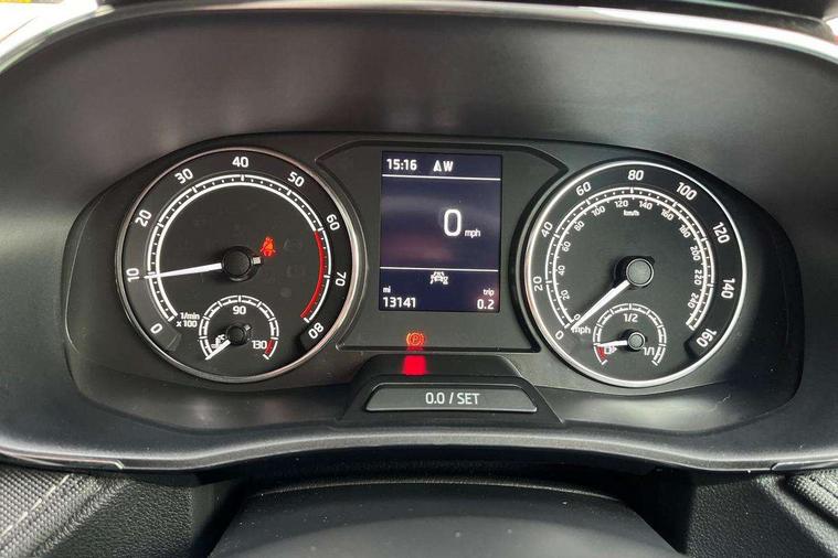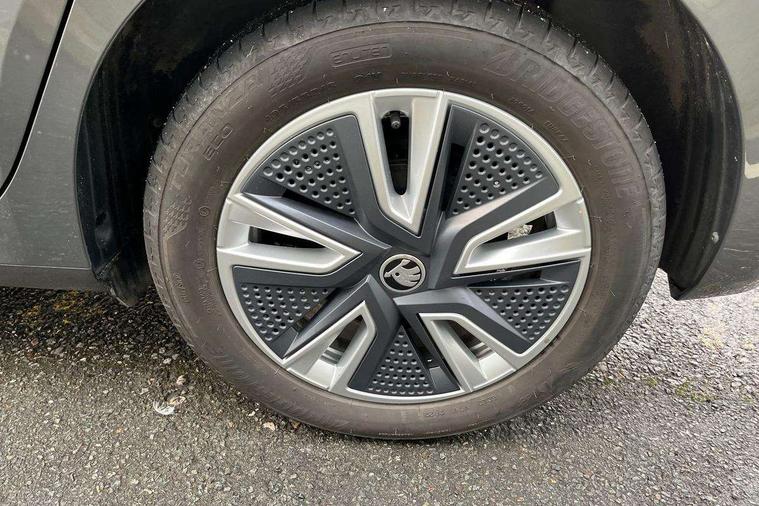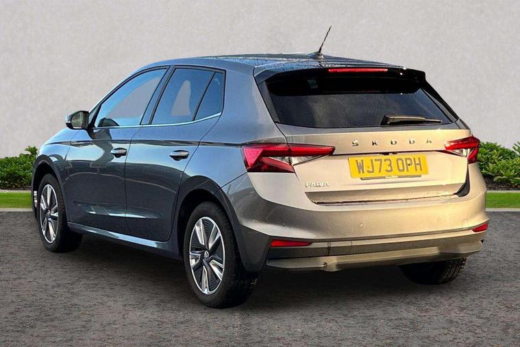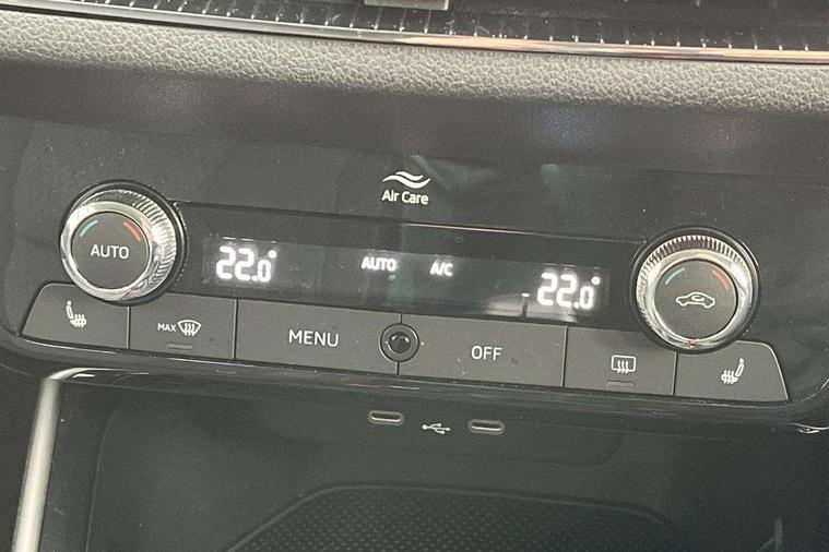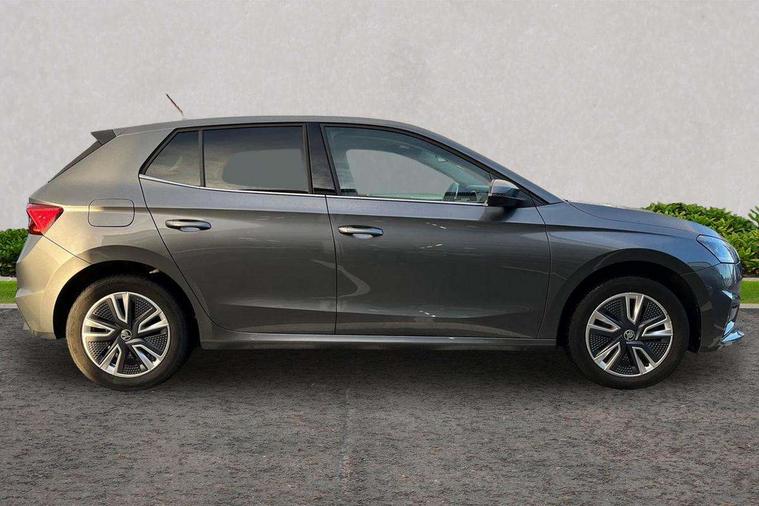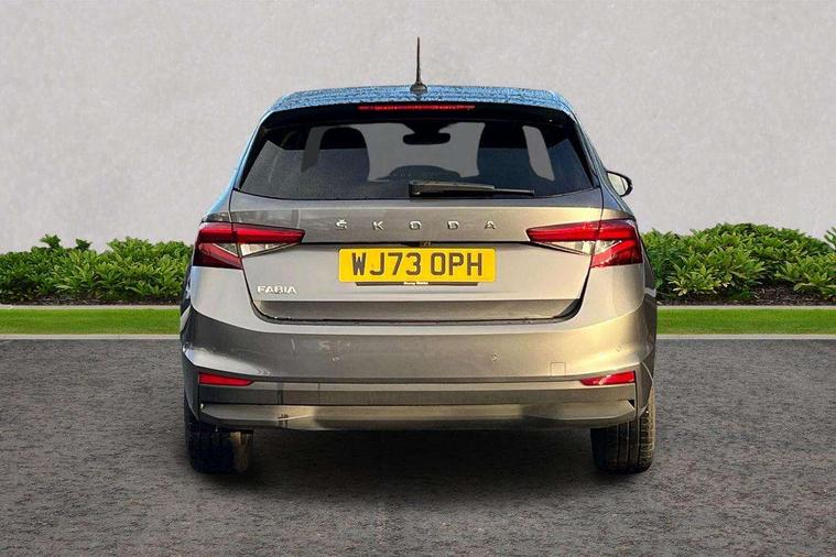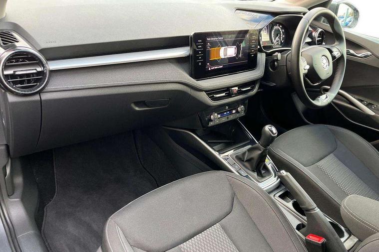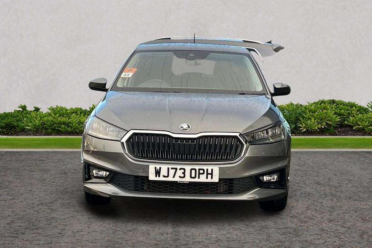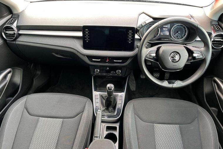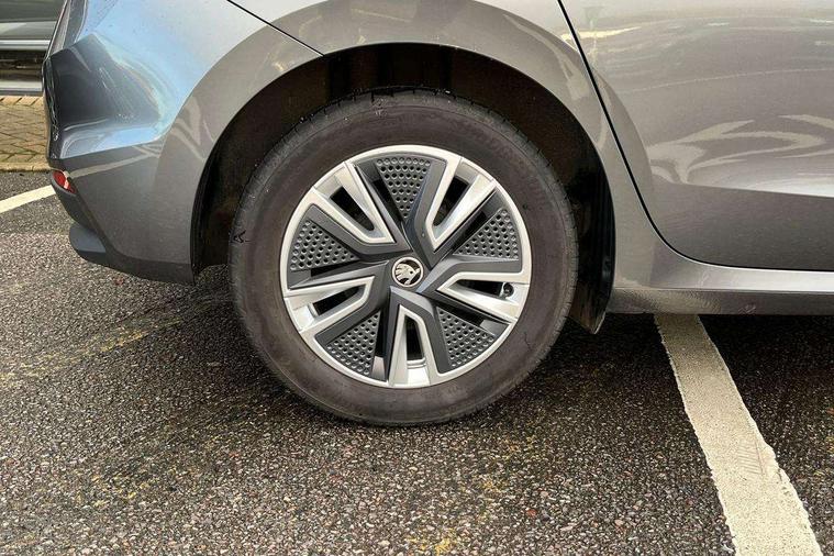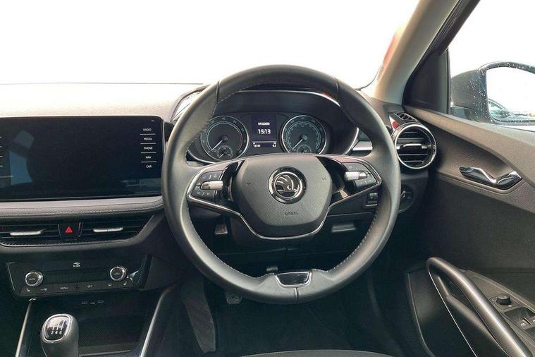 Bluetooth connection, Driver alert system - DAS, Electromechanical power steering, Exterior temperature gauge, Service interval indicator, 2x USB-C in the front (for data transmission and charging), 6 Speakers (4 in front and 2 in rear), Auxiliary socket for external MP3 player, DAB digital radio reception, Web radio, Auto dimming rear view mirror, Body colour door mirrors, Body coloured bumpers, Chrome window surround, Door mirror integrated indicators, Electrically adjustable and heated door mirrors, Front and rear electric windows, Front window wiper intermittent control, Headlight range control - Automatic, Ice scraper in fuel cap, LED daytime running lights with coming and leaving home feature, Rear LED fog light, Rear side wing doors, Rear window wiper with washing nozzles, Roof mounted spoiler, SKODA tailgate lettering in chrome, Third brake light, 3 rear headrests, Backrest split and folding, Central console with fixed cup holder and storage box, Chrome handbrake release button, Comfort seats, Fabric upholstery, Front centre armrest, Gearshift knob/handle in leather, Hand brake lever handle in leather, Height adjustable front headrests, Height adjustable front seats, Height adjustable steering wheel, ISOFIX and TopTether anchorage points to the outer rear seats, ISOFIX and TopTether on the front passenger seat, Luggage compartment lighting, Manually adjustable lumbar support in front seats, Pollen filter, Rear seat bench unsplit, Removable cup holder, Single front passenger seat, Storm grey headlining, Sun visors with mirror and airbag label on passenger side, Textile floor mats, Ticket holder, Umbrella in drivers door, Ambient lighting pack 2 - Fabia Hatchback, 3-point height adjustable front seats belts with pretensioner and force limiter, Automatic warning lights in case of crash, Driver and passengers airbag with switch off function, e-Call+, ESC including ABS, MSR, ASR, EDS, HBA and XDS, Front and rear seat belt warning, FRONT ASSIST (AEB City and AEB Inter Urban), Front side airbags, Head airbags, One tone horn, Pedestrian protection, Three rear 3-points safety seat belts with pretensioner and force limiter including stop function for outer rear seat belts, Tyre pressure monitoring system, Anti-theft alarm system including immobiliser, interior monitoring, backup horn, and towing protection, Chrome edged air vents, Satin black door and side trim panel in front, Anti-theft wheel bolts protection, Super-low rolling resistance tyres,