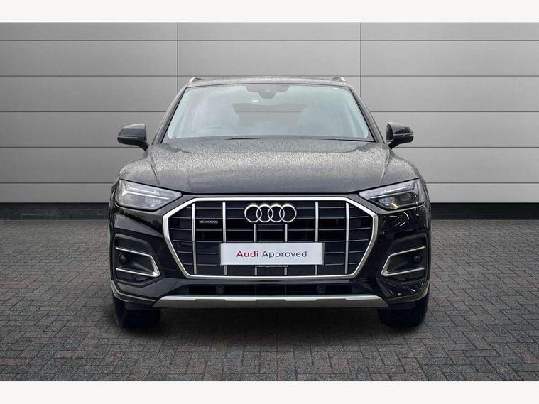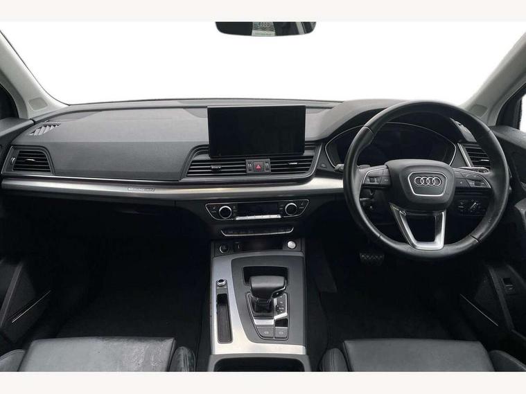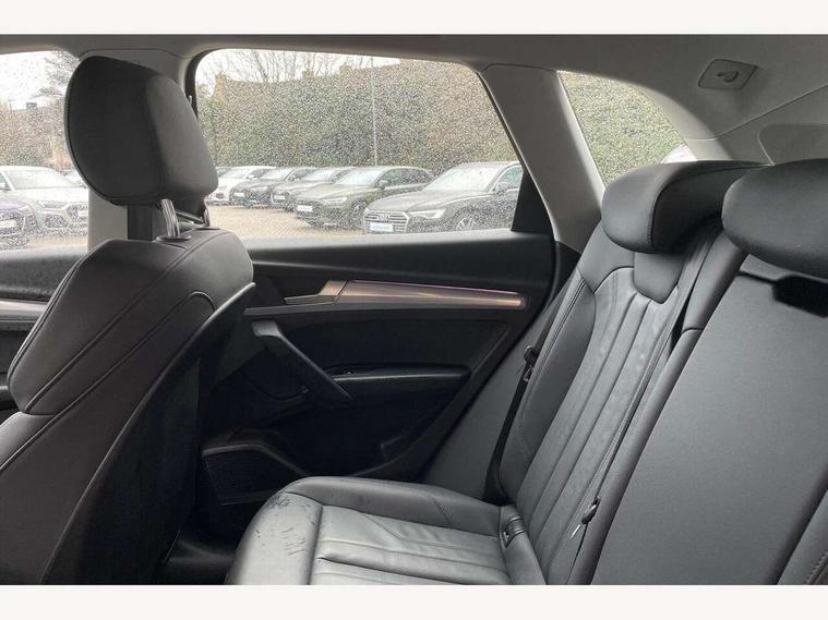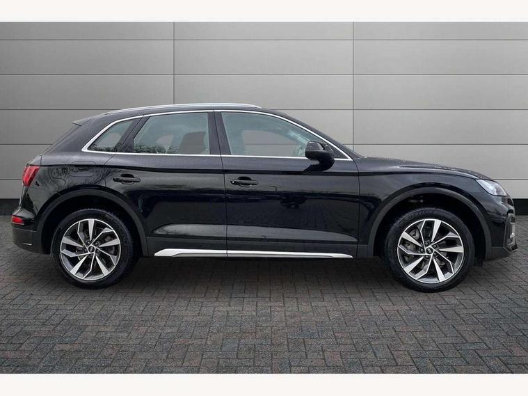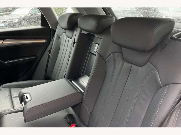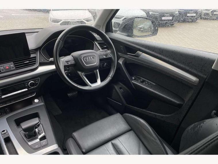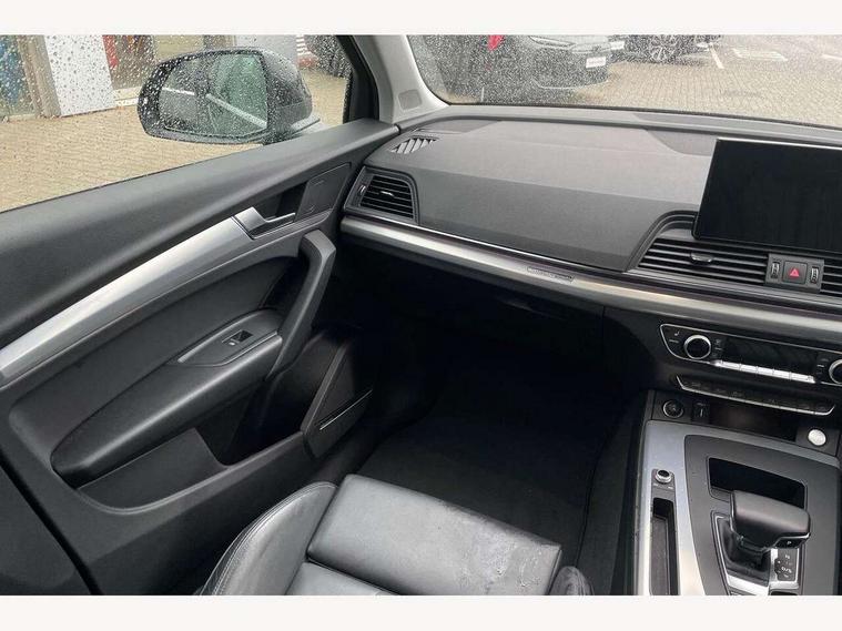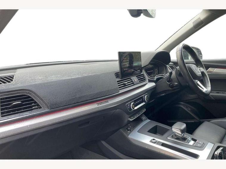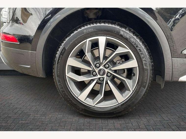 Audi connect safety and service (e-call), Audi connect with Amazon Alexa Integration, Audi drive select, Audi virtual cockpit plus with 12.3" screen and three different layout designs, Audi wireless smartphone interface, Automatic start-stop system with coasting functionality and efficiency programme, Bluetooth interface, Cruise control + speed limiter, Electro - mechanical power assisted steering, MMI navigation plus with 10.1" touch screen, Power tailgate, Reversing camera, Service interval indicator, Voice control system with Audi hotword activation "Hey Audi", Diesel particulate filter, Dynamic suspension, Quattro on demand, 2 x USB charging port with aux input socket, DAB Digital radio, Acoustic windscreen, Air inlets in matt titanium black with blades in matt aluminium silver, Aluminium roof rails, Auto dimming door mirrors, Auto dimming rear view mirror, Automatic headlight adjustment, Automatic headlights and windscreen wipers, Body colour bumpers, Body colour door mirrors, Chrome plated exhaust trims, Daytime running lights, Door sills in Selenite silver, Electric adjustable/heated/folding door mirrors, Front and rear electric windows, High level LED brake light, LED headlights and LED tail lights, Lower bumpers painted in contrast Manhattan grey, Matt selenite silver underbody protection, Matt twilight grey radiator grille with chrome vertical struts, Rear chrome trim strip below lights, Rear diffuser strip in selenite silver, Rear side wing doors, Rear spoiler, Rear wiper, Roof bars, 3 rear headrests, 3 spoke multifunction leather steering wheel with shift paddles, 40:20:40 split folding 3 rear bench seat in 2nd row with rear centre armrest, Comfort front centre armrest, Deluxe 3 zone electronic climate control, Door sills trims with aluminium inlays, Front/rear floor mats, Heated front seats, Height adjustable front head restraints, Height/reach adjustable steering column, ISOFIX child seat mounting and top tether, Luggage compartment cover, Manual seat adjustment with 4-way electric lumbar support, Removable luggage compartment floor, Silver cloth headlining, Single front passenger seat, Sunvisors with vanity mirrors, Twin leather upholstery + front sports seats, High gloss pack - Q5, LED interior light pack - Q5, 3 point seatbelts on all seats, 6 airbags - Driver, front passenger, curtain and side airbags, Electrically operated child locks on rear doors, Electromechanical parking brake, Electronic stabilisation control including ABS, ASR and EDL, Front passenger airbag deactivation, Hill descent control, Hill hold assist, Multi collision brake assist, Pop-up bonnet for pedestrian protection, Pre sense city, Seat belt force limiter, Seatbelt monitoring, Tyre pressure warning, Warning triangle and first aid kit, Anti theft alarm, Anti-theft wheel bolts, Keyless Go access/ignition system, Remote central locking, Aluminium rhombus inlay,