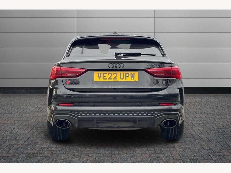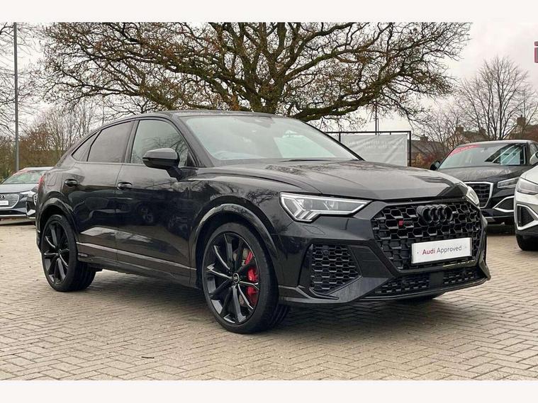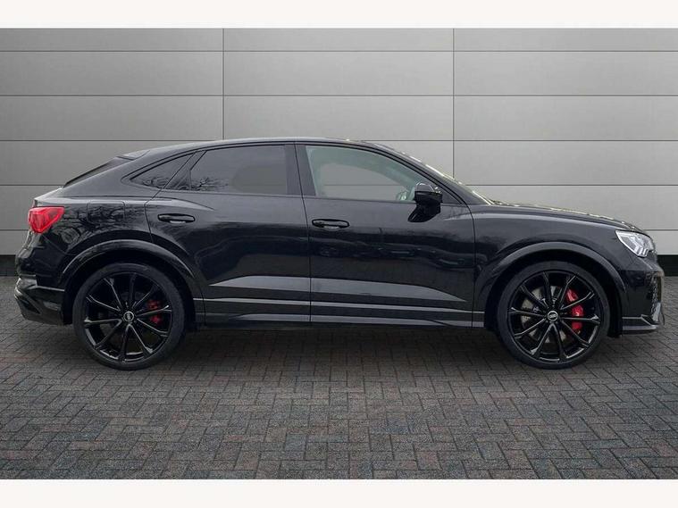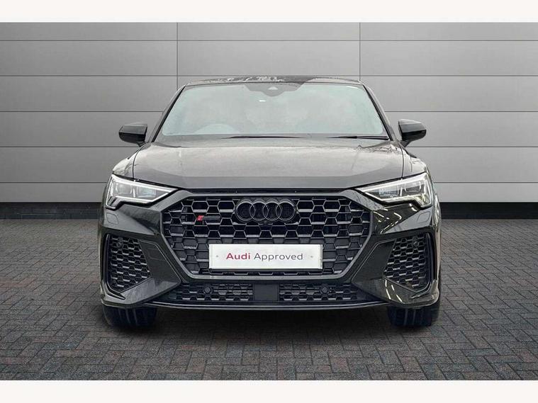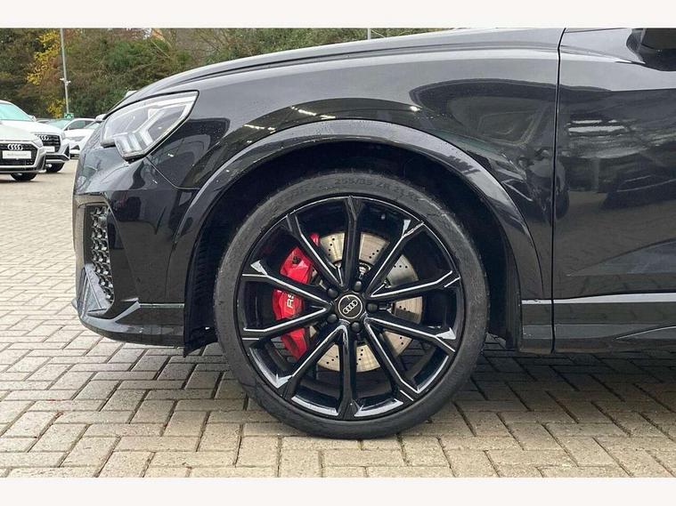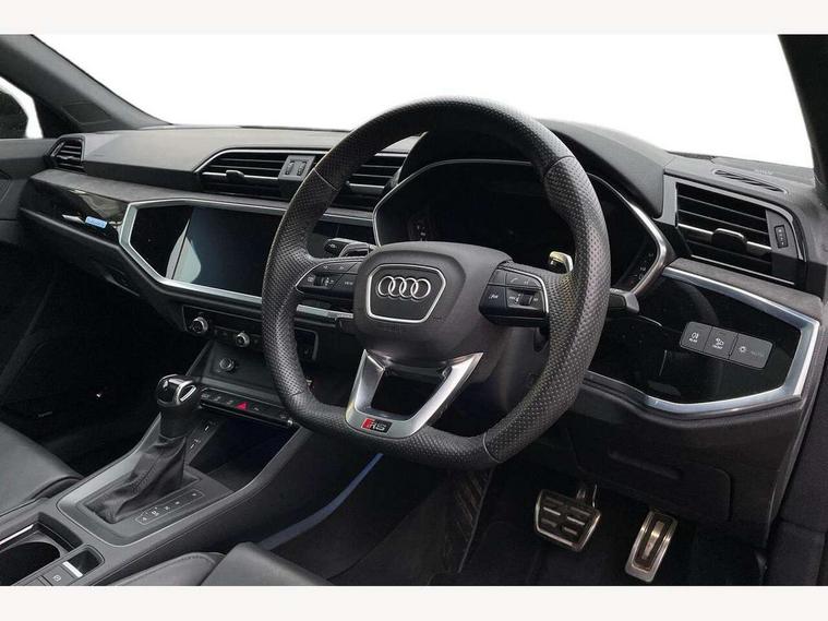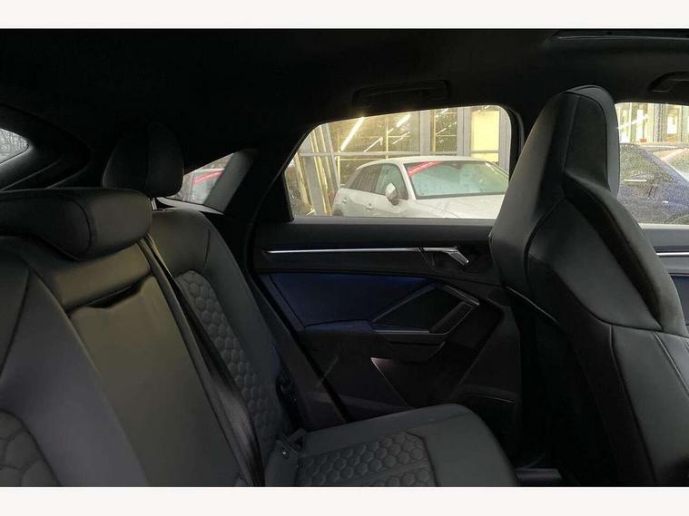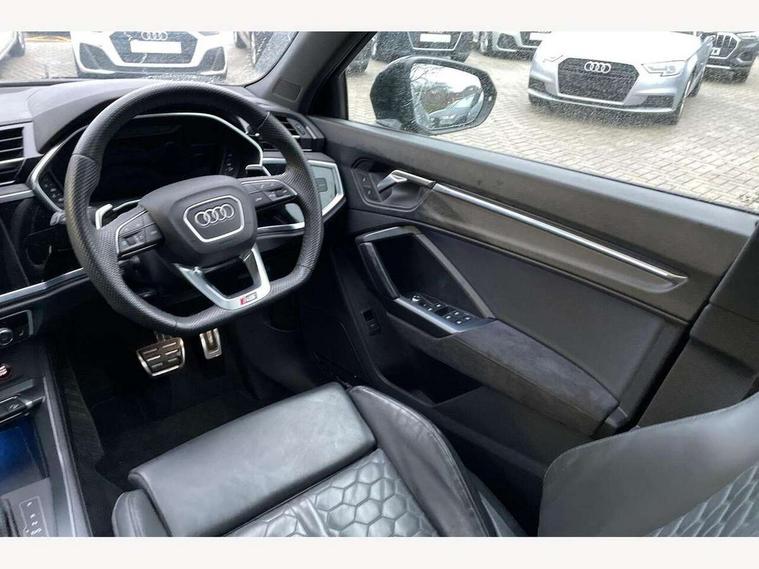 Audi drive select with new RS modes, Audi lane departure warning, Audi parking system plus with front and rear sensors, Audi virtual cockpit plus - 12.3 inch display, Bluetooth interface, Camera based traffic sign recognition, Emergency e-call, MMI Navigation Plus with high resolution 10.1 inch touchscreen colour display, Power operated tailgate, Progressive steering, Smartphone interface includes wireless Apple carplay/Android Auto, Start stop system with recuperation, Voice control system with natural language interaction, Quattro all wheel drive, 2 USB-C ports with charge and data functions, Audi sound system, DAB digital radio module, Acoustic windscreen, Audi Beam uses LEDs to project the Audi Sport logo, Auto dimming frameless rear view mirror, Body colour rear spoiler with lip in gloss black, Electrically folding, adjustable and heated door mirrors with integrated LED side indicators and kerb view function for passenger side, Flared wheel arches, Flat slits on single frame grille, Headlight washers, High gloss black finish B and C pillars, Honeycomb radiator grille in gloss black, Illuminated door sill trims with RS logo, LED headlights with LED daytime running lights, LED rear lights, LED third brake light, Panoramic glass sunroof, Privacy glass dark tinted rear and rear-side windows (from B-pillar backwards), Rain and light sensors, Rear side wing doors, Rear wiper, RS specific bumpers with large front air inlets in black, RS Sport exhaust system, dual branch with exhaust flap control and gloss black oval tailpipe trims, Tinted rear windows, Variable front intermittent wipers, 3 seat bench in 2nd row, 4 way electric lumbar support for driver and front passenger, Adjustable rear seat bench/backrest with centre armrest and cupholder, Black Alcantara elements - dashboard and the armrests in the front and rear doors, Black cloth headlining, Dual zone electronic climate control, Electrically adjustable front seats, Fine Nappa leather upholstery with front sports seats + honeycomb stitching and RS embossed logo, Front and rear floor mats, Front and rear head restraints, Front centre armrest, Heated front seats, ISOFIX child seat mounting for front passenger with airbag deactivation and outer rear seat including top tether attachment point for outer rear seats, Single front passenger seat, Stainless steel luggage compartment sill finisher, Stainless steel pedals, Ambient lighting pack - RS Q3, Black styling pack - RS Q3, Non smoking pack - RS Q3, 3x3 point rear seatbelts, 6 airbags - Driver, front passenger, curtain and side windows, Audi pre-sense front with pedestrain and cyclist recognition, Electrically operated child locks on rear doors, Electromechanical parking brake, Electronic stabilisation control including ABS, ASR and EDL, Front seatbelt reminder, Hill descent control, Hill hold assist, Pre sense basic, RS brake system, Seatbelt monitoring, Tyre pressure warning, Warning triangle and first aid kit, Advanced key, Anti theft alarm, Anti theft wheel bolts, Immobiliser, Aluminium look interior elements, Detail dashboard around MMI touch colour display in glass look, black with surround in aluminium look, Inlay - Black piano finish, Tool kit, Tyre repair kit,