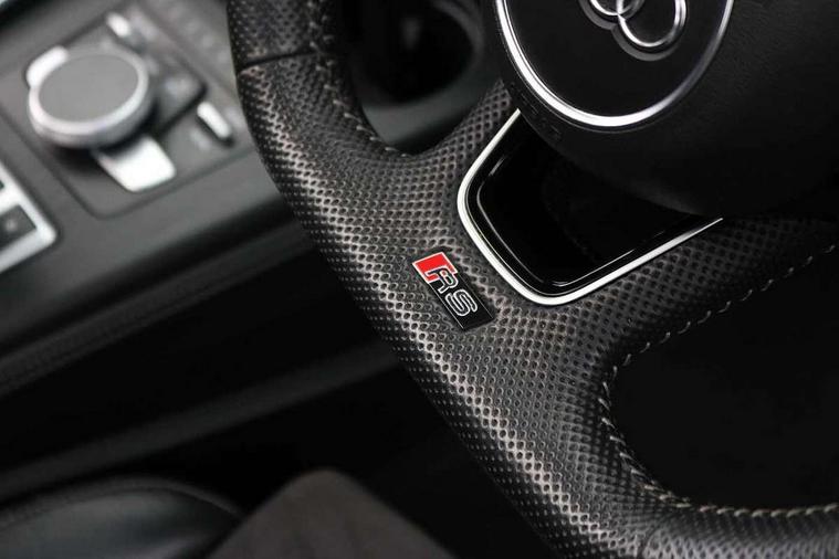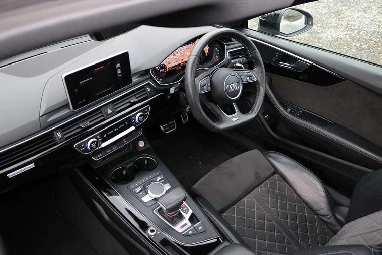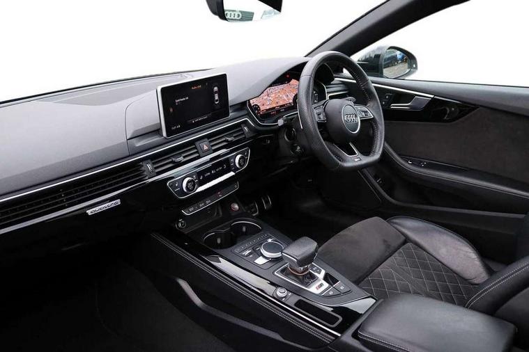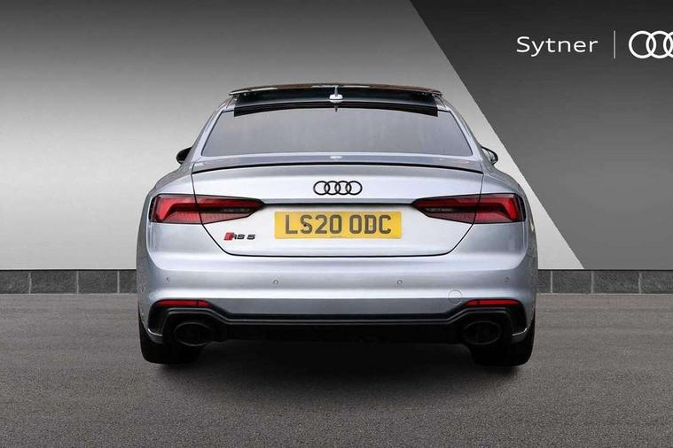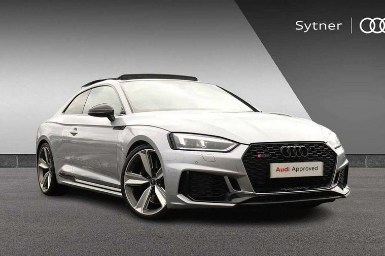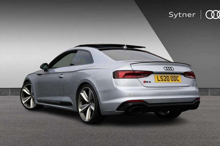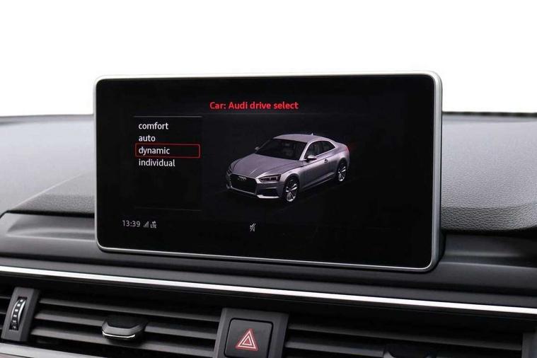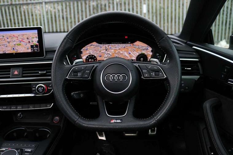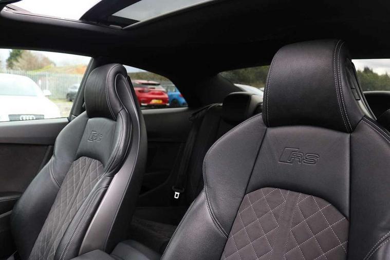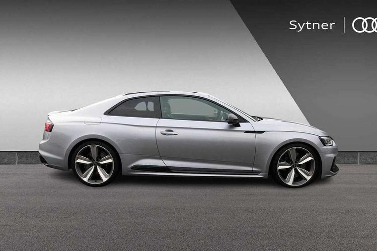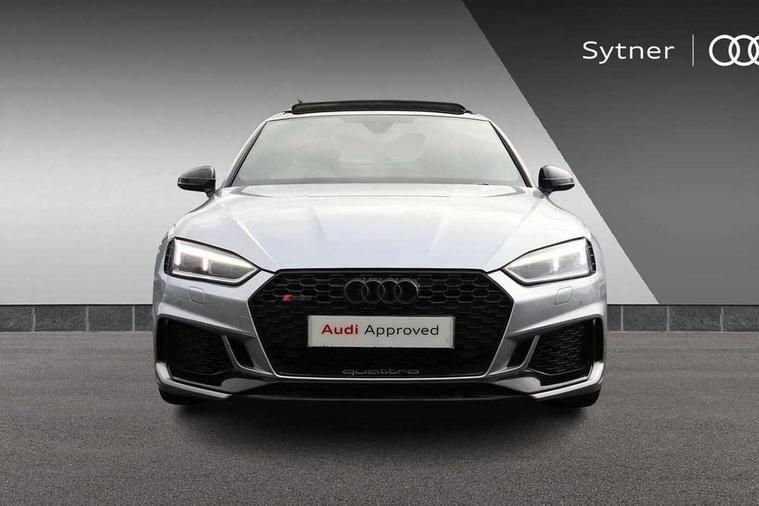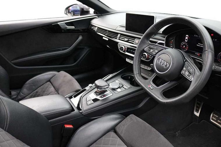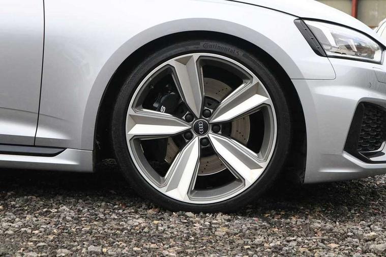 7" Colour driver information system, Audi connect safety and service (e-call), Audi drive select, Audi parking system plus with front and rear sensors, Audi phone box with wireless charging, Audi side assist, Audi smartphone interface, Audi virtual cockpit with RS specific display, Bluetooth interface, Electro-mechanical power steering, MMI navigation plus with MMI touch, Service interval indicator, Voice control system, 58 Litre fuel tank, Quattro sports differential, RS sports suspension, Audi sound system, DAB Digital radio, Auto dimming rear view mirror, Body colour door handles, Electric adjustable/heated/folding door mirrors, Electric front windows, Flared front and rear wheel arches, Front bumper with enlarged air inlets, Front spoiler in matt aluminium look finish, High beam assistant, Honeycomb design grille with quattro logo, Lateral air inlets next to front headlights, LED daytime running lights, LED headlights with RS air intake, LED indicators in door mirrors, Matt aluminium door mirrors, Panoramic glass sunroof, Privacy glass with rear acoustic glazing, Rain and light sensors, Roof spoiler, RS sport exhaust system, RS5 badges on grille, the front wing panels and rear, RS5 dual branch chrome tailpipes with left and right oval pipes, Side sill extensions in body colour with high gloss black inserts, Towbar preparation, Windscreen with acoustic glazing, 3 spoke flat bottomed high multi-function leather sport steering wheel with RS badging, 40/20/40 split folding 2 seater rear seat bench with rear centre armrest, Black cloth headlining, Deluxe 3 zone electronic climate control, Electrically adjustable front seats, Front centre armrest, Front head restraints, Front/rear floor mats, Illuminated door sill trims with RS5 logo, ISOFIX child seat mounting and top tether, Jack and tool kit, Leather door armrests and knee pad, Leather/Alcantara upholstery, Luggage compartment mat, Pneumatically adjustable lumbar support with massage function, Rear centre armrest, Rear headrests, RS Specific perforated leather gear lever knob with contrast stitching, Stainless steel pedals, Sunvisors with vanity mirrors, Super sports seats, Black styling pack - RS5, LED Interior light pack - RS5, Non Smokers pack, 6 airbags - Driver, front passenger, curtain and side airbags, Black painted brake calipers with RS logo at the front, Electromechanical parking brake, Electronic Stabilisation Control (ESC) including ABS, ASR and EDL, Enhanced braking system, Height adjustable front seatbelts, Hill hold function, Multi-Collision braking, Pop-up bonnet for pedestrian protection, Pre sense city, Seatbelt monitoring, Tyre pressure warning, Variable restraint system, Warning triangle and first aid kit, Anti theft alarm system, Anti theft wheel bolts, Immobiliser, Keyless Go, Remote central locking, Remote control key with RS emblem, Piano black finish inlay, Tyre repair kit,