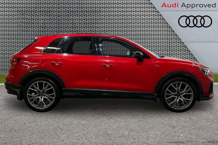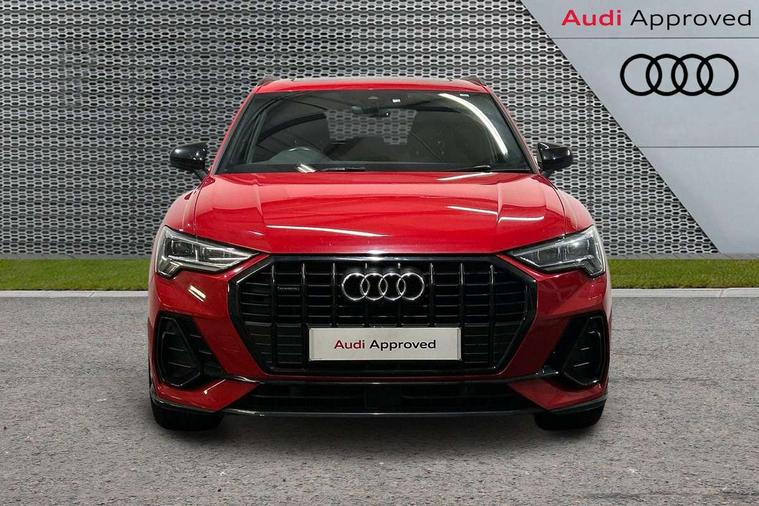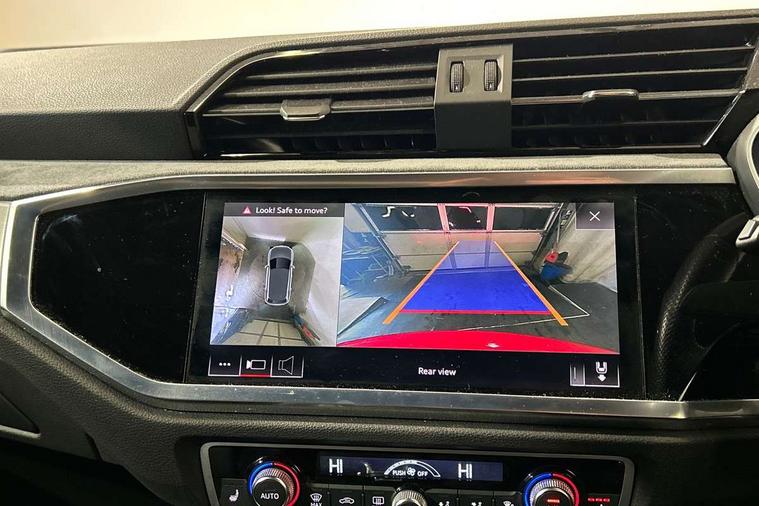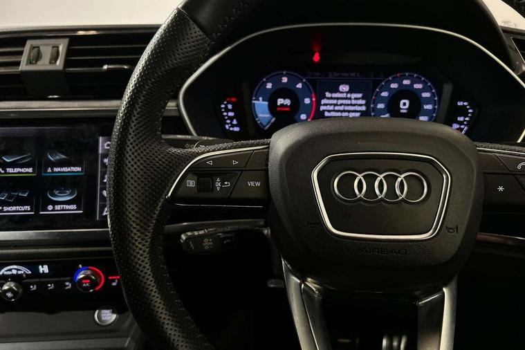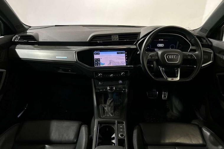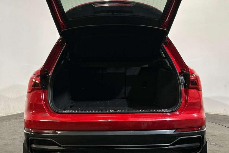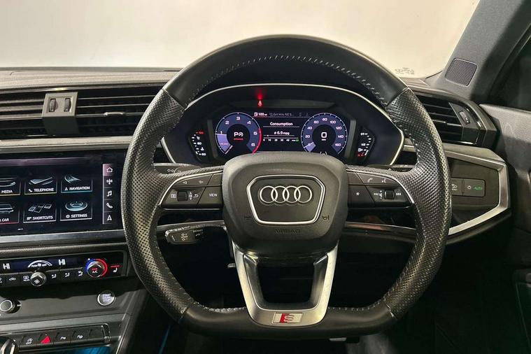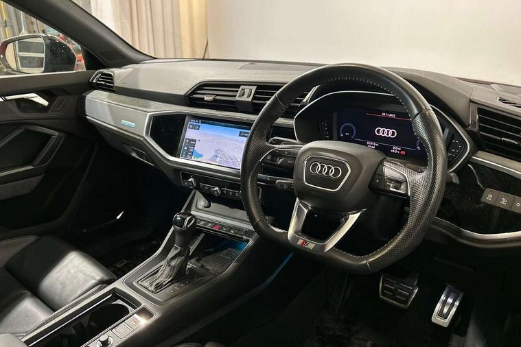 360 degree parking camera, Audi connect safety and service (e-call), Audi drive select, Audi lane departure warning, Audi parking system plus with front and rear sensors, Audi phone box with wireless charging, Audi side assist, Audi smartphone interface, Audi virtual cockpit plus, Bluetooth interface, MMI navigation plus with MMI touch, Power opening/closing tailgate, Progressive steering, Rear cross traffic alert, Service interval indicator, Stop/start system, Voice control system, Adaptive suspension with damping control, Diesel particulate filter, Bang & Olufsen 3D Premium Sound System, DAB digital radio module, Acoustic windscreen, Auto dimming and folding door mirrors, Auto dimming rear view mirror, Black roof rails, Contrast bumpers in Manhattan grey paint finish, Diffuser in matt Platinum grey, Electrically adjustable and heated door mirrors with integrated LED side indicators, Front and rear electric windows, Front fog lights, Front side air inlets in matt platinum grey, Front spoiler blade in matt platinum grey, Front spoiler in matt selenite silver, Grille vertical bars in aluminium silver/Matt, Headlight washers, High gloss black finish B and C pillars, Matrix LED headlights with LED rear lights and dynamic front and rear indicator, Panoramic opening glass sunroof, Privacy glass, Rain and light sensors, Rear diffuser strip in selenite silver, S line bumpers in contrasting Manhattan grey, 12V socket in rear centre console, 3 spoke flat bottomed high multi-function leather sport steering wheel with gearshift paddles, 4 way electric lumbar support for driver and front passenger, 40:20:40 split folding rear bench seat, Adjustable rear seat bench/backrest with centre armrest and cupholder, Aluminium door sill trims, Black cloth headlining, Dual zone climate control, Electrically adjustable front seats, Front and rear black floor mats with contrast stitching in rock grey, Front and rear headrests, Front centre armrest with storage compartment and angle adjustment, Heated front seats, ISOFIX child seat mounting and Top Tether with front passenger airbag deactivation, Perforated leather gearknob, Stainless steel luggage compartment sill finisher, Stainless steel pedals, Black styling pack - Q3, Driver Assistance Pack - Q3, Multi coloured extended ambient interior lighting pack - Q3, Non smoking pack - Q3, 3x3 point rear seatbelts, 6 airbags - Driver, front passenger, curtain and side windows, Audi pre-sense front with pedestrain and cyclist recognition, Electronic stabilisation control including ABS, ASR and EDL, Hill hold assist, Pre sense basic, Seatbelt monitoring, Tyre pressure warning, Warning triangle and first aid kit, Advanced key, Anti theft alarm, Anti theft wheel bolts, Remote central locking, Dark matt brushed aluminium inlay, MMI touch colour display in gloss black with aluminium surround,