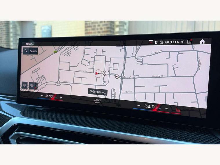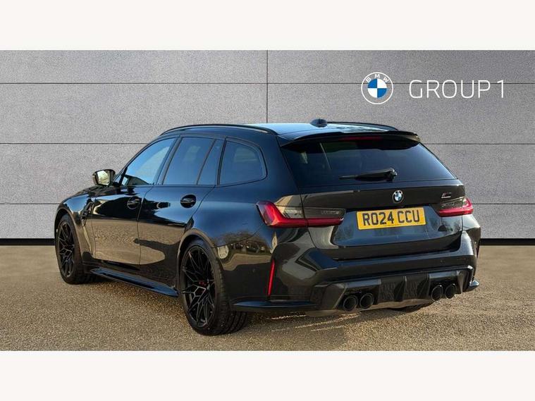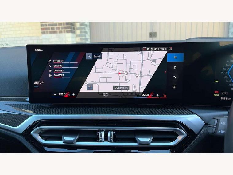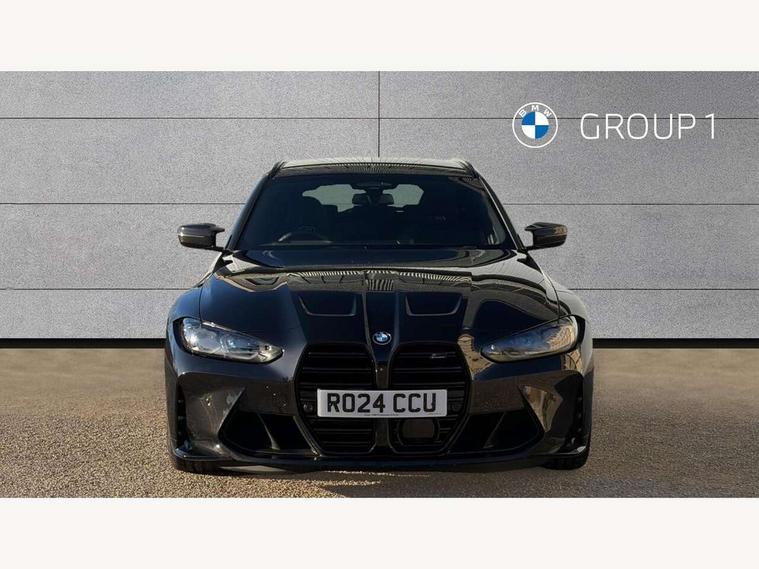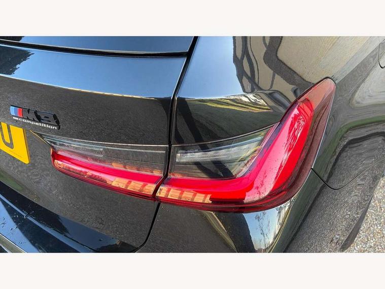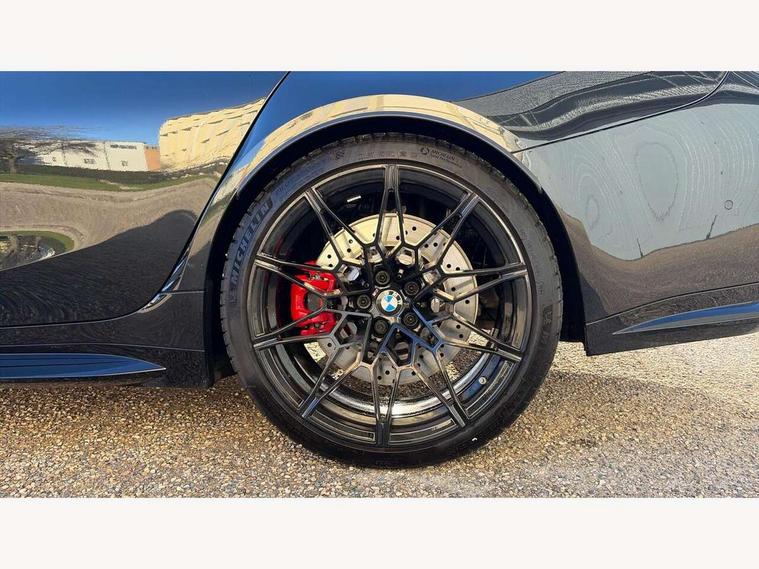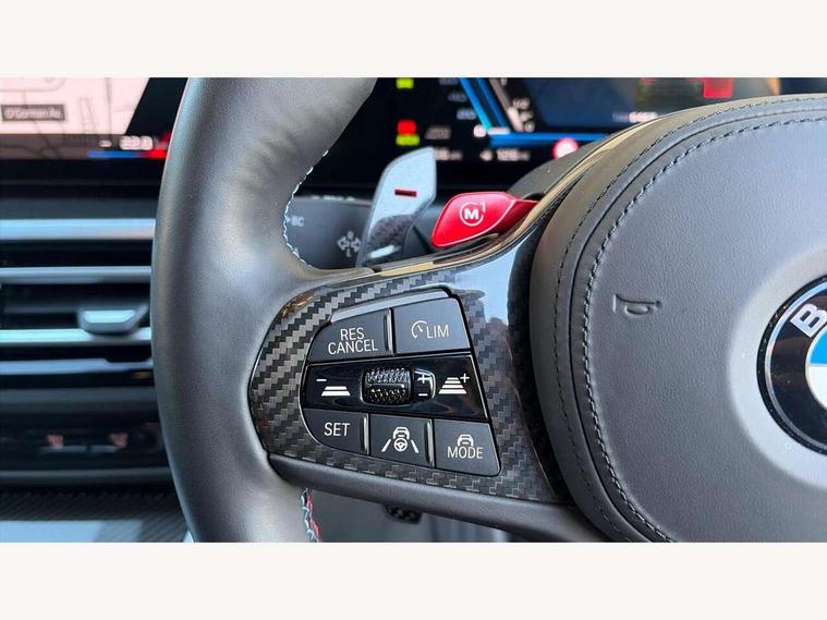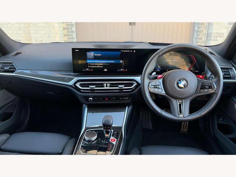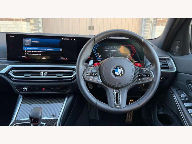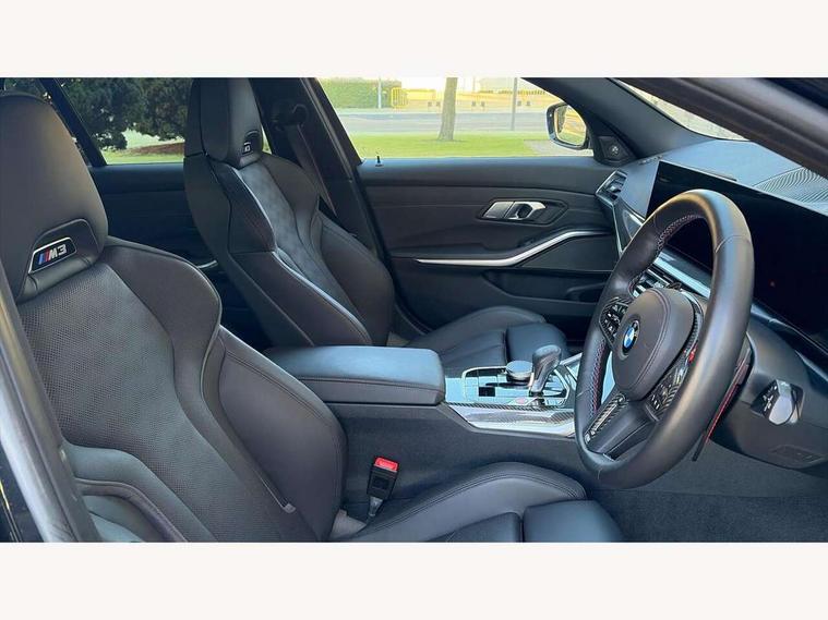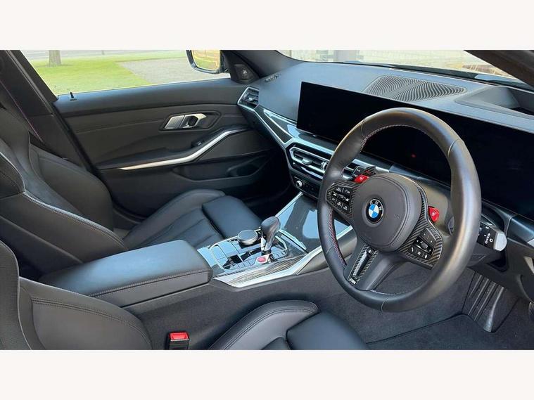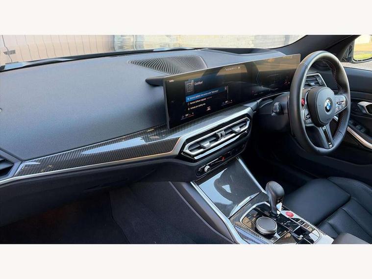 Active guard plus, Automatic start/stop system, Bluetooth functionality with Apple CarPlay/Android Auto, BMW ConnectedDrive online services, BMW iDrive controller on centre console, BMW legal emergency call, BMW Live Cockpit Professional sat nav system with 12.3" instrument display and high resolution control display, BMW Online services, BMW Teleservices, Brake pad wear indicator warning light, Condition based service, Door/boot open warning light, Driving experience switch, Electric boot lid, Head up Display, Illuminated control elements, Instrument cluster with extended contents, Lights on warning, M drive buttons, Oil sensor for level and grade, warning by check control system, Oil temperature gauge, On board computer, On board diagnostics, Optimum shift indicator, Outside temperature display, Pull away assistant, Run flat indicator, Service interval indicator, Shifting point display, Speed limiter, Variable sport steering, Adaptive M Sport suspension, Double joint spring strut front axle, M Drive Professional including track mode, laptimer, traction control & Drift analyser, M Sport differential, M steptronic sport transmission with drivelogic, Safety battery terminal clamp, 8 programmable favourite buttons, Auxiliary point for auxiliary devices, DAB Digital radio, Harman/Kardon loudspeaker system, Personal eSim, 3rd brake light, Acoustic glazing, Auto dimming driver's door mirror, Auto dimming rear view mirror, Automatic headlights + automatic windscreen wipers, Automatic parking function on front passenger's exterior mirror, Black model designation badges, BMW emblem on engine compartment lid and tailgate, BMW high gloss shadow line with extended contents, BMW Individual shadowline lights, Body colour bumpers, Carbon fibre reinforced plastic (CFRP) roof with high gloss black roof aerial bulge and roof mouldings, Day time running light, Door mirror integrated indicators, Door sill finishers with aluminium inserts, Dynamic brake lights, Electric adjustable heated door mirrors, Electric folding door mirrors, Electric front and rear windows with one touch/convenient open/close function, Follow me home headlights, Front and rear apron plastic in body colour, Front and rear bumper system, Headlight beam throw control, Heat protection, sun protection glazing, Heated rear window with automatic switch off, Heated washer jets, High beam assistant, High gloss black frameless kidney grille with M badge, High gloss black lower bumper edges, side sills and diffuser edge binding, High gloss black M roof rails, Illuminated bow type door handles in body colour drivers side with door lock, LED number plate light, LED tail lights with 3D L-shaped LED light design, M designation, M Sport entry door sill strips, Mirror glass aspheric on driver's side, convex on passenger side, Rear fog lights, Rear reflectors, Rear right M3 competition inscription, Rear side wing doors, Rear wiper, Reversing light, Shark fin roof aerial, Strakes in front side panel, black matt/black high-gloss, with model badge, Visible VIN plate, Welcome lighting, 2 front cupholder in centre console with clamping elements and matt black inlay, 2 x 12 V Power sockets (luggage compartment and front centre console), 2 x USB Type C ports for charging and data transmission in front centre console, 3 folding rear headrests, 3 seat bench in 2nd row, Ambient inside door handle light, Ambient lighting for instrument panel, Ambient lighting for storage compartment, Ambient lighting front and rear, Ambient lighting in door panels, Anthracite headlining, Battery in luggage compartment, Carbon fibre centre console incl. cover for cupholders and storage compartment, Carbon fibre decorative steering wheel finishers, Carbon fibre shift paddles, Carbon fibre strip in instrument panel on front passenger side, Centre console armrest with storage compartment, Compartment in front of cupholder, Driver/passenger sunvisors with illuminated vanity mirrors + covers, Dynamic ambient interior lighting, Electric front seats + driver memory, English handbook, Floor mats in velour, Folding rear centre armrest with 2 cupholders, Front door storage bins with bottle holder, Front isofix attachment + airbag deactivation, Front seat backrest width adjustment, Front seats lumbar support, Front/rear door armrests, Gearshift lever with embossed M badge, Heated front seats, Height adjustable front headrests, Isofix on 2nd row outer seats, Lockable/illuminated glovebox, Luggage compartment lighting, Manual 40:20:40 split folding rear seat with two tilt positions for backrest, Multifunction steering wheel, Rake/reach adjustable steering wheel, Single front passenger seat, Storage compartment in rear doors, Three zone automatic air conditioning, Through loading system, Toolkit located in luggage compartment, Wireless charging tray, Additional storage compartment pack - M3, Connected package professional - M3, High gloss shadowline exterior trim pack - M3, 3 point seatbelts on all seats, Anti-lock braking system (ABS), Automatic Stability Control (ASC), Brake energy regeneration, Brake fade compensation, Compound structure brake discs, Cornering brake control (CBC), Crash sensor, Driver/Front Passenger airbags, Dry braking, Dynamic brake control, Dynamic stability control + (DSC+), Dynamic Traction Control - DTC, Electromechanical parking brake, Electronic differential lock control (EDLC), Front and rear head airbags, Front seat side impact airbags, Front seatbelt pretensioners + load limiters, Hill start assist, M Sport seat belts, Rear child proof door locks, Seat occupancy detection for driver and passenger side, Seatbelt warning, Side impact protection, Two tone horn, Tyre pressure sensor, Warning triangle and first aid kit, Centre lock switch, Closing system with central locking, Digital key, Electronic immobiliser, Thatcham cat 1 remote alarm, Vehicle Key with 4 buttons including the integrated key, Galvanic finish to control surrounds, High gloss black interior trim, T
