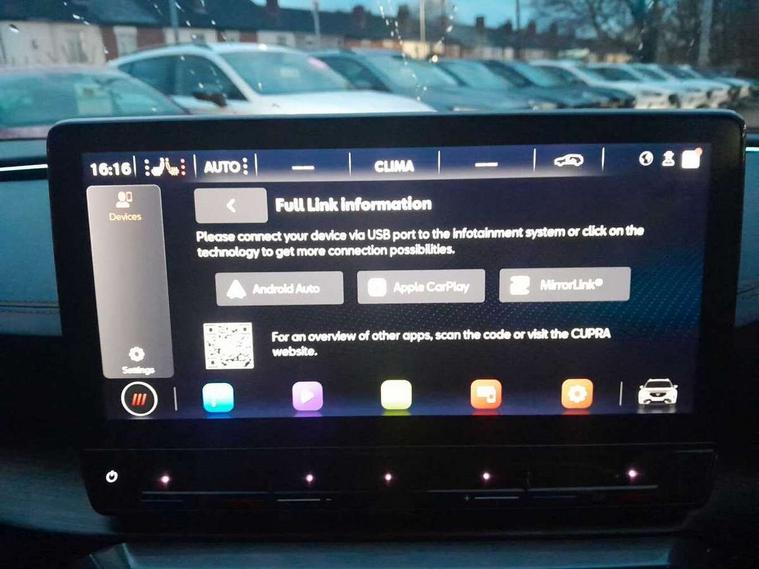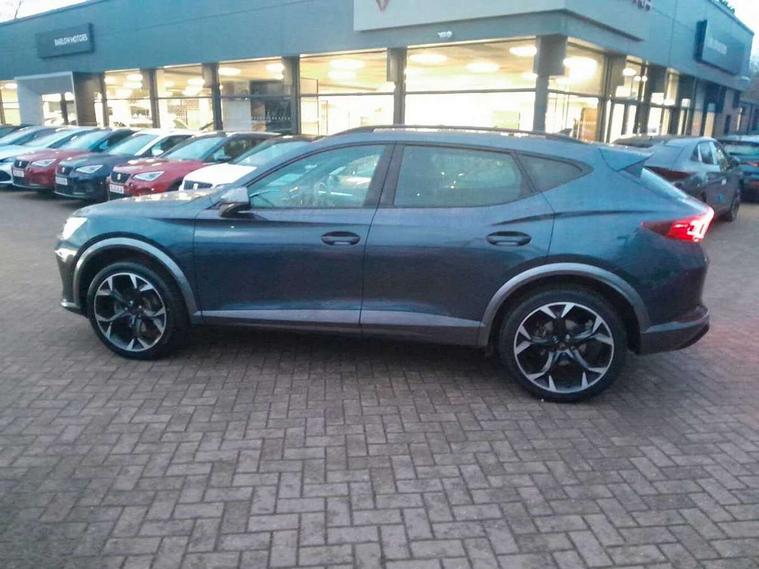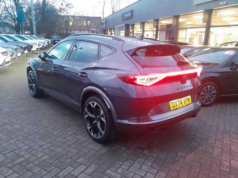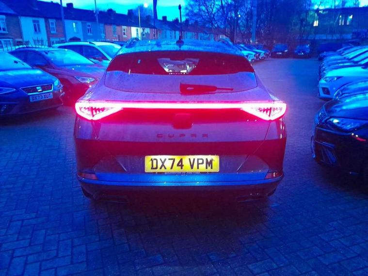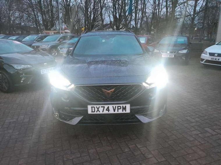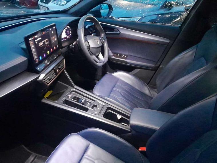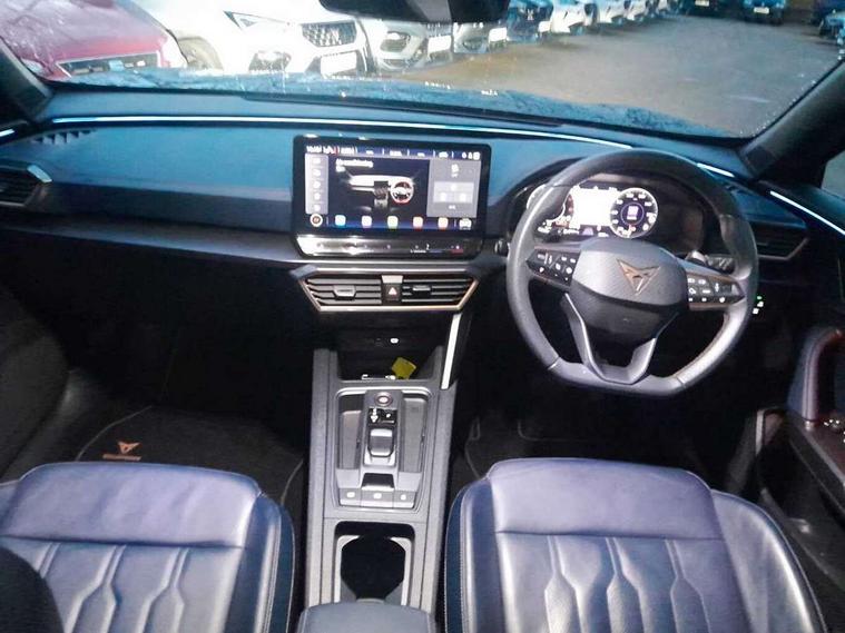 Digital cockpit and configurable dashboard, Driver alert system, Driving profile selection, Forward collision warning with automatic braking, Lane assist, Navigation system with 12'' Touchscreen Display, Park assist (inc front/rear parking sensors), PAS, Predictive adaptive cruise control with speed limiter, Rear view camera, RPM, trip computer, outside temp gauge, instrument light brightness, low fuel warning light, lights on reminder, gearshift indicator, Service interval indicator, Start/stop system with regenerative braking, Voice control system, Wired Android Auto, Wireless apple carplay, Wireless phone charger, Electronic locking differential and dynamic traction support, Standard suspension, 2 front and 2 rear USB type C sockets, Auxiliary input socket, DAB radio, Auto dimming rear view mirror, Body colour door handles, Body coloured bumpers, Dark grey wing mirror, Daytime running light with automatic headlight control and coming home feature, Dynamic headlight range control, Electric front/rear windows, Electrically adjustable heated and folding door mirrors with memory function, Front fog lamps with cornering function, Gloss black roof rails and window surrounds, LED Headlights, LED Taillights with dynamic indicator, Rain sensing wipers, Rear diffuser with black simulated exhaust pipes, Rear side wing doors, Rear wash/wipe, Third brake light, Tinted rear windows, Welcome lights, 12v power supply in centre console, 12V socket, 12v socket in loadspace, 2 front and 2 rear reading lights, 230V socket, 3 seat bench in 2nd row, 60/40 split rear bench seat with armrest and mechanical seat release, Black headlining, Dust/pollen filter, Front and rear head restraints, Front centre armrest, Height/reach adjust steering wheel, Illuminated interior front door sills, Illuminated sunvisor with mirror, Isofix, Leather multi function heated steering wheel with gear shift paddles, Luggage tie-down hooks, Single front passenger seat, Three zone climate control with control panel in rear, Variable luggage/load compartment floor, Wraparound lighting, Genuine Nappa leather Pack - Cupra, 3 point seatbelts on all rear seats, ABS, Brake control system - ESC and brake booster, Child proof door locks, Driver and front passenger airbags with front passenger airbag de-activation, Electronic parking brake, Front and rear disc brakes, Front side curtain airbags, Hill hold control, Public e-call, Seat belt reminder for front and rear seats, Tyre pressure monitoring system, Anti theft alarm system, Keyless entry and start system (KESSY), Locking wheel bolts, Copper and aluminium interior detailing, 19" 'Exclusive' machined sport matte black and silver alloy wheels,