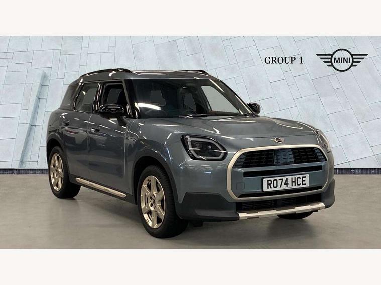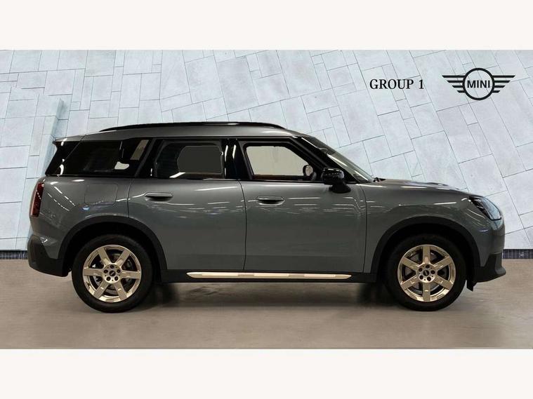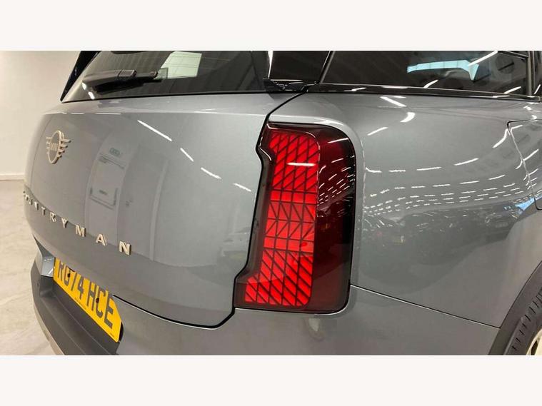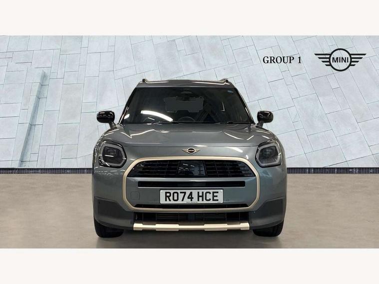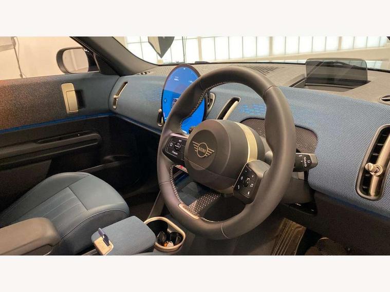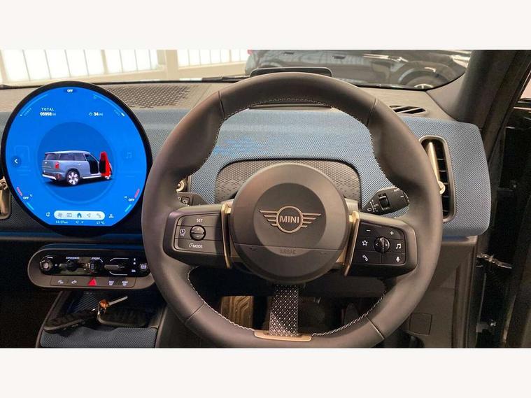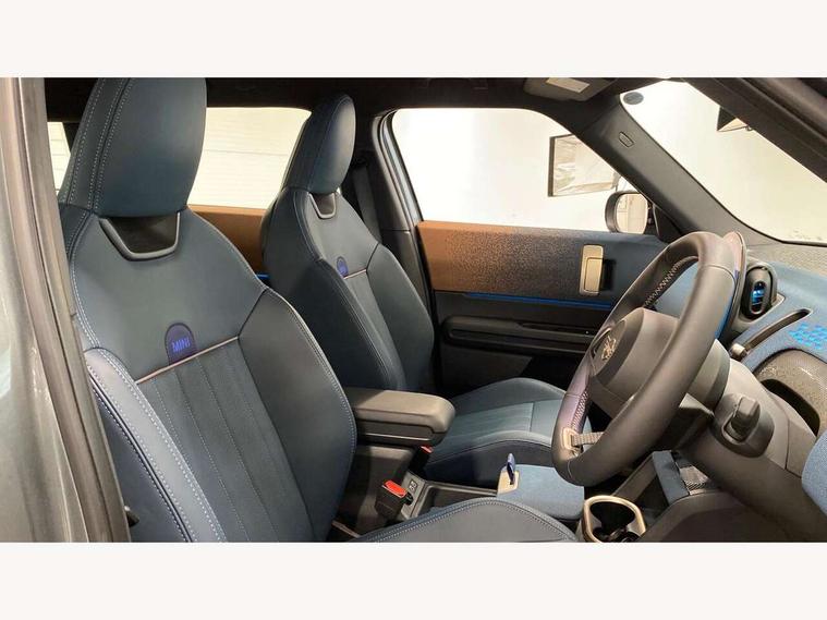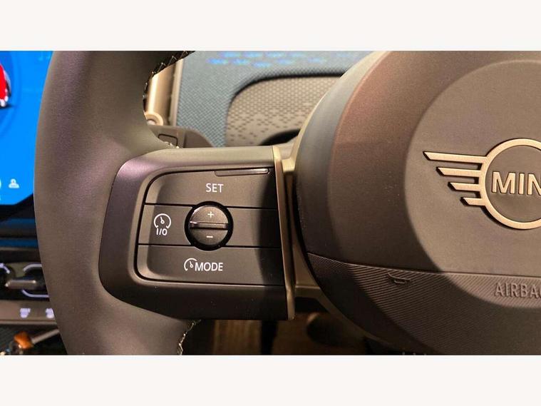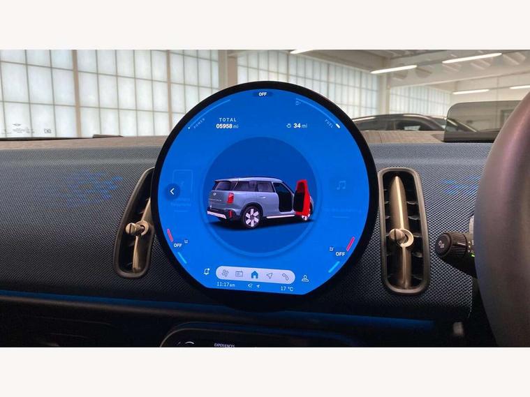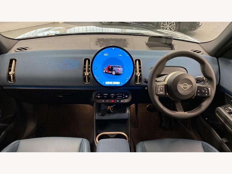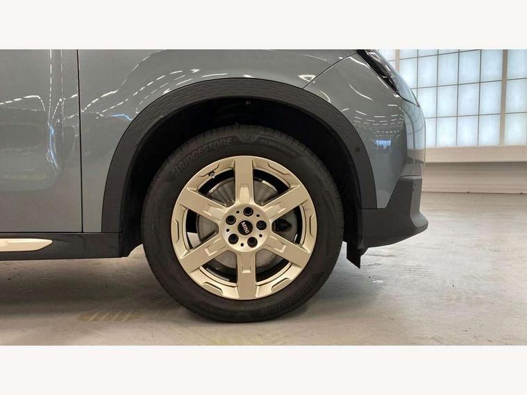 Bluetooth connection, Circular OLED Screen, Compatible mobile phone bluetooth with audio streaming, Cruise Control (DCC), Digital dashboard display, E-call, Electro-mechanical speed dependant steering assistance, MINI Experience Modes, Mini navigation system, MINI TeleServices, Parking assistant in camera and ultrasound based assistance system, rear view camera, parking aid and distance control, Auto transmission with Paddles, 6 speakers, DAB Digital radio, Personal eSim, Auto tailgate, Electric adjustable heated door mirrors, Front and rear electric windows, Heated rear window, LED daytime running lights, LED Headlights, LED rear lights, LED third brake light, Logos in Vibrant Silver, Rain sensor with auto headlights, Rear side wing doors, Rear window wiper, Roof rails, Vibrant silver grille surround, 3 seat bench in 2nd row, 60/40 split rear bench seat, Anthracite headliner, Auto air conditioning, Floor mats, Front armrest, Front headrests, Front sport seats, Heated steering wheel, Height and length steering column adjustment, Lidded storage box in Petrol knit, Rear headrests, Single front passenger seat, Sport Vescin Steering Wheel, Sunvisors with vanity mirrors, Vescin synthetic leather upholstery, Vibrant Silver sill inlay, 3x3 point rear seat belts, 6 Airbags - front, side, head and seat belt tensioners, ABS, DSC - Dynamic Stability Control, Electronic handbrake, Electronic Stability Programme (ESP), Front ISOFIX (iSize), Hill hold assist, Hill start assist, Manual rear child locks, Traction control, Tyre pressure monitoring system, Warning triangle, Alarm system with tilt sensor, monitoring doors, bonnet interior and tailgate, Auto drive away locking, Deadlocking function, Electronic vehicle immobiliser, Locking wheel bolts, Remote control locking, Start/stop toggle with keyless go, Petrol/Brown dashboard knit, MINI Mobility Kit,