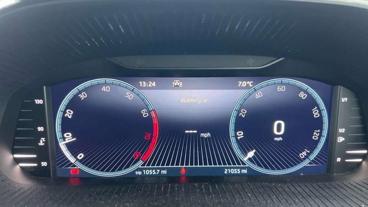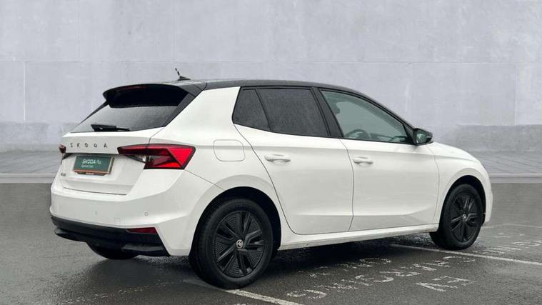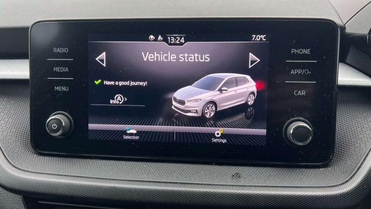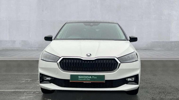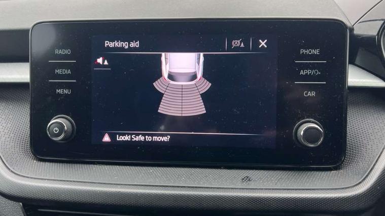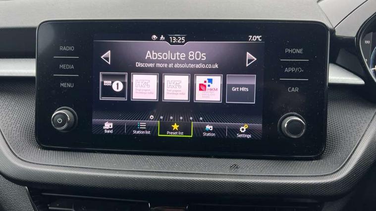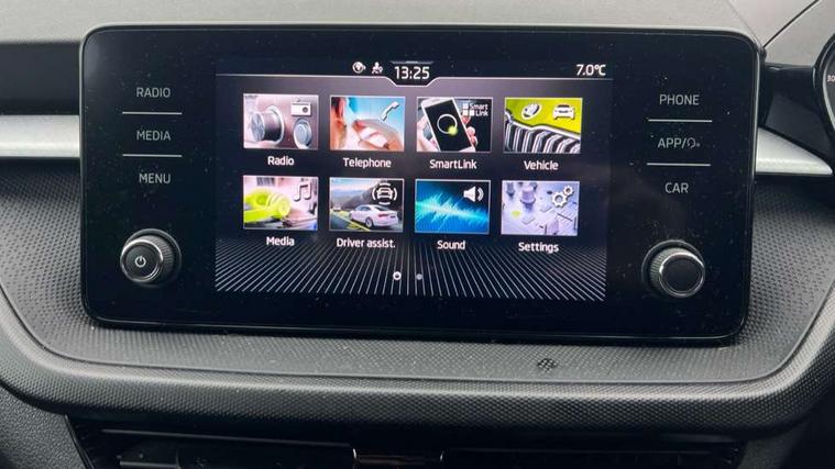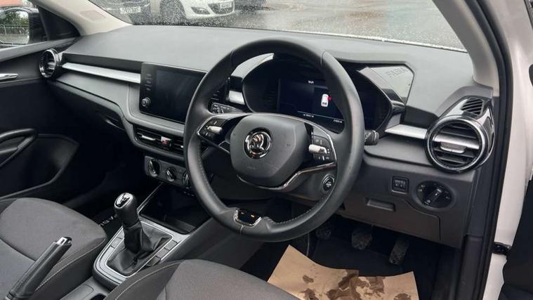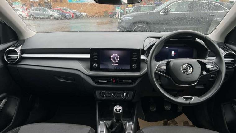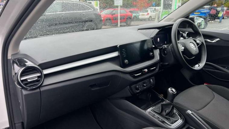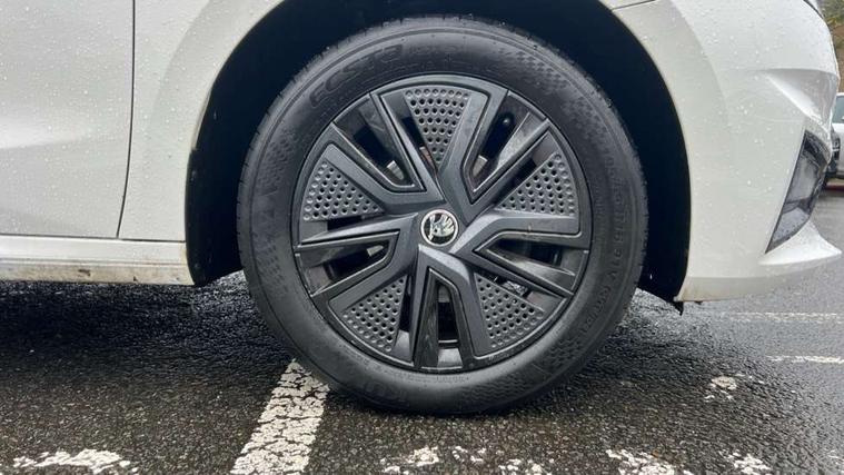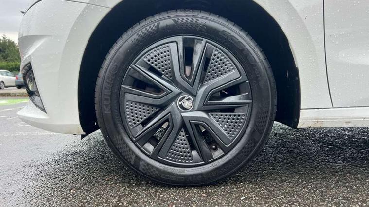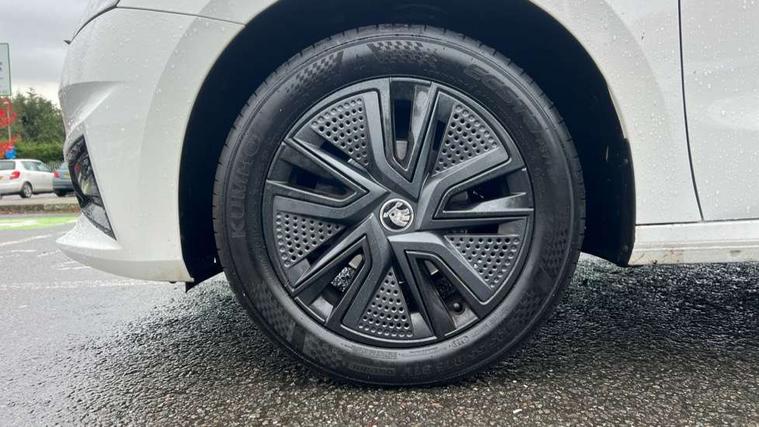 Bluetooth connection, Driver alert system - DAS, Electromechanical power steering, Exterior temperature gauge, Lane assist including road edge detection, Service interval indicator, Virtual cockpit with 10.25" colour display, 2x USB-C in the front (for data transmission and charging), 6 Speakers (4 in front and 2 in rear), Auxiliary socket for external MP3 player, Bolero radio with 8" colour display, DAB digital radio reception, Basic rear lights, Body coloured bumpers, Dimming rear view mirror with black frame, Door mirror integrated indicators, Electrically adjustable and heated door mirrors, Electrically adjustable front windows with function auto up/down, Front window wiper intermittent control, Headlight range control - Automatic, Ice scraper in fuel cap, LED daytime running lights with coming and leaving home feature, Mechanical adjustable rear windows, Privacy glass, Rear LED fog light, Rear side wing doors, Rear window wiper with washing nozzles, Roof colour door mirrors, Roof mounted spoiler, SKODA tailgate lettering in chrome, Third brake light, 3 rear headrests, Backrest split and folding, Central console with fixed cup holder and storage box, Chrome handbrake release button, Fabric upholstery, Gearshift knob/handle in leather, Grain satin black interior door handles, Hand brake lever handle in leather, Height adjustable front headrests, Height adjustable steering wheel, ISOFIX and TopTether anchorage points to the outer rear seats, ISOFIX and TopTether on the front passenger seat, Luggage compartment lighting, Pollen filter, Rear seat bench unsplit, Single front passenger seat, Storm grey headlining, Sun visors with mirror and airbag label on passenger side, Ticket holder, Umbrella in drivers door, 3-point height adjustable front seats belts with pretensioner and force limiter, Automatic warning lights in case of crash, Driver and passengers airbag with switch off function, e-Call+, ESC including ABS, MSR, ASR, EDS, HBA and XDS, Front and rear seat belt warning, FRONT ASSIST (AEB City and AEB Inter Urban), Front side airbags, Head airbags, One tone horn, Pedestrian protection, Three rear 3-points safety seat belts with pretensioner and force limiter including stop function for outer rear seat belts, Tyre pressure monitoring system, Anti-theft alarm system including immobiliser, interior monitoring, backup horn, and towing protection, Anodized cross line upper decorative trim, Colour Edition air vents, Grain satin black central console cover, Grain satin black lower decorative trim, Satin black door and side trim panel in front, Anti-theft wheel bolts protection, Super-low rolling resistance tyres,